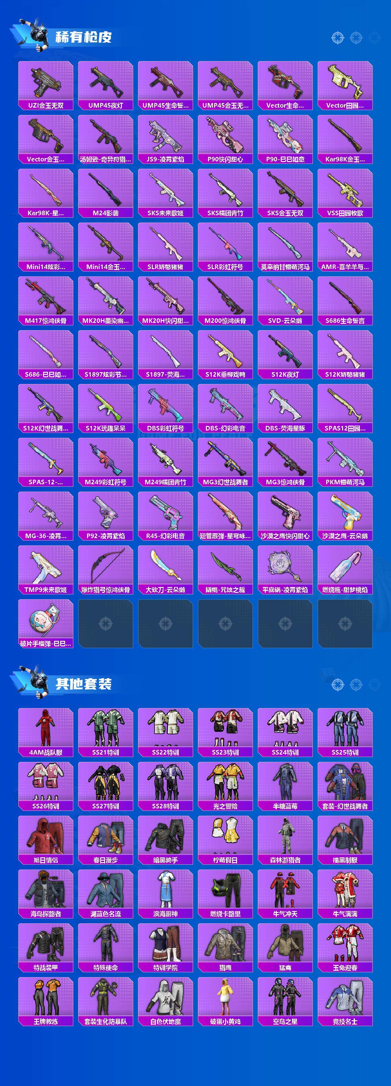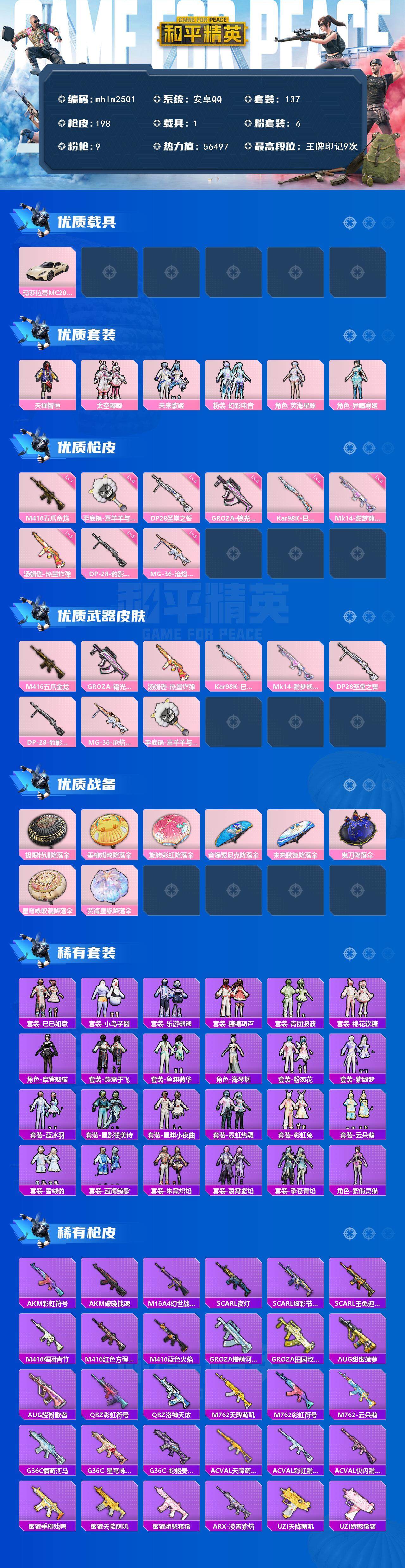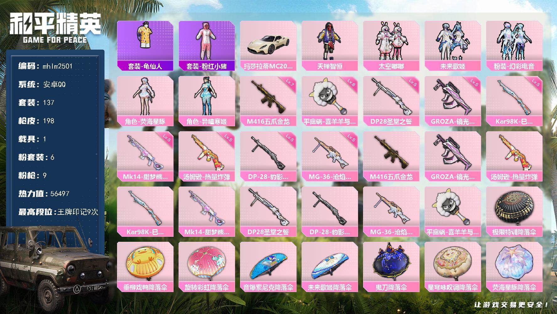 [14563429]【mhlm2501】安卓 手q-6粉装-9特效呛-1载具-1粉色飞行器-56497热力值-9王牌印记-137套装-198呛皮 【热门品类】:套装-龟仙人,套装-粉红小猪 【粉色载具】:玛莎拉蒂mc20(星石白) 【粉色套装】:粉装-天禅智恒,粉装-太空嘟嘟,粉装-未来歌姬,粉装-幻彩电音,角色-荧海星豚,角色-异瞳寒姬 【粉色呛皮等级】:m416-五爪金龙七级,groza-镜光银凌五级,汤姆逊-热量炸弹五级,kar98k-巳巳如意五级,mk14-甜梦熊击五级,dp-28-圣堂之誓五级,dp-28-豹影疾电五级,mg-36-沧焰双生五级,平底锅-喜羊羊与灰太狼六级 【粉色呛皮】:m416-五爪金龙,groza-镜光银凌,汤姆逊-热量炸弹,kar98k-巳巳如意,mk14-甜梦熊击,dp-28-圣堂之誓,dp-28-豹影疾电,mg-36-沧焰双生,平底锅-喜羊羊与灰太狼 【粉色降落伞】:极限特训降落伞,垂柳戏鸭降落伞,旋转彩虹降落伞,音爆索尼克降落伞,未来歌姬降落伞,鬼刀降落伞,星穹咏叹调降落伞,荧海星豚降落伞 【稀有套装】:套装-龟仙人,套装-巳巳如意,套装-小鸟芋圆,套装-乐游熊熊,套装-糖糖葫芦,套装-青团波波,套装-棉花软糖,角色-摩登魅猫,套装-燕燕于飞,套装-鱼渊荷华,角色-海琴烟,套装-粉恋花,套装-紫幽梦,套装-蓝冰羽,套装-星影赞美诗,套装-星渊小夜曲,套装-霓虹热舞,套装-彩虹兔,套装-云朵鹅,套装-雪绒豹,套装-蓝海鲸歌,套装-朱霞炽焰,套装-凌霄紫焰,套装-擎苍青焰,角色-紫俏灵猫,套装-炫彩糖果 【稀有呛皮】:akm-彩虹符号,akm-破晓战魂,m16a4-幻世战舞者,scar-l-夜灯,scar-l-炫彩节奏,scar-l-玉兔迎春,m416-糯团青竹,m416-红色方程式,m416-蓝色火焰,groza-懵萌河马,groza-田园牧歌,aug-甜蜜菠萝,aug-耀粉歌者,q-彩虹符号,q-洛神天依,m762-天降萌叽,m762-彩虹符号,m762-云朵鹅,g36c-懵萌河马,g36c-蛇蝎美人,g36c-星穹咏叹调,ac-val-天降萌叽,ac-val-彩虹甜喵,ac-val-快闪甜心,蜜獾-垂柳戏鸭,蜜獾-天降萌叽,蜜獾-娇憨猪猪,arx-凌霄紫焰,uzi-天降萌叽,uzi-娇憨猪猪,uzi-