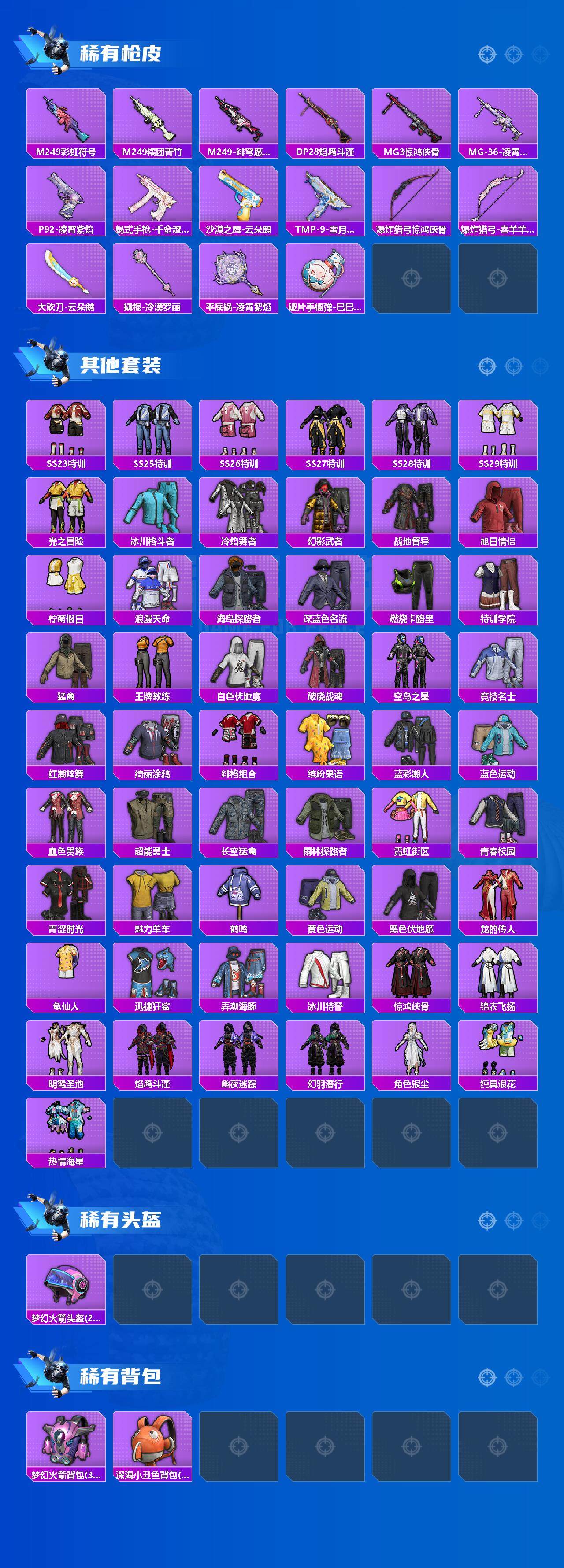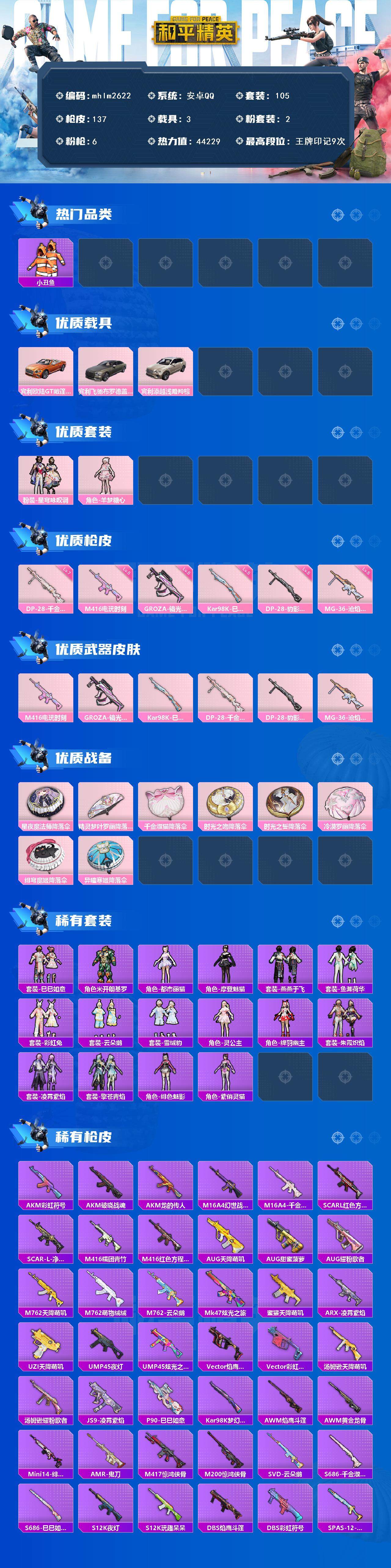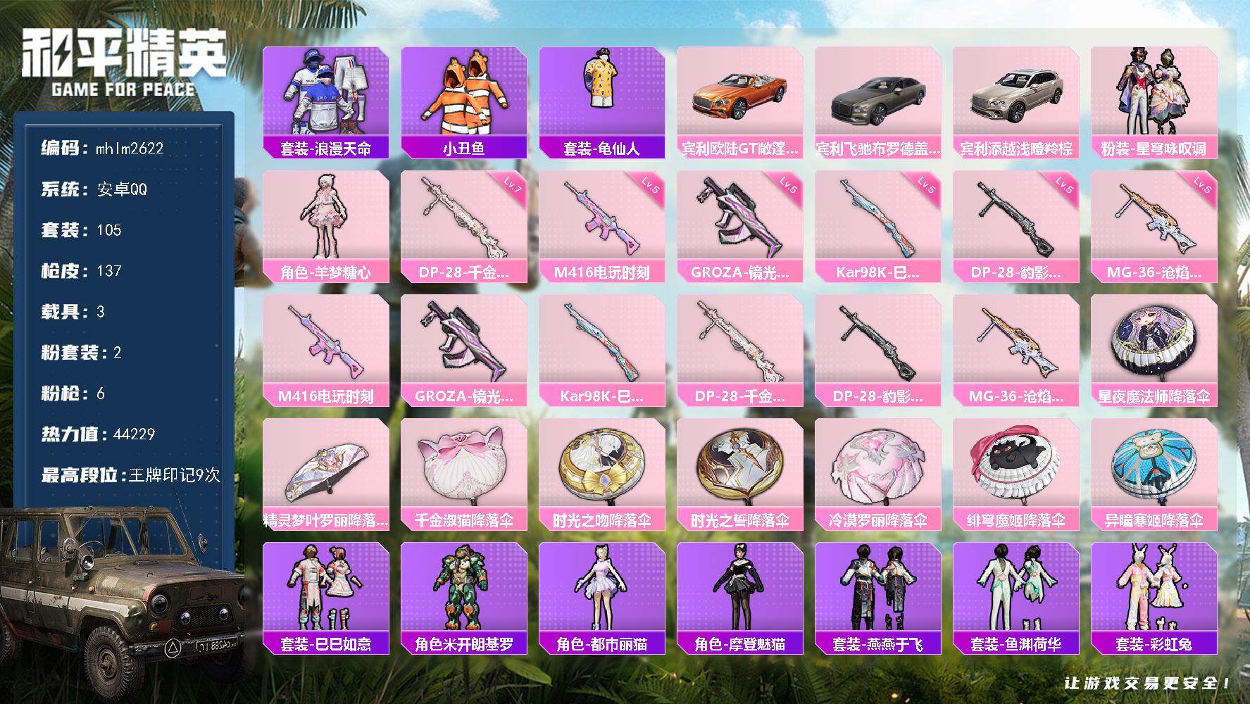 [14563537]【mhlm2622】安卓 手q-2粉装-6特效呛-3载具-1粉色飞行器-44229热力值-9王牌印记-105套装-137呛皮 【热门品类】:套装-浪漫天命,套装-小丑鱼,套装-龟仙人 【粉色载具】:宾利欧陆gt敞篷(火焰橘),宾利飞驰(布罗德盖棕双色),宾利添越(浅瞪羚棕) 【粉色套装】:粉装-星穹咏叹调,角色-羊梦糖心 【粉色呛皮等级】:m416-电玩时刻五级,groza-镜光银凌五级,kar98k-巳巳如意五级,dp-28-千金淑猫七级,dp-28-豹影疾电五级,mg-36-沧焰双生五级 【粉色呛皮】:m416-电玩时刻,groza-镜光银凌,kar98k-巳巳如意,dp-28-千金淑猫,dp-28-豹影疾电,mg-36-沧焰双生 【粉色降落伞】:星夜魔法师降落伞,精灵梦叶罗丽降落伞,千金淑猫降落伞,时光之吻降落伞,时光之誓降落伞,冷漠罗丽降落伞,绯穹魔姬降落伞,异瞳寒姬降落伞 【稀有套装】:套装-龟仙人,套装-巳巳如意,角色-米开朗基罗,角色-都市丽猫,角色-摩登魅猫,套装-燕燕于飞,套装-鱼渊荷华,套装-彩虹兔,套装-云朵鹅,套装-雪绒豹,角色-灵公主,角色-绛羽幽主,套装-朱霞炽焰,套装-凌霄紫焰,套装-擎苍青焰,角色-绯色魅影,角色-紫俏灵猫,套装-炫彩糖果 【稀有呛皮】:aug-冰晶雪宝,akm-彩虹符号,akm-破晓战魂,akm-龙的传人,m16a4-幻世战舞者,m16a4-千金淑猫,scar-l-红色方程式,scar-l-净心行者,m416-糯团青竹,m416-红色方程式,aug-天降萌叽,aug-甜蜜菠萝,aug-耀粉歌者,m762-天降萌叽,m762-萌物绒绒,m762-云朵鹅,mk47-炫光之旅,蜜獾-天降萌叽,arx-凌霄紫焰,uzi-天降萌叽,ump45-夜灯,ump45-炫光之旅,vect-焰鹰斗篷,vect-彩虹符号,汤姆逊-天降萌叽,汤姆逊-耀粉歌者,js9-凌霄紫焰,p90-巳巳如意,kar98k-梦幻火箭,awm-焰鹰斗篷,awm-黄金龙骨,mini14-绯穹魔姬,amr-鬼刀,m417-惊鸿侠骨,m200-惊鸿侠骨,svd-云朵鹅,s686-巳巳如意,s686-千金淑猫,s12k-玩趣呆呆,s12k-夜灯,dbs-焰鹰斗篷,dbs-彩虹符号,spas-12-云朵鹅,m249-彩虹符号,m249