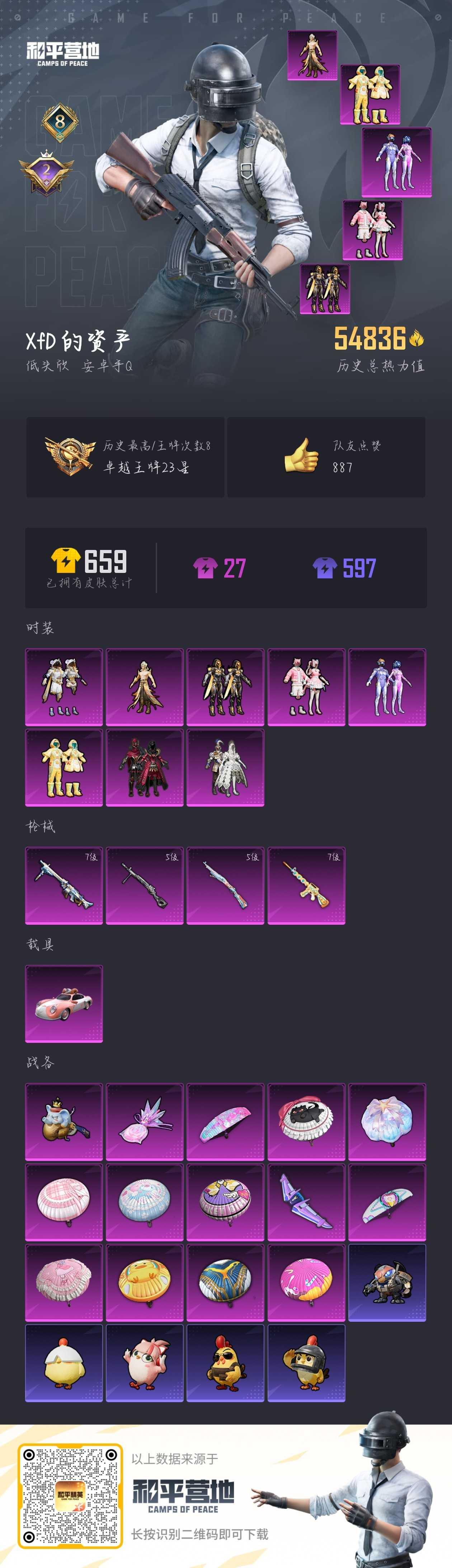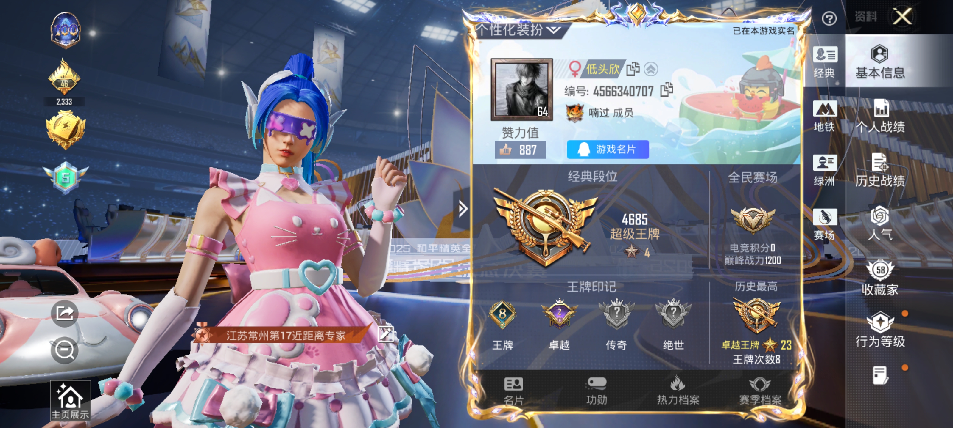 【和平精英】【txhp4795】8粉装,4特效呛,1载具,历史最高段位:卓越王牌23星 王牌印记8次 热力值:55236,132套装,168呛械,225装备,110战备;套装:套装-梦幻火箭,套装-冰霜白皇,套装-炙焰红王,套装-垂柳戏鸭,套装-彩虹甜喵,套装-创世·救赎,角色-罗征,套装-极意拳锋,套装-特训学院,套装-猎鹰,套装-青年教官,套装-橘黑制服,套装-红色运动,套装-黄色运动,套装-蓝色运动,套装-黄色伏地魔,套装-白色伏地魔,套装-黑色伏地魔,套装-竞技名士,套装-深蓝色名流,套装-酒红色名流,套装-湖蓝色名流,套装-黄色名流,套装-猛禽,套装-长空猛禽,套装-旭日情侣,套装-冷焰舞者,套装-灼焰舞者,套装-特战装甲,套装-战地督导,套装-沙漠毒蛇,套装-幻影武者,套装-魅力单车,套装-绮丽涂鸦,套装-竞技达人朋克,套装-野性战心,套装-森林游猎者,套装-都市魅力,套装-热血青春,套装-极地朋克,套装-幻世战舞者,套装-清新柠檬,套装-青涩时光,套装-缤纷果语,套装-风暴特警,套装-冰川特警,套装-元素星魂,套装-极速红龙,套装-麻辣教官,套装-小丑鱼,套装-破蛋小黄鸡,套装-鹤鸣,套装-霓虹街区,套装-纯白誓言,套装-萌黄之夏,套装-夏日音浪,套装-探宝勇士,套装-牛气满满,套装-战术大师,套装-牛气冲天,套装-ss18特训,套装-耀粉歌者,套装-竞技角斗士,套装-瑞龙福将,套装-团圆交子,套装-极乐追光,角色-军刀雅典娜,套装-缤纷焰火,套装-异彩先驱,套装-霓虹极客,套装-空投萌叽,套装-ss19特训,套装-极速竞梦,套装-飞驰魅影,套装-音速流光,套装-炫蓝之夏,套装-ss20特训,套装-覆海蛟龙,套装-猎梦纪元,套装-甜心亚梦,套装-虚音幻奏,套装-ss21特训,套装-萌趣咩咩,套装-娇憨猪猪,套装-夏雨游龙,套装-荷畔雨呱,套装-俏皮奶喵,套装-暖心橘喵,套装-玉兔迎春,套装-ss22特训,套装-ss23特训,套装-龙舌兰冰茶,套装-灵蜜圈圈,套装-妙红点点,套装-幻彩翩翩,套装-王牌教练,套装-柠萌假日,套装-青玉碎影,套装-ss24特训,套装-龟仙人,套装-ss25特训,套装-龙的传人,套装-ss26特训,套装-ss27特训,套装-街头风暴,套装-蝶变,角色-绯色魅影,角色-紫俏灵猫,套装-异域银装,套装-ss31特训,套装-鱼渊荷华,套装-燕燕于飞,套装-智谋强哥,角色-海琴烟,套装-ss33特训,套装-巳巳如意,套装-狂鲨锋刃,套装-炫彩糖果,角色-乐音,套装-元气之梦,套装-ss34特训,套装-擎苍青焰,套装-朱霞炽焰,套装-凌霄紫焰,套装-薄荷星砂,套装-ss35特训,套装-午间小调,套装-秘语星愿,套装-风迹短诗,套装-粉黛兰香,套装-ss36特训,套装-萌鸡速递;呛皮:akm-灼热熔岩,akm-破晓战魂,akm-霓虹街区,akm-夜灯,akm-涂鸦街区,akm-彩虹符号,akm-龙的传人,akm-江南烟雨,akm-霓彩脉冲,scar-l-红色方程式,scar-l-甜蜜誓约,scar-l-炫彩节奏,scar-l-彩虹符号,scar-l-玉兔迎春,mk47-乌木金纹,mk47-妙红点点,mk47-风迹短诗,famas-霓彩脉冲,famas-乌木金纹,m416-蓝色火焰,m416-红色方程式,m416-糯团青竹,蜜獾-娇憨猪猪,蜜獾-垂柳戏鸭,蜜獾-天降萌叽,蜜獾-绯穹魔姬,蜜獾-风迹短诗,q-彩虹符号,q-飞驰魅影,7级m16a4-垂柳戏鸭,m16a4-甜心亚梦,m16a4-幻世战舞者,aug-耀粉歌者,aug-天降萌叽,aug-异域银装,aug-冰晶雪宝,m762-奇异狩猎者,m762-呛炮玫瑰,m762-瑞龙福将,m762-彩虹甜喵,m762-第五大道,m762-天降萌叽,groza-彩虹符号,groza-蓝莓炮弹,groza-异彩先驱,arx-凌霄紫焰,ac-val-甜心亚梦,ac-val-乌木金纹,ac-val-彩虹甜喵,ac-val-天降萌叽,g36c-乌木金纹,win94-瑞龙福将,win94-乌木金纹,莫辛纳甘-乌木金纹,莫辛纳甘-风迹短诗,5级kar98k-巳巳如意,kar98k-梦幻火箭,kar98k-炫彩节奏,kar98k-飞驰魅影,amr-妙红点点,amr-乌木金纹,awm-垂柳戏鸭,awm-天降萌叽,m24-炫彩节奏,m24-乌木金纹,svd-冷漠罗丽,m200-乌木金纹,mini14-梦幻火箭,mini14-异彩先驱,mk14-乌木金纹,mk14-薄荷星砂,mk14-紫晶流影,mk12-风迹短诗,mk12-乌木金纹,mk20-h-狂鲨锋刃,slr-娇憨猪猪,slr-彩虹符号,slr-霓彩脉冲,sks-炫彩节奏,ump45-蓝色火焰,uzi-红色方程式,uzi-娇憨猪猪,uzi-啾咪啾咪,uzi-炫彩糖果,野牛-燕燕于飞,野牛-乌木金纹,汤姆逊-奇异狩猎者,汤姆逊-炫彩节奏,汤姆逊-异彩先驱,汤姆逊-环太平洋,汤姆逊-天降萌叽,mp5k-蓝莓炮弹,mp5k-异彩先驱,mp5k-彩虹嘻嘻猴,mp5k-乌木金纹,aks-74u-乌木金纹,p90-飞驰魅影,p90-巳巳如意,p90-乌木金纹,vect-彩虹符号,vect-燕燕于飞,js9-凌霄紫焰,s12k-破晓战魂,s12k-瑞龙福将,s12k-娇憨猪猪,s12k-垂柳戏鸭,s12k-幻世战舞者,s12k-霓彩脉冲,spas-12-燕燕于飞,spas-12-狂鲨锋刃,spas-12-钛晶裂爪,s1897-炫彩节奏,s1897-呛炮玫瑰,s1897-飞驰魅影,dbs-甜心亚梦,dbs-彩虹甜喵,dbs-第五大道,dbs-月影灵韵,dbs-风迹短诗,dbs-乌木金纹,s686-红色方程式,s686-生命誓言,s686-彩虹符号,s686-巳巳如意,aa12-g-炫光之旅,7级mg3-洛神天依,mg3-瑞龙福将,mg3-幻世战舞者,mg3-乌木金纹,mg3-妙红点点,mg3-第五大道,5级dp-28-豹影疾电,dp-28-彩虹符号,dp-28-甜心亚梦,m249-破晓战魂,m249-彩虹符号,m249-糯团青竹,m249-妙红点点,pkm-啾咪啾咪,mg-36-凌霄紫焰,蝎式手呛-燕燕于飞,p92-凌霄紫焰,沙墨之鹦-王牌投手,信号呛-异瞳寒姬,平底锅-瑞龙福将,平底锅-异彩先驱,平底锅-飞驰魅影,平底锅-甜心亚梦,平底锅-娇憨猪猪,平底锅-光之冒险,平底锅-妙红点点,平底锅-空岛之星,平底锅-凌霄紫焰,撬棍-甜心宝贝,撬棍-幻世战舞者,撬棍-冷漠罗丽,撬棍-火尖呛,盐雾蛋-冰氧夏日,破片手留单-呆爆全场,破片手留单-拽到爆炸,破片手留单-巳巳如意,破片手留单-火尖莲影,破片手留单-爆破雪人,爆炸猎弓-喜羊羊与灰太狼