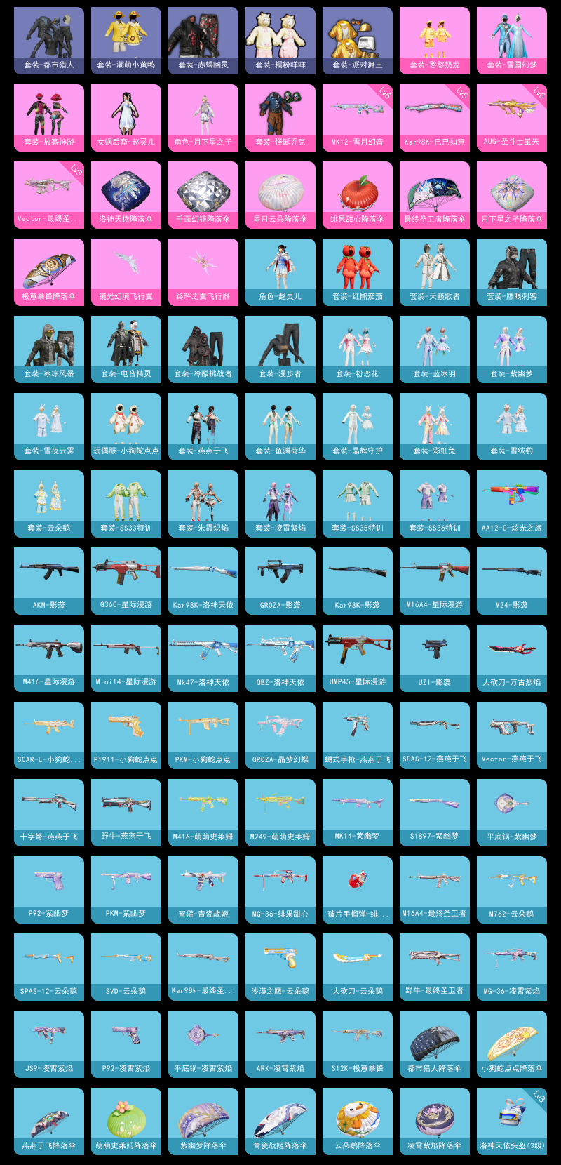 【和平精英】【txhp4798】6粉装,8特效呛,0载具,历史最高段位:卓越王牌12星 王牌印记4次 热力值:31622,64套装,103呛械,119装备,59战备;套装:套装-怪诞乔克,套装-雪国幻梦,套装-放客神游,女娲后裔-赵灵儿,套装-憨憨奶龙,角色-月下星之子,套装-漫步者,套装-海岛探路者,套装-赤蝎幽灵,套装-都市猎人,套装-春日漫步,套装-鹰眼刺客,套装-冰冻风暴,套装-冷酷挑战者,套装-蓝彩潮人,套装-魅力单车,套装-超能勇士,套装-派对舞王,套装-生化防暴队,套装-夏日倾情,套装-缤纷果语,套装-滨海厨神,套装-潮萌小黄鸭,套装-战术大师,套装-天籁歌者,套装-电音精灵,套装-rsg追光队服,套装-红熊茄茄,角色-赵灵儿,套装-光之冒险,套装-糯粉咩咩,套装-漫游都市,套装-恋语绒绒,套装-街头风暴,套装-雪夜云雾,套装-异域银装,套装-夜幕侵蚀,套装-小鸟芋圆,套装-绒宝小鹅,套装-ss31特训,套装-鱼渊荷华,套装-燕燕于飞,套装-紫幽梦,套装-粉恋花,套装-晶辉守护,套装-ss33特训,套装-云朵鹅,玩偶服-小狗蛇点点,套装-巳巳如意,套装-ss32特训,套装-彩虹兔,套装-蓝冰羽,套装-顶瓜瓜,套装-雪绒豹,套装-乐游熊熊,套装-大橘大利,套装-元气之梦,套装-ss34特训,套装-朱霞炽焰,套装-凌霄紫焰,套装-薄荷星砂,套装-ss35特训,套装-ss36特训,套装-萌鸡速递;呛皮:6级aug-圣斗士星矢,aug-甜蜜菠萝,aug-异域银装,mk47-洛神天依,m16a4-星际漫游,m16a4-最终圣卫者,蜜獾-青瓷战姬,蜜獾-绿洲时空,蜜獾-乌木金纹,scar-l-小狗蛇点点,scar-l-乐游熊熊,m416-星际漫游,m416-萌萌史莱姆,m416-错位像素,q-洛神天依,g36c-星际漫游,arx-凌霄紫焰,akm-影袭,akm-涂鸦街区,akm-霓彩脉冲,akm-绿洲时空,m762-天降萌叽,m762-云朵鹅,groza-影袭,groza-晶梦幻蝶,famas-乌木金纹,m200-乌木金纹,amr-鸡智如我,5级kar98k-巳巳如意,kar98k-影袭,kar98k-洛神天依,kar98k-最终圣卫者,svd-云朵鹅,awm-天降萌叽,m24-影袭,win94-乌木金纹,mini14-星际漫游,mini14-鸡智如我,5级mk14-甜梦熊击,mk14-紫幽梦,mk14-薄荷星砂,qbu-夜幕侵蚀,6级mk12-雪月幻音,mk12-乌木金纹,sks-乐游熊熊,m417-玩趣呆呆,aks-74u-粉粉喵呜,aks-74u-鸡智如我,aks-74u-乌木金纹,uzi-影袭,uzi-天降萌叽,uzi-啾咪啾咪,uzi-炫彩糖果,ump45-星际漫游,ump45-海盐豹豹,ump45-绒宝小鹅,ump45-夜幕侵蚀,ump45-绿洲时空,3级vect-最终圣卫者,vect-燕燕于飞,野牛-燕燕于飞,野牛-最终圣卫者,js9-凌霄紫焰,5级汤姆逊-热量炸弹,p90-巳巳如意,spas-12-燕燕于飞,spas-12-狂鲨锋刃,spas-12-云朵鹅,s12k-极意拳锋,aa12-g-炫光之旅,s1897-紫幽梦,s1897-糯团青竹,s686-巳巳如意,5级dp-28-豹影疾电,dp-28-彩虹符号,mg3-霓彩脉冲,mg-36-绯果甜心,mg-36-凌霄紫焰,pkm-啾咪啾咪,pkm-紫幽梦,pkm-小狗蛇点点,m249-萌萌史莱姆,沙墨之鹦-云朵鹅,蝎式手呛-燕燕于飞,p1911-小狗蛇点点,p92-紫幽梦,p92-凌霄紫焰,大砍刀-万古烈焰,大砍刀-云朵鹅,平底锅-紫幽梦,平底锅-属我最6,平底锅-凌霄紫焰,5级盐雾蛋-猫咪绅士,盐雾蛋-冰氧夏日,破片手留单-海盐豹豹,破片手留单-绯果甜心,破片手留单-拽到爆炸,破片手留单-巳巳如意,破片手留单-爆破雪人,十子怒-燕燕于飞,十子怒-异域银装,铝热弹-炫彩糖果,燃烧瓶-甜梦桃焰;降落伞:镜光幻境飞行翼,终晖之翼飞行器,异域银装飞行器,破刃行动尾迹; 详情看图6粉-8特 男神套/赵灵儿/雪国/小丑/放客/追光队服/星际m4/小番茄/糯粉咩咩/3级圣卫者