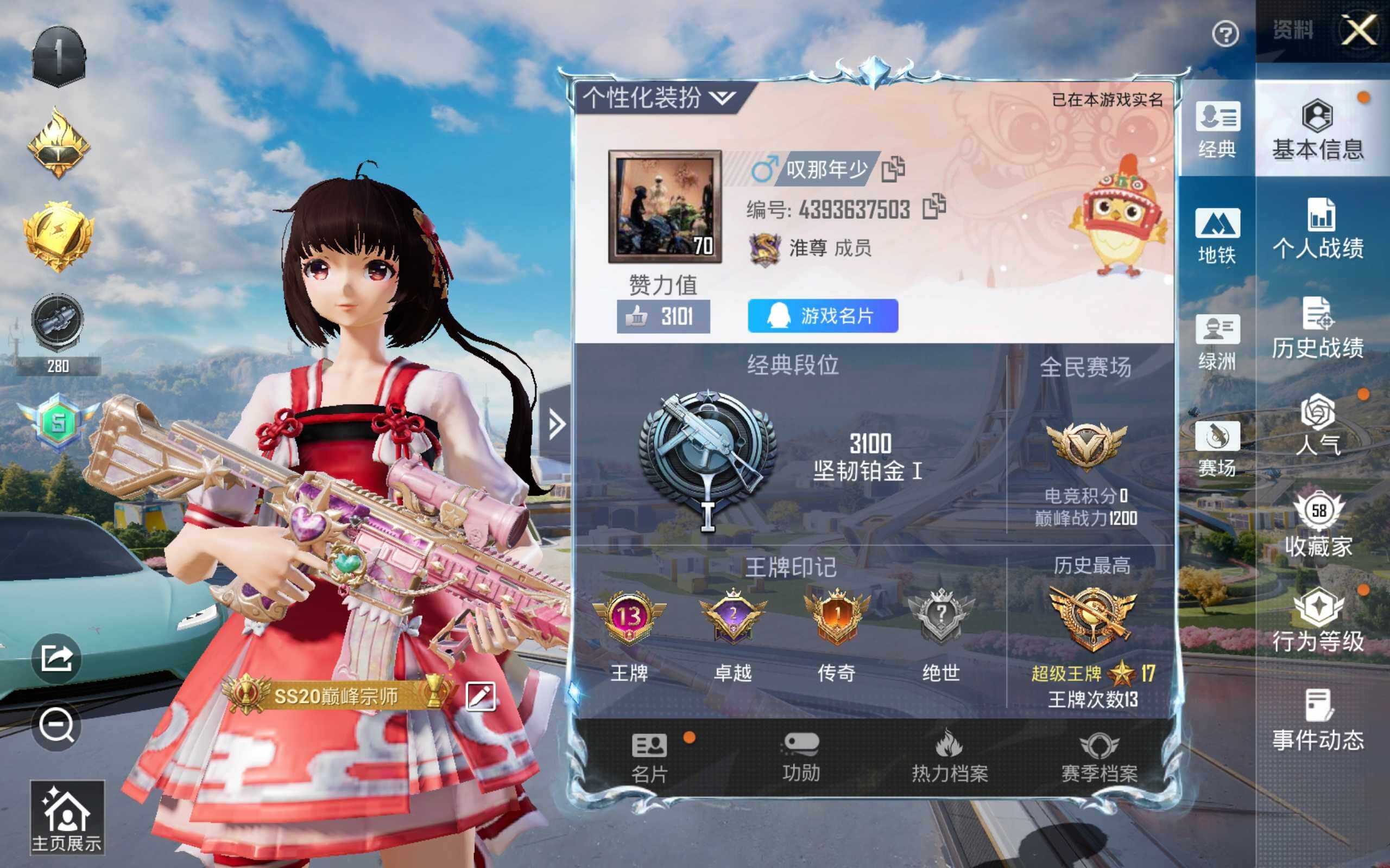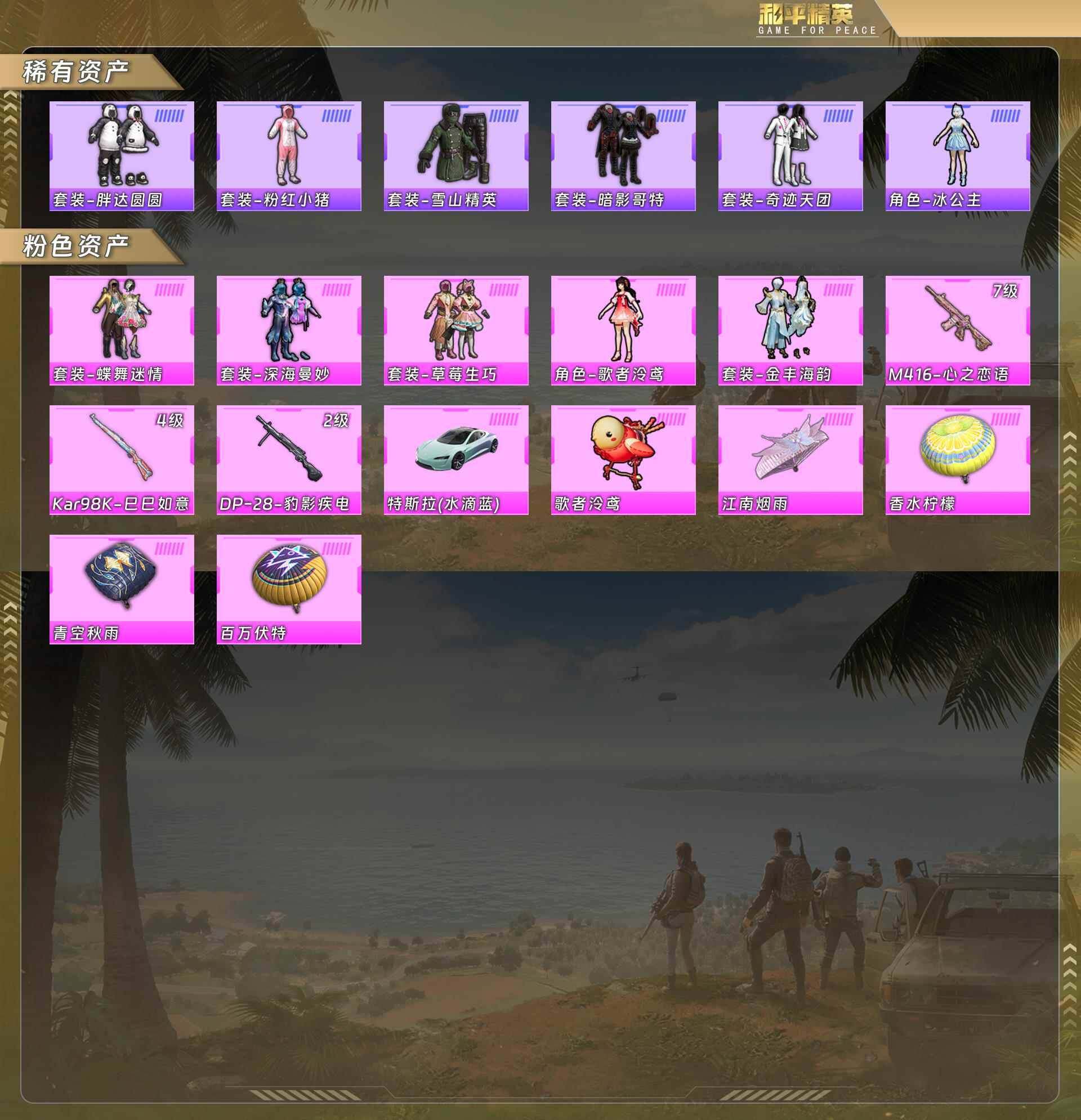 5粉套3粉呛1载具红眼罩/胖达/蝶舞迷情/深海曼妙/草莓生巧/歌者泠鸢/金丰海韵/m4心之恋语7级/98k巳巳如意4级/dp28豹影疾电2级/特斯拉蓝 没战神框 hp4228-1粉色飞行器-62269热力值-13王牌印记-163套装-181呛皮 【热门品类】:套装-胖达圆圆,套装-暗影哥特,套装-粉红小猪 【粉色载具】:特斯拉roadster(水滴蓝) 【粉色套装】:粉装-深海曼妙,粉装-蝶舞迷情,粉装-草莓生巧,角色-歌者泠鸢,粉装-金丰海韵 【粉色呛皮等级】:m416-心之恋语七级,kar98k-巳巳如意四级,dp-28-豹影疾电二级 【粉色呛皮】:m416-心之恋语,kar98k-巳巳如意,dp-28-豹影疾电 【粉色飞行器】:歌者泠鸢飞行器 【粉色降落伞】:百万伏特降落伞,香水柠檬降落伞,青空秋雨降落伞,江南烟雨降落伞 【稀有套装】:套装-蜜露汐语 【稀有呛皮】:akm-夜灯,akm-彩虹符号,akm-灼热熔岩,akm-生命誓言,akm-破晓战魂,akm-筑梦精灵,akm-萌趣颜团子,akm-虎虎生威,akm-阿狸红,akm-霓虹街区,akm-龙的传人,m16a4-幻世战舞者,m16a4-甜心亚梦,scar-l-炫彩节奏,scar-l-玉兔迎春,scar-l-青丘仙客,m416-夜灯,m416-糯团青竹,m416-红色方程式,m416-蓝色火焰,groza-异彩先驱,groza-懵萌河马,groza-治愈之星,groza-田园牧歌,aug-耀粉歌者,q-原初圣火,q-彩虹符号,q-飞驰魅影,m762-天降萌叽,m762-彩虹符号,m762-牛气冲天,m762-瑞龙福将,m762-镭射皇者,g36c-懵萌河马,g36c-金风玉露,ac-val-天降萌叽,ac-val-彩虹甜喵,ac-val-甜心亚梦,蜜獾-天降萌叽,蜜獾-娇憨猪猪,uzi-众神之王,uzi-啾咪啾咪,uzi-天降萌叽,uzi-娇憨猪猪,uzi-炫彩节奏,ump45-春暖花开,ump45-炫光之旅,ump45-生命誓言,ump45-粉色回忆,vect-pel轰鸣竞梦者,vect-彩虹符号,vect-暗夜玫瑰,vect-治愈之星,vect-生命誓言,vect-田园牧歌,汤姆逊-勇闯险境,汤姆逊-天降萌叽,汤姆逊-异彩先驱,汤姆逊-暗夜鎏金,汤姆逊-炫彩节奏,汤姆逊-耀粉歌者,mp5k-众神之王,mp5k-异彩先驱,p90-筑梦精灵,p90-飞驰魅影,kar98k-勇闯险境,kar98k-彩虹符号,kar98k-深海曼妙,kar98k-炫彩节奏,kar98k-王子的夏天,kar98k-红色方程式,kar98k-飞驰魅影,kar98k-魅影蝠王,m24-歌者泠鸢,m24-治愈之星,m24-炫彩节奏,m24-香水柠檬,m24-众神之王,awm-垂柳戏鸭,sks-勇闯险境,sks-夜灯,sks-炫彩节奏,vss-田园牧歌,mini14-原初圣火,mini14-异彩先驱,mini14-涂山之恋,mini14-穿刺龙虾,mini14-筑梦精灵,mini14-耀粉歌者,mk14-治愈之星,win94-玉鳞金羽,win94-瑞龙福将,slr-众神之王,slr-娇憨猪猪,莫辛纳甘-懵萌河马,s686-橘柚倾心,s686-生命誓言,s686-红色方程式,s686-千金淑猫,s1897-勇闯险境,s1897-炫彩节奏,s1897-飞驰魅影,s12k-瑞龙福将,s12k-香水柠檬,s12k-垂柳戏鸭,s12k-娇憨猪猪,s12k-幻世战舞者,s12k-极意拳锋,dbs-歌者泠鸢,dbs-甜心亚梦,spas-12-田园牧歌,m249-彩虹符号,m249-糯团青竹,dp-28-原初圣火,dp-28-彩虹符号,dp-28-甜心亚梦,mg3-幻世战舞者,mg3-瑞龙福将,mg3-第五大道,pkm-懵萌河马,p18c-原初圣火 【其他套装】:套装-ss6特训,套装-ss8特训,套装-ss9特训,套装-ss10特训,套装-ss11特训,套装-ss12特训,套装-ss13特训,套装-ss14特训,套装-ss15特训,套装-ss16特训,套装-ss17特训,套装-ss18特训,套装-ss19特训,套装-ss20特训,套装-ss21特训,套装-ss22特训,套装-ss23特训,套装-ss24特训,套装-ss25特训,套装-ss26特训,套装-ss27特训,套装-ss28特训,套装-ss29特训,套装-人气偶像,套装-人鱼之吻,套装-传奇侦探,套装-光之冒险,套装-冷焰舞者,套装-北国孤狼,套装-夏日音浪,套装-奇迹天团,套装-完美偶像,套装-幻世战舞者,套装-探宝勇士,套装-摇滚狂鲨,套装-暗影哥特,套装-柠萌假日,套装-格斗先锋,套装-橘黑制服,套装-沙漠兵团,套装-涂山之恋,套装-深蓝色名流,套装-湖蓝色名流,套装-滨海假日,套装-潮流炫酷,套装-灼焰舞者,套装-炫蓝之夏,套装-热血青春,套装-牛气冲天,套装-牛气满满,套装-特战装甲,套装-特训学院,套装-猎鹰,套装-猛禽,套装-玉兔迎春,套装-甜蜜熊情侣,套装-白熊同盟,套装-白色伏地魔,套装-破晓战魂,套装-破蛋小黄鸡,套装-福星高照,套装-空岛之星,套装-空投萌叽,套装-竞技勇士朋克,套装-竞技名士,套装-竞技达人朋克,套装-粉红小猪,套装-红色运动,套装-绮丽涂鸦,套装-缤纷果语,套装-耀粉歌者,套装-萌黄之夏,套装-蓝彩潮人,套装-蓝色运动,套装-街头潮人,套装-跃动心情,套装-都市漫游者,套装-都市魅力,套装-酒红色名流,套装-酷潮明星,套装-长空猛禽,套装-霓虹街区,套装-青年教官,套装-飞行日记,套装-骑行爱好者,套装-魅力单车,套装-鹤鸣,套装-麻辣教官,套装-黄色伏地魔,套装-黄色名流,套装-黄色运动,套装-黎明保卫者,套装-黑色伏地魔,套装-龙的传人,套装-龙腾端午,套装-战地菁英,套装-极地朋克,套装-冰川特警,套装-梦魇先生,套装-坚韧舞者,套装-万圣娃娃,套装-雪山精英,套装-淡雅花蕊,套装-玲珑飞花,套装-迷域探索者,套装-深蓝冒险家,套装-众神之王,套装-智慧之神,套装-风华少年志,套装-罗小黑,套装-激萌罗小黑,套装-暗夜契约,套装-原初圣火,套装-逆风勇士,套装-朱雀圣者,套装-抹茶蜜豆,套装-薄荷蓝莓,套装-治愈之星,套装-迅捷之星,套装-科技之星,套装-瑞龙福将,套装-团圆交子,套装-异彩先驱,套装-缤纷焰火,套装-霓虹极客,套装-飞驰魅影,套装-音速流光,套装-水晶王族,套装-猎梦纪元,套装-甜心亚梦,套装-虚音幻奏,套装-娇憨猪猪,套装-萌趣咩咩,套装-夏雨游龙,套装-梦幻奶油,套装-田园牧歌,套装-轻风白浪,套装-和煦暖阳,套装-懵萌河马,套装-神气柴柴,套装-甜梦熊熊,套装-无暇誓言,角色-冰