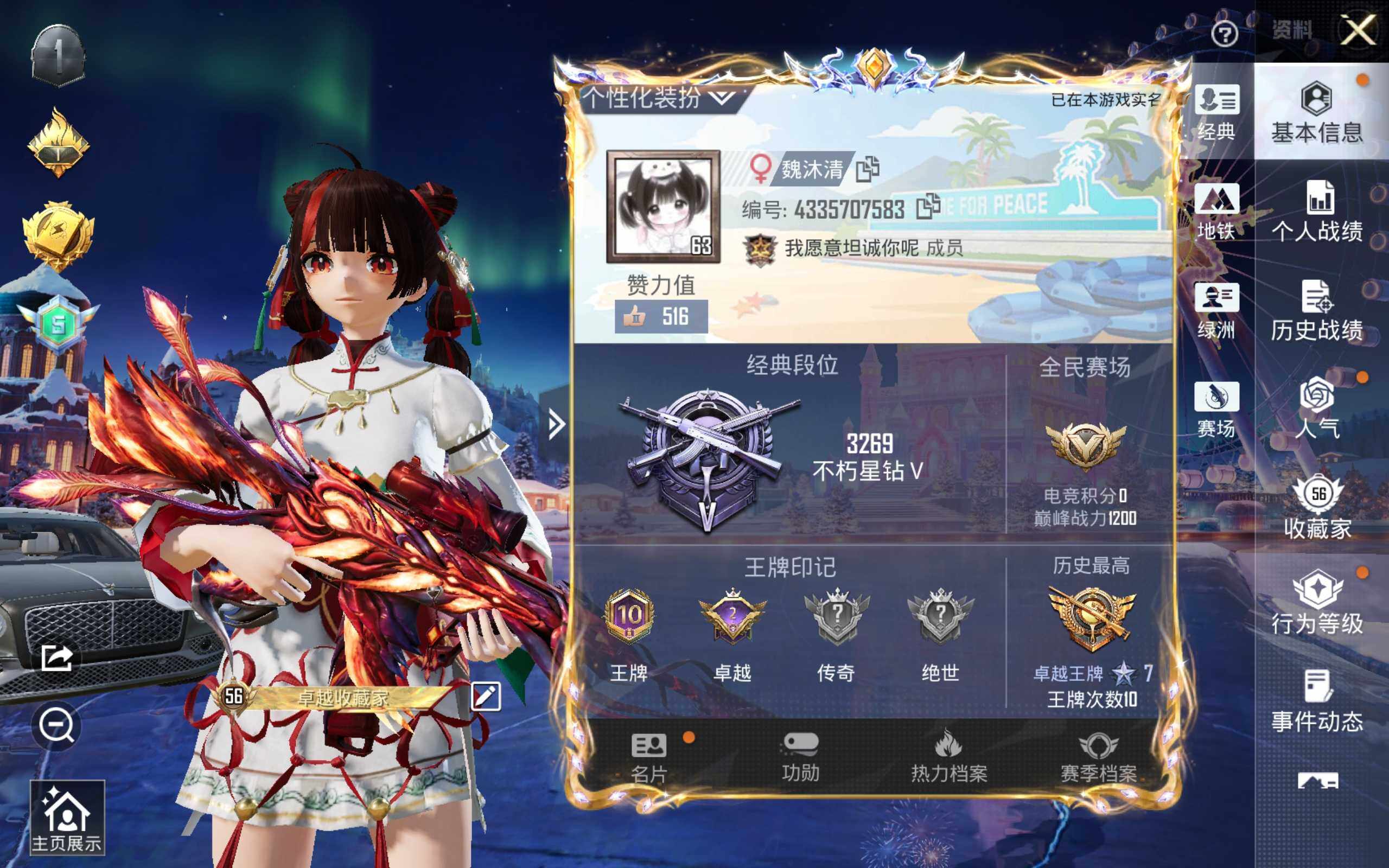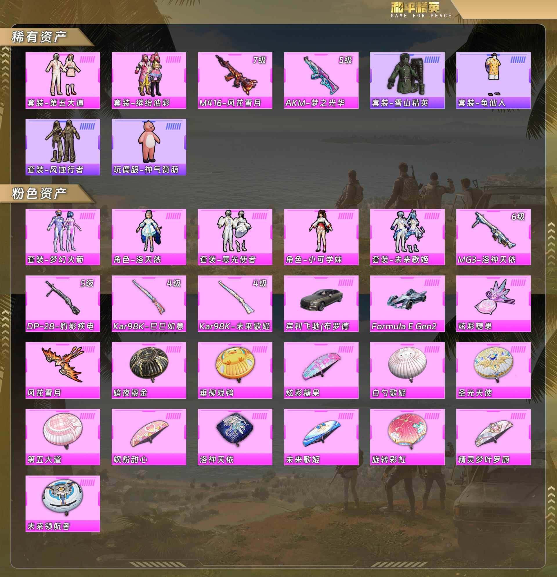 公主号-地铁满天赋-第五大道/猪脸/梦幻火箭/洛天依/寒光使者/小可学妹/未来歌姬/m4风花雪月7级/ak梦之光华5级/mg3洛神天依6级/dp28豹影疾电5级/98k巳巳如意4级/98k未来歌姬4级/宾利飞驰布罗德盖棕双色/f2巅峰兰(7粉套6粉呛2载具)没战神框hp4243-2粉色飞行器-49758热力值-10王牌印记-115套装-147呛皮 【热门品类】:粉装-梦幻火箭,粉装-缤纷油彩,套装-龟仙人 【粉色载具】:宾利飞驰(布罗德盖棕双色),fmula e gen2(巅峰兰) 【粉色套装】:粉装-梦幻火箭,粉装-缤纷油彩,角色-洛天依,粉装-寒光使者,粉装-第五大道,角色-小可学妹,粉装-未来歌姬 【粉色呛皮等级】:akm-梦之光华五级,m416-风花雪月七级,kar98k-未来歌姬四级,kar98k-巳巳如意四级,dp-28-豹影疾电五级,mg3-洛神天依六级 【粉色呛皮】:akm-梦之光华,m416-风花雪月,kar98k-未来歌姬,kar98k-巳巳如意,dp-28-豹影疾电,mg3-洛神天依 【粉色飞行器】:风花雪月飞行器 【粉色降落伞】:洛神天依降落伞,圣光天使降落伞,垂柳戏鸭降落伞,旋转彩虹降落伞,暗夜鎏金降落伞,第五大道降落伞,飒粉甜心降落伞,白勺歌姬降落伞,未来歌姬降落伞,精灵梦叶罗丽降落伞,未来领航者降落伞 【稀有套装】:套装-龟仙人,角色-达芬奇,角色-夜瞳黯灵 【稀有呛皮】:akm-灼热熔岩,akm-破晓战魂,akm-龙的传人,m16a4-幻世战舞者,m16a4-生命誓言,m16a4-红色方程式,scar-l-炫彩节奏,scar-l-玉兔迎春,scar-l-红色方程式,m416-糯团青竹,m416-红色方程式,groza-彩虹符号,groza-影袭,groza-田园牧歌,aug-圣光天使,aug-耀粉歌者,q-未来歌姬,q-洛神天依,m762-天降萌叽,m762-生命誓言,mk47-妙红点点,mk47-洛神天依,ac-val-天降萌叽,ac-val-闲梦青缨,蜜獾-天降萌叽,蜜獾-娇憨猪猪,uzi-天降萌叽,uzi-娇憨猪猪,uzi-红色方程式,ump45-夜灯,ump45-涂山之恋,ump45-炫光之旅,ump45-生命誓言,vect-田园牧歌,汤姆逊-天降萌叽,汤姆逊-暗夜鎏金,汤姆逊-耀粉歌者,汤姆逊-智耀战神,mp5k-飒粉甜心,kar98k-洛神天依,kar98k-王子的夏天,kar98k-红色方程式,m24-影袭,m24-炫彩节奏,awm-垂柳戏鸭,sks-未来歌姬,vss-彩虹符号,vss-田园牧歌,vss-绿野极光,mini14-梦幻火箭,mini14-耀粉歌者,slr-娇憨猪猪,qbu-飒粉甜心,amr-妙红点点,m417-惊鸿侠骨,m417-星兔领航员,mk20-h-墨染幽兰,m200-惊鸿侠骨,s686-红色方程式,s1897-春暖花开,s1897-炫彩节奏,s12k-玩趣呆呆,s12k-破晓战魂,s12k-音爆索尼克,s12k-娇憨猪猪,dbs-彩虹符号,spas-12-田园牧歌,m249-妙红点点,m249-彩虹符号,m249-破晓战魂,m249-糯团青竹,dp-28-旋转彩虹,mg3-妙红点点,mg3-幻世战舞者,mg3-惊鸿侠骨,沙墨之鹦-旋转彩虹,tmp-9-未来歌姬,爆炸猎弓-惊鸿侠骨 【其他套装】:套装-ss5特训,套装-ss6特训,套装-ss7特训,套装-ss10特训,套装-ss14特训,套装-ss17特训,套装-ss20特训,套装-ss21特训,套装-ss22特训,套装-ss23特训,套装-ss24特训,套装-ss25特训,套装-ss26特训,套装-ss27特训,套装-ss28特训,套装-ss29特训,套装-光之冒险,套装-冷焰舞者,套装-北国孤狼,套装-幻世战舞者,套装-幻影武者,套装-探宝勇士,套装-旭日情侣,套装-柠萌假日,套装-海岛探路者,套装-灼焰舞者,套装-牛气冲天,套装-牛气满满,套装-特训学院,套装-猛禽,套装-玉兔迎春,套装-王牌教练,套装-甜蜜告白,套装-甜蜜熊情侣,套装-疯狂小兔子,套装-白色伏地魔,套装-破晓战魂,套装-空岛之星,套装-竞技勇士朋克,套装-竞技名士,套装-竞技达人朋克,套装-绮丽涂鸦,套装-绯格组合,套装-缤纷果语,套装-耀眼新星,套装-虎虎生威吉莉,套装-跃动心情,套装-都市漫游者,套装-野性战心,套装-长空猛禽,套装-雨林探路者,套装-霓虹街区,套装-青涩时光,套装-青玉碎影,套装-骑行爱好者,套装-鹤鸣,套装-麻辣教官,套装-黑色伏地魔,套装-龙的传人,套装-龟仙人,套装-鹰眼刺客,套装-战地菁英,套装-恒星战甲,套装-夜莺强袭者,套装-雪山精英,套装-电音精灵,套装-天籁歌者,套装-娇憨猪猪,套装-萌趣咩咩,套装-暖心熊熊,套装-酸甜橘柚,套装-田园牧歌,套装-轻风白浪,套装-和煦暖阳,套装-绚烂繁星,套装-妙红点点,套装-幻彩翩翩,套装-飞狐塔尔斯,套装-香榭午后,套装-绝对偶像,套装-元气发射,套装-惊鸿侠骨,套装-锦衣飞扬,套装-金戈铁马,套装-明鸳圣池,玩偶服-神气赞萌露比 【稀有头盔】:梦幻火箭头盔3级,梦幻火箭头盔2级,梦幻火箭头盔1级 【稀有背包】:梦幻火箭背包1级 【营地id】:913595770