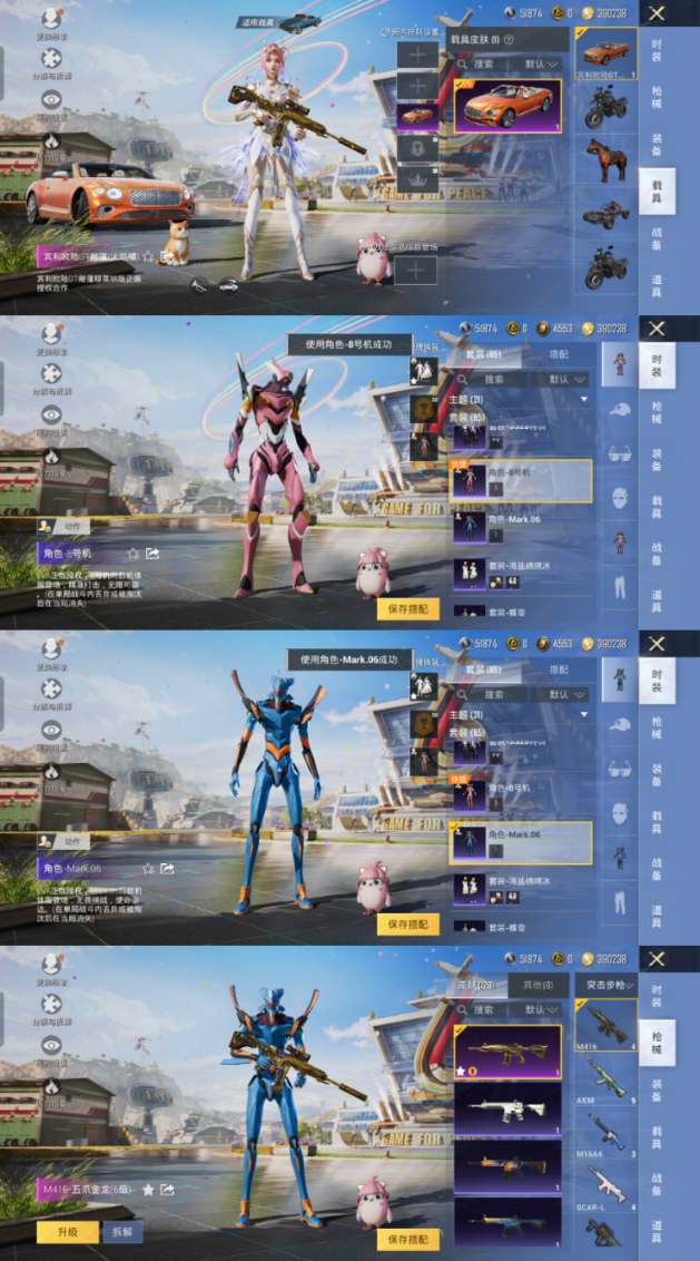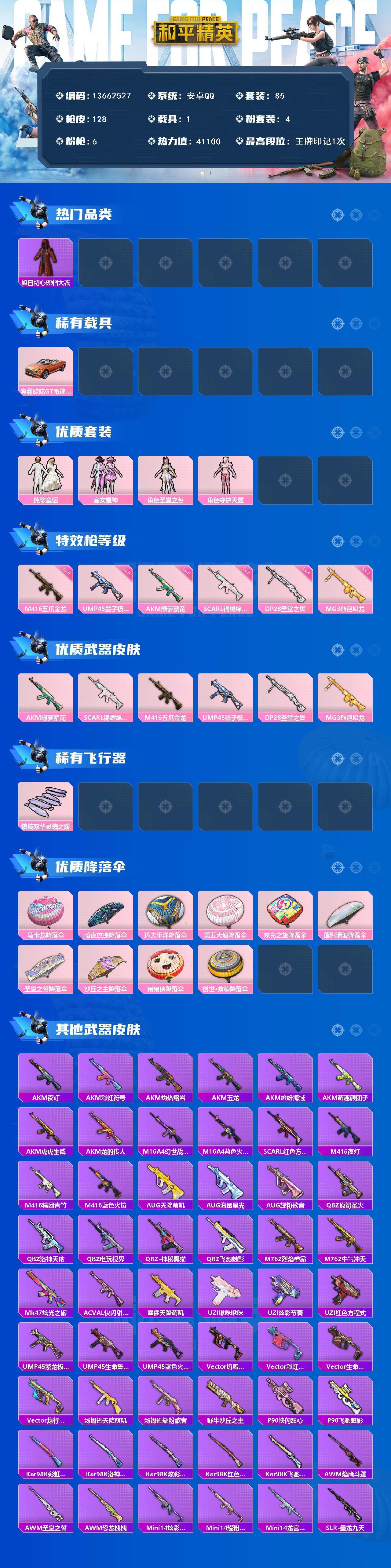 4954-4粉装-6特效呛-1载具-1粉色飞行器-41100热力值-1王牌印记-85套装-128呛皮 【热门品类】:旭日初心兜帽大衣,套装-龟仙人,角色-8号机,角色-mark.06,大砍刀-青龙偃月刀 【粉色载具】:宾利欧陆gt敞篷(火焰橘) 【粉色套装】:粉装-纯珍童话,粉装-室女星神,角色