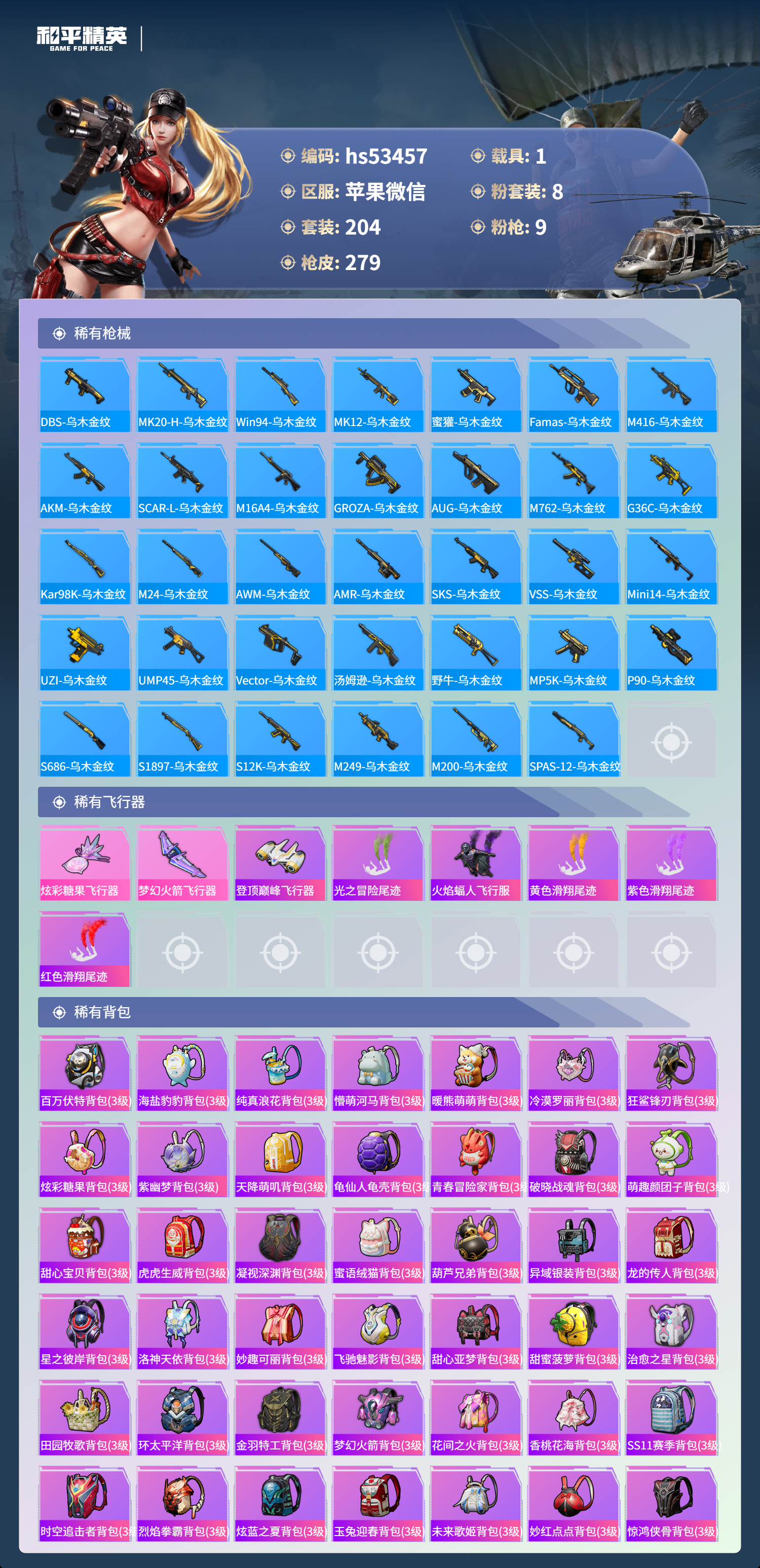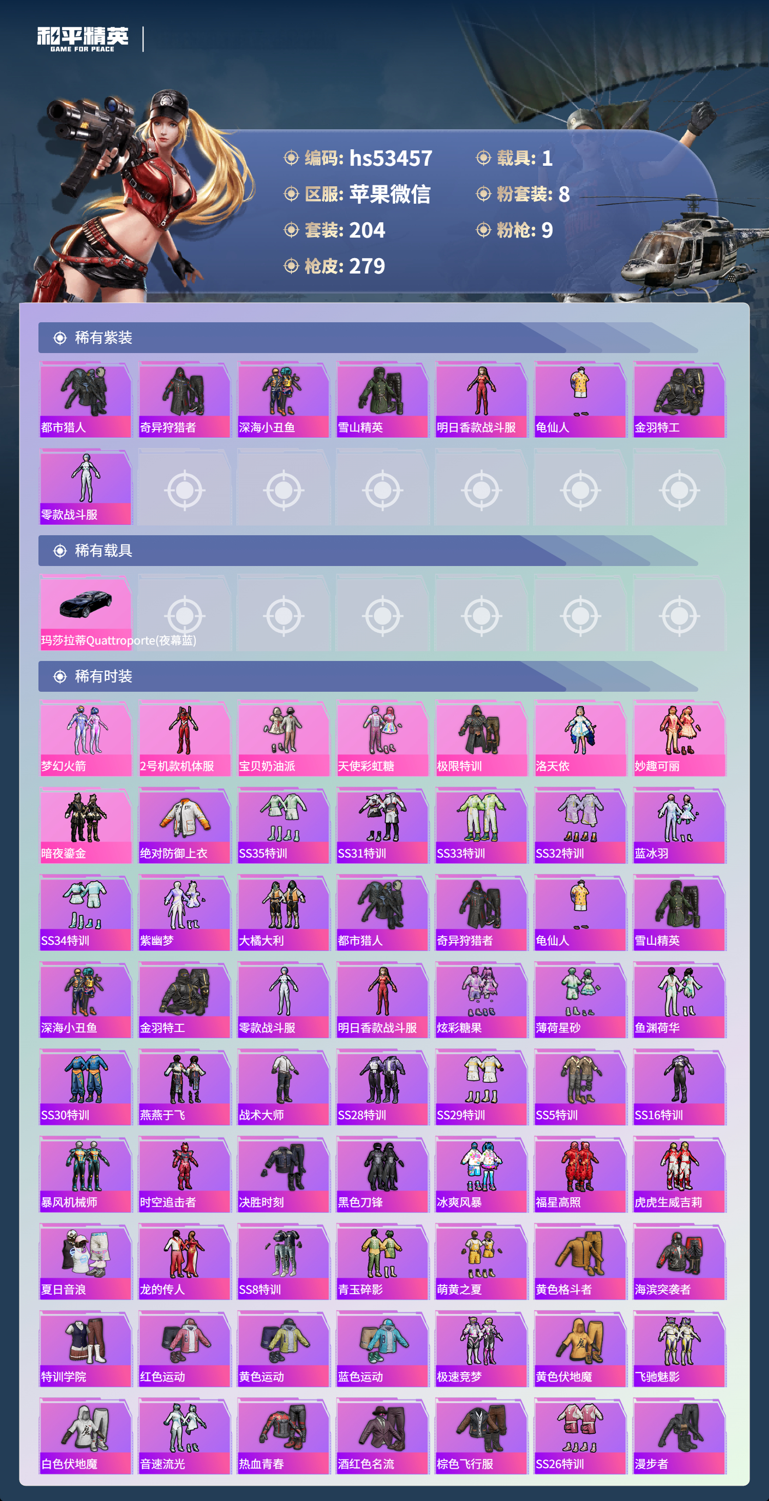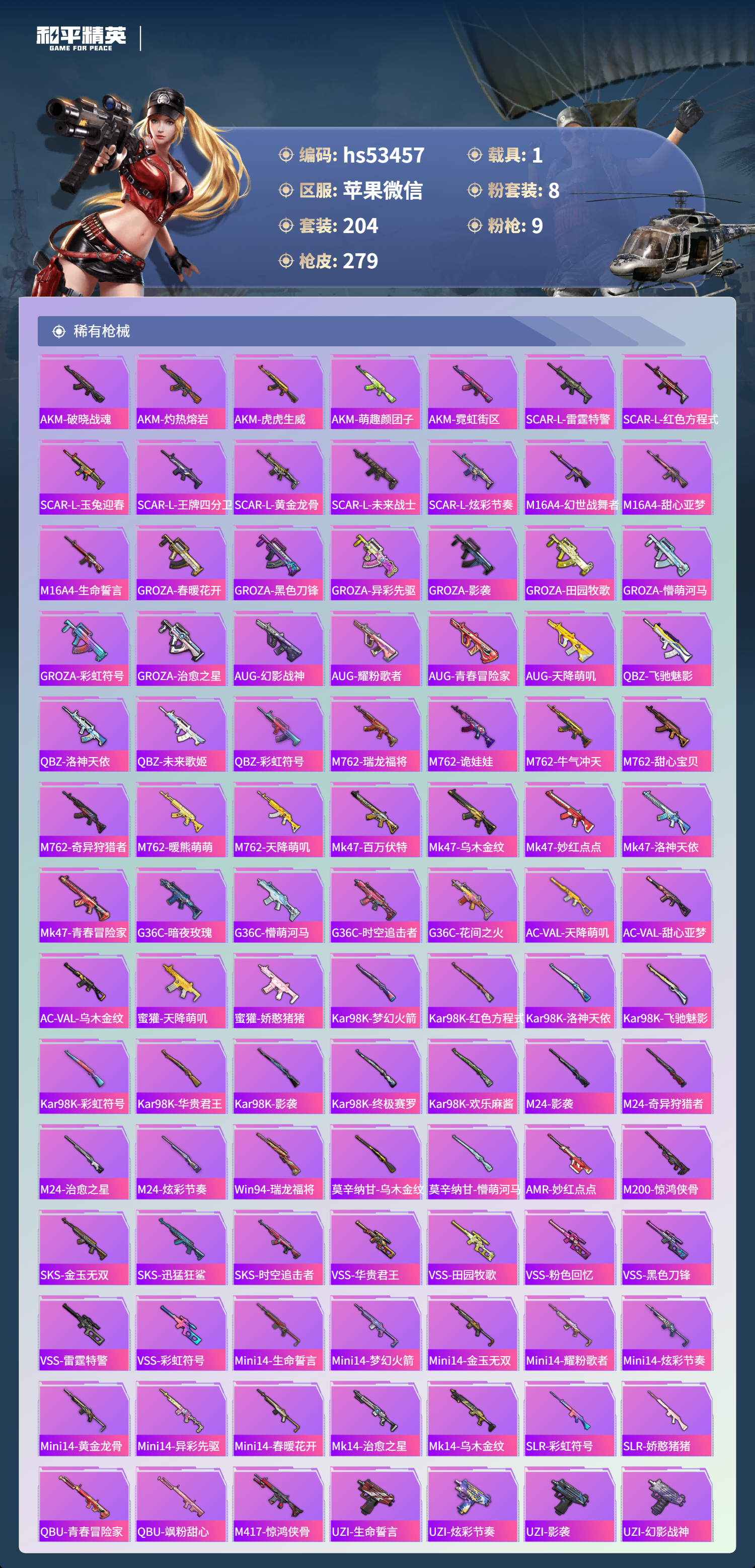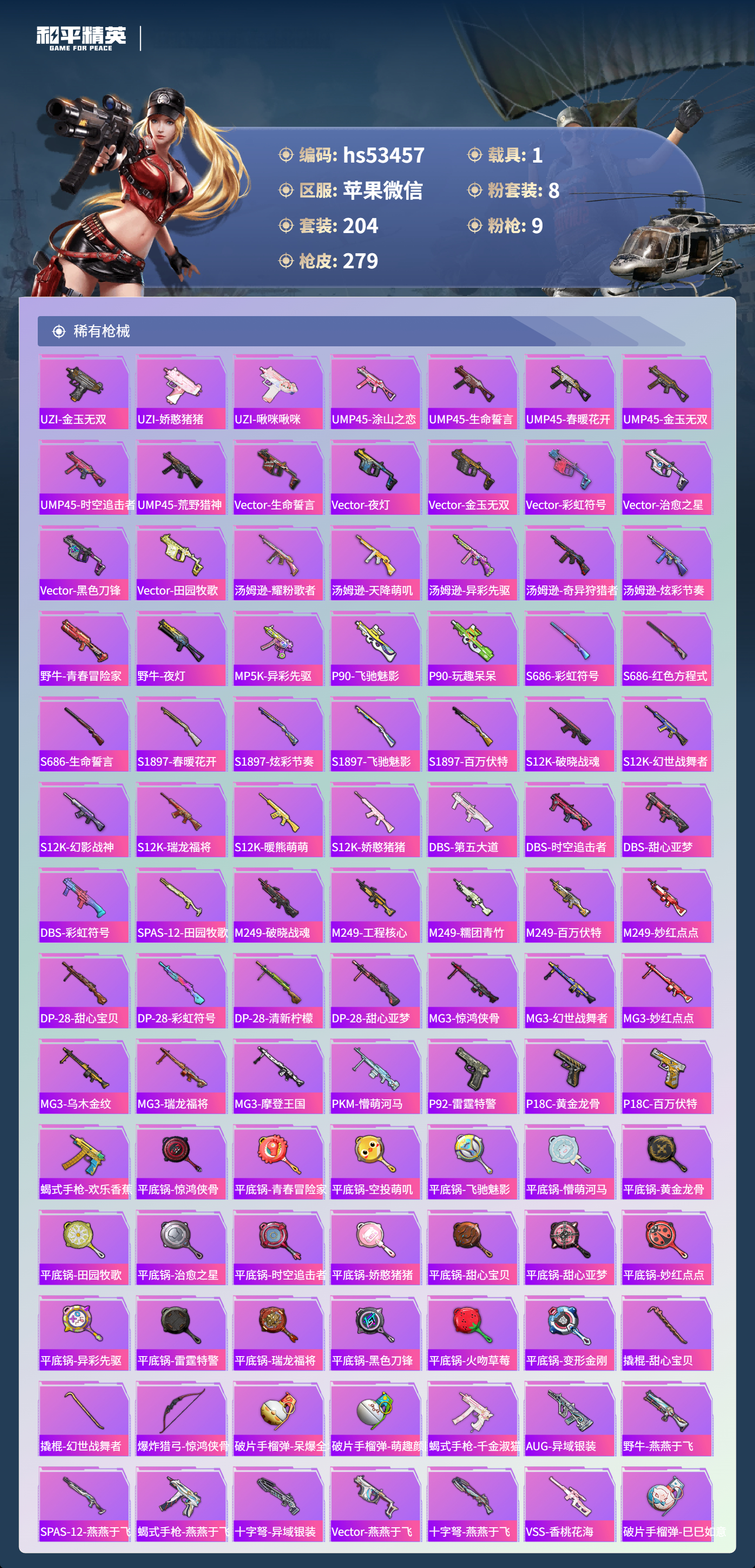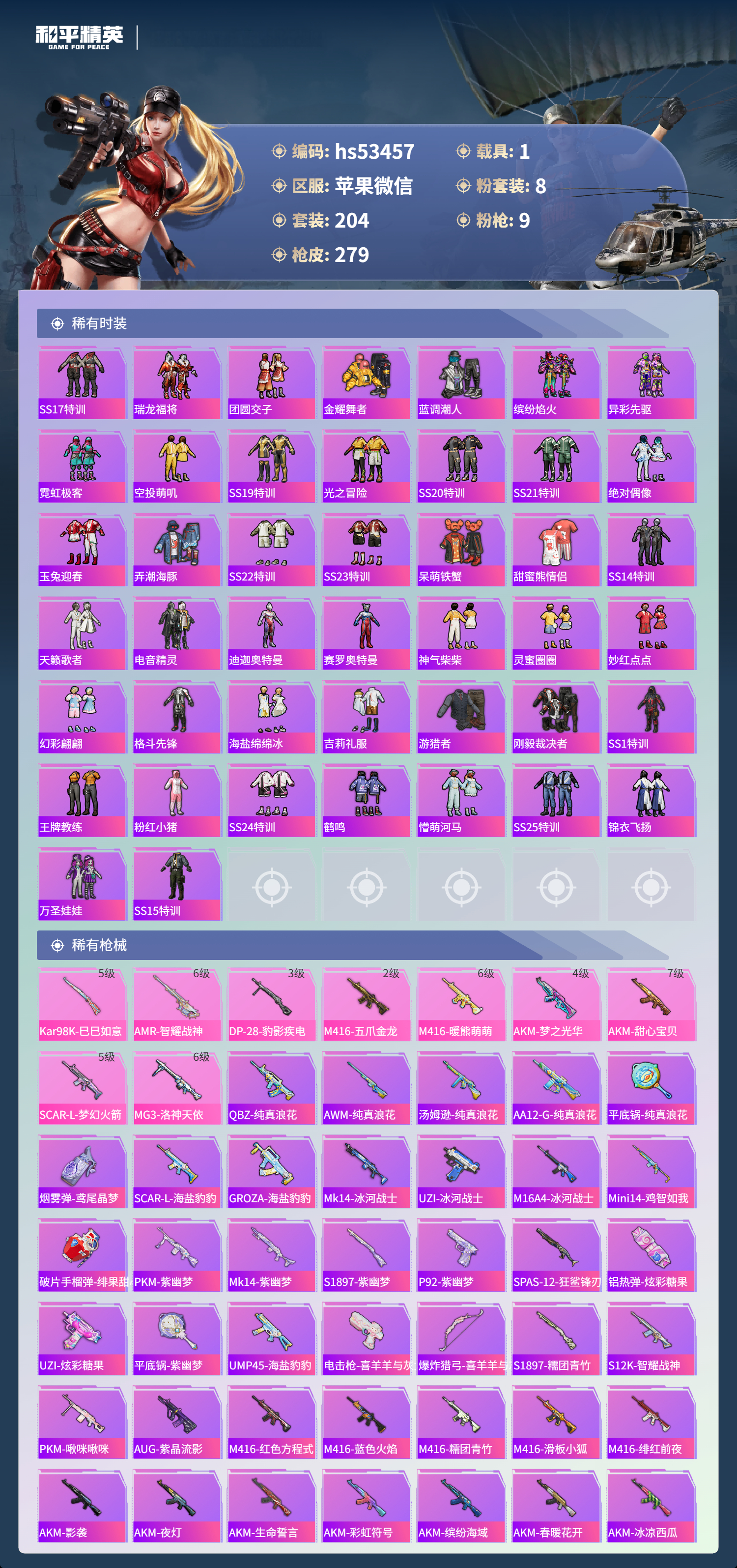 hs53457 苹果微信-25王牌印记-有战神框-8粉装-9特效呛-1载具-88457热力值-204套装-279呛皮-5卓越印记-4传奇印记【8粉装】角色-洛天依套装-梦幻火箭套装-宝贝奶油派角色-2号机款机体服套装-天使彩虹糖套装-妙趣可丽套装-暗夜鎏金套装-极限特训【9特效呛】amr-智耀战神/6级scar-l-梦幻火箭/5级dp-28-豹影疾电/3级akm-甜心宝贝/