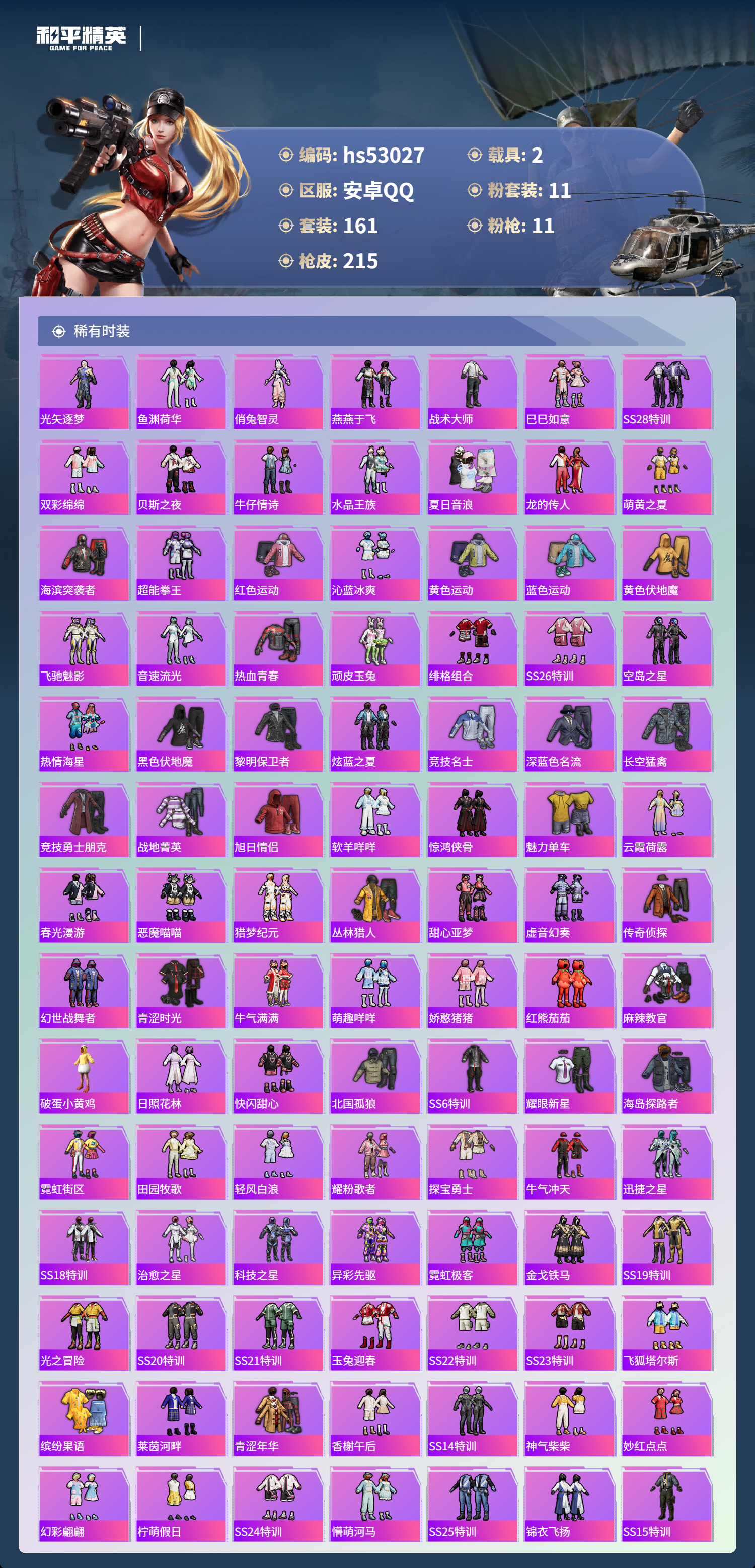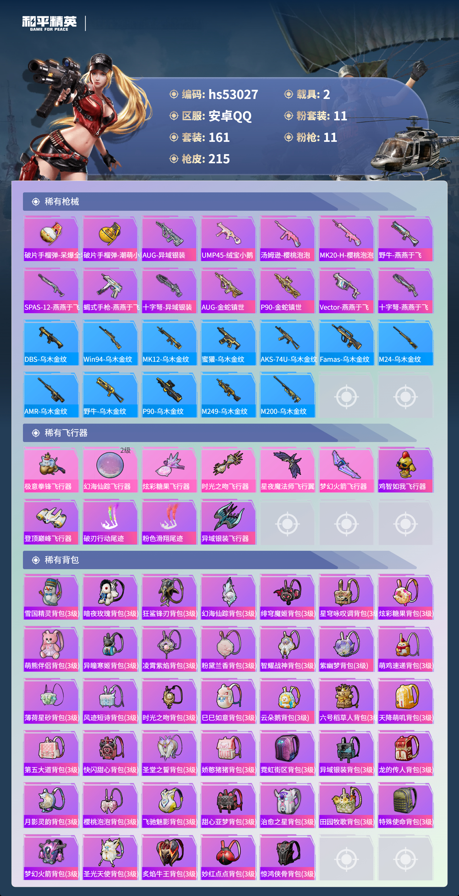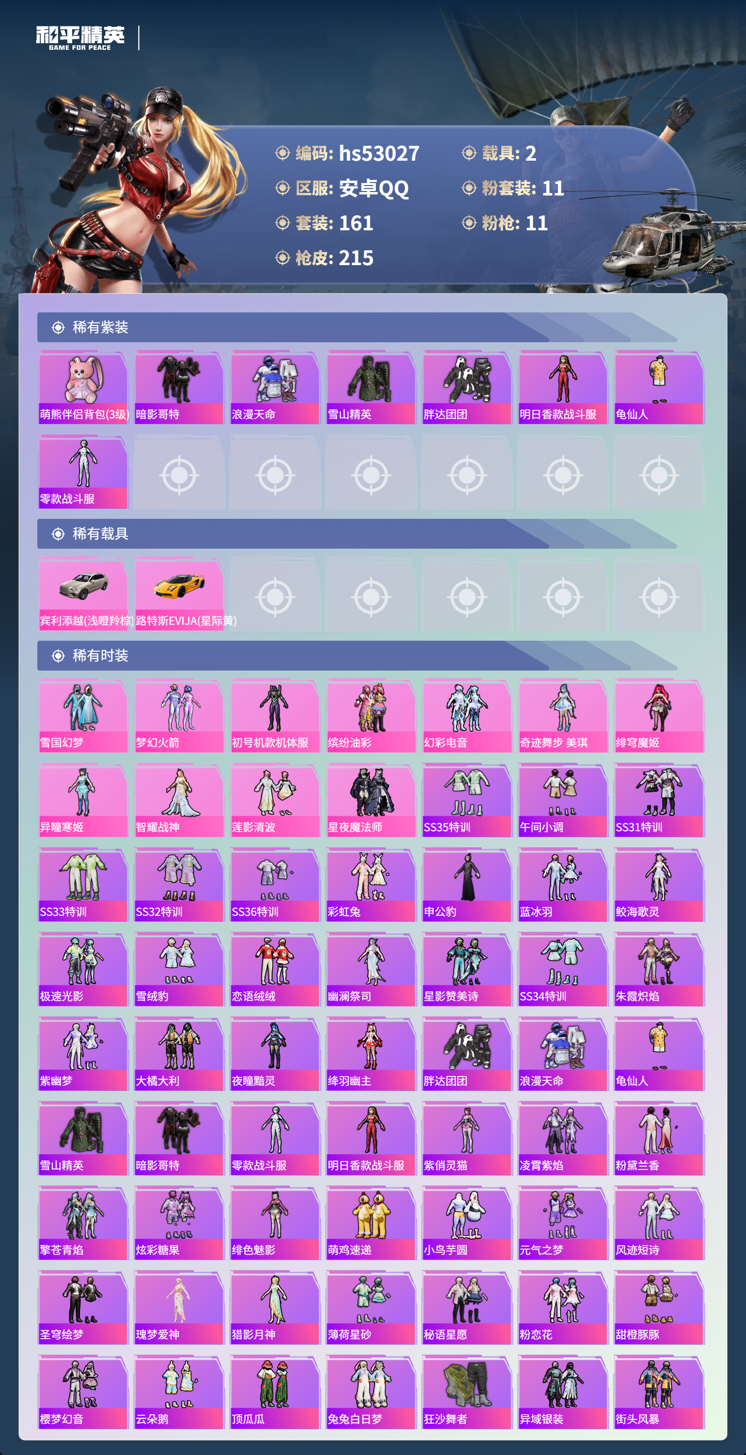 hs53027 安卓手q-12王牌印记-11粉装-11特效呛-2载具-79754热力值-161套装-215呛皮-3卓越印记【11粉装】套装-梦幻火箭角色-绯穹魔姬套装-缤纷油彩套装-幻彩电音套装-星夜魔法师套装-雪国幻梦角色-异瞳寒姬角色-智耀战神角色-奇迹舞步 美琪套装-莲影清波角色-初号机款机体服【11特效呛】vect-绯穹魔姬/7级mg-36-沧焰双生/5级k