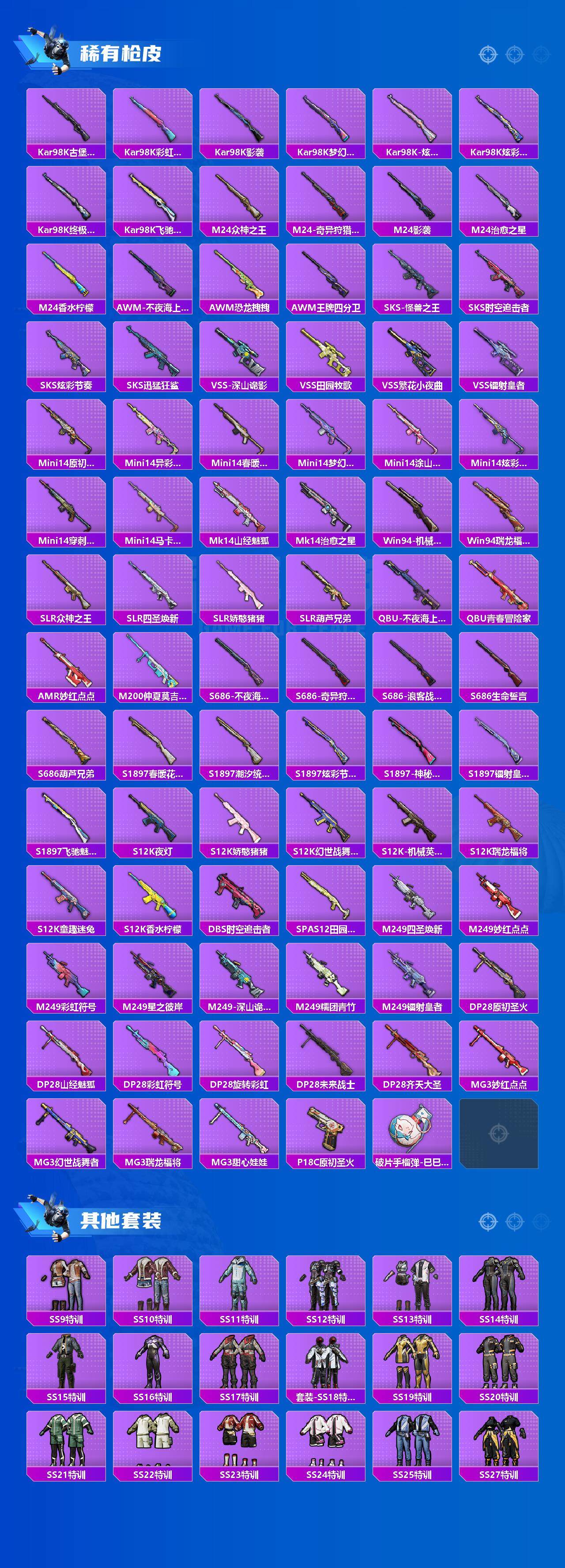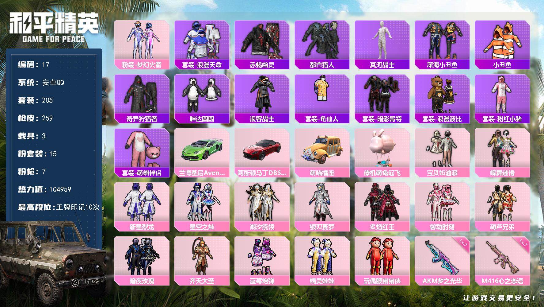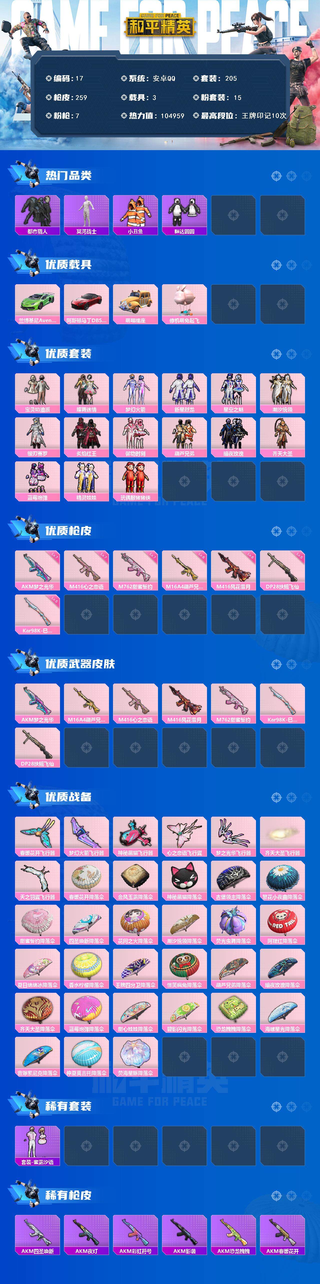 [14595933]【17】安卓 手q-15粉装-7特效呛-3载具-7粉色飞行器-104959热力值-10王牌印记-205套装-259呛皮 【热门品类】:粉装-梦幻火箭,套装-浪漫天命,套装-赤蝎幽灵,套装-都市猎人,套装-冥河战士,套装-深海小丑鱼,套装-小丑鱼,套装-奇异狩猎者,套装-胖达圆圆,套装-浪客战士,套装-龟仙人,套装-暗影哥特,套装-浪漫波比,套装-粉红小猪,套装-萌熊伴侣 【粉色载具】:兰博基尼aventad svj(翡翠绿),阿斯顿马丁dbs(红),萌喵橘座,僚机-萌兔起飞 【粉色套装】:粉装-宝贝奶油派,粉装-蝶舞迷情,粉装-梦幻火箭,粉装-新星烈龙,粉装-星空之魅,粉装-潮汐统领,粉装-银刃赛罗,粉装-炙焰红王,粉装-馨动时刻,粉装-葫芦兄弟,粉装-暗夜玫瑰,粉装-齐天大圣,粉装-蓝莓炮弹,粉装-精灵娃娃,玩偶服-猪猪侠 【粉色呛皮等级】:akm-梦之光华七级,m16a4-葫芦兄弟六级,m416-心之恋语七级,m416-风花雪月六级,m762-甜蜜誓约七级,kar98k-巳巳如意五级,dp-28-扶摇飞仙五级 【粉色呛皮】:akm-梦之光华,m16a4-葫芦兄弟,m416-心之恋语,m416-风花雪月,m762-甜蜜誓约,kar98k-巳巳如意,dp-28-扶摇飞仙 【粉色飞行器】:春暖花开飞行器,梦幻火箭飞行器,神秘黑猫飞行器,心之恋语飞行翼,梦之光华飞行器,齐天大圣飞行器,天之羽翼飞行器 【粉色降落伞】:春暖花开降落伞,金风玉露降落伞,神秘黑猫降落伞,古堡领主降落伞,繁花小夜曲降落伞,甜蜜誓约降落伞,四圣焕新降落伞,花间之火降落伞,潮汐统领降落伞,荧光虫舞降落伞,阿狸红降落伞,夏日绵绵冰降落伞,香水柠檬降落伞,王牌四分卫降落伞,怪笑疯兔降落伞,葫芦兄弟降落伞,暗夜玫瑰降落伞,齐天大圣降落伞,蓝莓炮弹降落伞,甜心娃娃降落伞,碧影闪光降落伞,恐龙拽拽降落伞,海螺星光降落伞,音爆索尼克降落伞,仲夏莫吉托降落伞,荧海星豚降落伞 【稀有套装】:套装-龟仙人,套装-蜜露汐语 【稀有呛皮】:akm-四圣焕新,akm-夜灯,akm-彩虹符号,akm-影袭,akm-恐龙拽拽,akm-春暖花开,akm-灼热熔岩,akm-玉龙,akm-百万伏特,akm-破晓战魂,akm-缤纷海域,akm-萌趣颜团子,akm-虎虎生威,akm-霓虹街区,akm-龙