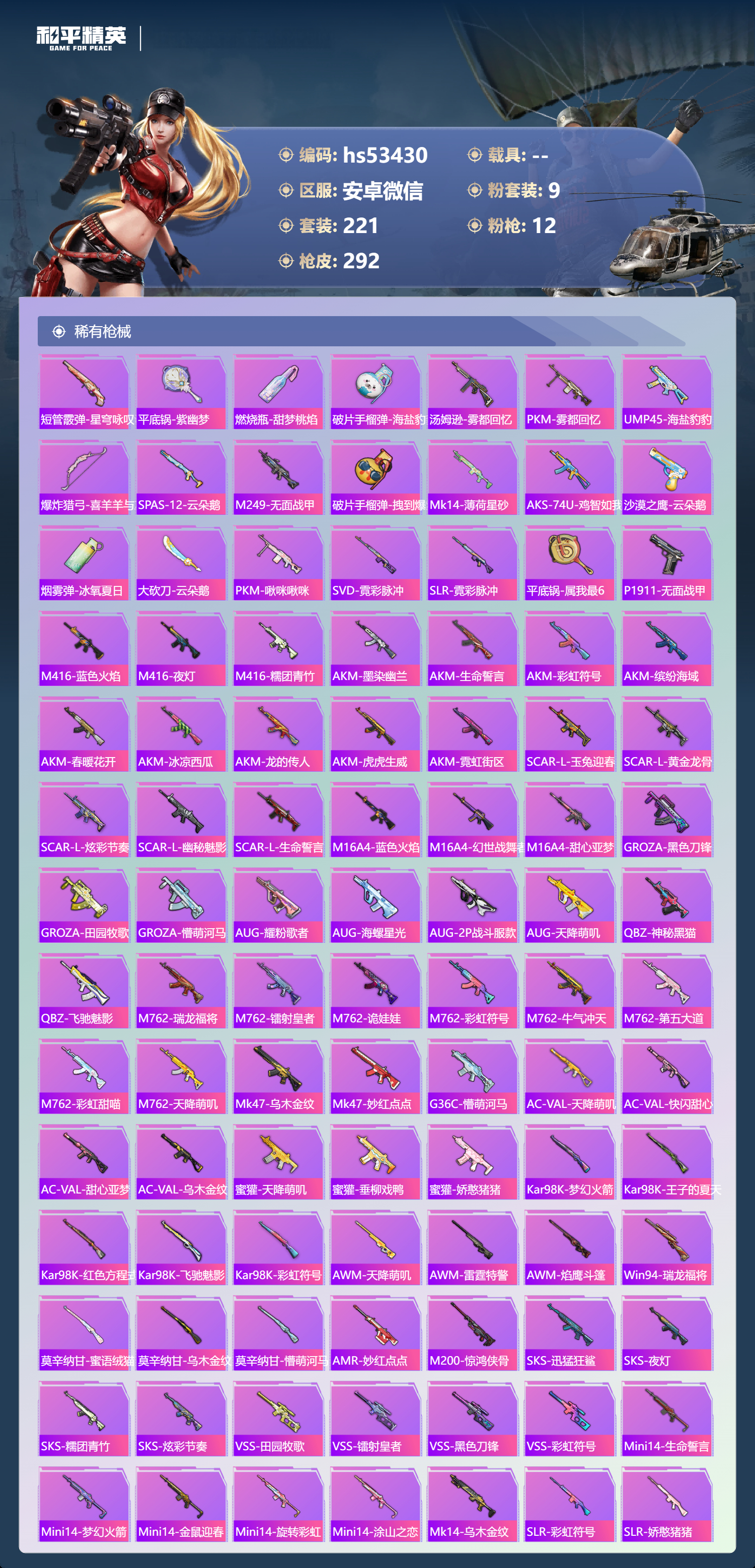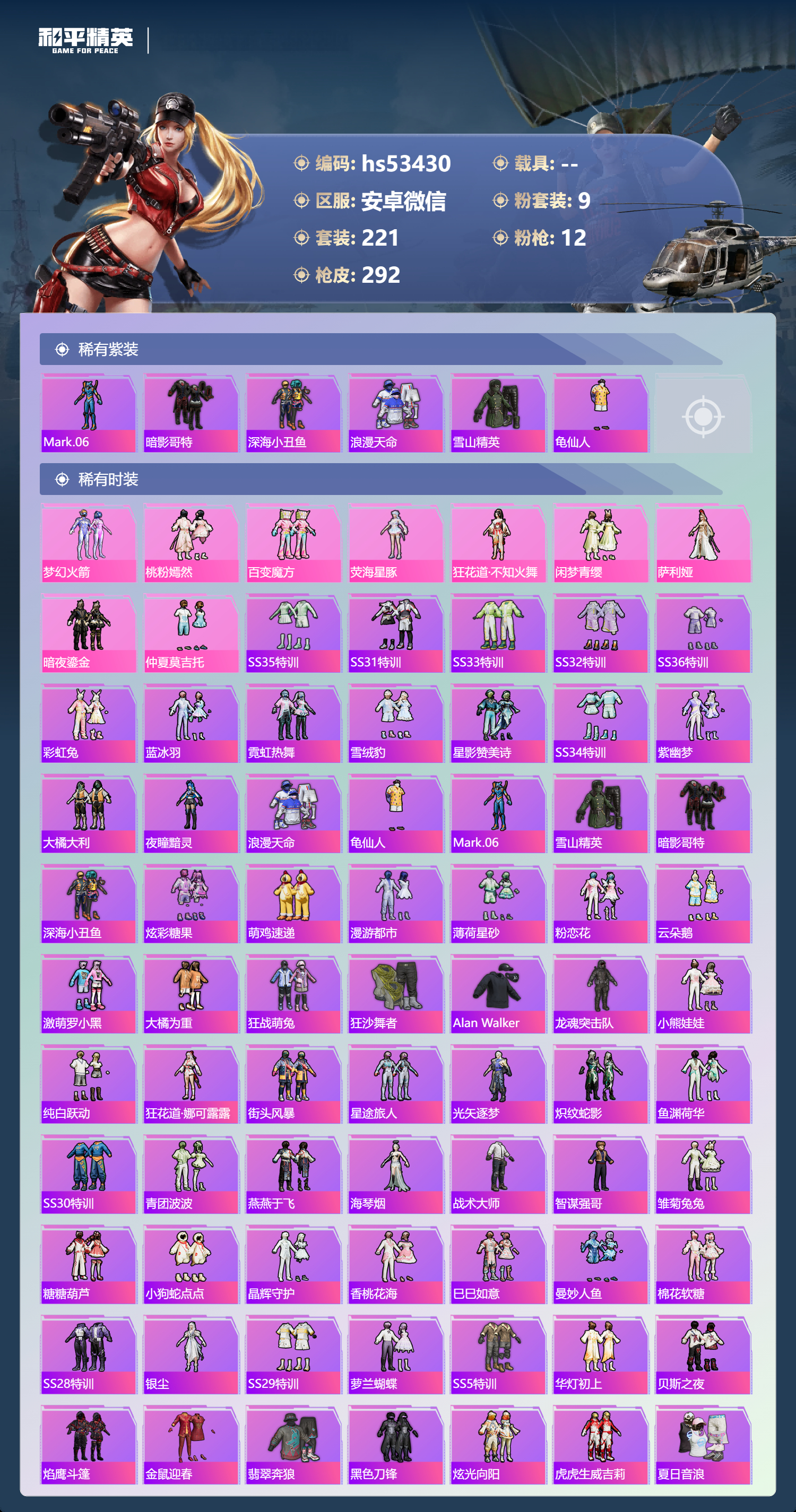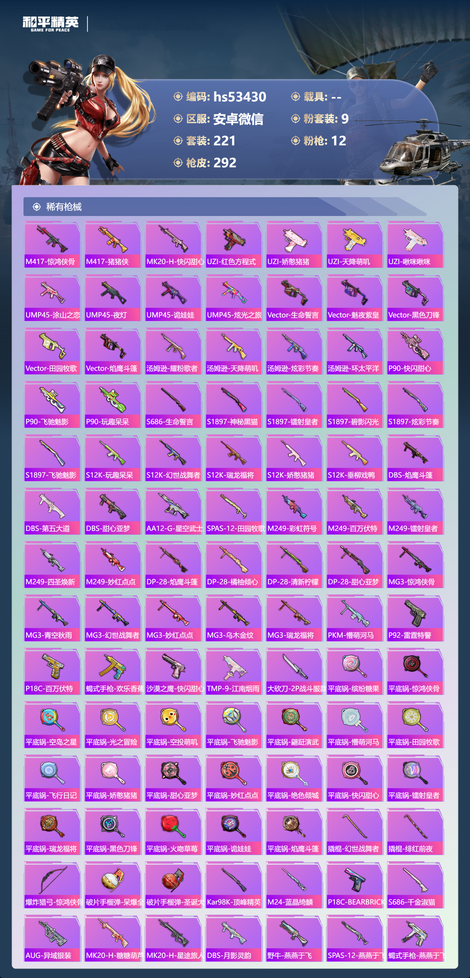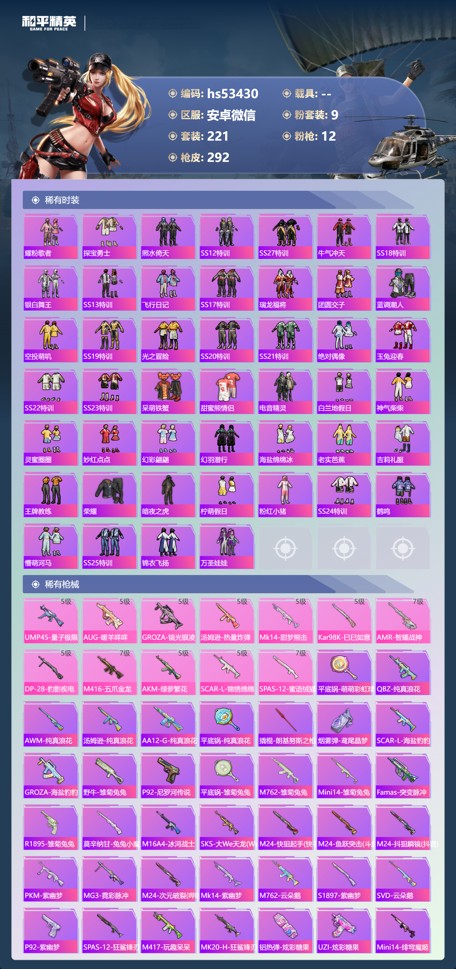hs53430 安卓微信-19王牌印记-9粉装-12特效呛-96742热力值-221套装-292呛皮-4卓越印记-3传奇印记【9粉装】套装-梦幻火箭套装-暗夜鎏金套装-闲梦青缨套装-桃粉嫣然套装-百变魔方套装-仲夏莫吉托角色-荧海星豚角色-萨利娅角色-狂花道·不知火舞【12特效呛】dp-28-豹影疾电/5级mk14-甜梦熊击/5级spas-12-蜜语绒猫/7级m416-五