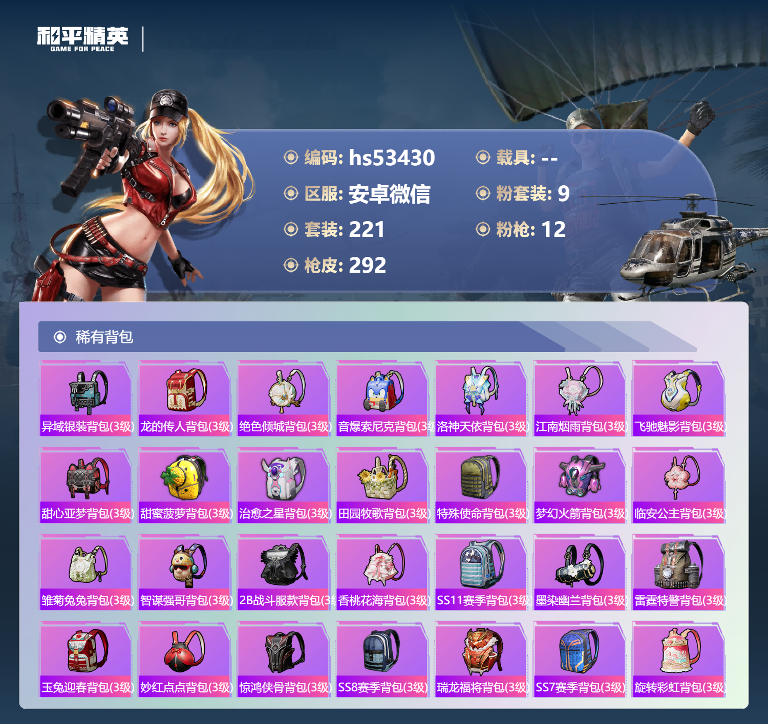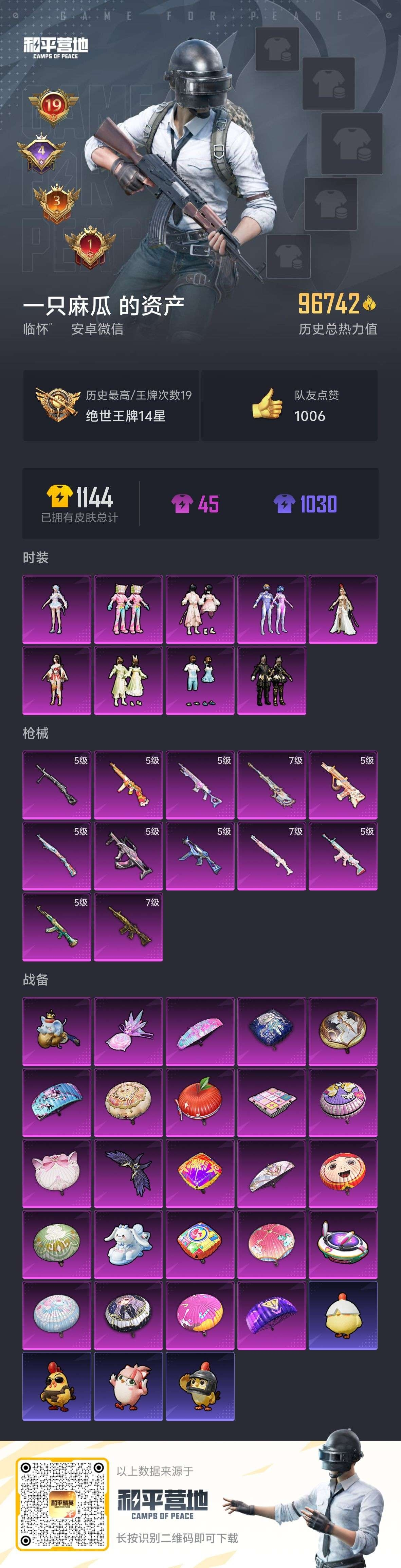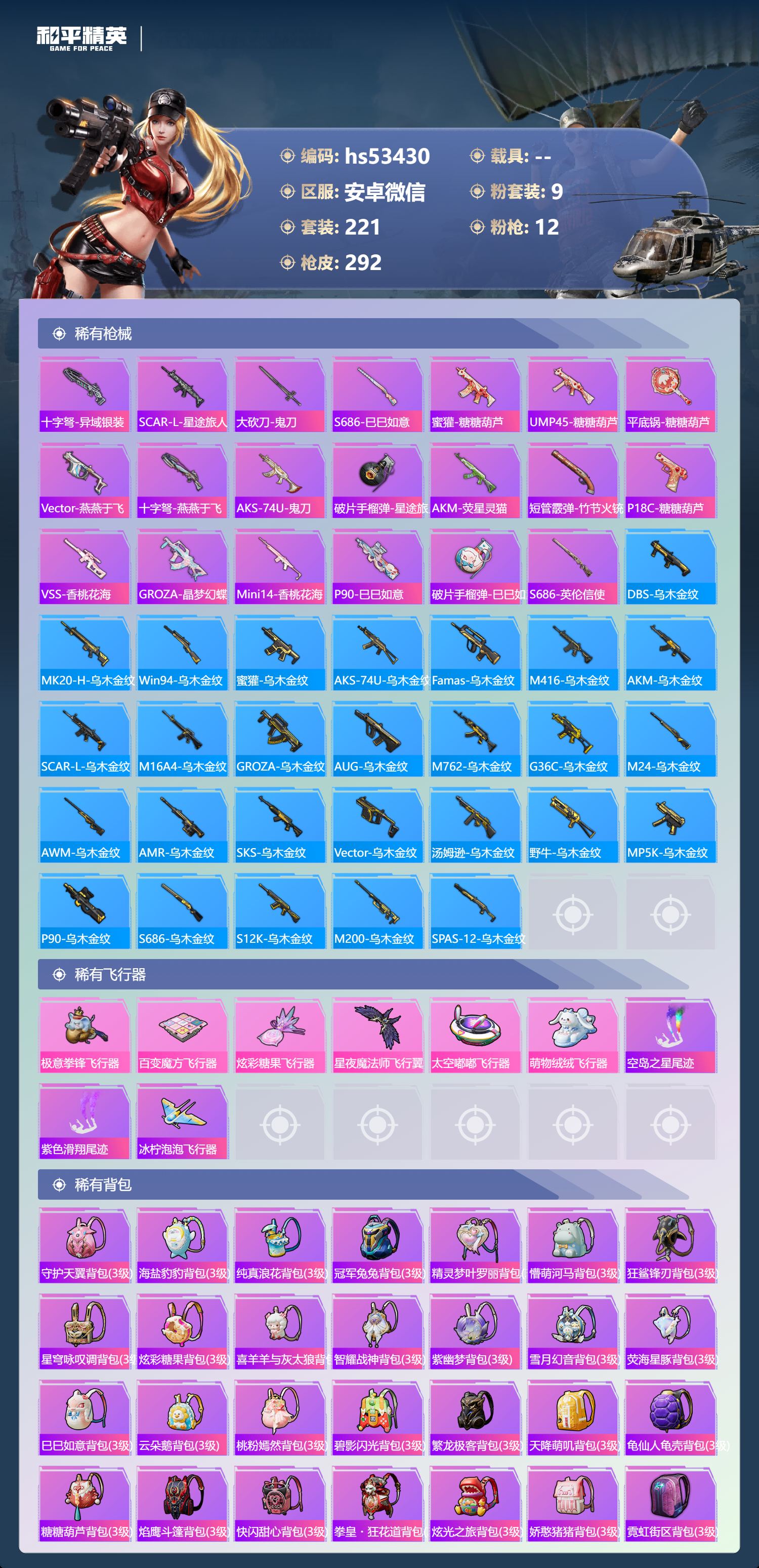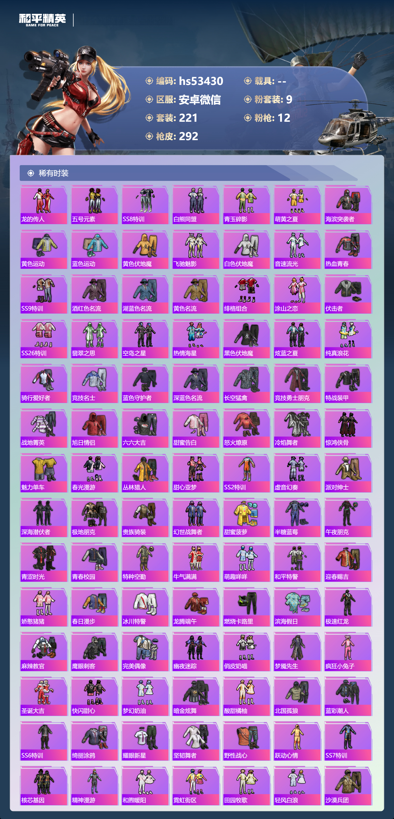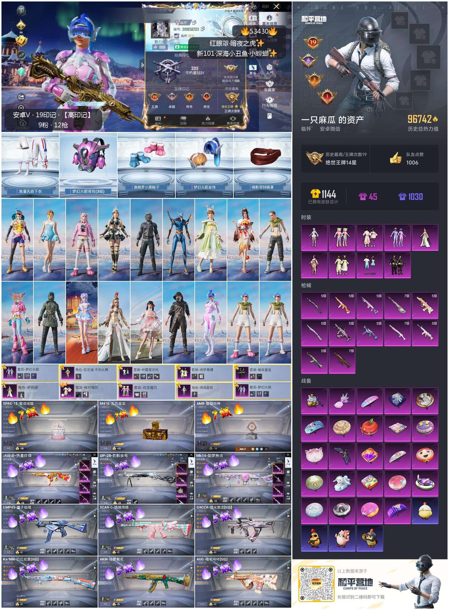 hs53430 安卓微信-19王牌印记-9粉装-12特效呛-96742热力值-221套装-292呛皮-4卓越印记-3传奇印记【9粉装】套装-梦幻火箭套装-暗夜鎏金套装-闲梦青缨套装-桃粉嫣然套装-百变魔方套装-仲夏莫吉托角色-荧海星豚角色-萨利娅角色-狂花道·不知火舞【12特效呛】dp-28-豹影疾电/5级mk14-甜梦熊击/5级spas-12-蜜语绒猫/7级m416-五