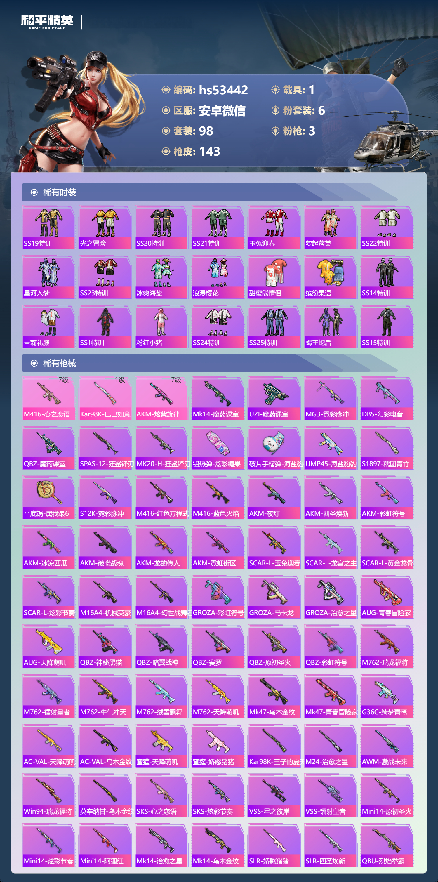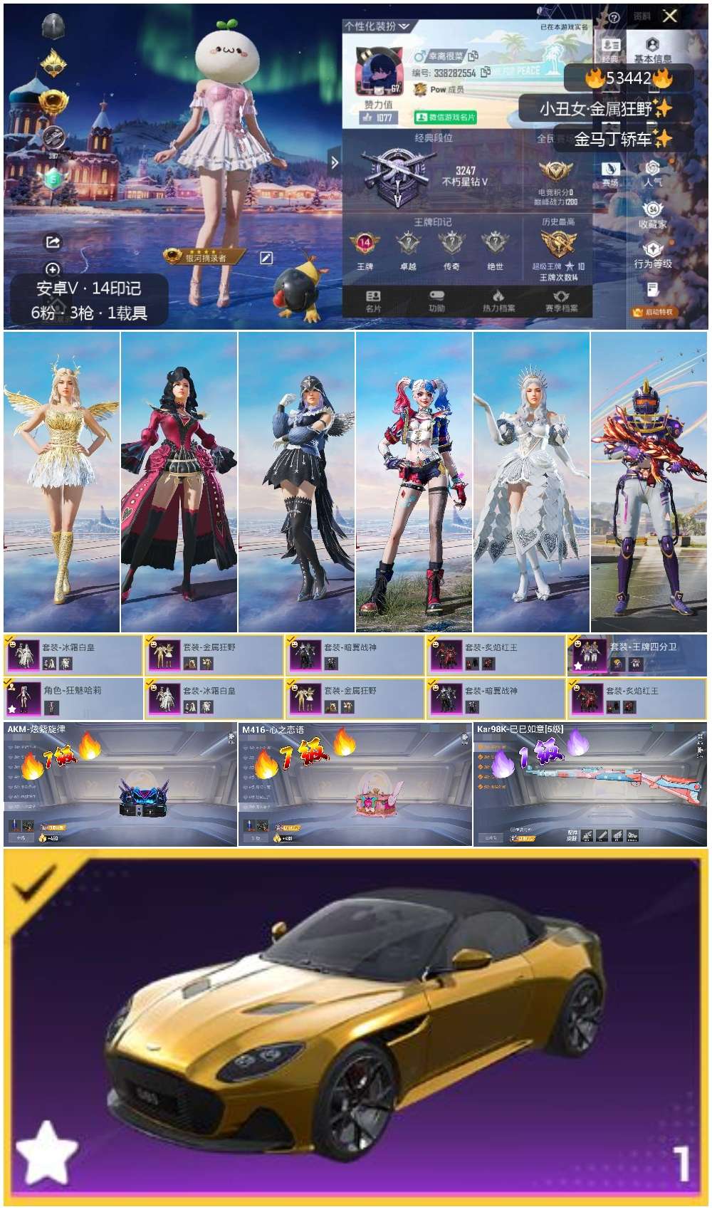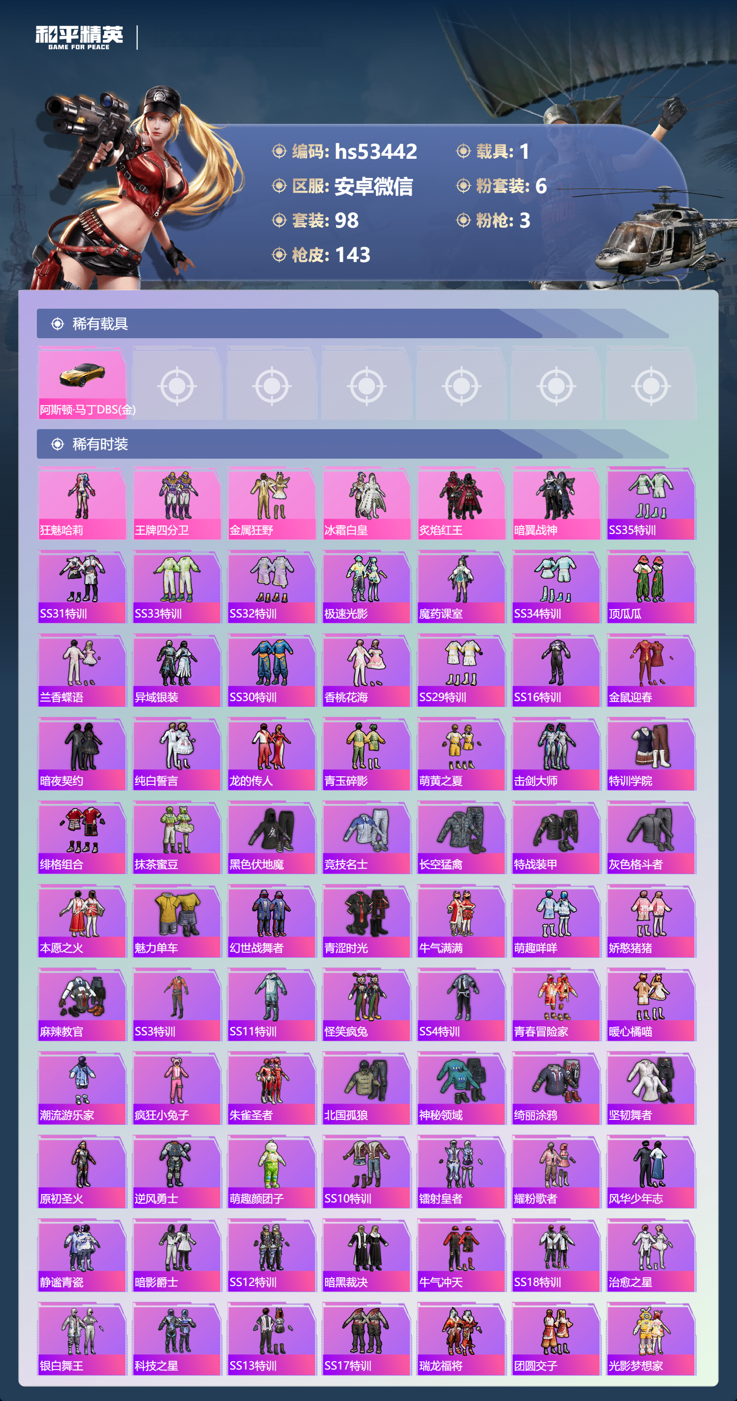 hs53442 安卓微信-14王牌印记-6粉装-3特效呛-1载具-48894热力值-98套装-143呛皮【6粉装】角色-狂魅哈莉套装-冰霜白皇套装-炙焰红王套装-王牌四分卫套装-金属狂野套装-暗翼战神【3特效呛】kar98k-巳巳如意/1级akm-炫紫旋律/7级m416-心之恋语/7级【1稀有载具】阿斯顿·马丁dbs金【98稀有时装】狂魅哈莉ss35特训ss31特训