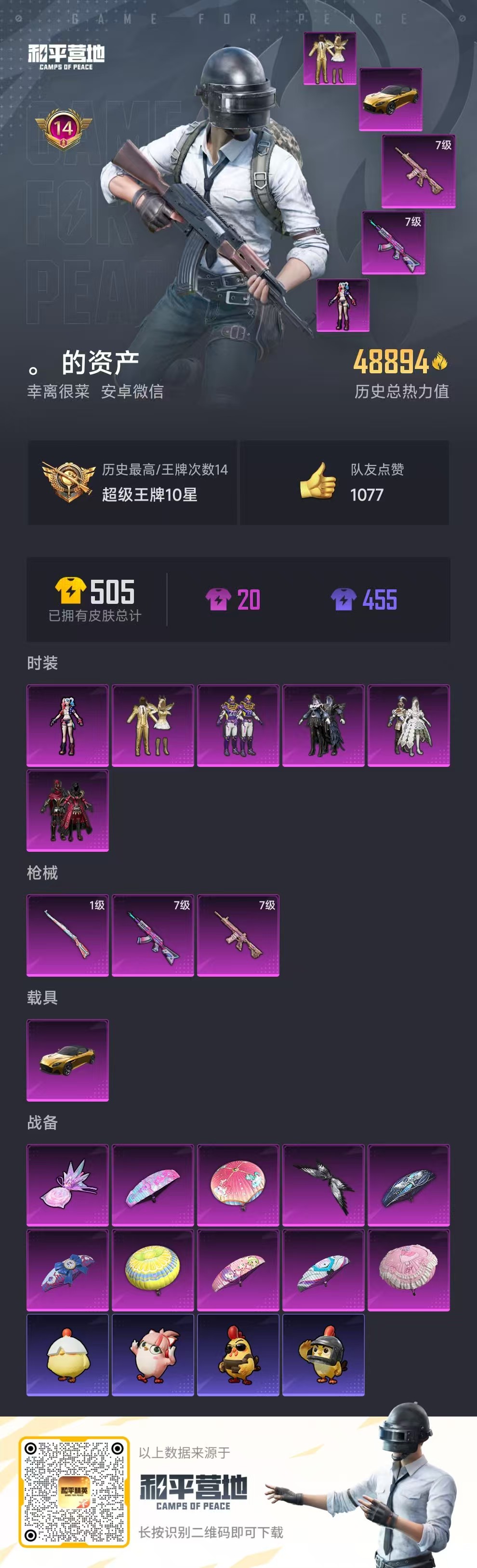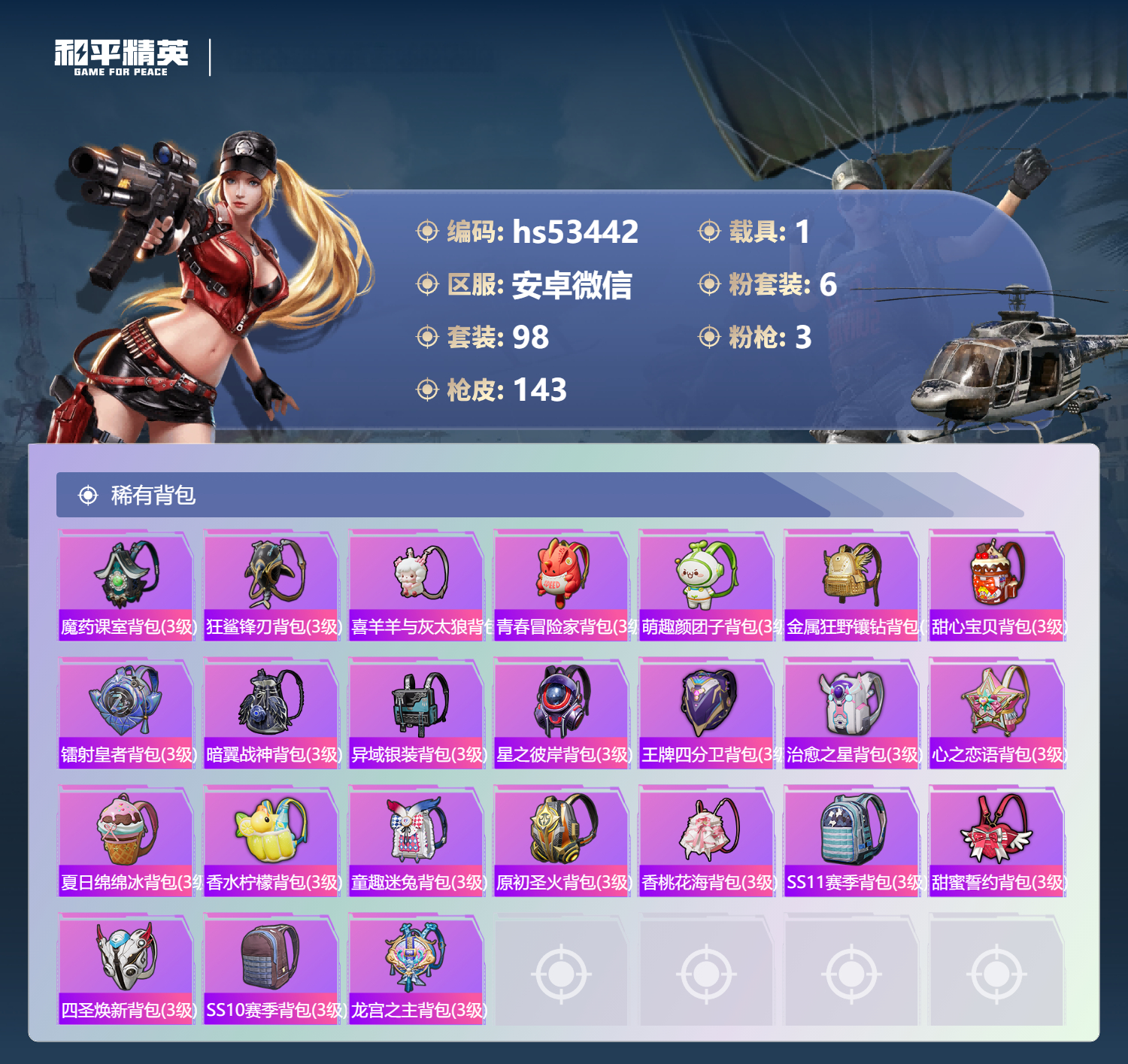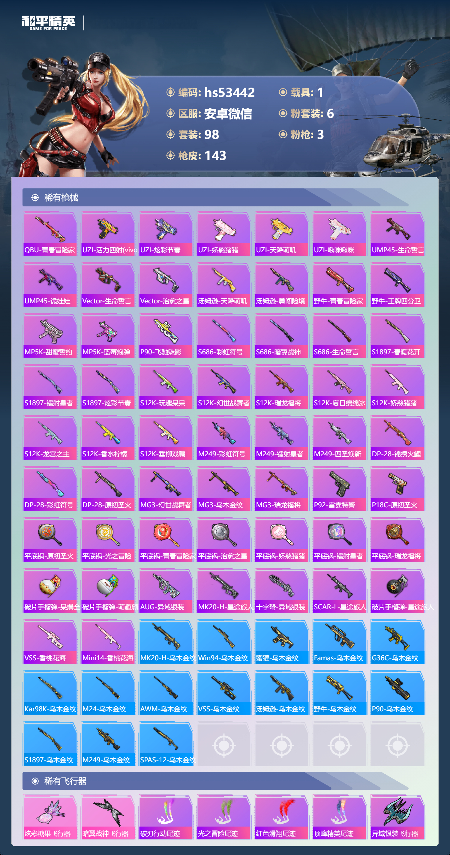hs53442 安卓微信-14王牌印记-6粉装-3特效呛-1载具-48894热力值-98套装-143呛皮【6粉装】角色-狂魅哈莉套装-冰霜白皇套装-炙焰红王套装-王牌四分卫套装-金属狂野套装-暗翼战神【3特效呛】kar98k-巳巳如意/1级akm-炫紫旋律/7级m416-心之恋语/7级【1稀有载具】阿斯顿·马丁dbs金【98稀有时装】狂魅哈莉ss35特训ss31特训