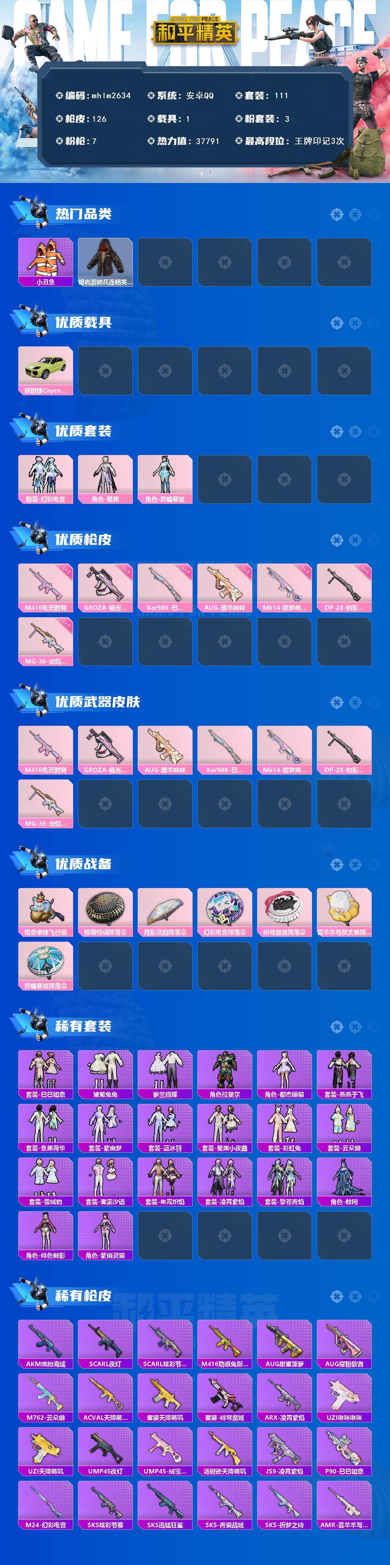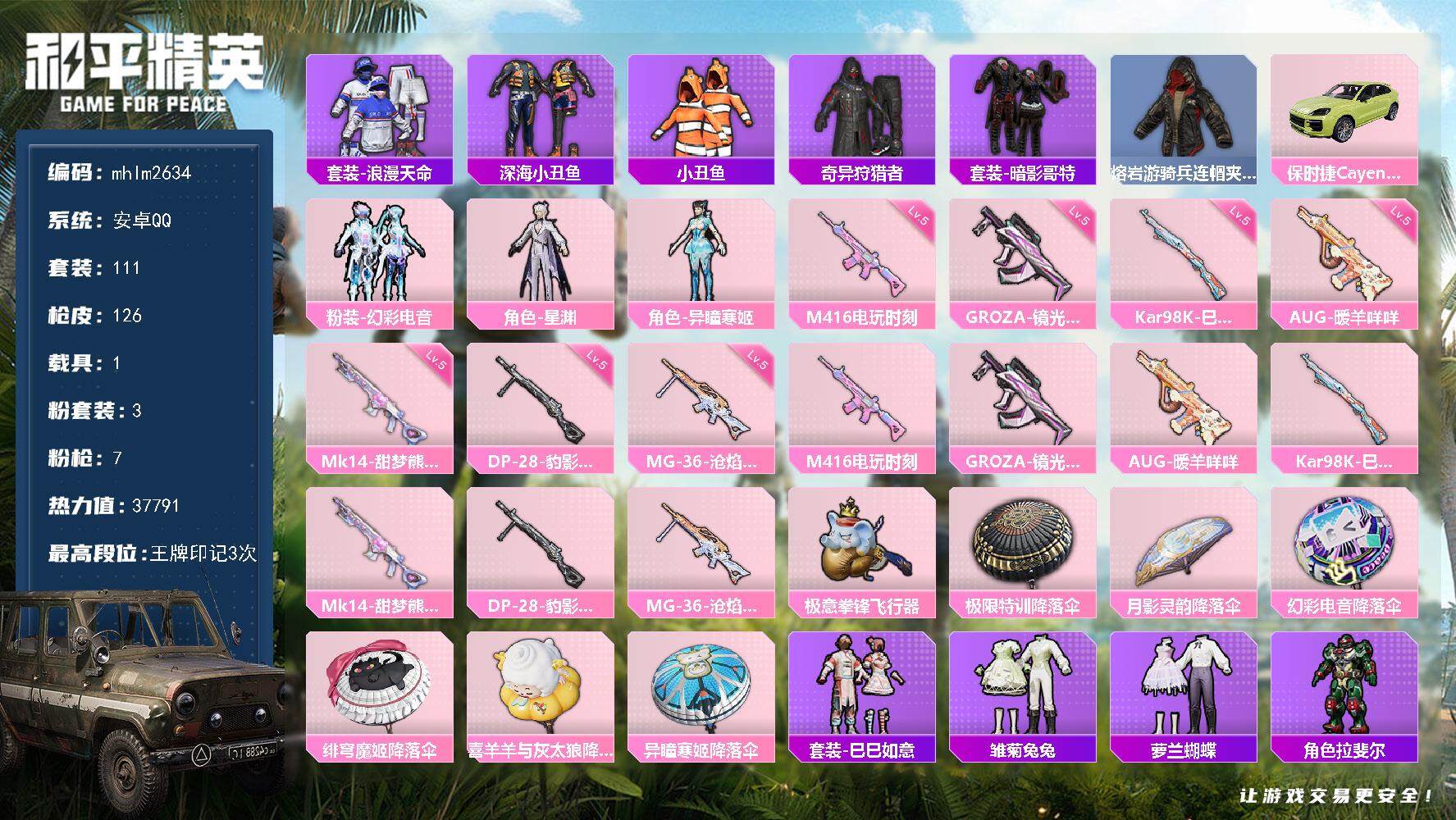 [14596847]【mhlm2634】安卓 手q-3粉装-7特效呛-1载具-2粉色飞行器-37791热力值-3王牌印记-111套装-126呛皮 【热门品类】:套装-浪漫天命,套装-深海小丑鱼,套装-小丑鱼,套装-奇异狩猎者,套装-暗影哥特,熔岩游骑兵连帽夹克 【粉色载具】:保时捷cayenne(橄榄绿) 【粉色套装】:粉装-幻彩电音,角色-星渊,角色-异瞳寒姬 【粉色呛皮等级】:m416-电玩时刻五级,groza-镜光银凌五级,aug-暖羊咩咩五级,kar98k-巳巳如意五级,mk14-甜梦熊击五级,dp-28-豹影疾电五级,mg-36-沧焰双生五级 【粉色呛皮】:m416-电玩时刻,groza-镜光银凌,aug-暖羊咩咩,kar98k-巳巳如意,mk14-甜梦熊击,dp-28-豹影疾电,mg-36-沧焰双生 【粉色飞行器】:极意拳锋飞行器 【粉色降落伞】:极限特训降落伞,月影灵韵降落伞,幻彩电音降落伞,绯穹魔姬降落伞,喜羊羊与灰太狼降落伞,异瞳寒姬降落伞 【稀有套装】:套装-巳巳如意,套装-雏菊兔兔,套装-萝兰蝴蝶,角色-拉斐尔,角色-都市丽猫,套装-燕燕于飞,套装-鱼渊荷华,套装-紫幽梦,套装-蓝冰羽,套装-星渊小夜曲,套装-彩虹兔,套装-云朵鹅,套装-雪绒豹,套装-蜜露汐语,套装-朱霞炽焰,套装-凌霄紫焰,套装-擎苍青焰,角色-敖闰,角色-绯色魅影,角色-紫俏灵猫,套装-炫彩糖果 【稀有呛皮】:aug-冰晶雪宝,akm-缤纷海域,scar-l-夜灯,scar-l-炫彩节奏,m416-动感兔斯基,aug-甜蜜菠萝,aug-耀粉歌者,m762-云朵鹅,ac-val-天降萌叽,蜜獾-天降萌叽,蜜獾-绯穹魔姬,arx-凌霄紫焰,uzi-啾咪啾咪,uzi-天降萌叽,ump45-夜灯,ump45-绒宝小鹅,汤姆逊-天降萌叽,js9-凌霄紫焰,p90-巳巳如意,m24-幻彩电音,sks-炫彩节奏,sks-迅猛狂鲨,sks-青瓷战姬,sks-折梦之诗,amr-喜羊羊与灰太狼,svd-云朵鹅,s686-巳巳如意,s12k-夜灯,s12k-智耀战神,s12k-极意拳锋,spas-12-云朵鹅,m249-萌萌史莱姆,dp-28-彩虹符号,mg3-幻世战舞者,mg3-折梦之诗,mg-36-凌霄紫焰,p92-凌霄紫焰,短管霰弹-星穹咏叹调,沙墨之鹦-云朵鹅,tmp-9-雪月