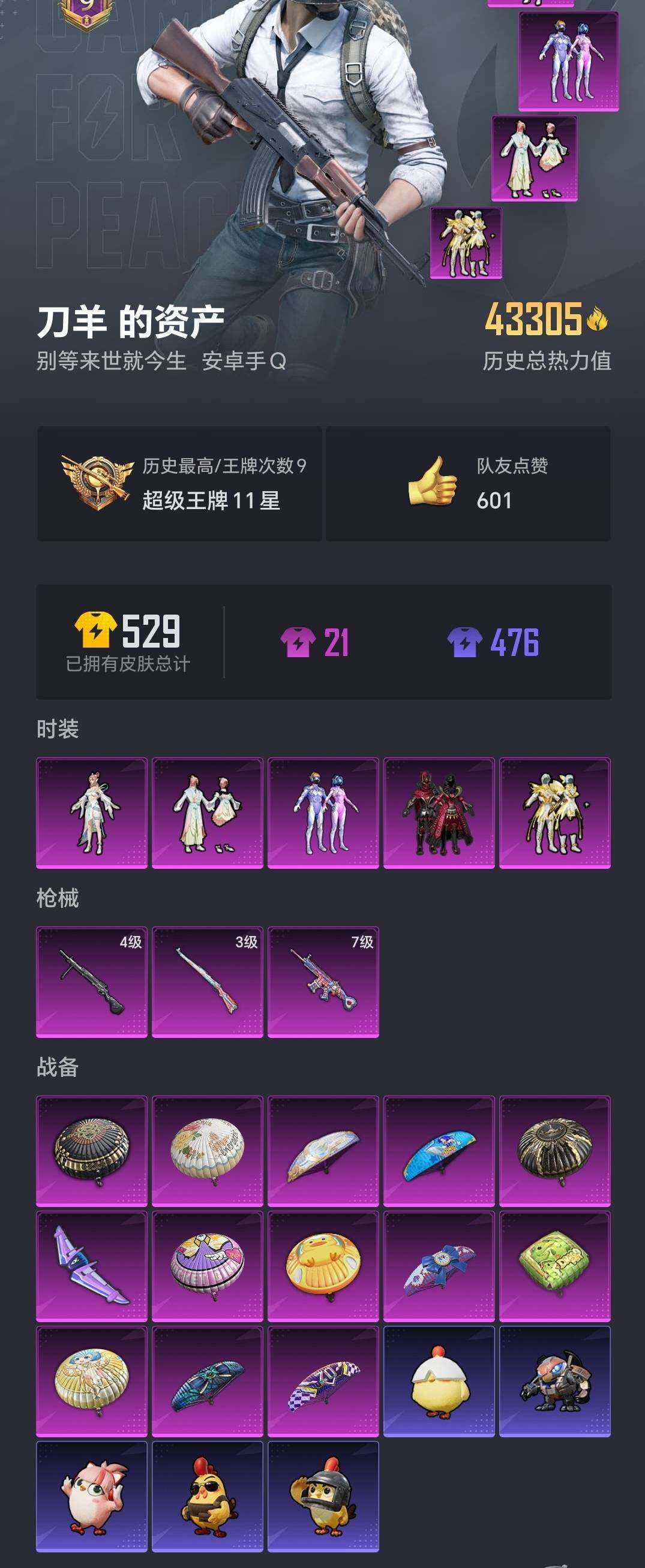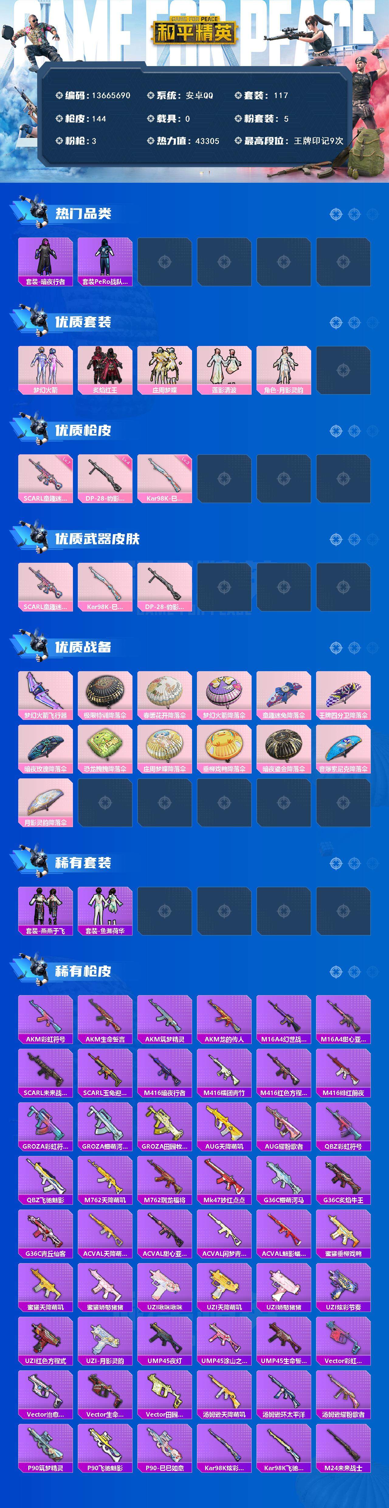 6113-5粉装-3特效呛-0载具-1粉色飞行器-43305热力值-9王牌印记-117套装-144呛皮 【热门品类】:粉装-梦幻火箭,套装-浪漫天命,套装-暗夜行者,套装-pero战队服,套装-龟仙人 【粉色套装】:粉装-梦幻火箭,粉装-炙焰红王,粉装-庄周梦蝶,粉装-莲影清波,角色-月影灵韵