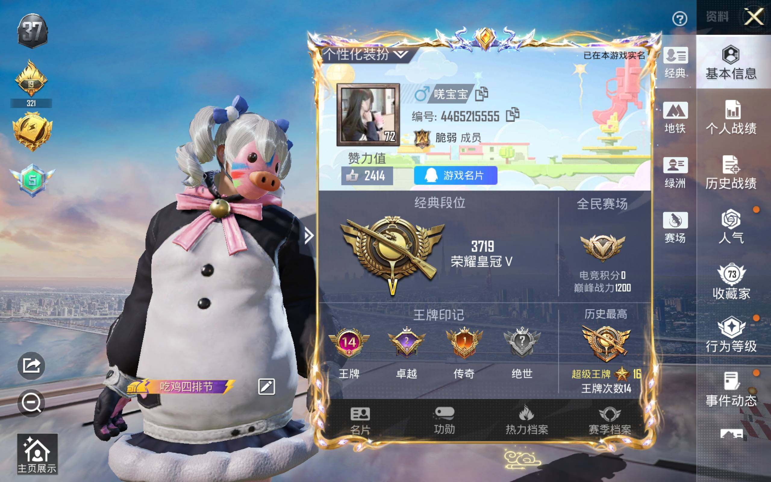 公主号-地铁满天赋-千金淑猫/彩虹甜喵/猪脸/胖达/浪漫天命/兔兔白日梦/萌神柯基/宝贝奶油派/冰霜白皇/炙焰红王/彩虹鹿灵/蓝莓炮弹/岚岚物语/霁雪冰心/冰川幽秘/莲影清波/异瞳寒姬/冷漠罗丽/spas蜜语绒猫7级/pkm天星战神7级/ak绿萝繁花5级/98k巳巳如意5级/mk14闲梦青缨5级/dp28豹影疾电5级/slr暗夜玫瑰1级(14粉套7粉呛)没战神框hp4251-3粉色飞行器-84347热力值-14王牌印记-203套装-250呛皮 【热门品类】:粉装-缤纷油彩,套装-浪漫天命,套装-胖达圆圆,套装-龟仙人 【粉色套装】:粉装-宝贝奶油派,粉装-缤纷油彩,粉装-冰霜白皇,粉装-炙焰红王,粉装-彩虹鹿灵,粉装-蓝莓炮弹,粉装-岚岚物语,粉装-霁雪冰心,粉装-彩虹甜喵,粉装-冰川幽秘,粉装-莲影清波,角色-千金淑猫,角色-冷漠罗丽,角色-异瞳寒姬 【粉色呛皮等级】:akm-绿萝繁花五级,kar98k-巳巳如意五级,slr-暗夜玫瑰一级,spas-12-蜜语绒猫七级,dp-28-豹影疾电五级,pkm-天星战神七级 【粉色呛皮】:akm-绿萝繁花,kar98k-巳巳如意,mk14-闲梦青缨,slr-暗夜玫瑰,spas-12-蜜语绒猫,dp-28-豹影疾电,pkm-天星战神 【粉色飞行器】:南国舞曲飞行器,萌物绒绒飞行器 【粉色降落伞】:精灵迷巫降落伞,银刃赛罗降落伞,童趣迷兔降落伞,星之彼岸降落伞,暗夜玫瑰降落伞,蓝莓炮弹降落伞,橘柚倾心降落伞,甜梦小狐降落伞,绒雪飘舞降落伞,垂柳戏鸭降落伞,彩虹甜喵降落伞,旋转彩虹降落伞,冰川粉黛降落伞,炫光之旅降落伞,莲影清波降落伞,圣堂之誓降落伞,雪月幻音降落伞,无垠阁降落伞,异瞳寒姬降落伞 【稀有套装】:套装-龟仙人,套装-巳巳如意,套装-糖糖葫芦,套装-青团波波,角色-都市丽猫,角色-摩登魅猫,角色-俏兔智灵,套装-燕燕于飞,套装-鱼渊荷华,角色-风玲,套装-粉恋花,套装-紫幽梦,套装-蓝冰羽,角色-鲛海歌灵,套装-星渊小夜曲,套装-霓虹热舞,套装-彩虹兔,套装-云朵鹅,套装-雪绒豹,套装-蜜露汐语,套装-蓝海鲸歌,套装-朱霞炽焰,套装-凌霄紫焰,套装-擎苍青焰,角色-紫俏灵猫,套装-炫彩糖果 【稀有呛皮】:aug-冰晶雪宝,akm-墨染幽兰,akm-夜灯,akm-彩虹符号,akm-破晓战魂,akm-萌趣颜团子,akm-虎虎生威,akm-龙的传人,m16a4-幻世战舞者,m16a4-甜心亚梦,m16a4-红色方程式,m16a4-蓝色火焰,m16a4-千金淑猫,scar-l-暗夜玫瑰,scar-l-炫彩节奏,scar-l-玉兔迎春,scar-l-红色方程式,scar-l-青丘仙客,m416-糯团青竹,m416-红色方程式,m416-蓝色火焰,m416-魔法学院,groza-异彩先驱,groza-彩虹符号,groza-懵萌河马,groza-治愈之星,groza-田园牧歌,groza-蓝莓炮弹,aug-冰川粉黛,aug-天降萌叽,aug-怪笑疯兔,aug-耀粉歌者,aug-青春冒险家,aug-金蛇镇世,q-妙趣可丽,m762-瑞龙福将,m762-绒雪飘舞,m762-绯红前夜,m762-云朵鹅,mk47-摩登王国,mk47-青春冒险家,g36c-懵萌河马,g36c-暗夜玫瑰,ac-val-天降萌叽,ac-val-彩虹甜喵,ac-val-快闪甜心,ac-val-甜心亚梦,蜜獾-垂柳戏鸭,蜜獾-天降萌叽,蜜獾-娇憨猪猪,arx-凌霄紫焰,uzi-啾咪啾咪,uzi-天降萌叽,uzi-娇憨猪猪,uzi-炫彩节奏,uzi-红色方程式,uzi-月影灵韵,ump45-生命誓言,ump45-蓝色火焰,vect-彩虹符号,vect-暗夜玫瑰,vect-治愈之星,vect-生命誓言,vect-田园牧歌,汤姆逊-天降萌叽,汤姆逊-异彩先驱,汤姆逊-炫彩节奏,汤姆逊-耀粉歌者,汤姆逊-智耀战神,野牛-王牌四分卫,野牛-青春冒险家,mp5k-异彩先驱,mp5k-怪笑疯兔,aks-74u-鬼刀,js9-凌霄紫焰,p90-快闪甜心,p90-甜蜜旋律,p90-巳巳如意,kar98k-2b战斗服款,kar98k-彩虹符号,kar98k-红色方程式,m24-治愈之星,m24-炫彩节奏,awm-王牌四分卫,sks-炫彩节奏,vss-彩虹符号,vss-田园牧歌,mini14-异彩先驱,mini14-旋转彩虹,mini14-穿刺龙虾,mini14-耀粉歌者,mini14-阿狸红,mini14-镭金极速,mk14-治愈之星,win94-怪笑疯兔,win94-瑞龙福将,slr-娇憨猪猪,qbu-青春冒险家,莫辛纳甘-南国舞曲,莫辛纳甘-懵萌河马,amr-墨龙九天,m417-惊鸿侠骨,mk20-h-快闪甜心,m200-惊鸿侠骨,svd-云朵鹅,svd-冷漠罗丽,s686-橘柚倾心,s686-灵感创作师,s686-生命誓言,s686-红色方程式,s686-魔法学院,s686-巳巳如意,s686-千金淑猫,s1897-暗夜鎏金,s1897-绮梦青鸾,s12k-玩趣呆呆,s12k-瑞龙福将,s12k-破晓战魂,s12k-夜灯,s12k-娇憨猪猪,s12k-幻世战舞者,s12k-是爱神辣,dbs-圣堂之誓,dbs-甜心亚梦,dbs-幻彩电音,dbs-月影灵韵,spas-12-田园牧歌,spas-12-云朵鹅,m249-彩虹符号,m249-破晓战魂,m249-糯团青竹,m249-莲影清波,dp-28-旋转彩虹,dp-28-橘柚倾心,dp-28-甜心亚梦,mg3-镜域双华,mg3-幻世战舞者,mg3-惊鸿侠骨,mg3-瑞龙福将,pkm-懵萌河马,mg-36-凌霄紫焰,p92-凌霄紫焰,p1911-粉锦千层,r45-幻彩电音,短管霰弹-星穹咏叹调,蝎式手呛-幽秘魅影,蝎式手呛-千金淑猫,沙墨之鹦-快闪甜心,沙墨之鹦-旋转彩虹,沙墨之鹦-云朵鹅,tmp-9-雪月幻音,爆炸猎弓-惊鸿侠骨,大砍刀-云朵鹅,大砍刀-黑金刀,平底锅-凌霄紫焰,破片手留单-巳巳如意 【其他套装】:套装-ss14特训,套装-ss15特训,套装-ss16特训,套装-ss17特训,套装-ss18特训,套装-ss19特训,套装-ss20特训,套装-ss21特训,套装-ss22特训,套装-ss24特训,套装-ss25特训,套装-ss26特训,套装-ss27特训,套装-人气偶像,套装-冷焰舞者,套装-吉莉礼服,套装-夏日倾情,套装-完美偶像,套装-战地督导,套装-极速红龙,套装-柠萌假日,套装-格斗先锋,套装-橘黑制服,套装-沙漠兵团,套装-浪漫天命,套装-深蓝色名流,套装-湖蓝色名流,套装-滨海厨神,套装-潮酷猛小鳄,套装-灰色格斗者,套装-灼焰舞者,套装-热血青春,套装-燃烧卡路里,套装-特战装甲,套装-特种颜团子,套装-特训学院,套装-猎鹰,套装-猛禽,套装-玉