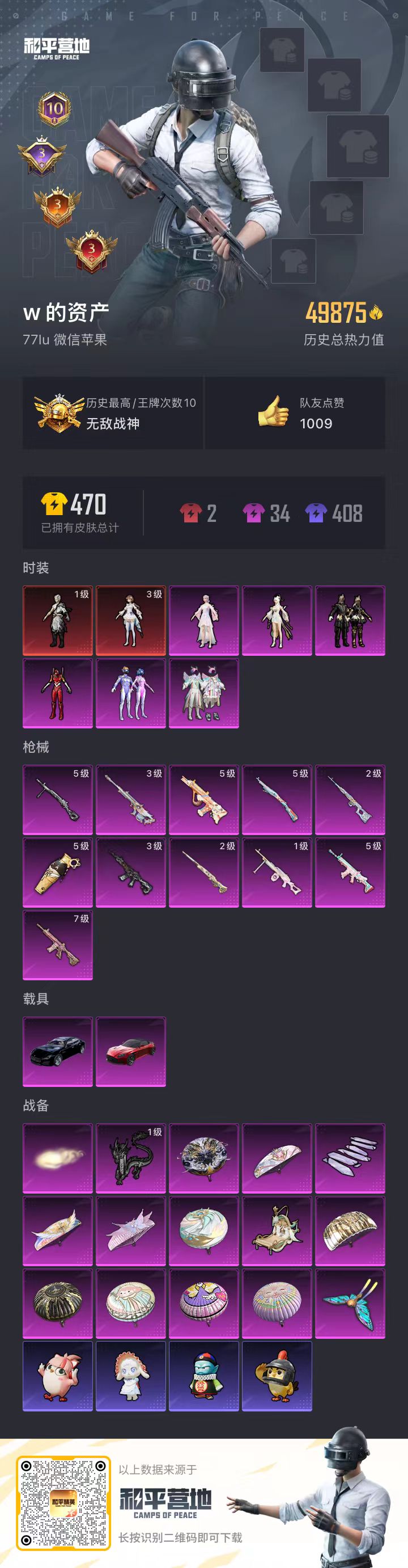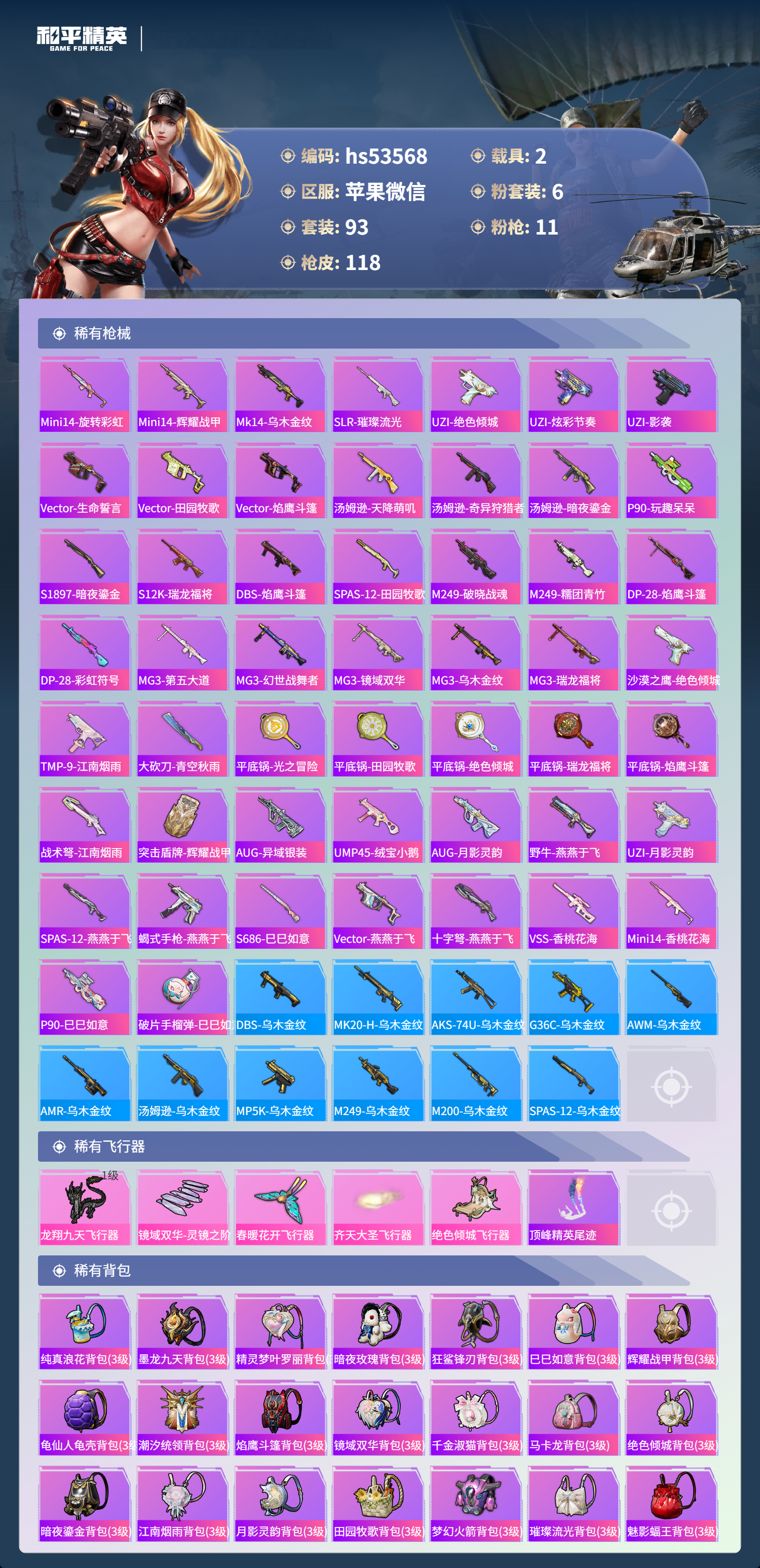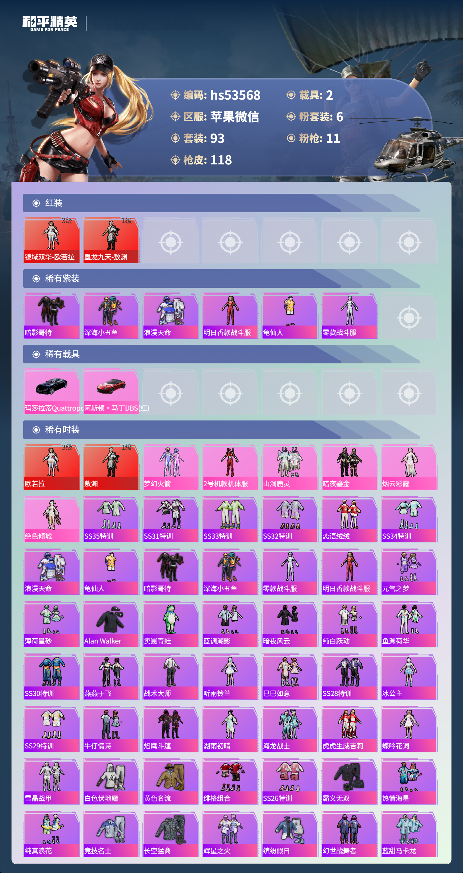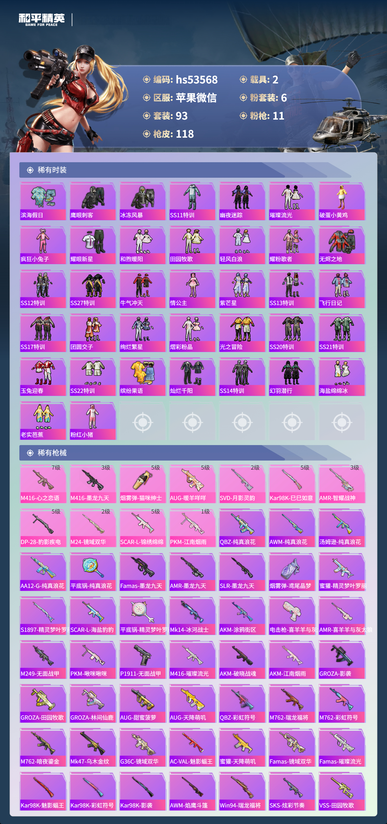 hs53568 苹果微信-10王牌印记-有战神框-2红装-6粉装-11特效呛-2载具-49875热力值-93套装-118呛皮-3卓越印记-3传奇印记【2红装】镜域双华-欧若拉/3级墨龙九天-敖渊/1级【6粉装】套装-暗夜鎏金套装-山涧鹿灵角色-2号机款机体服角色-烟云彩露角色-绝色倾城套装-梦幻火箭【11特效呛】amr-智耀战神/3级m416-心之恋语/7级m24-镜域双华/