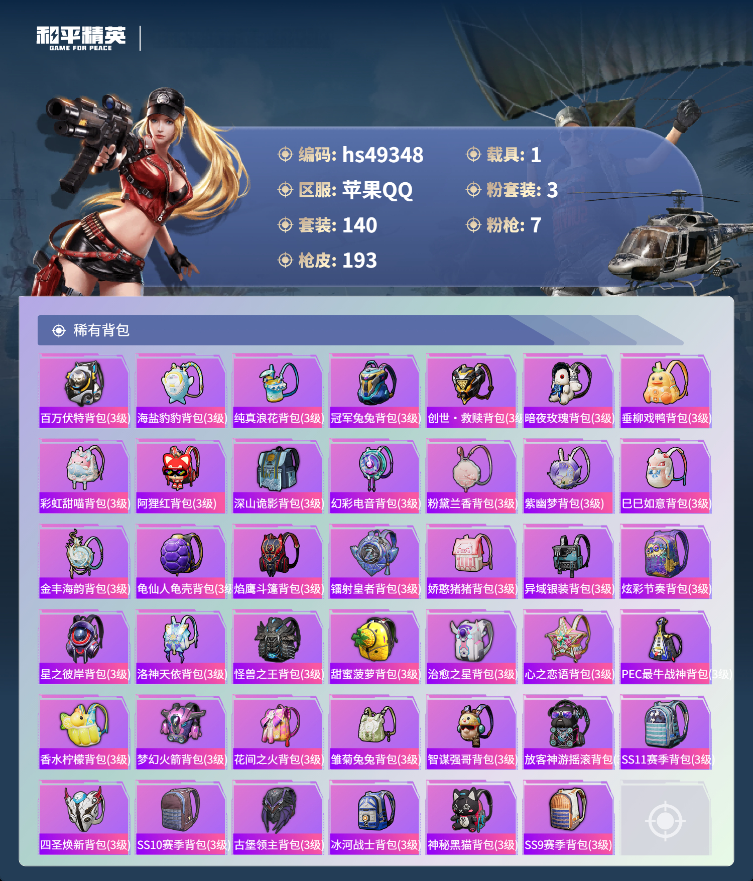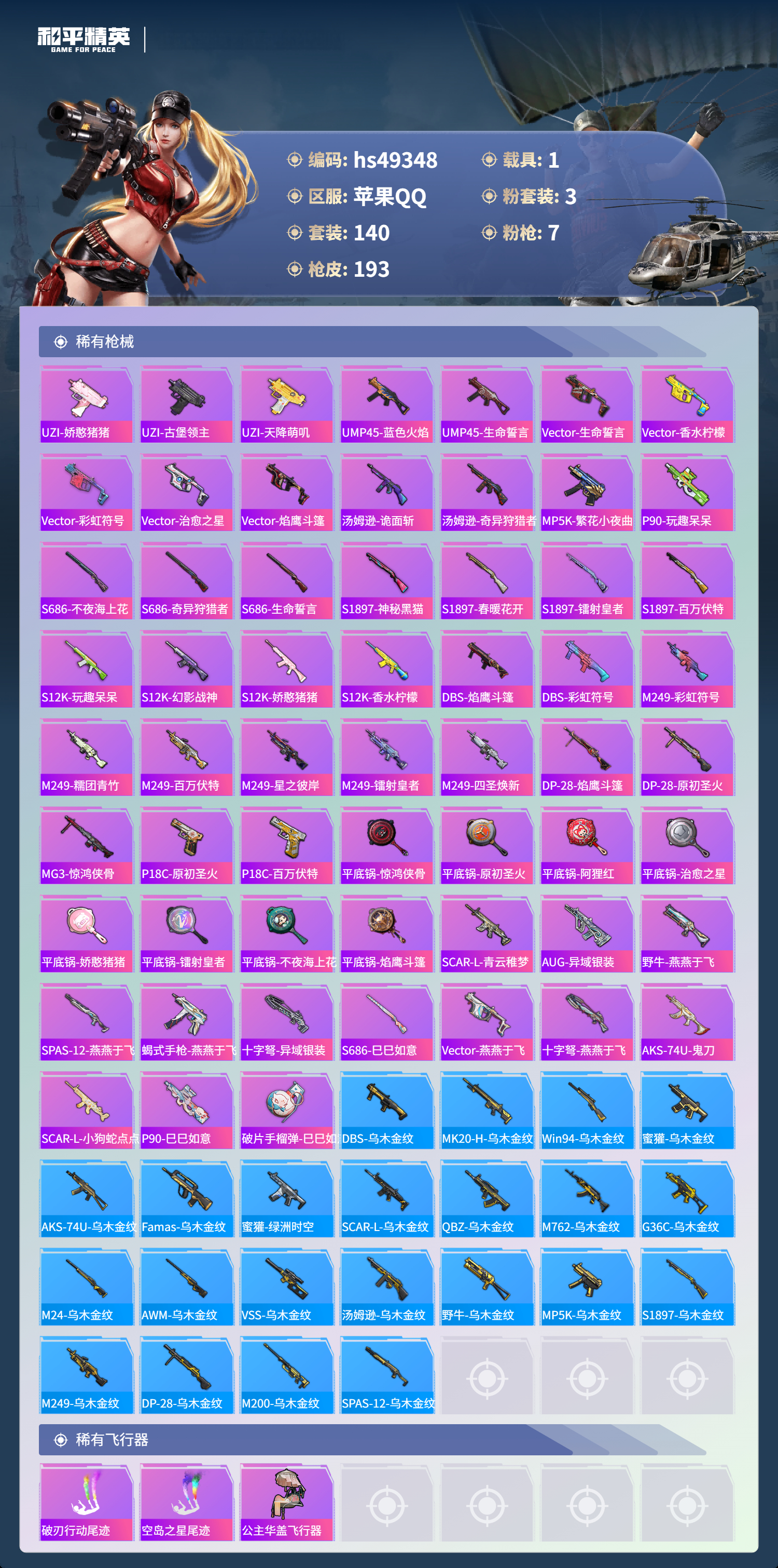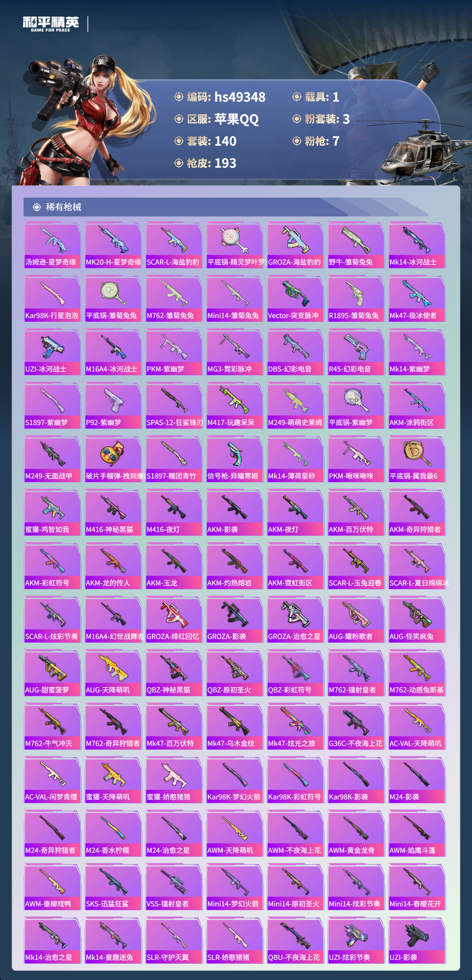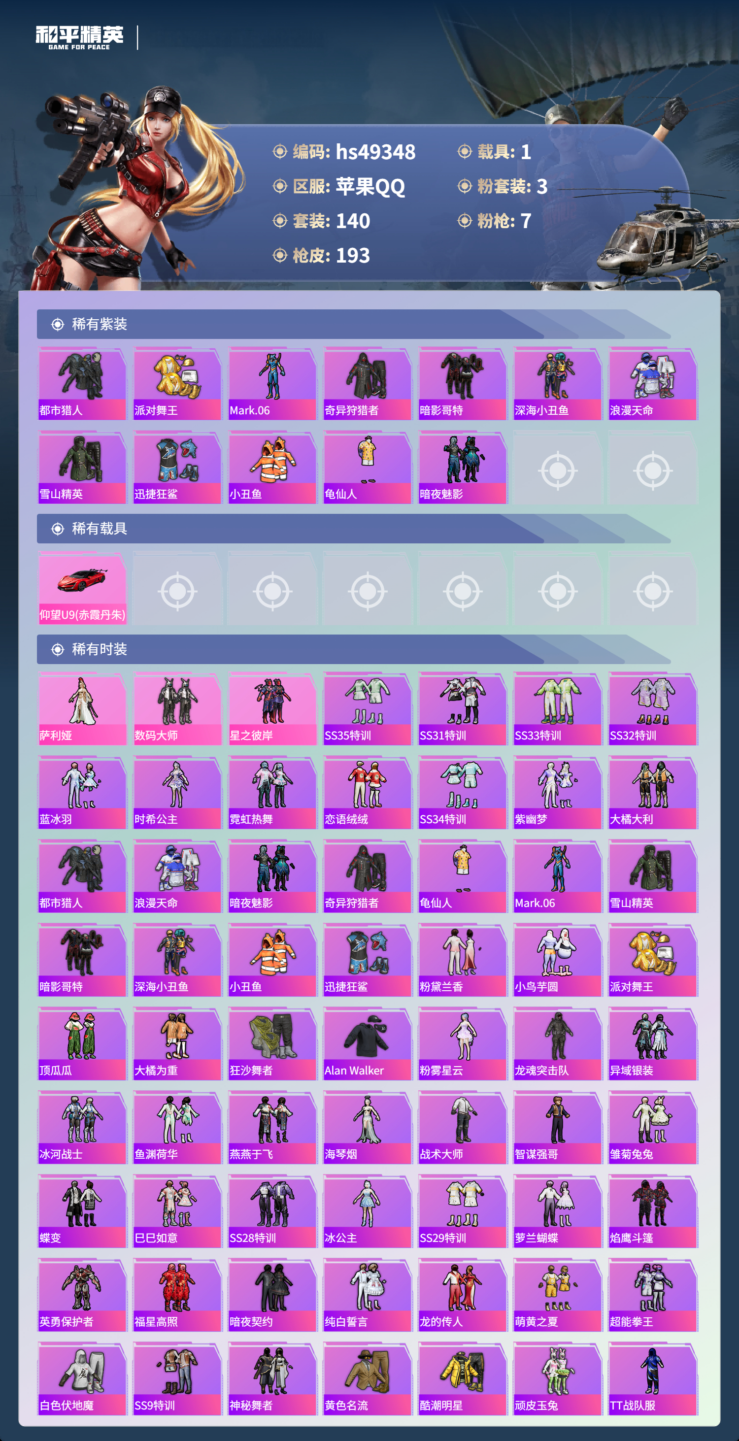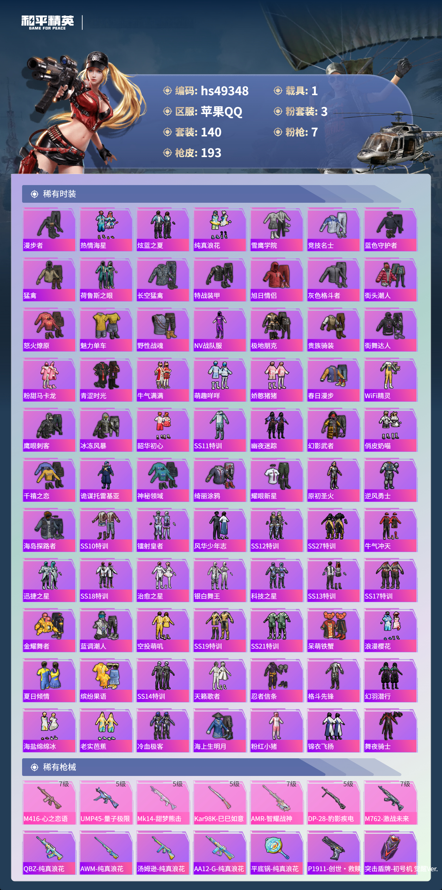 hs49348 苹果手q-9王牌印记-3粉装-7特效呛-1载具-62222热力值-140套装-193呛皮-1卓越印记【3粉装】套装-星之彼岸角色-萨利娅套装-数码大师【7特效呛】ump45-量子极限/5级mk14-甜梦熊击/5级m762-激战未来/7级dp-28-豹影疾电/5级m416-心之恋语/7级kar98k-巳巳如意/5级amr-智耀战神/7级【12稀有紫装】都市猎人