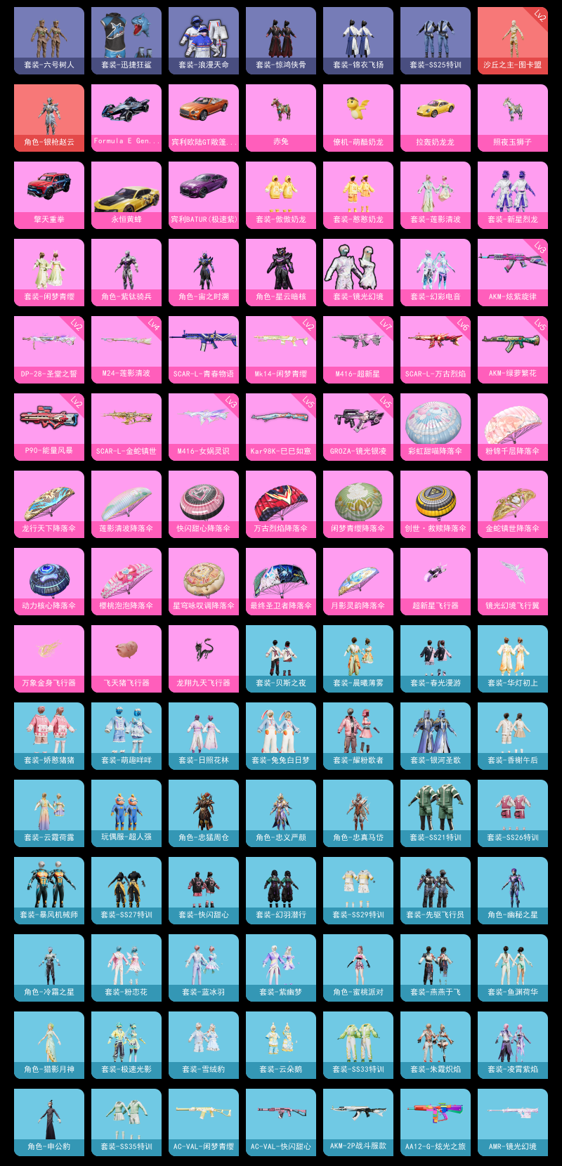 【和平精英】【txhp4843】10粉装,15特效呛,9载具,历史最高段位:卓越王牌15星 王牌印记7次 热力值:68205,114套装,170呛械,210装备,100战备;套装:角色-银呛赵云,沙丘之主-图卡盟,套装-新星烈龙,套装-闲梦青缨,角色-宙之时溯,角色-星云暗核,套装-莲影清波,套装-镜光幻境,角色-紫钛骑兵,套装-憨憨奶龙,套装-傲傲奶龙,套装-幻彩电音,套装-黄色运动,套装-蓝色运动,套装-白色伏地魔,套装-黑色伏地魔,套装-竞技名士,套装-长空猛禽,套装-海岛探路者,套装-旭日情侣,套装-灼焰舞者,套装-浪漫天命,套装-浪漫假日,套装-春日漫步,套装-沙漠毒蛇,套装-魅力单车,套装-绮丽涂鸦,套装-耀眼新星,套装-幻世保卫者,套装-森林游猎者,套装-热血青春,套装-甜蜜菠萝,套装-清新柠檬,套装-迅捷狂鲨,套装-生化防暴队,套装-青涩时光,套装-缤纷果语,套装-滨海厨神,套装-冰川特警,套装-麻辣教官,套装-破蛋小黄鸡,套装-银河圣歌,套装-鹤鸣,套装-霓虹街区,套装-牛气满满,套装-战术大师,套装-牛气冲天,套装-耀粉歌者,套装-吉莉礼服,套装-暴风机械师,套装-兔兔白日梦,套装-ss21特训,套装-萌趣咩咩,套装-娇憨猪猪,套装-玉兔迎春,套装-香榭午后,套装-柠萌假日,套装-华灯初上,套装-日照花林,套装-ss25特训,套装-惊鸿侠骨,套装-锦衣飞扬,套装-云霞荷露,套装-晨曦薄雾,套装-香桃花海,套装-六号树人,套装-龙的传人,套装-ss26特训,套装-快闪甜心,套装-春光漫游,套装-漫游都市,套装-空岛之星,套装-贝斯之夜,角色-忠真马岱,角色-忠猛周仓,角色-忠义严颜,玩偶服-超人强,套装-幻羽潜行,套装-ss27特训,套装-恋语绒绒,套装-街头风暴,套装-ss29特训,套装-先驱飞行员,套装-异域银装,角色-蜜桃派对,套装-星途旅人,套装-ss30特训,套装-墨青刃影,套装-ss31特训,套装-鱼渊荷华,套装-燕燕于飞,套装-智谋强哥,套装-紫幽梦,套装-粉恋花,套装-ss33特训,角色-猎影月神,套装-云朵鹅,套装-巳巳如意,角色-冷霜之星,套装-ss32特训,角色-幽秘之星,套装-蓝冰羽,套装-顶瓜瓜,套装-雪绒豹,套装-大橘大利,套装-极速光影,套装-元气之梦,套装-ss34特训,套装-朱霞炽焰,角色-申公豹,套装-凌霄紫焰,套装-薄荷星砂,套装-ss35特训,套装-萌鸡速递;呛皮:1级scar-l-青春物语,6级scar-l-万古烈焰,1级scar-l-金蛇镇世,scar-l-炫彩节奏,scar-l-玉兔迎春,scar-l-星途旅人,3级akm-炫紫旋律,5级akm-绿萝繁花,akm-霓虹街区,akm-涂鸦街区,akm-2p战斗服款,akm-龙的传人,akm-荧星灵猫,akm-玄冥寒域,akm-砺玉逐花,akm-霓彩脉冲,akm-绿洲时空,ac-val-天降萌叽,ac-val-闲梦青缨,ac-val-快闪甜心,5级groza-镜光银凌,groza-影袭,groza-暴走疾风,m762-彩虹甜喵,m762-第五大道,m762-天降萌叽,m762-云朵鹅,蜜獾-娇憨猪猪,蜜獾-绿洲时空,蜜獾-乌木金纹,g36c-六号树人,g36c-镜域双华,g36c-星穹咏叹调,7级m416-超新星,3级m416-女娲灵识,m416-糯团青竹,m416-绿洲时空,aug-闲梦青缨,aug-异域银装,aug-月影灵韵,aug-金蛇镇世,aug-紫晶流影,arx-凌霄紫焰,mk47-乌木金纹,mk47-炫光之旅,m16a4-莲影清波,famas-镜域双华,famas-霓彩脉冲,famas-乌木金纹,win94-乌木金纹,4级m24-莲影清波,5级kar98k-巳巳如意,kar98k-六号树人,kar98k-顶峰精英,awm-焰鹰斗篷,m200-惊鸿侠骨,m200-乌木金纹,svd-云朵鹅,svd-霓彩脉冲,amr-镜光幻境,amr-鸡智如我,amr-乌木金纹,莫辛纳甘-镭金极速,mk20-h-莲影清波,mk20-h-快闪甜心,mk20-h-乌木金纹,vss-香桃花海,m417-惊鸿侠骨,m417-蓝晶绮麟,mini14-炫彩节奏,mini14-香桃花海,mini14-绯穹魔姬,sks-迅猛狂鲨,mk12-金蛇镇世,slr-娇憨猪猪,slr-圣穹绘梦,2级mk14-闲梦青缨,mk14-紫幽梦,mk14-紫晶流影,uzi-娇憨猪猪,uzi-天降萌叽,uzi-啾咪啾咪,uzi-炫彩糖果,uzi-绿洲时空,ump45-夜灯,ump45-海盐豹豹,ump45-圣穹绘梦,aks-74u-乌木金纹,vect-生命誓言,vect-香水柠檬,vect-龙行天下,vect-燕燕于飞,2级p90-能量风暴,p90-倾城蜜语,p90-快闪甜心,p90-巳巳如意,p90-金蛇镇世,p90-乌木金纹,野牛-沙丘之主,野牛-燕燕于飞,汤姆逊-天降萌叽,汤姆逊-樱桃泡泡,汤姆逊-智耀战神,mp5k-怪笑疯兔,js9-凌霄紫焰,s12k-娇憨猪猪,s1897-紫幽梦,s1897-糯团青竹,spas-12-燕燕于飞,spas-12-云朵鹅,spas-12-乌木金纹,aa12-g-炫光之旅,s686-彩虹符号,s686-巳巳如意,dbs-圣堂之誓,m249-星之彼岸,m249-彩虹符号,m249-莲影清波,m249-沙丘之主,m249-萌萌史莱姆,pkm-啾咪啾咪,pkm-紫幽梦,mg3-幻世战舞者,mg3-惊鸿侠骨,mg3-桃粉嫣然,mg3-镜域双华,mg3-智耀战神,mg3-霓彩脉冲,2级dp-28-圣堂之誓,5级dp-28-豹影疾电,mg-36-凌霄紫焰,蝎式手呛-闲梦青缨,蝎式手呛-千金淑猫,蝎式手呛-燕燕于飞,沙墨之鹦-快闪甜心,沙墨之鹦-云朵鹅,p92-彩装战姬,p92-紫幽梦,p92-凌霄紫焰,短管霰弹-星穹咏叹调,p18c-镜光幻境,r1895-六号树人,平底锅-紫电流光,平底锅-娇憨猪猪,平底锅-变形金刚,平底锅-惊鸿侠骨,平底锅-酷泡奶龙,平底锅-快闪甜心,平底锅-空岛之星,平底锅-焰鹰斗篷,平底锅-紫幽梦,平底锅-属我最6,平底锅-凌霄紫焰,大砍刀-万古烈焰,大砍刀-青龙偃月刀,大砍刀-云朵鹅,撬棍-龙胆亮银呛,爆炸猎弓-惊鸿侠骨,突击盾牌-万古烈焰,5级破片手留单-瓶中星球,破片手留单-呆爆全场,破片手留单-星途旅人,破片手留单-炽纹蛇影,破片手留单-海盐豹豹,破片手留单-拽到爆炸,破片手留单-巳巳如意,破片手留单-火尖莲影,铝热弹-炫彩糖果,十子怒-燕燕于飞,十子怒-异域银装;载具:fmula e gen2幽光蓝,赤兔,照夜玉狮子,护世瑞兽,宾利batur极速紫,擎天重拳,宾利欧陆gt敞篷火焰橘,永恒黄蜂,拉轰奶龙龙;降落伞:镜