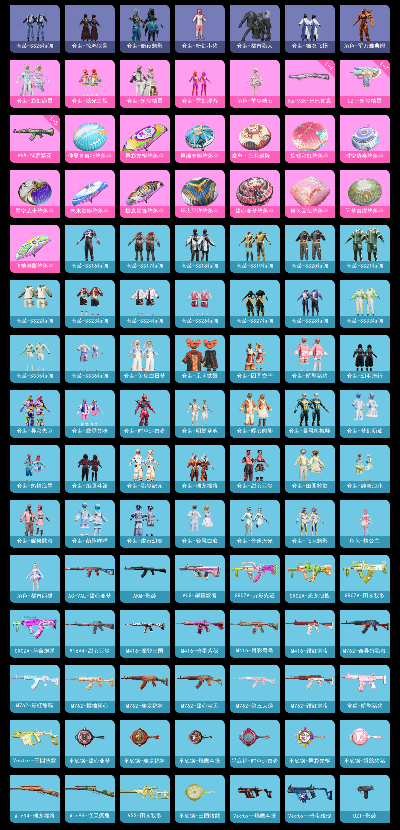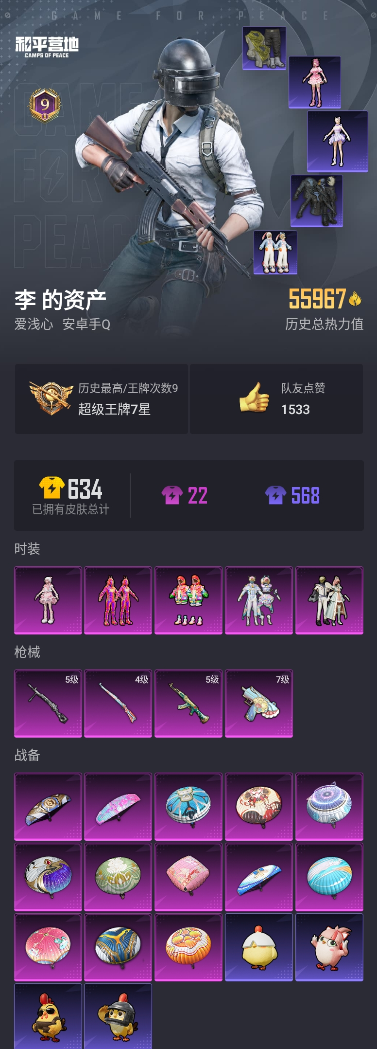 【和平精英】【lyhp17916】5粉4特 都市 兔兔白日梦 5粉装,4特效呛,0载具,历史最高段位:超级王牌7星 王牌印记9次 热力值:55967,121套装,180呛械,204装备,103战备;套装:套装-彩虹鹿灵,套装-筑梦精灵,套装-炫光之旅,套装-霓虹漫游,角色-羊梦糖心,套装-特训学院,套装-红色运动,套装-黄色运动,套装-蓝色运动,套装-黄色伏地魔,套装-白色伏地魔,套装-黑色伏地魔,套装-骑行爱好者,套装-竞技名士,套装-酒红色名流,套装-湖蓝色名流,套装-黄色名流,套装-猛禽,套装-长空猛禽,套装-黎明保卫者,套装-海岛探路者,套装-雨林探路者,套装-都市猎人,套装-特战装甲,套装-特殊使命,套装-滨海假日,套装-完美偶像,套装-街头潮人,套装-神秘领域,套装-魅力单车,套装-绮丽涂鸦,套装-竞技达人朋克,套装-狂沙舞者,套装-破晓战魂,套装-热血青春,套装-沙漠兵团,套装-酷潮明星,套装-幻世战舞者,套装-呆萌铁蟹,套装-夏日倾情,套装-缤纷果语,套装-冰川特警,套装-元素星魂,套装-麻辣教官,套装-梦魇先生,套装-粉红小猪,套装-破蛋小黄鸡,套装-疯狂小兔子,套装-军械专家,套装-鹤鸣,套装-白熊同盟,套装-萌黄之夏,套装-夏日音浪,套装-探宝勇士,套装-牛气满满,套装-牛气冲天,套装-ss18特训,套装-耀粉歌者,套装-热情海星,套装-纯真浪花,套装-ss16特训,套装-暴风机械师,套装-时空追击者,套装-暗夜魅影,套装-ss17特训,套装-瑞龙福将,套装-团圆交子,套装-福星高照,套装-虎虎生威吉莉,角色-军刀雅典娜,套装-异彩先驱,套装-霓虹极客,套装-空投萌叽,套装-ss19特训,套装-兔兔白日梦,套装-飞驰魅影,套装-音速流光,套装-炫蓝之夏,套装-ss20特训,套装-猎梦纪元,套装-甜心亚梦,套装-虚音幻奏,套装-ss21特训,套装-暖心熊熊,套装-萌趣咩咩,套装-娇憨猪猪,套装-梦幻奶油,套装-玉兔迎春,套装-ss22特训,套装-田园牧歌,套装-轻风白浪,套装-光之冒险,套装-绯格组合,套装-ss23特训,套装-摩登艾咪,套装-王牌教练,套装-柠萌假日,套装-ss24特训,套装-ss25特训,套装-惊鸿侠骨,套装-锦衣飞扬,套装-龙的传人,套装-ss26特训,套装-明鸳圣池,套装-焰鹰斗篷,套装-幻羽潜行,套装-ss27特训,套装-老实芭蕉,套装-ss28特训,角色-情公主,套装-海盐绵绵冰,角色-都市丽猫,套装-ss30特训,套装-ss31特训,套装-ss33特训,套装-ss32特训,套装-元气之梦,套装-ss34特训,套装-薄荷星砂,套装-ss35特训,套装-ss36特训;呛皮:m762-绯红前夜,m762-奇异狩猎者,m762-甜心宝贝,m762-瑞龙福将,m762-橘柚倾心,m762-彩虹甜喵,m762-第五大道,m762-天降萌叽,groza-蓝莓炮弹,groza-异彩先驱,groza-恐龙拽拽,groza-田园牧歌,groza-乌木金纹,scar-l-红色方程式,scar-l-炫彩节奏,scar-l-玉兔迎春,scar-l-星途旅人,scar-l-海盐豹豹,m416-夜灯,m416-蓝色火焰,m416-绯红前夜,m416-红色方程式,m416-月影鸳鸯,m416-暗星紫秘,m416-糯团青竹,m416-摩登王国,5级akm-绿萝繁花,akm-灼热熔岩,akm-生命誓言,akm-影袭,akm-破晓战魂,akm-霓虹街区,akm-涂鸦街区,akm-彩虹符号,akm-虎虎生威,akm-龙的传人,aug-耀粉歌者,aug-天降萌叽,aug-紫晶流影,m16a4-甜心亚梦,m16a4-幻世战舞者,ac-val-甜心亚梦,ac-val-乌木金纹,ac-val-天降萌叽,蜜獾-娇憨猪猪,蜜獾-天降萌叽,famas-突变脉冲,famas-乌木金纹,q-彩虹符号,q-飞驰魅影,q-纯真浪花,g36c-时空追击者,g36c-乌木金纹,mk47-乌木金纹,awm-胡桃卫兵,awm-音爆索尼克,awm-天降萌叽,awm-焰鹰斗篷,awm-纯真浪花,awm-乌木金纹,4级kar98k-巳巳如意,kar98k-影袭,kar98k-炫彩节奏,kar98k-飞驰魅影,kar98k-乌木金纹,amr-鸡智如我,amr-乌木金纹,win94-怪笑疯兔,win94-瑞龙福将,win94-乌木金纹,m24-炫彩节奏,m24-乌木金纹,m200-惊鸿侠骨,莫辛纳甘-乌木金纹,mini14-穿刺龙虾,mini14-耀粉歌者,mini14-异彩先驱,mini14-千面幻镜,mini14-香桃花海,mini14-鸡智如我,sks-迅猛狂鲨,sks-炫彩节奏,sks-时空追击者,sks-糯团青竹,sks-霓虹漫游,mk12-乌木金纹,mk14-乌木金纹,mk14-薄荷星砂,slr-娇憨猪猪,slr-霓彩脉冲,mk20-h-狂鲨锋刃,mk20-h-乌木金纹,vss-田园牧歌,vss-乌木金纹,m417-惊鸿侠骨,ump45-蓝色火焰,ump45-生命誓言,ump45-时空追击者,ump45-绒宝小鹅,汤姆逊-耀粉歌者,汤姆逊-林间仙鹿,汤姆逊-异彩先驱,汤姆逊-环太平洋,汤姆逊-纯真浪花,7级uzi-筑梦精灵,uzi-影袭,uzi-炫彩节奏,uzi-娇憨猪猪,uzi-天降萌叽,uzi-冰河战士,p90-飞驰魅影,p90-乌木金纹,mp5k-异彩先驱,mp5k-乌木金纹,vect-生命誓言,vect-彩虹符号,vect-暗夜玫瑰,vect-田园牧歌,vect-焰鹰斗篷,野牛-乌木金纹,aks-74u-乌木金纹,s1897-炫彩节奏,s1897-飞驰魅影,s1897-精灵梦叶罗丽,s1897-乌木金纹,s12k-瑞龙福将,s12k-娇憨猪猪,s12k-幻世战舞者,dbs-时空追击者,dbs-甜心亚梦,dbs-焰鹰斗篷,dbs-乌木金纹,aa12-g-纯真浪花,spas-12-田园牧歌,spas-12-乌木金纹,s686-生命誓言,mg3-瑞龙福将,mg3-幻世战舞者,mg3-乌木金纹,mg3-第五大道,mg3-惊鸿侠骨,m249-破晓战魂,m249-焰龙焚天,m249-彩虹符号,m249-莲影清波,m249-无面战甲,5级dp-28-豹影疾电,dp-28-未来战士,dp-28-彩虹符号,dp-28-甜心亚梦,dp-28-焰鹰斗篷,沙墨之鹦-王牌投手,p1911-粉锦千层,tmp-9-江南烟雨,电击呛-喜羊羊与灰太狼,p18c-百万伏特,平底锅-绯红前夜,平底锅-时空追击者,平底锅-瑞龙福将,平底锅-空投萌叽,平底锅-异彩先驱,平底锅-飞驰魅影,平底锅-青春物语,平底锅-甜心亚梦,平底锅-娇憨猪猪,平底锅-田园牧歌,平底锅-光之冒险,平底锅-惊鸿侠骨,平底锅-空岛之星,平底锅-焰鹰斗篷,平底锅-精灵梦叶罗丽,平底锅-纯真浪花,平底锅-魔法神域,平底锅-许七安,撬棍-绯红
