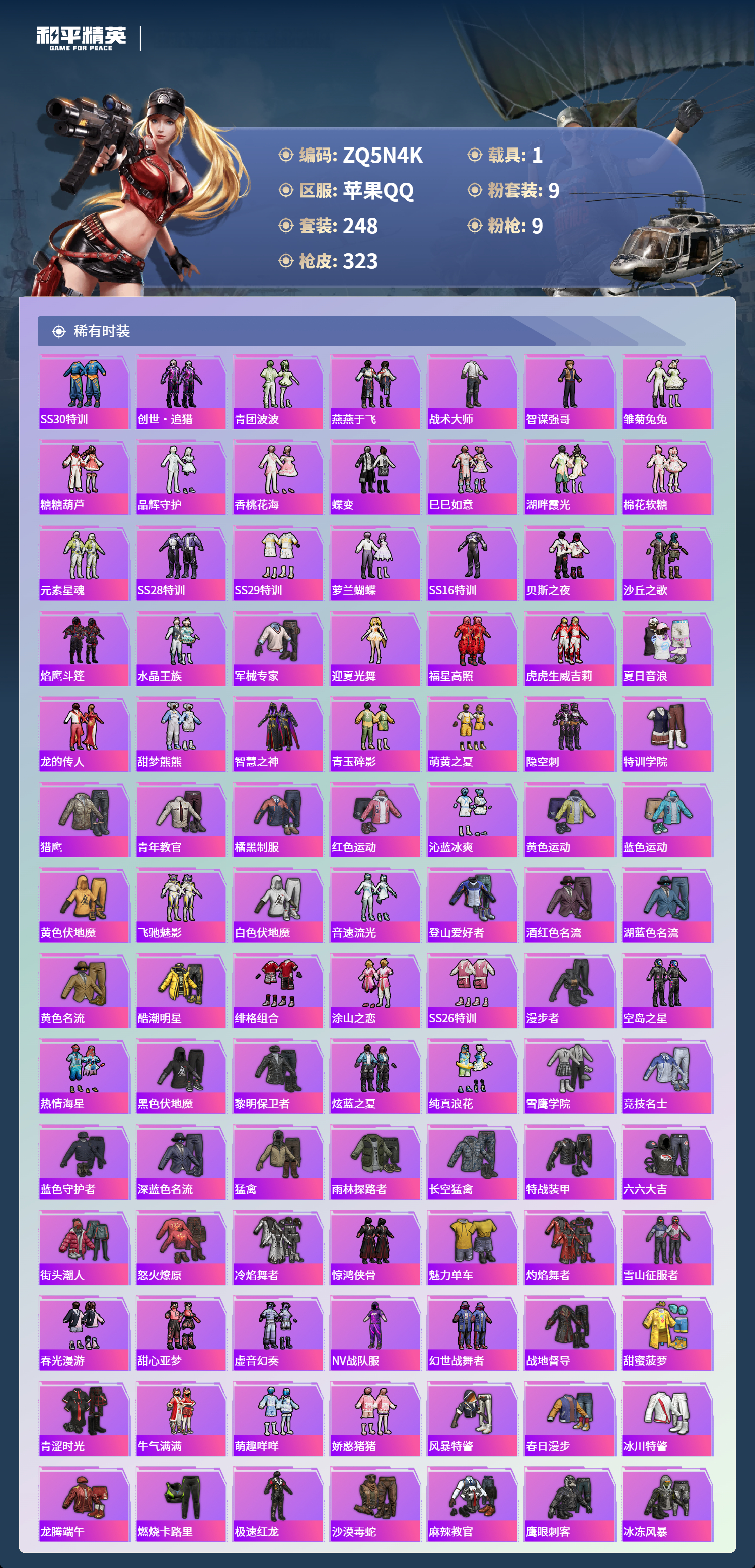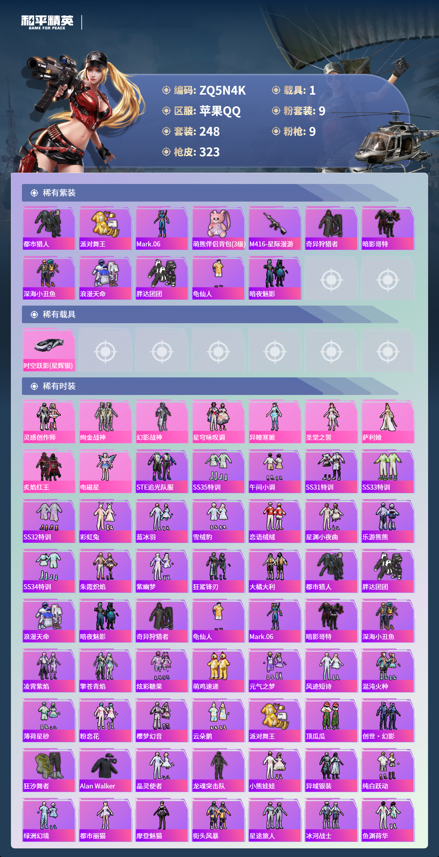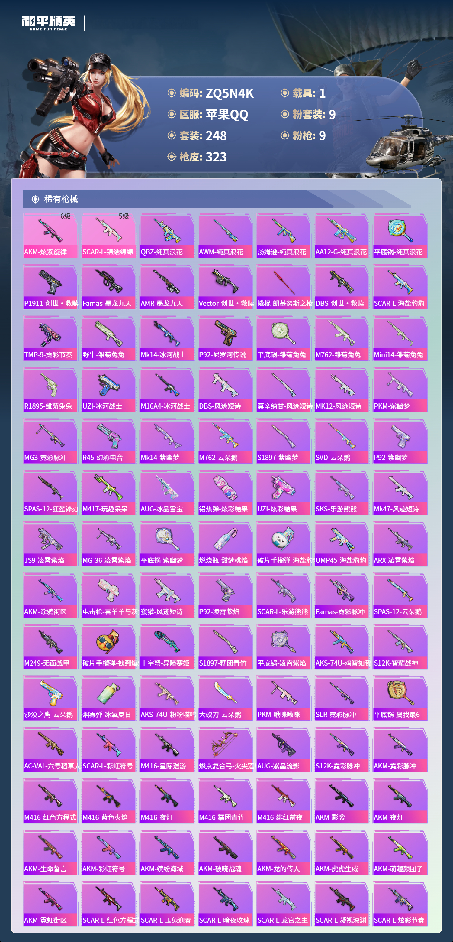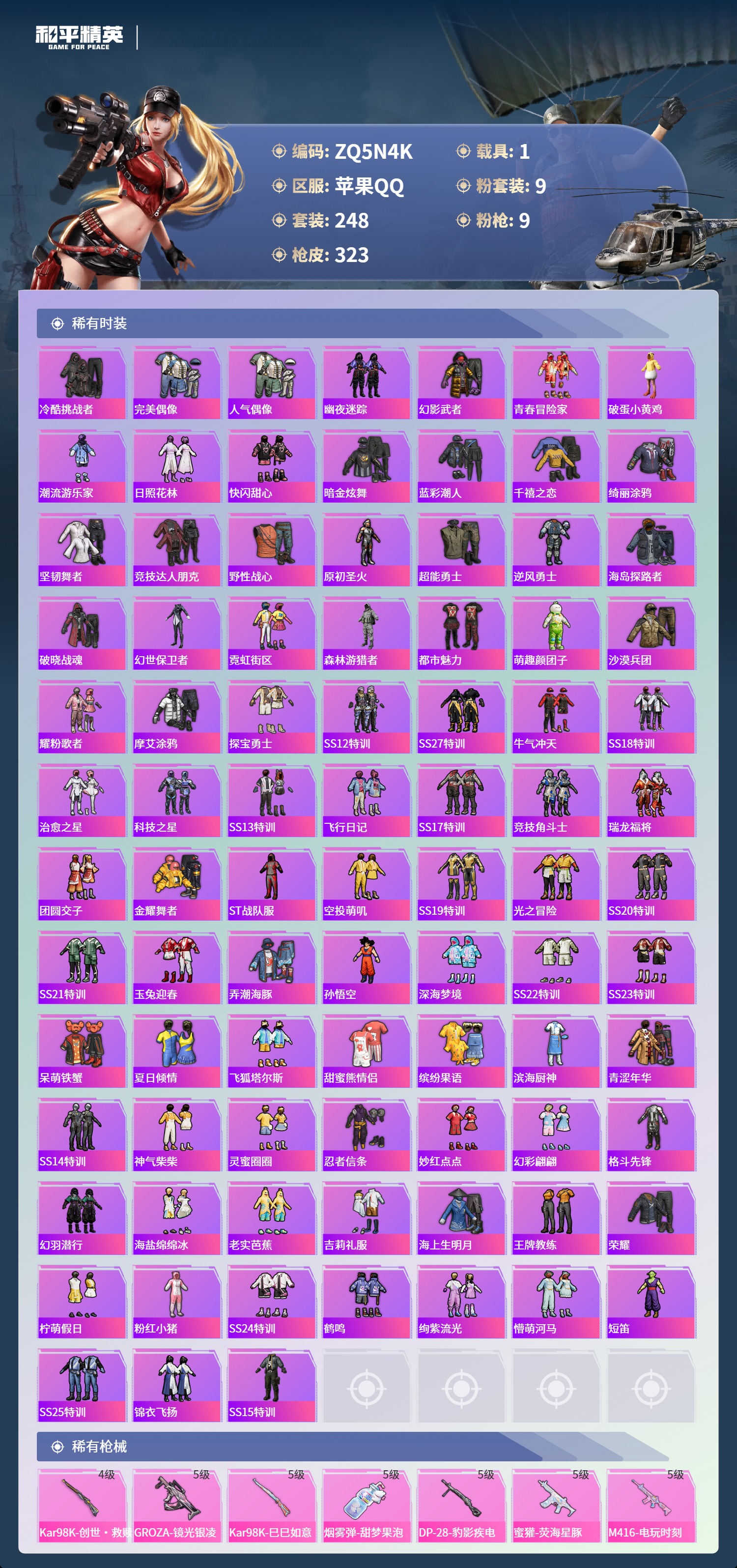 1载具-248套装-323呛皮-苹果手q-18王牌印记-9粉装-9特效呛-1载具-98981热力值-248套装-323呛皮-5卓越印记-1传奇印记【9粉装】角色-电磁星套装-幻影战神套装-星穹咏叹调角色-萨利娅角色-圣堂之誓角色-异瞳寒姬套装-绚金战神套装-炙焰红王套装-灵感创作师【9特效呛】akm-炫紫旋律/6级dp-28-豹影疾电/5级盐雾蛋-甜梦果泡/5级kar98k-创世·救赎/4级kar98k-