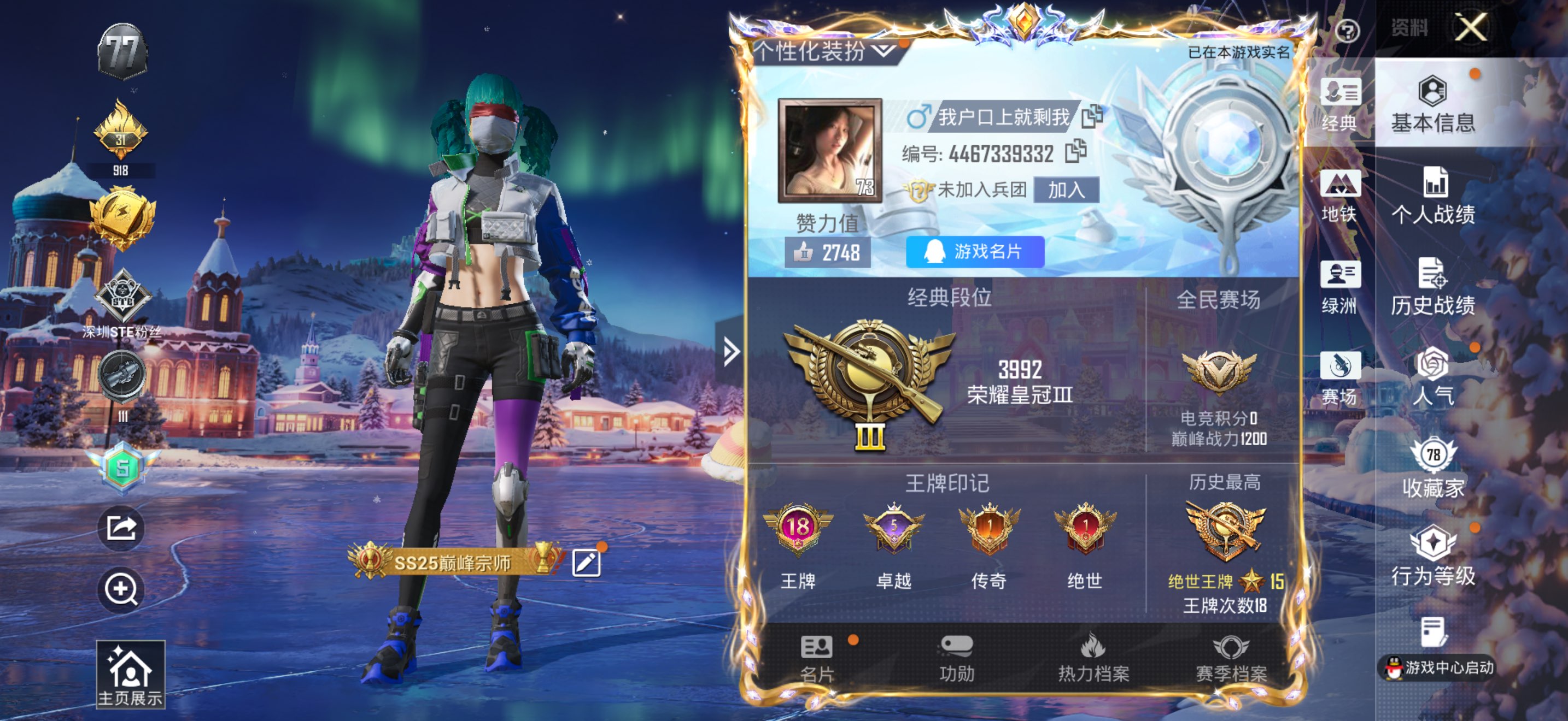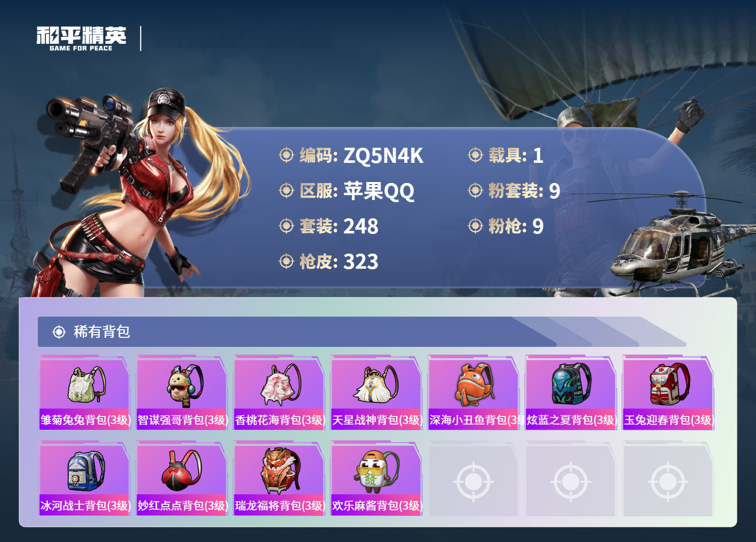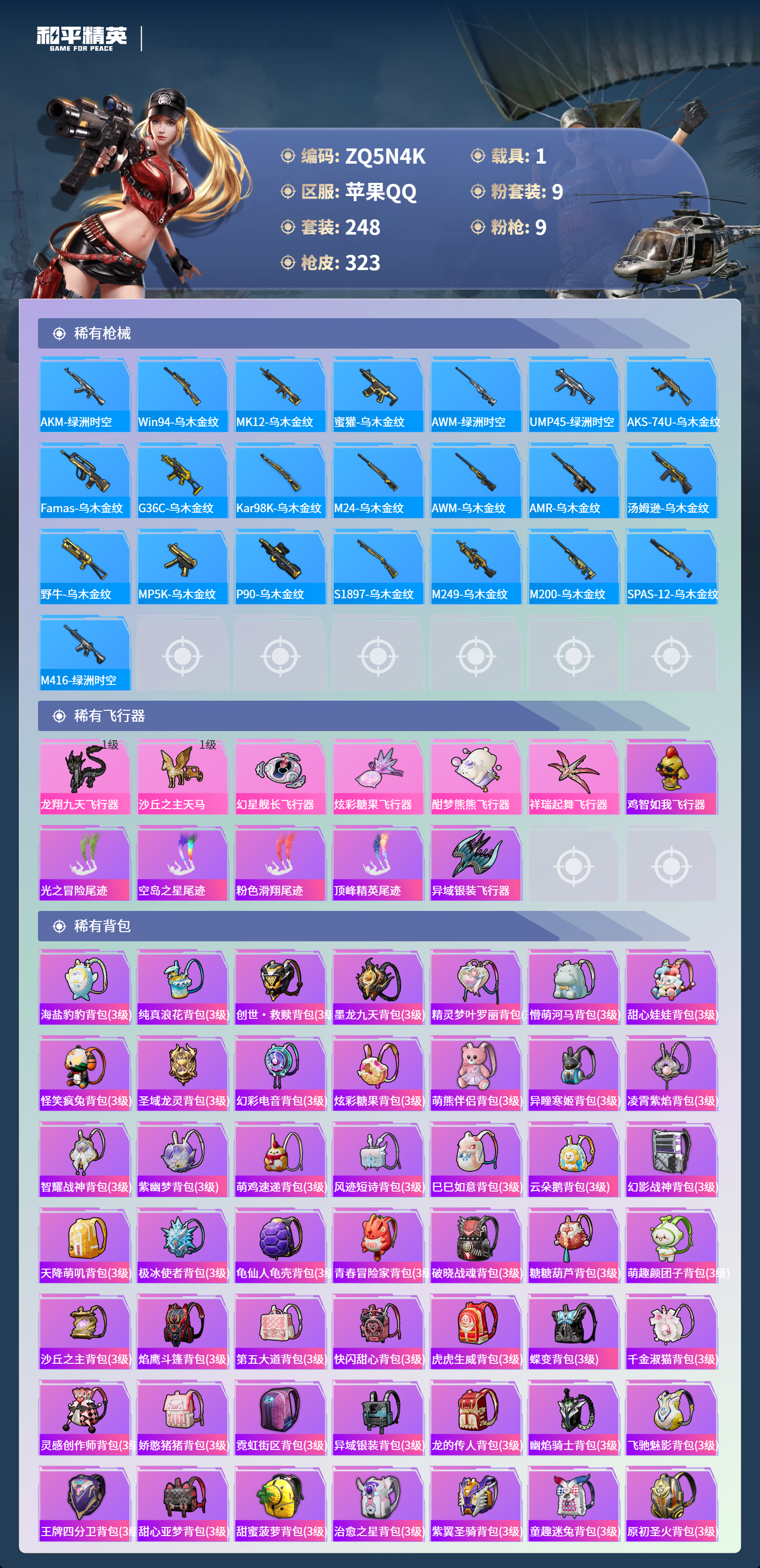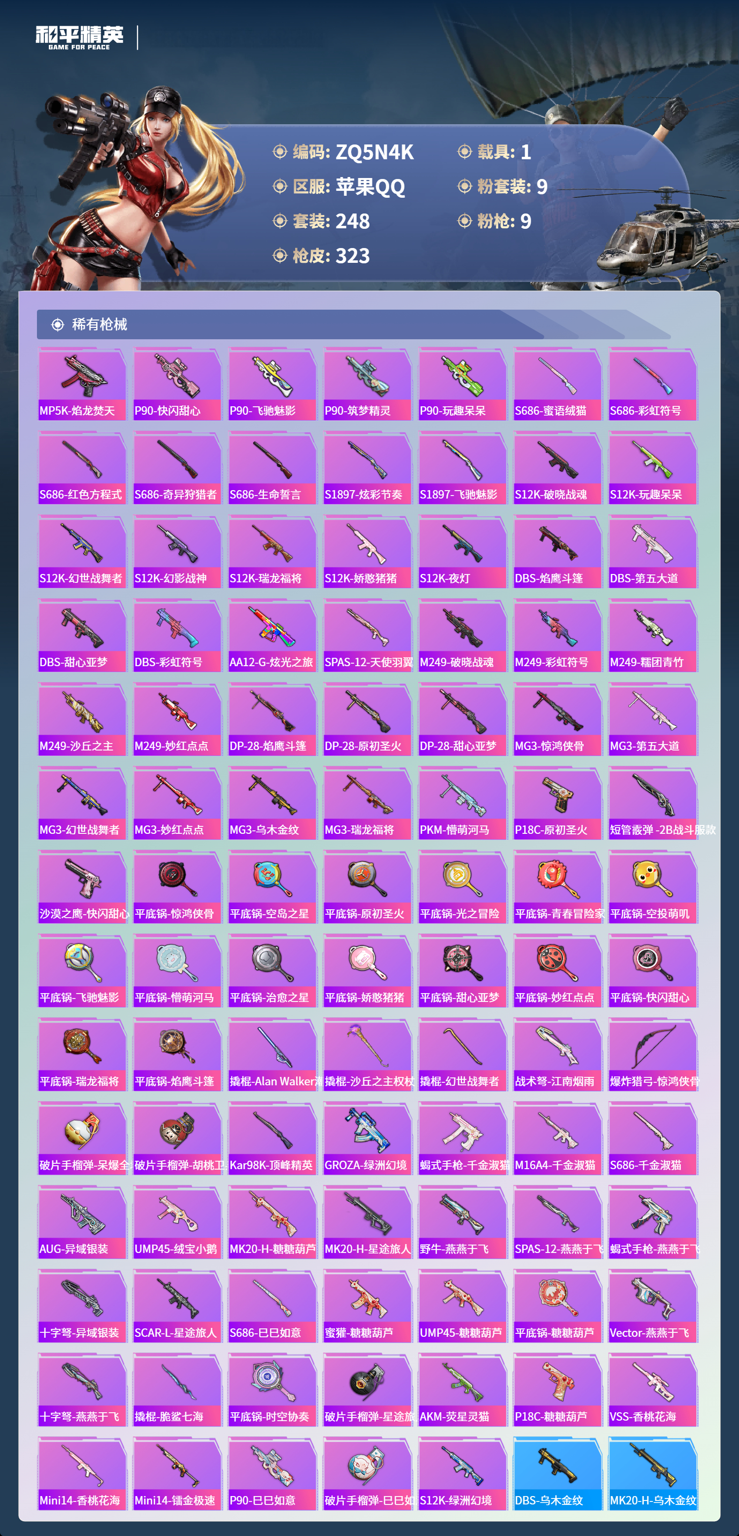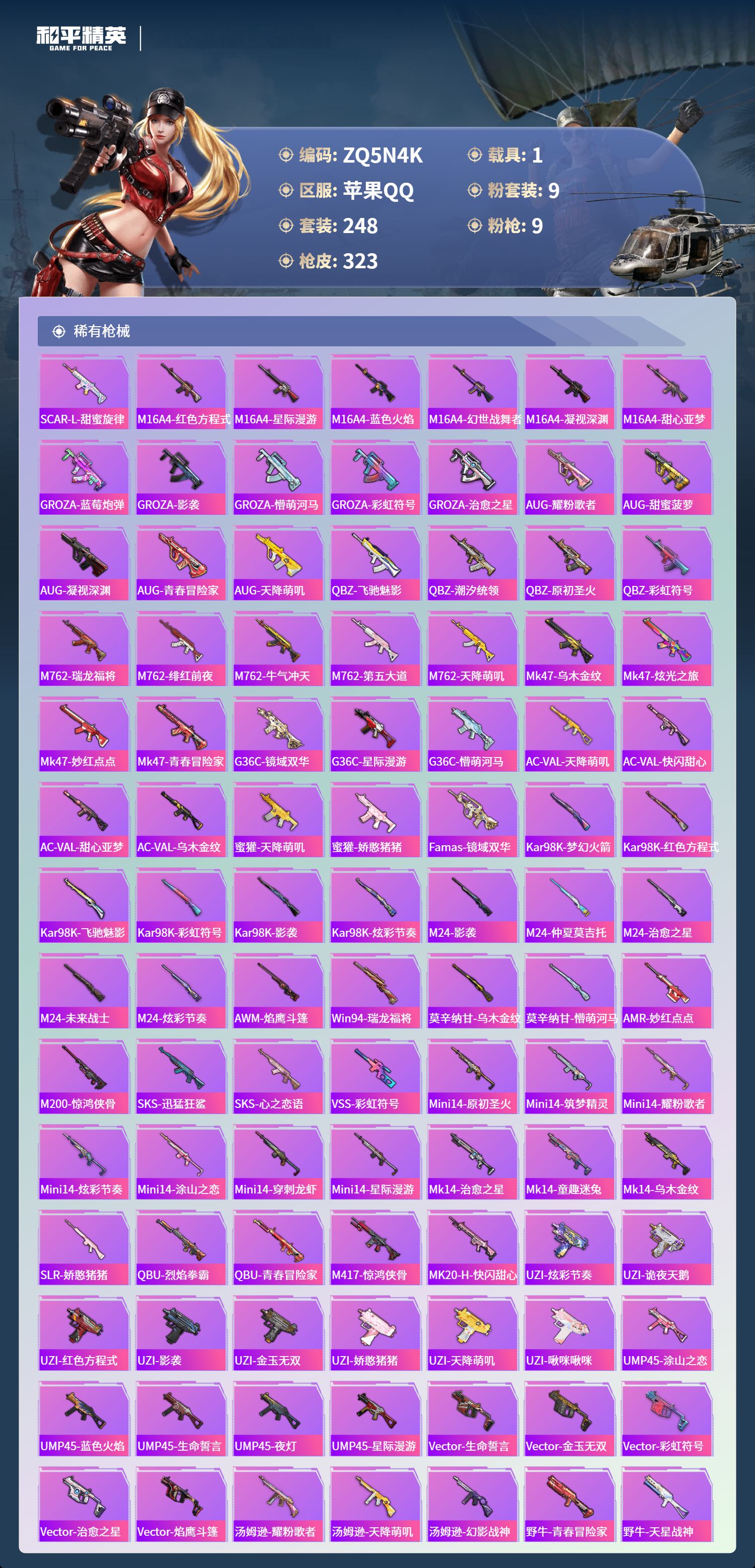1载具-248套装-323呛皮-苹果手q-18王牌印记-9粉装-9特效呛-1载具-98981热力值-248套装-323呛皮-5卓越印记-1传奇印记【9粉装】角色-电磁星套装-幻影战神套装-星穹咏叹调角色-萨利娅角色-圣堂之誓角色-异瞳寒姬套装-绚金战神套装-炙焰红王套装-灵感创作师【9特效呛】akm-炫紫旋律/6级dp-28-豹影疾电/5级盐雾蛋-甜梦果泡/5级kar98k-创世·救赎/4级kar98k-