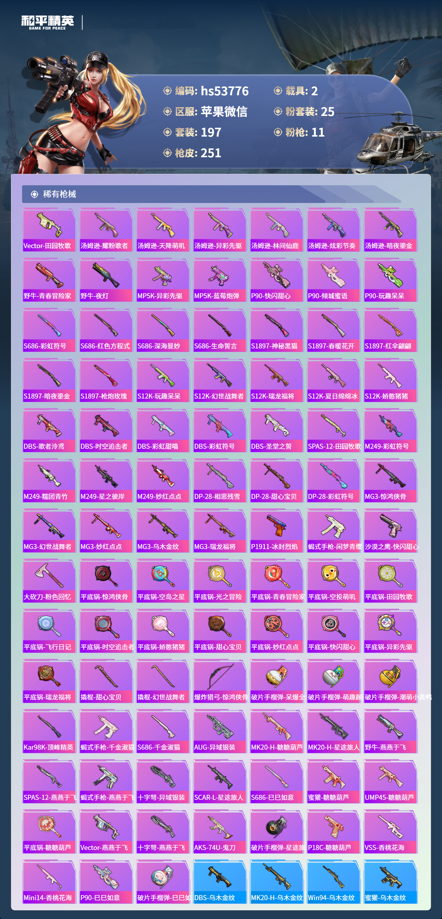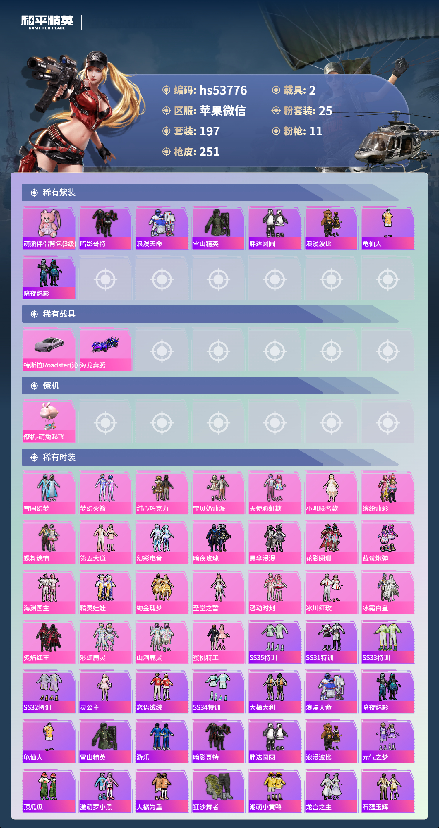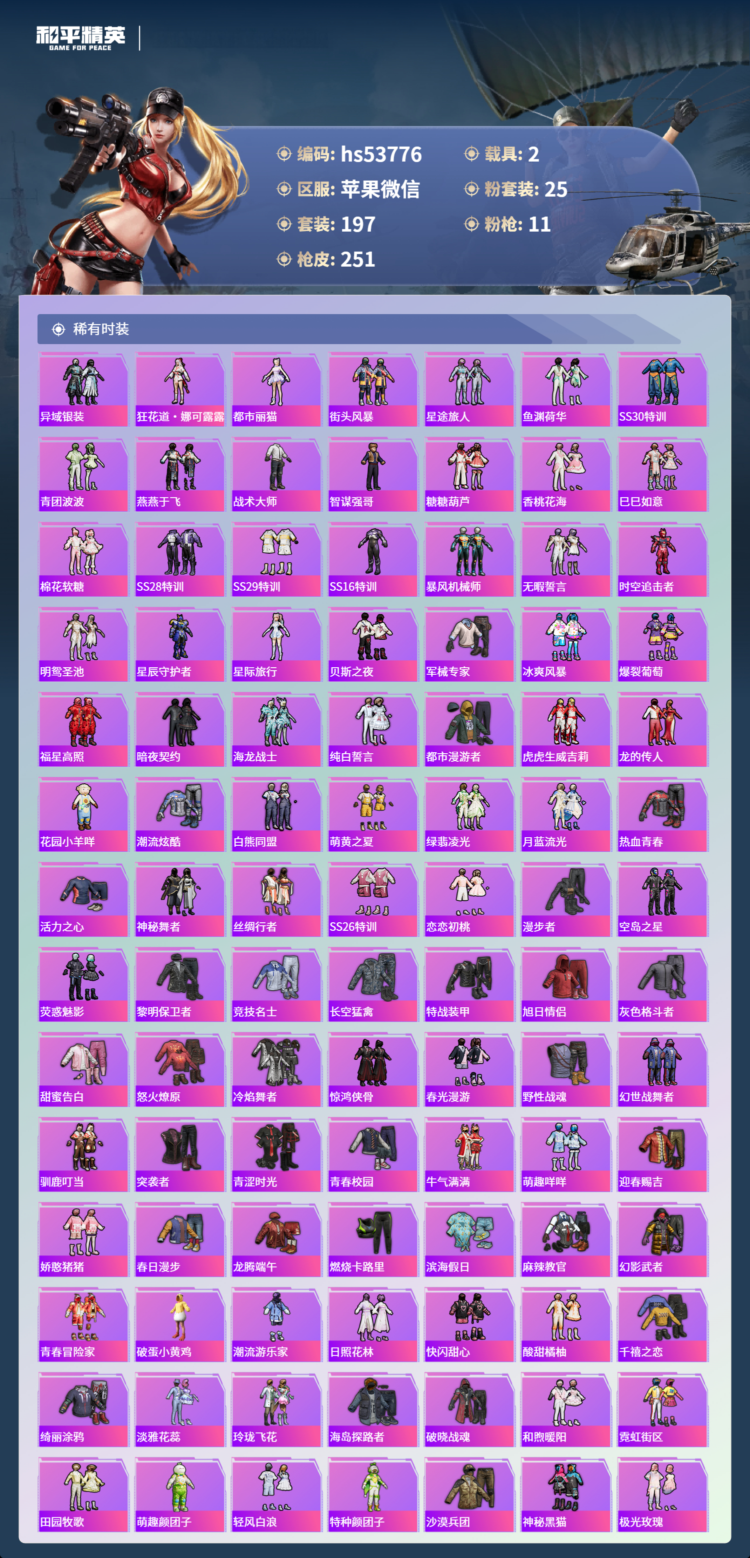hs53776 苹果微信-14王牌印记-25粉装-11特效呛-2载具-93411热力值-197套装-251呛皮-4卓越印记-3传奇印记【25粉装】套装-彩虹鹿灵套装-山涧鹿灵套装-黑伞漫漫套装-雪国幻梦角色-小叽联名款套装-蜜桃特工套装-宝贝奶油派套装-第五大道套装-冰霜白皇套装-馨动时刻套装-甜心巧克力套装-幻彩电音套装-蝶舞迷情套装-海渊国主套装-冰川红玫套装-