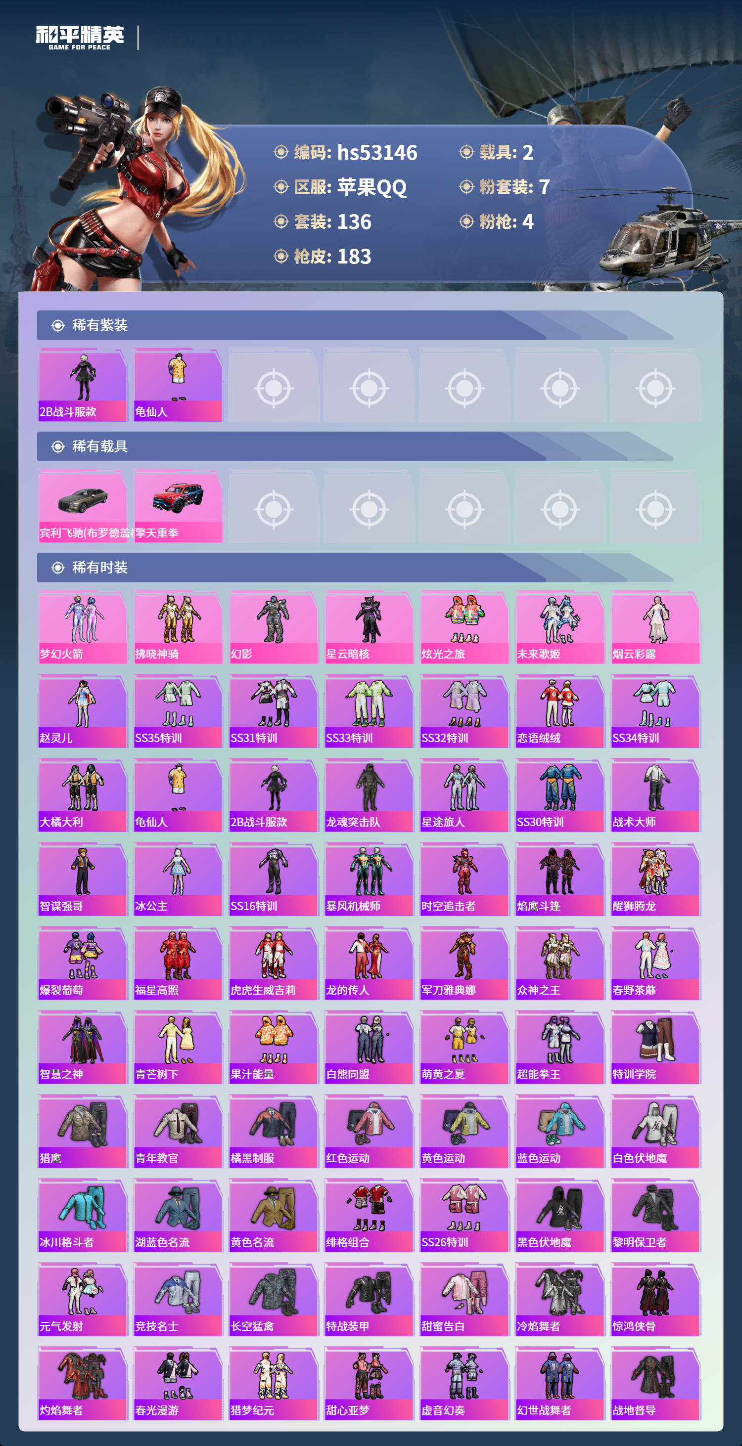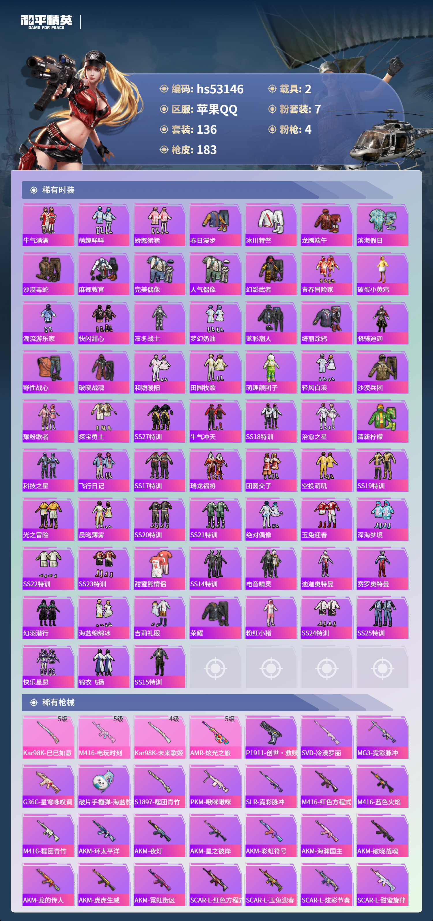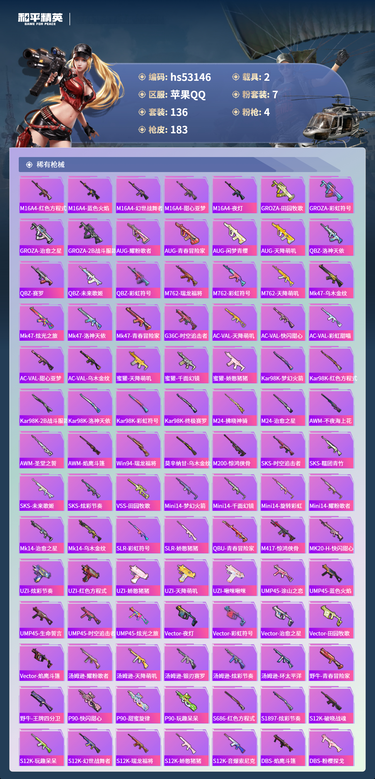 hs53146 苹果手q-10王牌印记-7粉装-4特效呛-2载具-57172热力值-136套装-183呛皮【7粉装】套装-炫光之旅套装-未来歌姬套装-拂晓神骑角色-烟云彩露套装-梦幻火箭角色-星云暗核角色-幻影【4特效呛】amr-炫光之旅/5级kar98k-未来歌姬/4级m416-电玩时刻/5级kar98k-巳巳如意/5级【2稀有紫装】2b战斗服款龟仙人【2稀有载具】宾