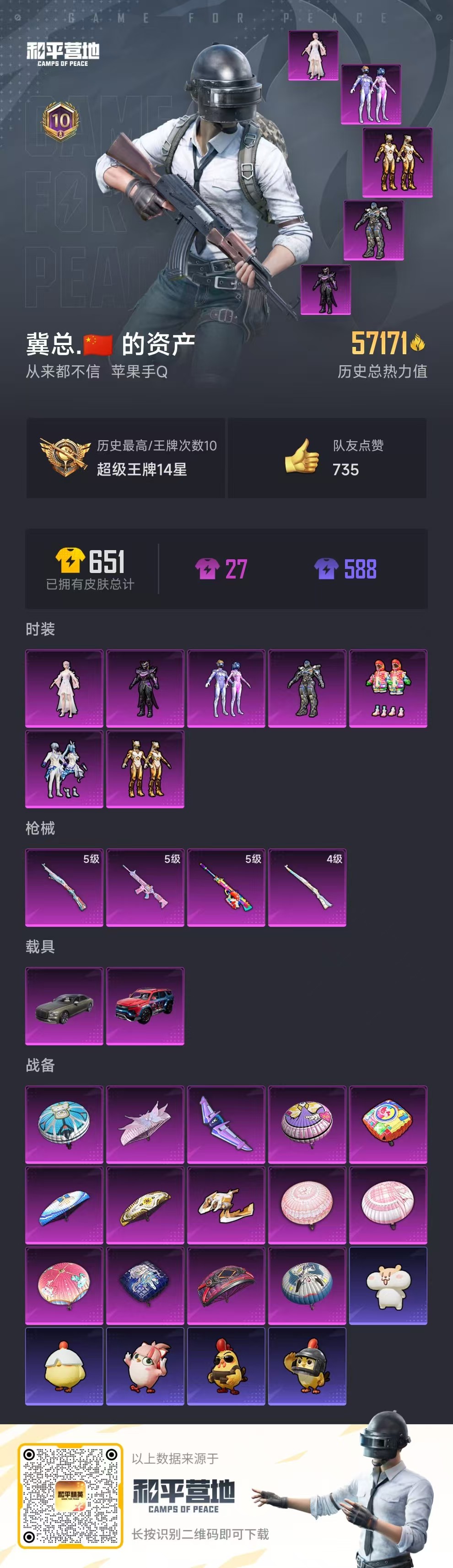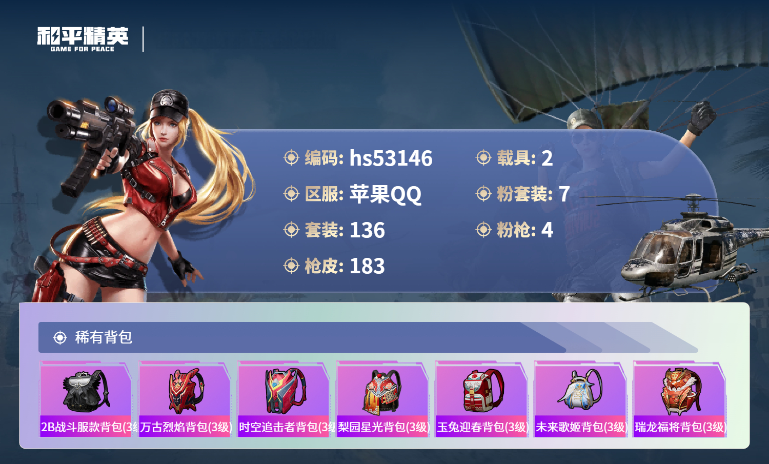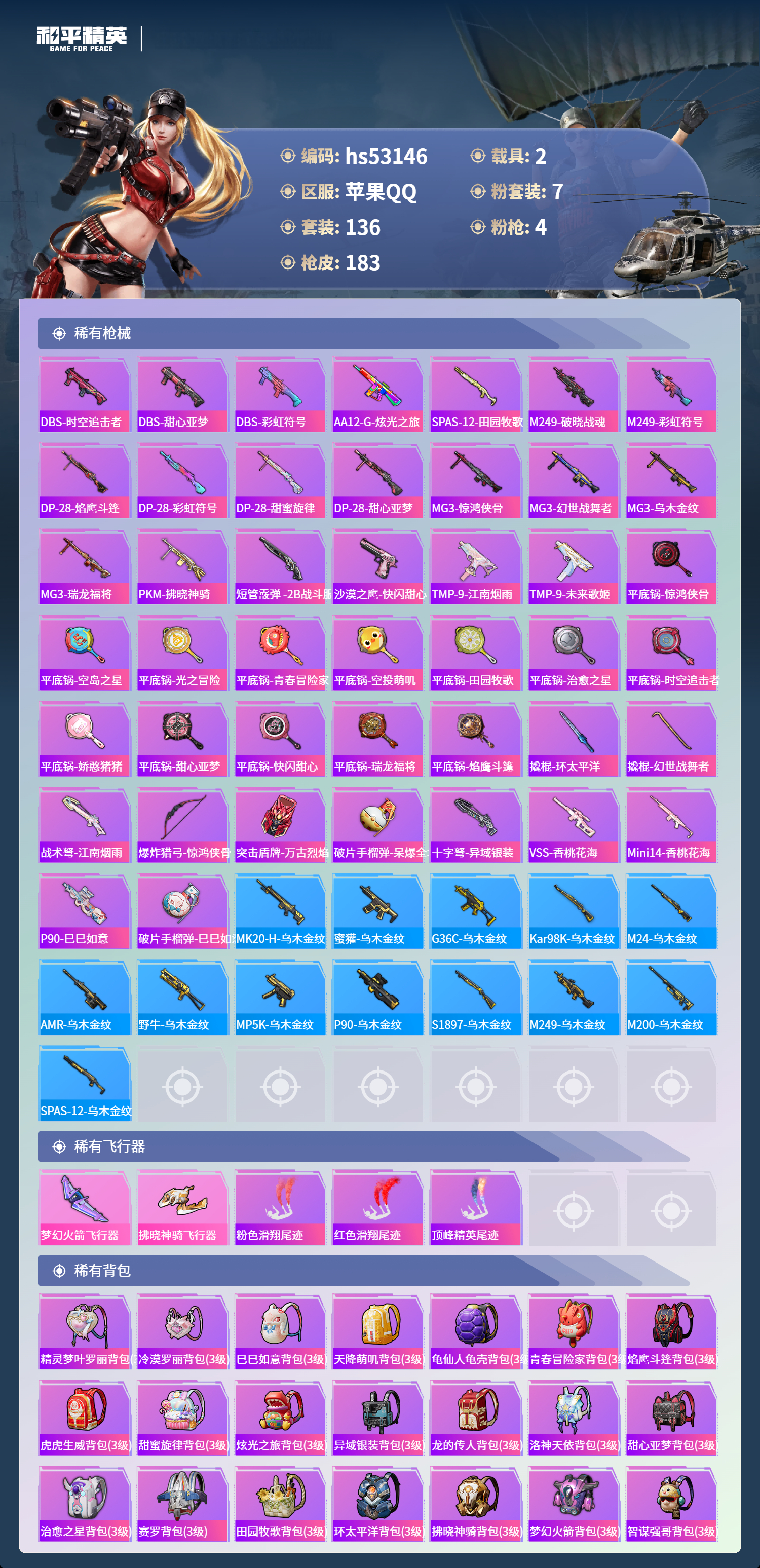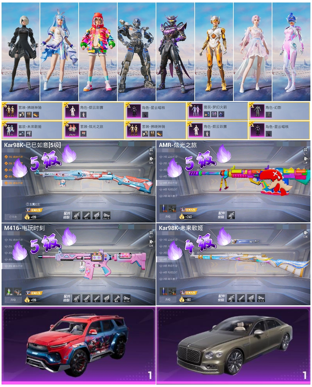 hs53146 苹果手q-10王牌印记-7粉装-4特效呛-2载具-57172热力值-136套装-183呛皮【7粉装】套装-炫光之旅套装-未来歌姬套装-拂晓神骑角色-烟云彩露套装-梦幻火箭角色-星云暗核角色-幻影【4特效呛】amr-炫光之旅/5级kar98k-未来歌姬/4级m416-电玩时刻/5级kar98k-巳巳如意/5级【2稀有紫装】2b战斗服款龟仙人【2稀有载具】宾