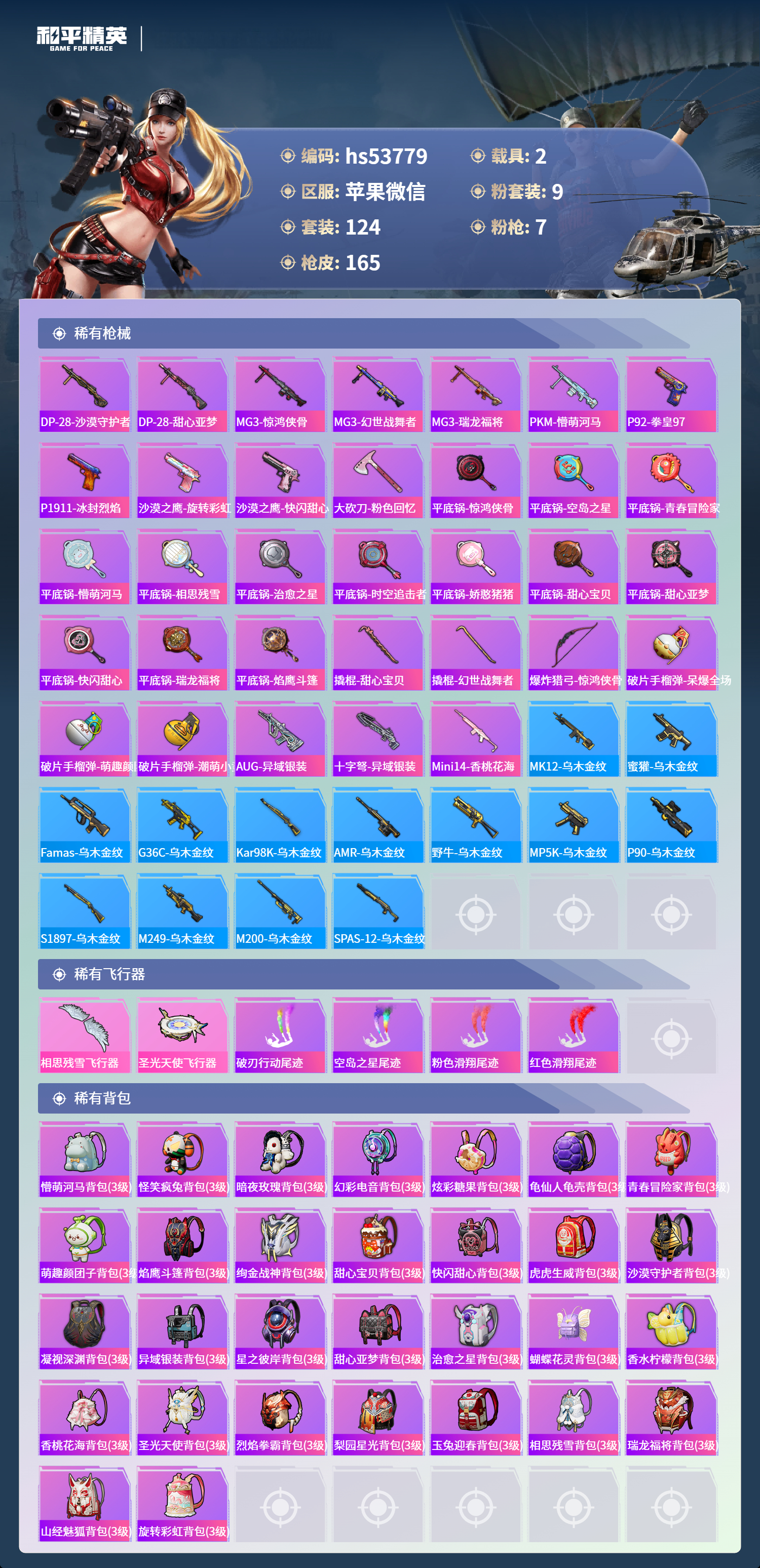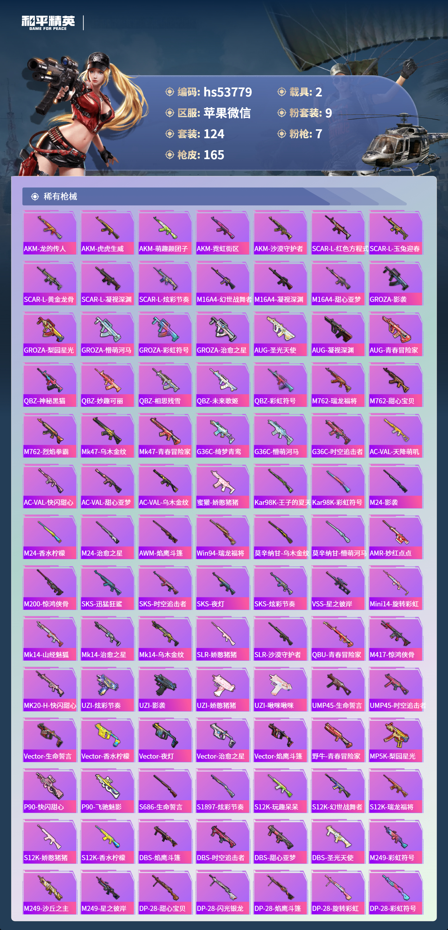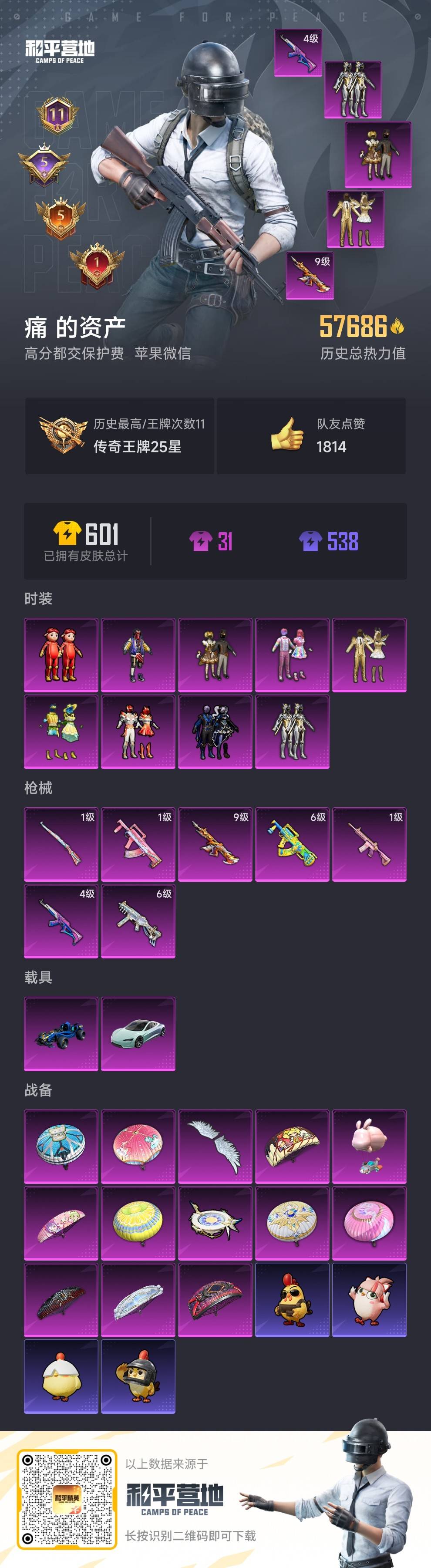 hs53779 苹果微信-11王牌印记-9粉装-7特效呛-2载具-57686热力值-124套装-165呛皮-5卓越印记-5传奇印记【9粉装】玩偶服-猪猪侠套装-绚金战神套装-香水柠檬套装-甜心巧克力套装-霞光圣骑套装-天禅智恒套装-暗夜玫瑰套装-天使彩虹糖套装-金属狂野【7特效呛】groza-香水柠檬/6级m416-心之恋语/1级akm-梦之光华/4级ump45-相思残雪