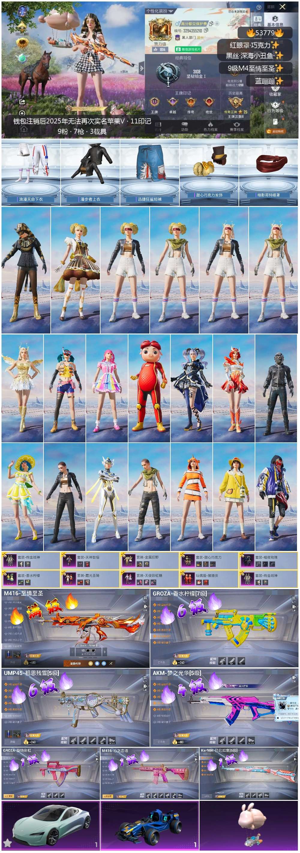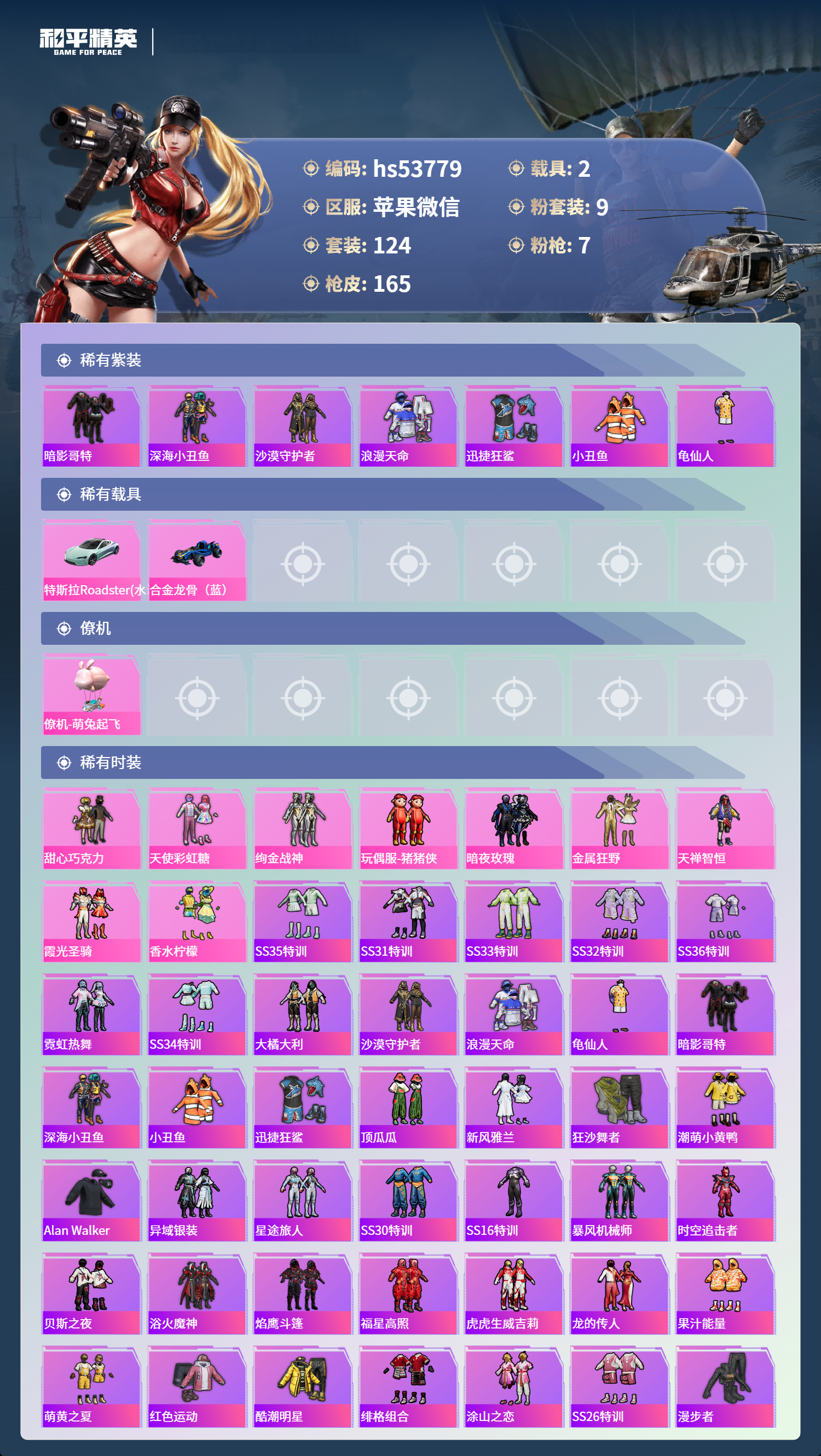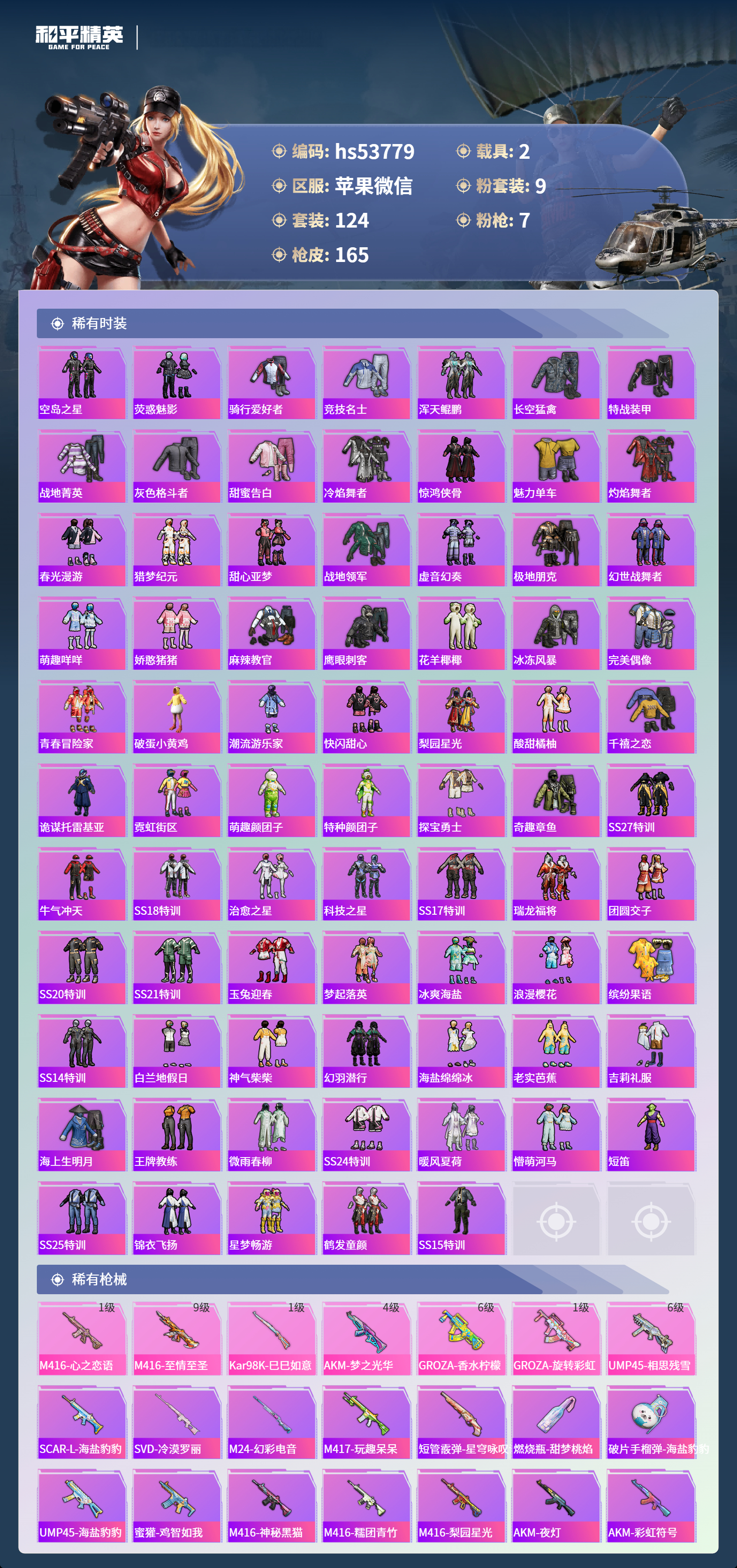 hs53779 苹果微信-11王牌印记-9粉装-7特效呛-2载具-57686热力值-124套装-165呛皮-5卓越印记-5传奇印记【9粉装】玩偶服-猪猪侠套装-绚金战神套装-香水柠檬套装-甜心巧克力套装-霞光圣骑套装-天禅智恒套装-暗夜玫瑰套装-天使彩虹糖套装-金属狂野【7特效呛】groza-香水柠檬/6级m416-心之恋语/1级akm-梦之光华/4级ump45-相思残雪