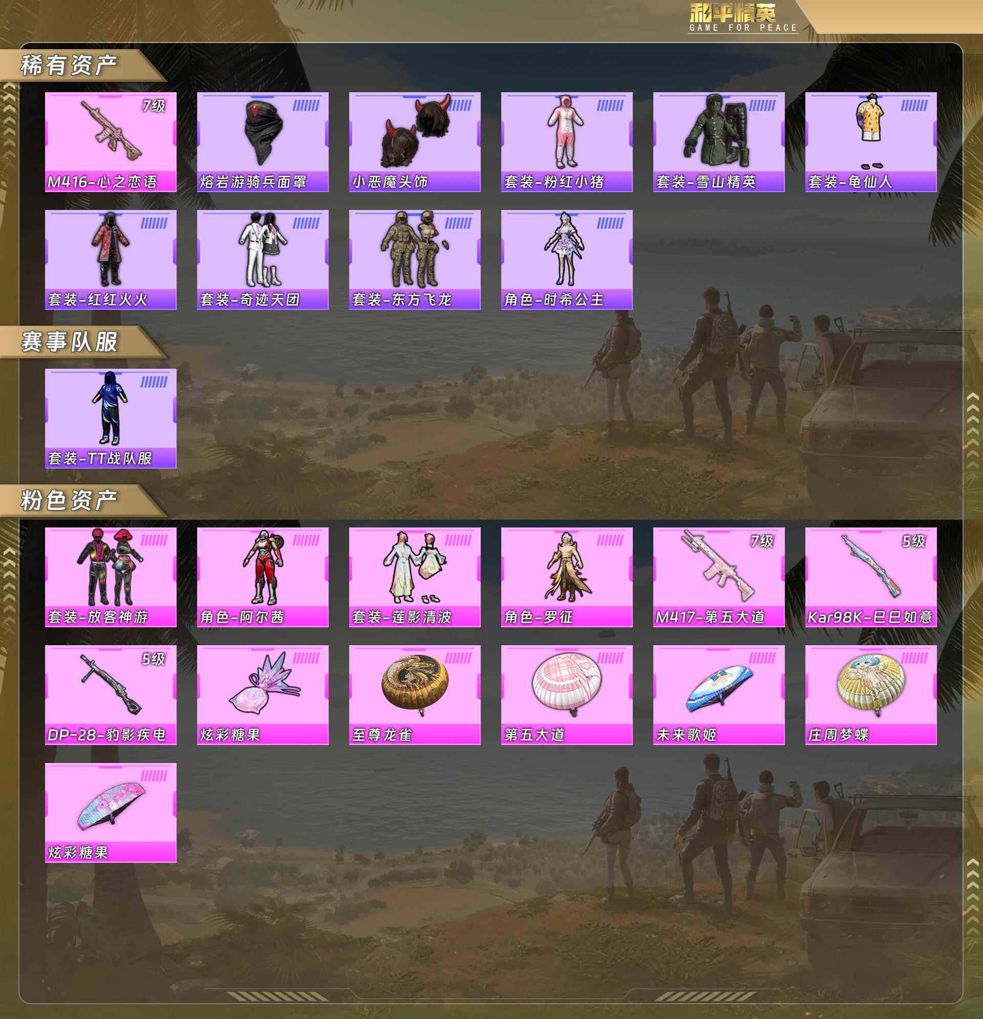 5连赛季战神框-发光眼罩-小恶魔头饰/东方飞龙/熔岩游骑兵面罩/放客神游/阿尔茜/莲影清波/罗征【呛皮】m4心之恋语7级/m417第五大道7级/98k巳巳如意5级/dp28豹影疾电5级(4粉套4粉呛)hp4272-1粉色飞行器-59689热力值-17王牌印记-155套装-193呛皮 【热门品类】:套装-金羽特工,套装-ss1特训,套装-龟仙人,套装-粉红小猪,套装-红红火火,熔岩游骑兵连帽夹克 【粉色套装】:粉装-放客神游,角色-阿尔茜,粉装-莲影清波,角色-罗征 【粉色呛皮等级】:m416-心之恋语七级,kar98k-巳巳如意五级,m417-第五大道七级,dp-28-豹影疾电五级 【粉色呛皮】:m416-心之恋语,kar98k-巳巳如意,m417-第五大道,dp-28-豹影疾电 【粉色降落伞】:至尊龙雀降落伞,庄周梦蝶降落伞,第五大道降落伞,未来歌姬降落伞 【稀有套装】:套装-龟仙人,套装-彩虹兔,套装-云朵鹅,套装-雪绒豹,角色-时希公主,角色-夜瞳黯灵,套装-炫彩糖果 【稀有呛皮】:aug-冰晶雪宝,akm-2p战斗服款,akm-生命誓言,akm-破晓战魂,akm-虎虎生威,akm-霓虹街区,akm-龙的传人,m16a4-机械英豪,m16a4-生命誓言,m16a4-红色方程式,scar-l-夜灯,scar-l-炫彩节奏,scar-l-玉兔迎春,scar-l-黄金龙骨,m416-动感兔斯基,m416-糯团青竹,m416-红色方程式,m416-蓝色火焰,groza-影袭,groza-懵萌河马,groza-黑色刀锋,aug-2p战斗服款,aug-天降萌叽,q-原初圣火,q-诡娃娃,q-飞驰魅影,m762-天降萌叽,m762-快乐主宰,m762-拳皇97,m762-牛气冲天,m762-生命誓言,m762-第五大道,m762-诡娃娃,m762-云朵鹅,mk47-妙红点点,mk47-炫光之旅,g36c-懵萌河马,g36c-荒野猎神,ac-val-天降萌叽,蜜獾-天降萌叽,uzi-啾咪啾咪,uzi-天降萌叽,uzi-红色方程式,ump45-夜灯,ump45-炫光之旅,ump45-粉色回忆,ump45-诡娃娃,vect-生命誓言,vect-黑色刀锋,汤姆逊-勇闯险境,汤姆逊-天降萌叽,野牛-青春冒险家,p90-飞驰魅影,kar98k-勇闯险境,kar98k-炫彩节奏,kar98k-王子的夏天,kar98k-红色方程式,kar98k-飞驰魅影,m24-影袭,m24-冰封烈焰,awm-不夜海上花,sks-勇闯险境,sks-夜灯,sks-玉龙,sks-诡娃娃,vss-彩虹符号,vss-黑色刀锋,mini14-原初圣火,mini14-炫彩节奏,mini14-生命誓言,mini14-金鼠迎春,mini14-黄金龙骨,mk14-治愈之星,win94-机械英豪,莫辛纳甘-懵萌河马,amr-妙红点点,m417-惊鸿侠骨,m200-惊鸿侠骨,svd-云朵鹅,s686-冰封烈焰,s686-生命誓言,s1897-勇闯险境,s1897-星之信仰,s1897-飞驰魅影,s12k-玩趣呆呆,s12k-夜灯,dbs-第五大道,dbs-幻彩电音,spas-12-云朵鹅,m249-妙红点点,m249-彩虹符号,m249-拳皇97,dp-28-原初圣火,dp-28-彩虹符号,mg3-妙红点点,mg3-幻世战舞者,mg3-惊鸿侠骨,mg3-第五大道,pkm-懵萌河马,p92-拳皇97,p92-雷霆特警,p1911-冰封烈焰,p18c-原初圣火,p18c-黄金龙骨,p18c-龙虾霸霸,r45-幻彩电音,沙墨之鹦-云朵鹅,爆炸猎弓-惊鸿侠骨,突击盾牌-绝对恒星,大砍刀-云朵鹅,大砍刀-咒蚀之裁,撬棍-咒蚀之裁,镰刀-咒蚀之裁 【其他套装】:套装-tt战队服,套装-ss2特训,套装-ss3特训,套装-ss4特训,套装-ss5特训,套装-ss6特训,套装-ss7特训,套装-ss8特训,套装-ss9特训,套装-ss12特训,套装-ss13特训,套装-ss18特训,套装-ss19特训,套装-ss20特训,套装-ss21特训,套装-ss22特训,套装-ss23特训,套装-ss24特训,套装-ss25特训,套装-ss26特训,套装-ss27特训,套装-ss29特训,套装-丛林猎人,套装-传奇侦探,套装-光之冒险,套装-决胜时刻,套装-冷焰舞者,套装-北国孤狼,套装-半糖蓝莓,套装-夏日倾情,套装-夏日音浪,套装-奇迹天团,套装-战地督导,套装-拳皇97草薙京,套装-旭日情侣,套装-极速红龙,套装-格斗专家,套装-格斗先锋,套装-沙漠兵团,套装-海岛探路者,套装-海滨突袭者,套装-深蓝色名流,套装-滨海厨神,套装-灰色格斗者,套装-炽焰拳师,套装-热血青春,套装-爱崽白熊,套装-牛气满满,套装-特战装甲,套装-特种空勤,套装-玉兔迎春,套装-甜蜜告白,套装-疯狂小兔子,套装-白熊同盟,套装-白色伏地魔,套装-破蛋小黄鸡,套装-空岛之星,套装-竞技勇士朋克,套装-竞技名士,套装-粉红小猪,套装-红红火火,套装-绮丽涂鸦,套装-绯格组合,套装-缤纷果语,套装-耀眼新星,套装-荣耀,套装-蓝彩潮人,套装-血色贵族,套装-街头潮人,套装-野性战魂,套装-金鼠迎春,套装-长空猛禽,套装-霓虹街区,套装-青年教官,套装-青春校园,套装-青玉碎影,套装-骑行爱好者,套装-魅力单车,套装-鹤鸣,套装-黄色运动,套装-黎明保卫者,套装-龙的传人,套装-龟仙人,套装-特战英豪,套装-刚毅裁决者,套装-苍穹猎鹰,套装-沙漠毒蛇,套装-漫步者,套装-冰原奔狼,套装-水银刺客,套装-金耀舞者,套装-战地菁英,套装-装甲骑士,套装-夜莺强袭者,套装-冰川特警,套装-东方飞龙,套装-梦魇先生,套装-坚韧舞者,套装-黑夜传说,套装-万圣娃娃,套装-凛冬战士,套装-雪山精英,套装-雪山征服者,套装-冰原使者,套装-摩艾涂鸦,套装-圣诞大吉,套装-淡雅花蕊,套装-核芯基因,套装-精神漫游,套装-黑色刀锋,套装-迷域探索者,套装-深蓝冒险家,套装-原初圣火,套装-逆风勇士,套装-朱雀圣者,套装-飞驰魅影,套装-音速流光,套装-妙红点点,套装-幻彩翩翩,套装-莱茵河畔,套装-懵萌河马,套装-神气柴柴,套装-惊鸿侠骨,套装-锦衣飞扬,套装-深海梦境 【稀有头盔】:精灵迷巫头盔1级,金曜白虎头盔3级,金羽特工头盔3级,金羽特工头盔1级,甜蜜誓约头盔3级,甜蜜誓约头盔1级 【稀有背包】:银河战甲背包1级,金风玉露背包2级,深海曼妙背包2级,金羽特工背包2级 【营地id】:710357610