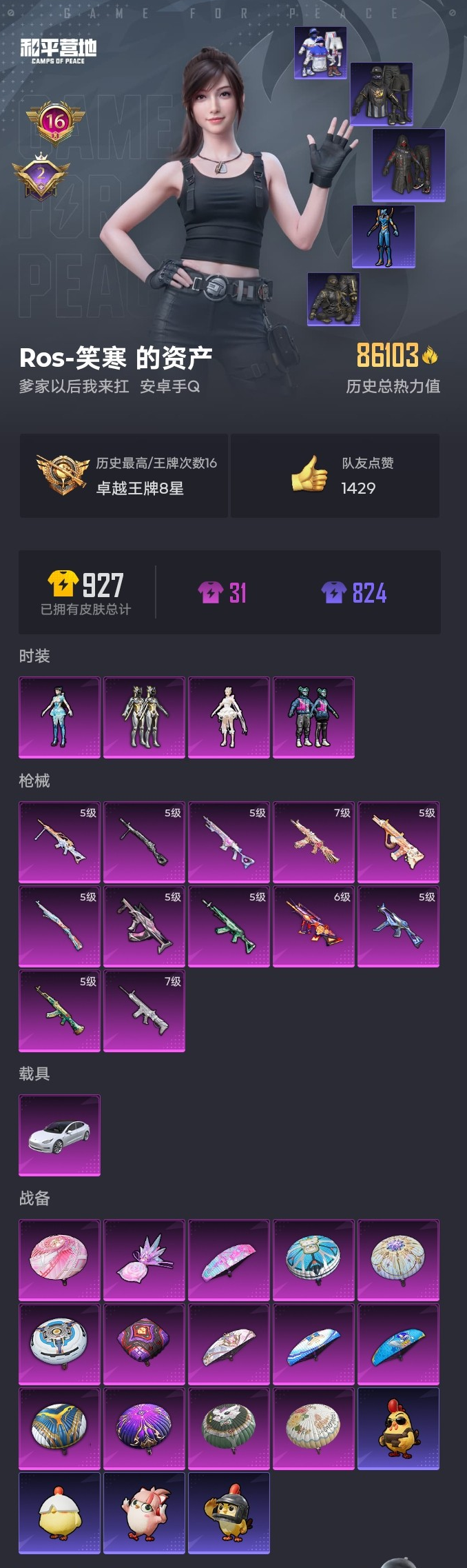 【和平精英】【lyhp17982】4粉12特1载具 天命 蓝螳螂 金羽特工 奇异 多呛型 4粉装,12特效呛,1载具,历史最高段位:卓越王牌8星 王牌印记16次 热力值:86103,188套装,279呛械,280装备,143战备;套装:套装-绚金战神,角色-异瞳寒姬,套装-bearbrick,角色-千金淑猫,套装-特训学院,套装-红色运动,套装-黄色运动,套装-蓝色运动,套装-黄色伏地魔,套装-白色伏地魔,套装-黑色伏地魔,套装-竞技名士,套装-深蓝色名流,套装-酒红色名流,套装-湖蓝色名流,套装-猛禽,套装-迅猛虎鲸,套装-长空猛禽,套装-漫步者,套装-竞技勇士朋克,套装-黎明保卫者,套装-雪鹰学院,套装-海岛探路者,套装-雨林探路者,套装-旭日情侣,套装-灼焰舞者,套装-刚毅裁决者,套装-浪漫天命,套装-战地菁英,套装-浪漫假日,套装-贵族骑装,套装-战地督导,套装-突袭者,套装-青春校园,套装-甜蜜告白,套装-燃烧卡路里,套装-沙漠毒蛇,套装-人气偶像,套装-街头潮人,套装-暗金炫舞,套装-怒火燎原,套装-魅力单车,套装-绮丽涂鸦,套装-坚韧舞者,套装-竞技达人朋克,套装-野性战心,套装-金羽特工,套装-都市魅力,套装-荣耀,套装-热血青春,套装-沙漠兵团,套装-雪山精英,套装-酷潮明星,套装-传奇侦探,套装-极地朋克,套装-幻世战舞者,套装-奇异狩猎者,套装-金耀舞者,套装-蓝调潮人,套装-血色贵族,套装-甜蜜熊情侣,套装-青涩时光,套装-缤纷果语,套装-龙魂突击队,套装-冰川特警,套装-元素星魂,套装-海上生明月,套装-麻辣教官,套装-疯狂小兔子,套装-北国孤狼,套装-跃动心情,套装-ss7特训,套装-黑色刀锋,套装-核芯基因,套装-精神漫游,套装-霓虹街区,套装-激萌罗小黑,套装-众神之王,套装-智慧之神,套装-神秘黑猫,套装-软萌银虎,套装-萌黄之夏,套装-夏日音浪,套装-ss9特训,套装-探宝勇士,套装-牛气满满,套装-原初圣火,套装-逆风勇士,套装-萌趣颜团子,套装-特种颜团子,套装-战术大师,套装-ss12特训,套装-牛气冲天,套装-ss18特训,套装-飞行日记,套装-ss13特训,套装-曼妙人鱼,套装-热情海星,套装-纯真浪花,套装-ss14特训,套装-快乐星愿,套装-ss15特训,套装-ss16特训,套装-ss17特训,套装-瑞龙福将,套装-团圆交子,套装-福星高照,套装-豚鼠丹丹,套装-虎虎生威吉莉,套装-异彩先驱,套装-霓虹极客,套装-空投萌叽,套装-ss19特训,套装-沁蓝冰爽,套装-极速竞梦,套装-飞驰魅影,套装-音速流光,套装-炫蓝之夏,套装-ss20特训,套装-ss21特训,套装-萌趣咩咩,套装-娇憨猪猪,套装-玉兔迎春,套装-ss22特训,套装-田园牧歌,套装-轻风白浪,套装-熠彩粉晶,套装-光之冒险,套装-ss23特训,套装-神气柴柴,套装-懵萌河马,套装-妙红点点,套装-幻彩翩翩,套装-王牌教练,套装-柠萌假日,套装-青玉碎影,套装-ss24特训,套装-日照花林,套装-龟仙人,套装-涂山之恋,套装-ss25特训,套装-惊鸿侠骨,套装-锦衣飞扬,套装-龙的传人,套装-ss26特训,套装-快闪甜心,套装-春光漫游,套装-空岛之星,套装-ss27特训,套装-恋语绒绒,套装-老实芭蕉,套装-ss28特训,套装暗影刺翼,角色-情公主,角色-mark.06,套装-街头风暴,套装-海盐绵绵冰,套装-蝶变,套装-小熊娃娃,套装-雏菊兔兔,套装-萝兰蝴蝶,角色-紫俏灵猫,套装-先驱飞行员,套装-异域银装,套装-ss30特训,套装-青团波波,套装-糖糖葫芦,套装-ss31特训,套装-鱼渊荷华,套装-燕燕于飞,套装-智谋强哥,套装-紫幽梦,套装-粉恋花,套装-ss33特训,套装-巳巳如意,套装-ss32特训,套装-蓝冰羽,套装-狂鲨锋刃,套装-大橘大利,套装-炫彩糖果,套装-蓝海鲸歌,套装-ss34特训,套装-ss35特训,套装-午间小调,套装-秘语星愿,套装-风迹短诗,套装-ss36特训,套装-萌鸡速递;呛皮:mk47-乌木金纹,mk47-妙红点点,mk47-风迹短诗,5级groza-镜光银凌,groza-影袭,groza-黑色刀锋,groza-彩虹符号,groza-异彩先驱,groza-田园牧歌,groza-懵萌河马,groza-海盐豹豹,groza-乌木金纹,5级akm-绿萝繁花,akm-生命誓言,akm-奇异狩猎者,akm-破晓战魂,akm-霓虹街区,akm-夜灯,akm-彩虹符号,akm-虎虎生威,akm-龙的传人,akm-霓彩脉冲,akm-乌木金纹,蜜獾-娇憨猪猪,蜜獾-天降萌叽,蜜獾-精灵梦叶罗丽,蜜獾-糖糖葫芦,蜜獾-风迹短诗,蜜獾-乌木金纹,q-神秘黑猫,q-原初圣火,q-彩虹符号,q-飞驰魅影,q-纯真浪花,q-乌木金纹,6级famas-初号机 觉醒ver.,famas-突变脉冲,famas-霓彩脉冲,famas-乌木金纹,5级aug-暖羊咩咩,aug-甜蜜菠萝,aug-耀粉歌者,aug-青春冒险家,aug-天降萌叽,aug-异域银装,aug-月影灵韵,aug-冰晶雪宝,aug-紫晶流影,aug-乌木金纹,5级m762-青锋波束,m762-奇异狩猎者,m762-深海曼妙,m762-牛气冲天,m762-瑞龙福将,m762-天降萌叽,m762-雏菊兔兔,m762-乌木金纹,m416-夜灯,m416-蓝色火焰,m416-绯红前夜,m416-红色方程式,m416-糯团青竹,m416-乌木金纹,g36c-懵萌河马,g36c-星穹咏叹调,g36c-乌木金纹,ac-val-乌木金纹,ac-val-天降萌叽,ac-val-快闪甜心,7级scar-l-纯梦嫁纱,scar-l-红色方程式,scar-l-夜灯,scar-l-玉兔迎春,scar-l-星途旅人,scar-l-海盐豹豹,scar-l-乌木金纹,m16a4-红色方程式,m16a4-冰河战士,m16a4-乌木金纹,amr-妙红点点,amr-鸡智如我,amr-乌木金纹,awm-垂柳戏鸭,awm-纯真浪花,awm-乌木金纹,5级kar98k-巳巳如意,kar98k-红色方程式,kar98k-梦幻火箭,kar98k-彩虹符号,kar98k-炫彩节奏,kar98k-飞驰魅影,kar98k-乌木金纹,m200-惊鸿侠骨,m200-乌木金纹,win94-瑞龙福将,win94-星兔领航员,win94-乌木金纹,莫辛纳甘-乌木金纹,莫辛纳甘-懵萌河马,莫辛纳甘-风迹短诗,m24-影袭,m24-奇异狩猎者,m24-众神之王,m24-炫彩节奏,m24-乌木金纹,svd-霓彩脉冲,mk20-h-快闪甜心,m