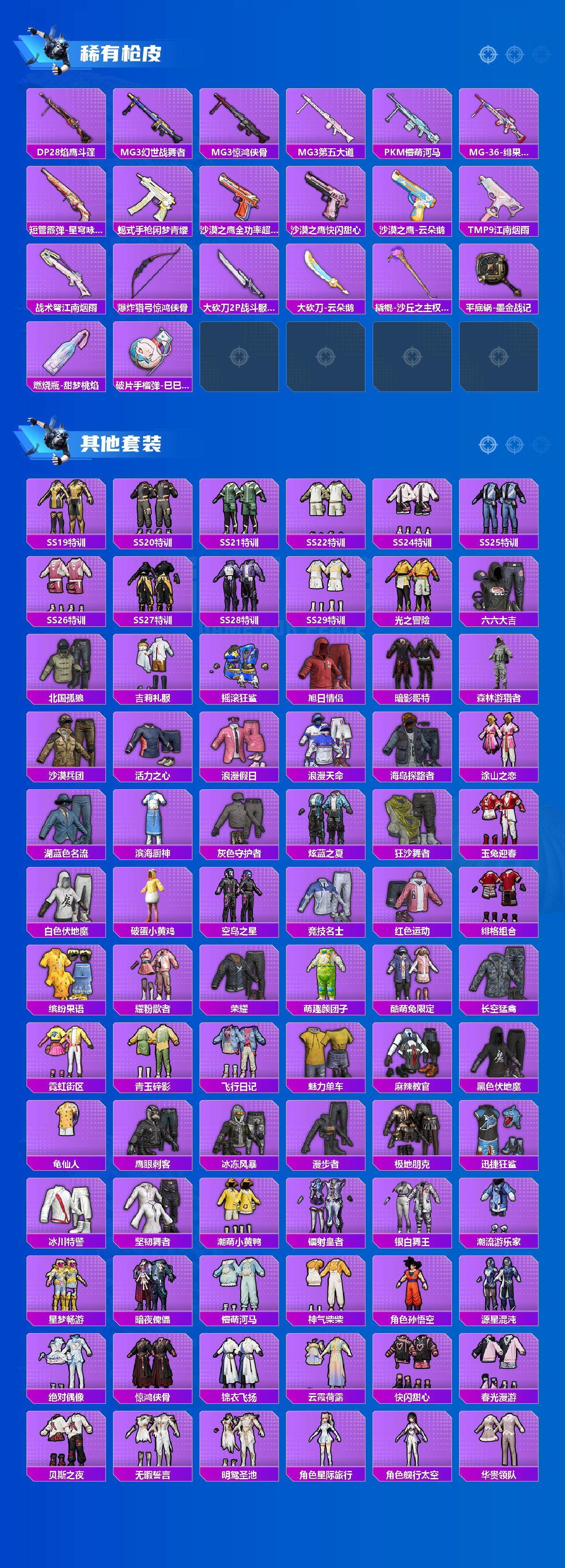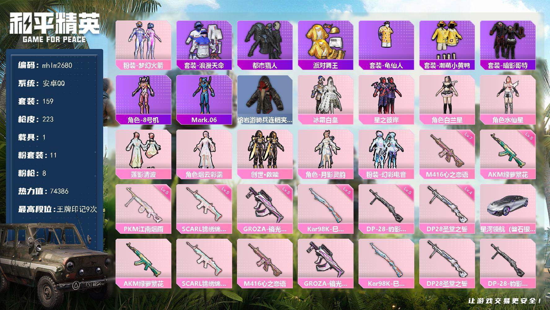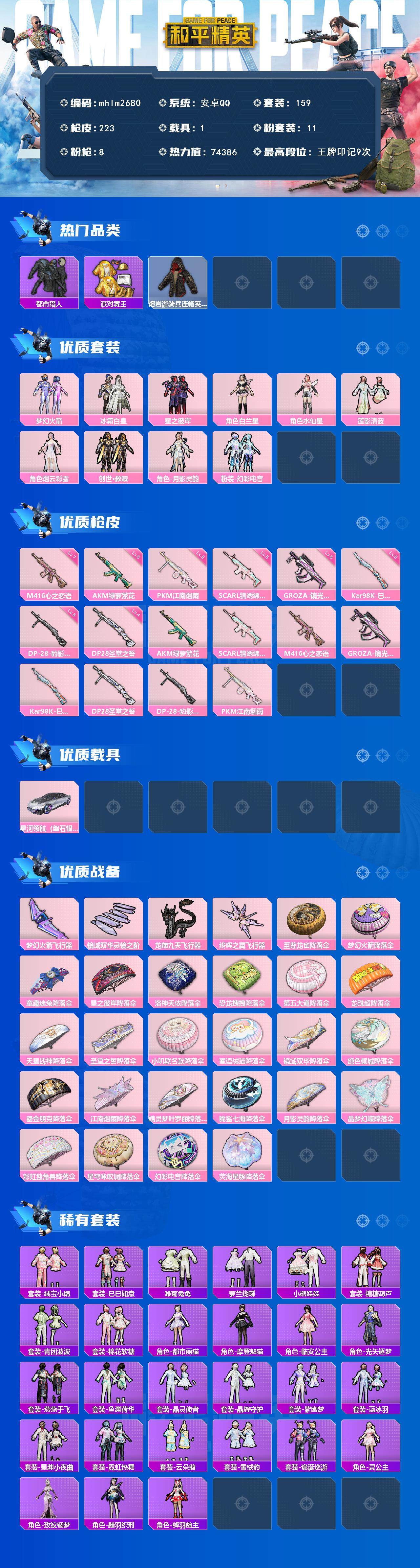 [14659915]【mhlm2680】安卓 手q-11粉装-8特效呛-1载具-5粉色飞行器-74386热力值-9王牌印记-159套装-223呛皮 【热门品类】:粉装-梦幻火箭,套装-浪漫天命,套装-都市猎人,套装-派对舞王,套装-龟仙人,套装-潮萌小黄鸭,套装-暗影哥特,角色-8号机,角色-mark.06,熔岩游骑兵连帽夹克 【粉色套装】:粉装-梦幻火箭,粉装-冰霜白皇,粉装-星之彼岸,角色-白兰星,角色-水仙星,粉装-莲影清波,角色-烟云彩露,套装-创世·救赎,角色-月影灵韵,粉装-幻彩电音 【粉色呛皮等级】:akm-绿萝繁花五级,scar-l-锦绣绵绵五级,m416-心之恋语七级,groza-镜光银凌五级,kar98k-巳巳如意五级,dp-28-圣堂之誓四级,dp-28-豹影疾电五级,pkm-江南烟雨五级 【粉色载具】:星河领航(磐石银) 【粉色呛皮】:akm-绿萝繁花,scar-l-锦绣绵绵,m416-心之恋语,groza-镜光银凌,kar98k-巳巳如意,dp-28-圣堂之誓,dp-28-豹影疾电,pkm-江南烟雨 【粉色飞行器】:梦幻火箭飞行器,镜域双华-灵镜之阶,龙翔九天飞行器,终晖之翼飞行器 【粉色降落伞】:至尊龙雀降落伞,梦幻火箭降落伞,童趣迷兔降落伞,星之彼岸降落伞,洛神天依降落伞,恐龙拽拽降落伞,第五大道降落伞,龙珠超降落伞,天星战神降落伞,圣堂之誓降落伞,小叽联名款降落伞,蜜语绒猫降落伞,镜域双华降落伞,绝色倾城降落伞,鎏金朋克降落伞,江南烟雨降落伞,精灵梦叶罗丽降落伞,脆鲨七海降落伞,月影灵韵降落伞,晶梦幻蝶降落伞,彩虹独角兽降落伞,星穹咏叹调降落伞,幻彩电音降落伞,荧海星豚降落伞 【稀有套装】:套装-龟仙人,套装-绒宝小鹅,套装-巳巳如意,套装-雏菊兔兔,套装-萝兰蝴蝶,套装-小熊娃娃,套装-糖糖葫芦,套装-青团波波,套装-棉花软糖,角色-都市丽猫,角色-摩登魅猫,角色-临安公主,角色-光矢逐梦,套装-燕燕于飞,套装-鱼渊荷华,套装-晶灵使者,套装-晶辉守护,套装-紫幽梦,套装-蓝冰羽,套装-星渊小夜曲,套装-霓虹热舞,套装-云朵鹅,套装-雪绒豹,套装-诡诞巡游,角色-灵公主,角色-玫纹锢梦,角色-黯羽织刑,角色-绛羽幽主 【稀有呛皮】:akm-夜灯,akm-影袭,akm-星之彼岸,akm-江南烟雨,akm-萌趣颜团子,ak