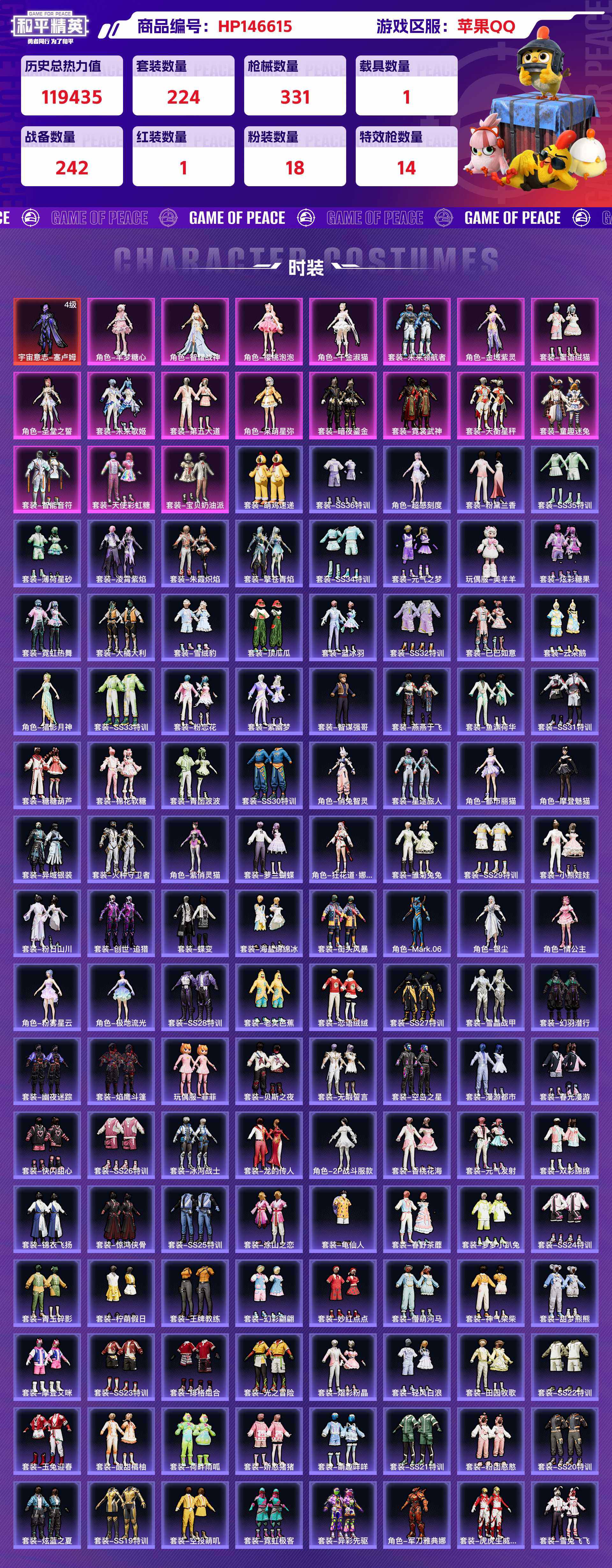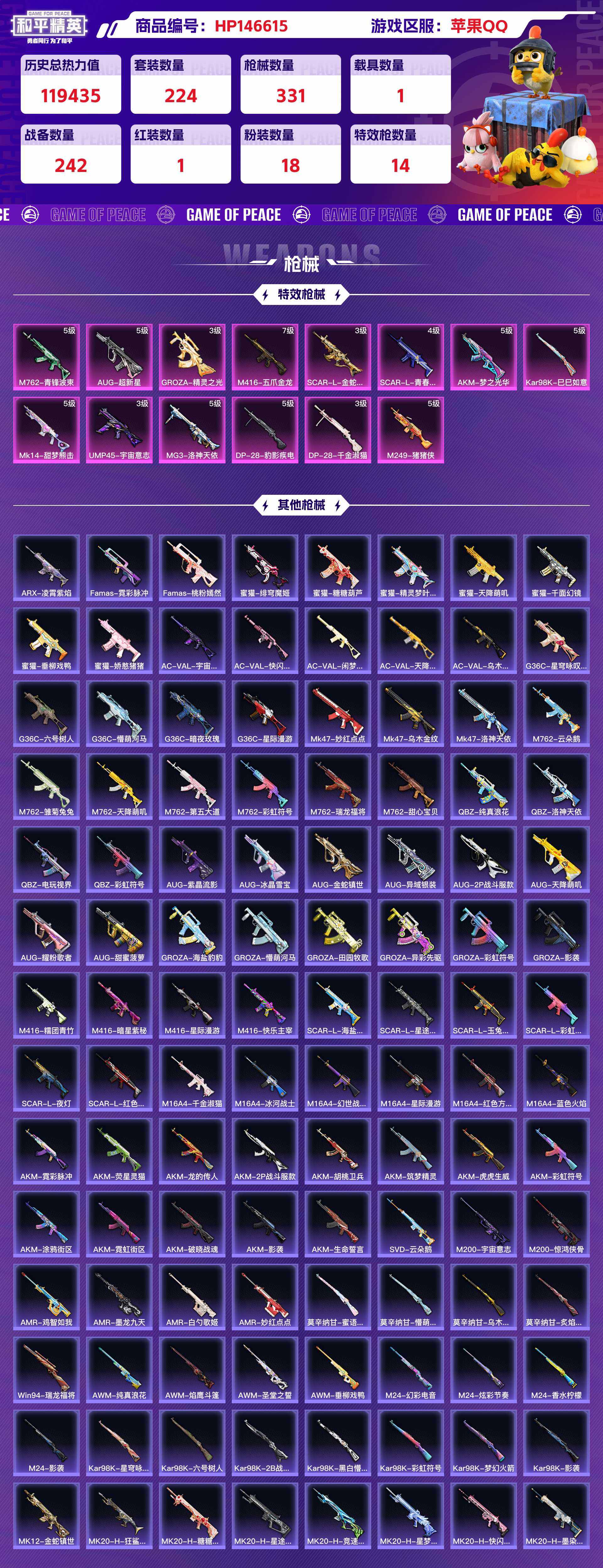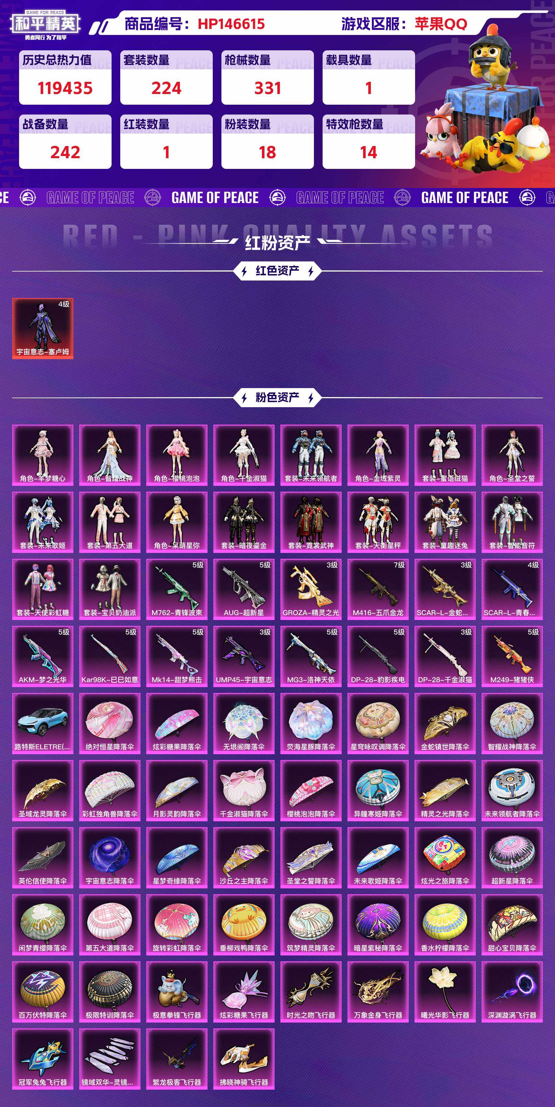 hp146615|极品脱坑和平号可二次4级红装赛卢姆18粉装(羊梦糖心千金淑猫金域紫灵未来歌姬) 14粉呛 1个七级(m416-五爪金龙) 1载具 粉熊背包3件套m416-星际漫游 国宝头盔 深海小丑鱼浪漫天命都市猎人 小金鞋童趣迷兔