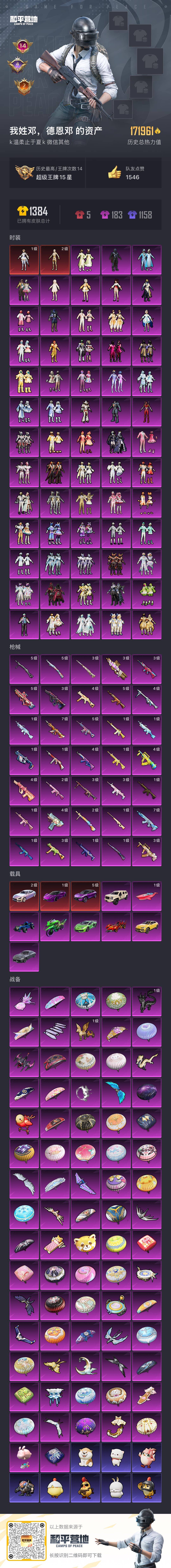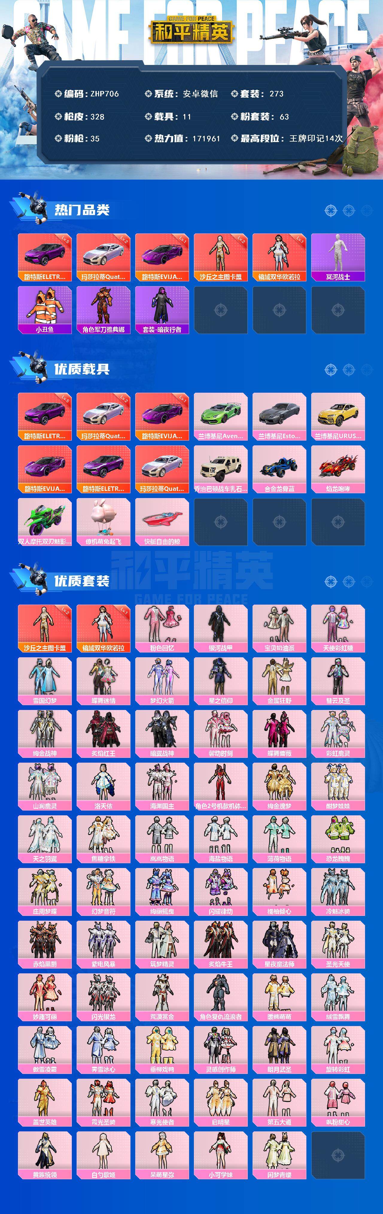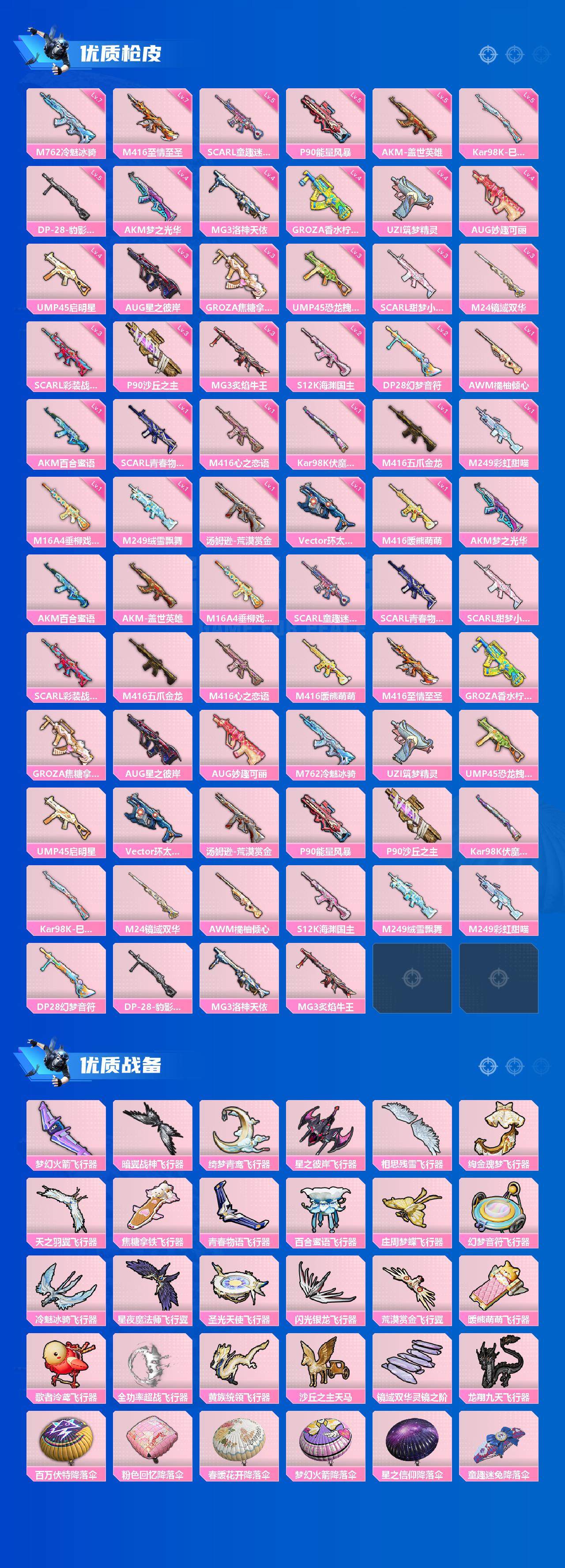 老木乃伊-2神装-63粉装-35特效呛-11载具-26粉色飞行器-171961热力值-14王牌印记-273套装-328呛皮 【红色载具】:路特斯eletre(电光紫)五级,路特斯evija(电光紫)一级,玛莎拉蒂quattropte(幻星粉)二级 【红色神装等级】:镜域双华-欧若拉一级,沙丘之主-图卡盟二级 【热门品类】:粉装-雪国幻梦,粉装-梦幻火箭,套装-冥河战士,套装-深海小丑鱼,套装-小丑鱼,角色-军刀雅典娜,套装-暗夜行者,套装-龟仙人,套装-暗影哥特,套装-浪漫波比,套装-粉红小猪 【粉色套装】:粉装-粉色回忆,粉装-银河战甲,粉装-宝贝奶油派,粉装-天使彩虹糖,粉装-雪国幻梦,粉装-蝶舞迷情,粉装-梦幻火箭,粉装-星之信仰,粉装-金属狂野,粉装-彗云及圣,粉装-绚金战神,粉装-炙焰红王,粉装-暗翼战神,粉装-馨动时刻,粉装-蝶舞蔷薇,粉装-彩虹鹿灵,粉装-山涧鹿灵,角色-洛天依,粉装-海渊国主,角色-2号机款机体服,粉装-绚金瑰梦,粉装-酣梦娃娃,粉装-天之羽翼,粉装-焦糖拿铁,粉装-岚岚物语,粉装-海盐物语,粉装-薄荷物语,粉装-恐龙拽拽,粉装-庄周梦蝶,粉装-幻梦音符,粉装-绚丽摇曳,粉装-闪耀律动,粉装-橘柚倾心,粉装-冷魅冰骑,粉装-赤焰黑爵,粉装-紫电风暴,粉装-筑梦精灵,粉装-炙焰牛王,粉装-星夜魔法师,粉装-圣光天使,粉装-妙趣可丽,粉装-闪光银龙,粉装-荒漠赏金,角色-复仇流浪者,粉装-暖熊萌萌,粉装-绒雪飘舞,粉装-傲雪凌霜,粉装-霁雪冰心,粉装-垂柳戏鸭,粉装-灵感创作师,粉装-朗月武圣,粉装-旋转彩虹,粉装-盖世英雄,粉装-霞光圣骑,粉装-寒光使者,粉装-启明星,粉装-第五大道,粉装-飒粉甜心,粉装-黄族统领,角色-白勺歌姬,角色-呆萌星弥,角色-小可学妹,粉装-闲梦青缨 【粉色呛皮等级】:akm-梦之光华四级,akm-百合蜜语一级,akm-盖世英雄五级,m16a4-垂柳戏鸭一级,scar-l-童趣迷兔五级,scar-l-青春物语一级,scar-l-甜梦小狐三级,scar-l-彩装战姬三级,m416-五爪金龙一级,m416-心之恋语一级,m416-暖熊萌萌一级,m416-至情至圣七级,groza-香水柠檬四级,groza-焦糖拿铁三级,aug-星之彼岸三级,aug-妙趣可丽四级,m762-冷魅冰骑七级,uzi-筑梦精灵四级,ump45-恐龙拽拽三级,ump45-启明星四级,vect-环太平洋一级,汤姆逊-荒漠赏金一级,p90-能量风暴五级,p90-沙丘之主三级,kar98k-伏魔团一级,kar98k-巳巳如意五级,m24-镜域双华三级,awm-橘柚倾心一级,s12k-海渊国主二级,m249-绒雪飘舞一级,m249-彩虹甜喵一级,dp-28-幻梦音符二级,dp-28-豹影疾电五级,mg3-洛神天依四级,mg3-炙焰牛王三级 【粉色载具】:兰博基尼aventad svj(翡翠绿),兰博基尼estoque(银翼灰),兰博基尼urus(明艳黄),路特斯evija(电光紫),路特斯eletre(电光紫),玛莎拉蒂quattropte(幻星粉),乔治巴顿战车(乳石白),合金龙骨(蓝),焰龙咆哮,双人摩托-双刃魅影(绿),僚机-萌兔起飞,快艇-自由的鲸 【粉色呛皮】:akm-梦之光华,akm-百合蜜语,akm-盖世英雄,m16a4-垂柳戏鸭,scar-l-童趣迷兔,scar-l-青春物语,scar-l-甜梦小狐,scar-l-彩装战姬,m416-五爪金龙,m416-心之恋语,m416-暖熊萌萌,m416-至情至圣,groza-香水柠檬,groza-焦糖拿铁,aug-星之彼岸,aug-妙趣可丽,m762-冷魅冰骑,uzi-筑梦精灵,ump45-恐龙拽拽,ump45-启明星,vect-环太平洋,汤姆逊-荒漠赏金,p90-能量风暴,p90-沙丘之主,kar98k-伏魔团,kar98k-巳巳如意,m24-镜域双华,awm-橘柚倾心,s12k-海渊国主,m249-绒雪飘舞,m249-彩虹甜喵,dp-28-幻梦音符,dp-28-豹影疾电,mg3-洛神天依,mg3-炙焰牛王 【粉色飞行器】:梦幻火箭飞行器,暗翼战神飞行器,绮梦青鸾飞行器,星之彼岸飞行器,相思残雪飞行器,绚金瑰梦飞行器,天之羽翼飞行器,焦糖拿铁飞行器,青春物语飞行器,百合蜜语飞行器,庄周梦蝶飞行器,幻梦音符飞行器,冷魅冰骑飞行器,星夜魔法师飞行翼,圣光天使飞行器,闪光银龙飞行器,荒漠赏金飞行翼,暖熊萌萌飞行器,歌者泠鸢飞行器,全功率超战飞行器,黄族统领飞行器,沙丘之主天马,镜域双华-灵镜之阶,龙翔九天飞行器 【粉色降落伞】:百万伏特降落伞,粉色回忆降落伞,春暖花开降落伞,梦幻火箭降落伞,星之信仰降落伞,童趣迷兔降落伞,香水柠檬降落伞,暗翼战神降落伞,星之彼岸降落伞,相思残雪降落伞,洛神天依降落伞,海渊国主降落伞,绚金瑰梦降落伞,暗星紫秘降落伞,天之羽翼降落伞,焦糖拿铁降落伞,百合蜜语降落伞,恐龙拽拽降落伞,庄周梦蝶降落伞,幻梦音符降落伞,橘柚倾心降落伞,冷魅冰骑降落伞,筑梦精灵降落伞,炙焰牛王降落伞,星夜魔法师降落伞,圣光天使降落伞,妙趣可丽降落伞,闪光银龙降落伞,荒漠赏金降落伞,环太平洋降落伞,暖熊萌萌降落伞,绒雪飘舞降落伞,垂柳戏鸭降落伞,灵感创作师降落伞,彩虹甜喵降落伞,旋转彩虹降落伞,冰川粉黛降落伞,青空秋雨降落伞,启明星降落伞,歌者泠鸢降落伞,暗夜鎏金降落伞,飒粉甜心降落伞,黄族统领降落伞,白勺歌姬降落伞,璀璨巨星降落伞,闲梦青缨降落伞,沙丘之主降落伞,镜域双华降落伞,异瞳寒姬降落伞 【稀有套装】:套装-龟仙人,角色-狂花道·娜可露露,角色-都市丽猫,套装-极速光影,套装-炫彩糖果 【稀有呛皮】:akm-彩虹符号,akm-影袭,akm-恐龙拽拽,akm-星之信仰,akm-星之彼岸,akm-星兔领航员,akm-春暖花开,akm-海渊国主,akm-王牌投手,akm-环太平洋,akm-百万伏特,akm-筑梦精灵,akm-缤纷海域,akm-虎虎生威,akm-龙的传人,m16a4-冥河战士,m16a4-幻世战舞者,m16a4-甜心亚梦,m16a4-红色方程式,scar-l-夏日绵绵冰,scar-l-炫彩节奏,scar-l-玉兔迎春,scar-l-粉色回忆,m416-彩虹嘻嘻猴,m416-糯团青竹,m416-紫翼圣骑,m