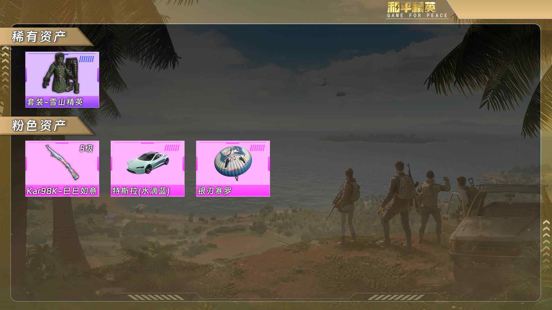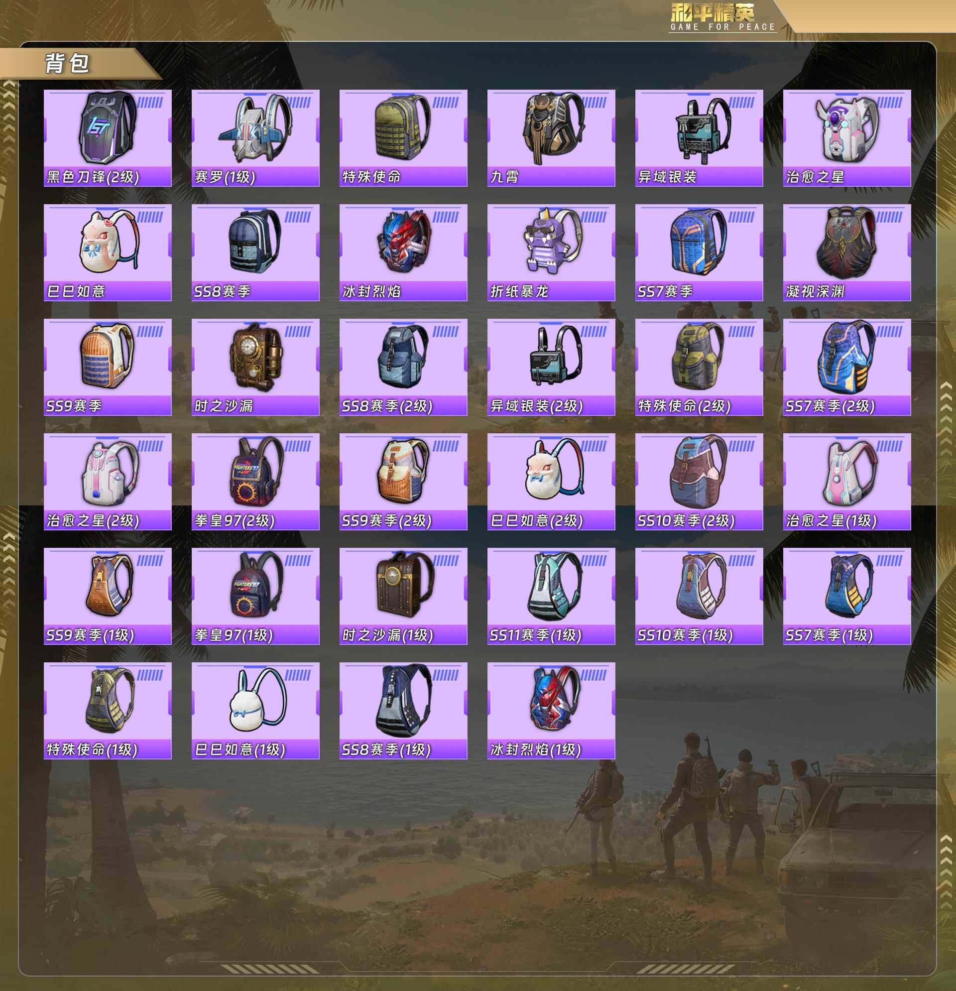 (1粉呛1载具)雪山精英/98k巳巳如意5级/特斯拉水滴蓝没战神框hp4294-0粉色飞行器-22500热力值-1王牌印记-64套装-71呛皮 【粉色载具】:特斯拉roadster(水滴蓝) 【粉色呛皮等级】:kar98k-巳巳如意五级 【粉色呛皮】:kar98k-巳巳如意 【粉色降落伞】:银刃赛罗降落伞 【稀有呛皮】:akm-冰凉西瓜,akm-彩虹符号,scar-l-红色方程式,m416-红色方程式,m416-蓝色火焰,groza-春暖花开,groza-治愈之星,groza-生命誓言,groza-黑色刀锋,aug-凝视深渊,aug-魅夜紫皇,m762-拳皇97,ac-val-天降萌叽,uzi-生命誓言,ump45-快乐主宰,ump45-蓝色火焰,vect-治愈之星,vect-生命誓言,vect-黑色刀锋,汤姆逊-耀粉歌者,kar98k-欢乐麻酱,kar98k-红色方程式,m24-治愈之星,m24-冰封烈焰,m24-樱桃泡泡,sks-夜灯,vss-华贵君王,vss-彩虹符号,vss-黑色刀锋,mini14-耀粉歌者,mini14-金鼠迎春,mk14-治愈之星,s686-冰封烈焰,s686-生命誓言,s1897-春暖花开,s12k-破晓战魂,m249-彩虹符号,m249-拳皇97,mg3-幻世战舞者,p92-拳皇97,p1911-冰封烈焰,蝎式手呛-欢乐香蕉 【其他套装】:套装-ss2特训,套装-ss5特训,套装-ss6特训,套装-ss7特训,套装-ss8特训,套装-ss9特训,套装-ss14特训,套装-ss15特训,套装-ss16特训,套装-ss17特训,套装-ss18特训,套装-ss19特训,套装-ss24特训,套装-ss25特训,套装-丛林猎人,套装-传奇侦探,套装-冷焰舞者,套装-北国孤狼,套装-千禧之恋,套装-半糖蓝莓,套装-怒火燎原,套装-拳皇97草薙京,套装-格斗专家,套装-海滨突袭者,套装-湖蓝色名流,套装-灼焰舞者,套装-炽焰拳师,套装-特训学院,套装-甜蜜告白,套装-疯狂小兔子,套装-破晓战魂,套装-破蛋小黄鸡,套装-竞技勇士朋克,套装-竞技名士,套装-绯格组合,套装-缤纷果语,套装-耀粉歌者,套装-蓝彩潮人,套装-跃动心情,套装-金鼠迎春,套装-长空猛禽,套装-霓虹街区,套装-青年教官,套装-魅力单车,套装-甜蜜菠萝,套装-战地菁英,套装-派对绅士,套装-极地朋克,套装-坚韧舞者,套装-森林猎手,套装-幻世猎手,套装-凛冬战士,套装-雪山精英,套装-雪山征服者,套装-冰原使者,套装-圣诞大吉,套装-云纹魔法士,套装-核芯基因,套装-精神漫游,套装-治愈之星,套装-科技之星 【稀有头盔】:幻影战神头盔2级 【稀有背包】:九霄背包3级,折纸暴龙背包3级 【营地id】:797591636