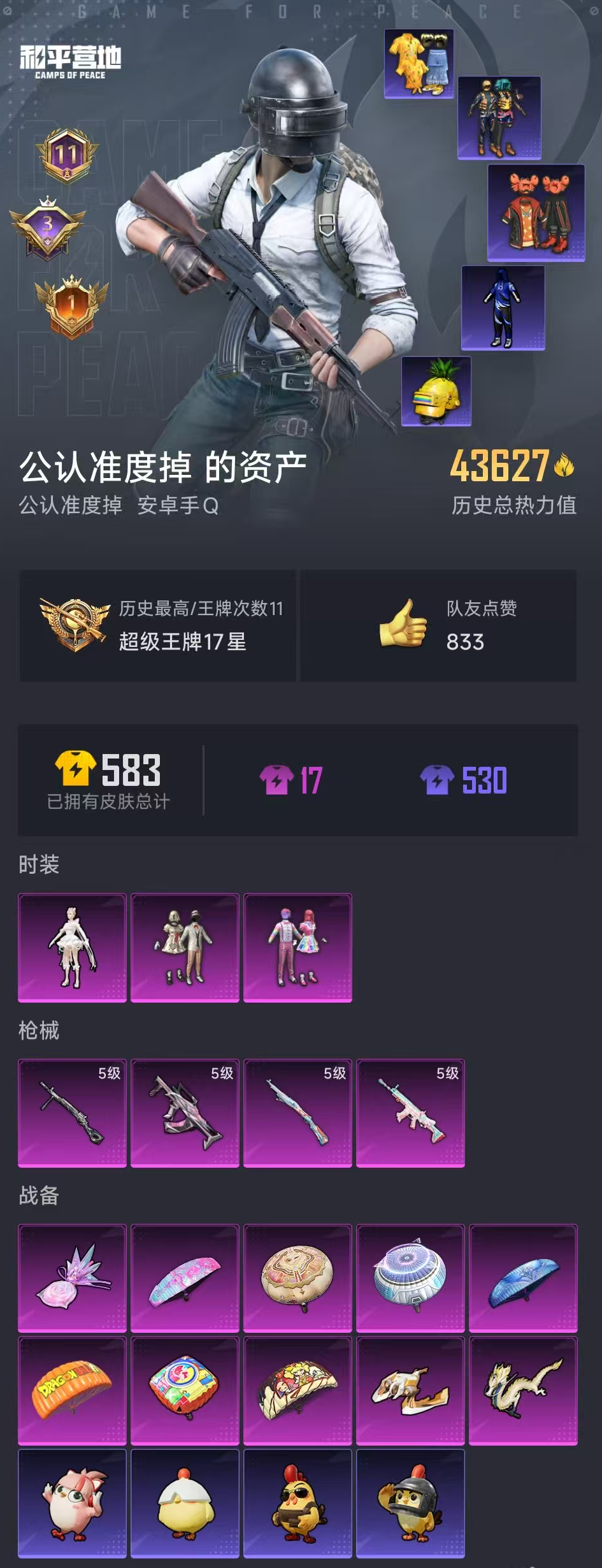 【和平精英】【lyhp18052】满天赋 4.3w热力值3粉装4特效呛 千金淑猫 宝贝奶油 战队服 深海小丑鱼 满级锦绣绵绵死噶 3粉装,4特效呛,0载具,历史最高段位:超级王牌17星 王牌印记11次 热力值:43627,128套装,157呛械,173装备,102战备;套装:套装-宝贝奶油派,套装-天使彩虹糖,角色-千金淑猫,套装-特训学院,套装-猎鹰,套装-青年教官,套装-橘黑制服,套装-红色运动,套装-黄色运动,套装-蓝色运动,套装-黄色伏地魔,套装-白色伏地魔,套装-黑色伏地魔,套装-帅气教官,套装-竞技名士,套装-深蓝色名流,套装-酒红色名流,套装-湖蓝色名流,套装-黄色名流,套装-猛禽,套装-长空猛禽,套装-海岛探路者,套装-旭日情侣,套装-冷焰舞者,套装-灼焰舞者,套装-特战装甲,套装-战地督导,套装-青春校园,套装-燃烧卡路里,套装-暗黑骑手,套装-沙漠毒蛇,套装-完美偶像,套装-人气偶像,套装-幻影武者,套装-街头潮人,套装-蓝彩潮人,套装-魅力单车,套装-绮丽涂鸦,套装-坚韧舞者,套装-竞技达人朋克,套装-野性战心,套装-破晓战魂,套装-幻世保卫者,套装-森林游猎者,套装-荣耀,套装-弄潮海豚,套装-呆萌铁蟹,套装-深海小丑鱼,套装-生化防暴队,套装-夏日倾情,套装-青涩时光,套装-缤纷果语,套装-滨海厨神,套装-龙魂突击队,套装-风暴特警,套装-冰川特警,套装-元素星魂,套装-破蛋小黄鸡,套装-精神漫游,套装-鹤鸣,套装-霓虹街区,套装-智慧之神,套装-战术大师,套装-耀粉歌者,套装-竞技角斗士,套装-tt战队服,套装-玉兔迎春,套装-ss22特训,套装-光之冒险,套装-绯格组合,套装-ss23特训,套装-神气柴柴,套装-懵萌河马,套装-灵蜜圈圈,套装-妙红点点,套装-幻彩翩翩,套装-王牌教练,套装-柠萌假日,套装-青玉碎影,套装-ss24特训,套装-荧惑魅影,套装-龟仙人,套装-涂山之恋,套装-ss25特训,套装-惊鸿侠骨,套装-锦衣飞扬,套装-深海梦境,套装-龙的传人,套装-ss26特训,套装-快闪甜心,套装-春光漫游,套装-空岛之星,套装-无暇誓言,套装-焰鹰斗篷,套装-幻羽潜行,套装-ss27特训,套装-恋语绒绒,套装-老实芭蕉,套装-ss28特训,角色-极地流光,角色-粉雾星云,套装-街头风暴,套装-海盐绵绵冰,套装-蝶变,套装-雏菊兔兔,套装-萝兰蝴蝶,套装-异域银装,角色-蜜桃派对,套装-星途旅人,套装-ss31特训,套装-鱼渊荷华,套装-燕燕于飞,套装-智谋强哥,套装-紫幽梦,套装-粉恋花,套装-ss33特训,套装-巳巳如意,套装-ss32特训,套装-蓝冰羽,套装-顶瓜瓜,套装-大橘大利,套装-炫彩糖果,套装-元气之梦,套装-ss34特训,套装-薄荷星砂,套装-ss35特训,套装-ss36特训,套装-萌鸡速递;呛皮:m762-绯红前夜,m762-甜心宝贝,m762-天降萌叽,m762-雏菊兔兔,5级scar-l-锦绣绵绵,scar-l-红色方程式,scar-l-夜灯,scar-l-炫彩节奏,scar-l-彩虹符号,scar-l-甜蜜旋律,scar-l-星途旅人,scar-l-海盐豹豹,5级groza-镜光银凌,groza-懵萌河马,aug-耀粉歌者,aug-天降萌叽,aug-异域银装,aug-冰晶雪宝,aug-紫晶流影,蜜獾-天降萌叽,蜜獾-鸡智如我,蜜獾-乌木金纹,ac-val-乌木金纹,ac-val-快闪甜心,akm-缤纷海域,akm-破晓战魂,akm-涂鸦街区,akm-彩虹符号,akm-龙的传人,akm-霓彩脉冲,famas-霓彩脉冲,famas-乌木金纹,m16a4-蓝色火焰,m16a4-莲影清波,m416-糯团青竹,q-未来歌姬,g36c-懵萌河马,mk47-妙红点点,amr-妙红点点,amr-鸡智如我,amr-乌木金纹,awm-圣堂之誓,awm-焰鹰斗篷,win94-乌木金纹,莫辛纳甘-乌木金纹,莫辛纳甘-懵萌河马,m200-惊鸿侠骨,m200-乌木金纹,5级kar98k-巳巳如意,kar98k-红色方程式,svd-霓彩脉冲,mk20-h-快闪甜心,mk20-h-狂鲨锋刃,mk20-h-乌木金纹,mk14-冰河战士,mk14-紫幽梦,mk14-紫晶流影,mini14-穿刺龙虾,mini14-耀粉歌者,mini14-香桃花海,mini14-雏菊兔兔,vss-彩虹符号,vss-香桃花海,m417-惊鸿侠骨,m417-玩趣呆呆,sks-迅猛狂鲨,sks-炫彩节奏,sks-糯团青竹,slr-彩虹符号,slr-霓彩脉冲,mk12-乌木金纹,uzi-红色方程式,uzi-天降萌叽,uzi-冰河战士,uzi-啾咪啾咪,uzi-炫彩糖果,uzi-绿洲时空,ump45-蓝色火焰,ump45-生命誓言,ump45-涂山之恋,ump45-炫光之旅,ump45-海盐豹豹,ump45-极意拳锋,汤姆逊-耀粉歌者,汤姆逊-炫彩节奏,汤姆逊-天降萌叽,汤姆逊-星梦奇缘,汤姆逊-樱桃泡泡,mp5k-未来领航者,mp5k-乌木金纹,p90-快闪甜心,p90-玩趣呆呆,p90-巳巳如意,p90-乌木金纹,aks-74u-鸡智如我,aks-74u-乌木金纹,vect-生命誓言,vect-炎氏战神,vect-焰鹰斗篷,vect-燕燕于飞,野牛-雏菊兔兔,野牛-燕燕于飞,aa12-g-炫光之旅,dbs-彩虹符号,dbs-圣堂之誓,dbs-焰鹰斗篷,dbs-荧海星豚,dbs-乌木金纹,s12k-玩趣呆呆,s12k-智耀战神,s12k-霓彩脉冲,s686-红色方程式,s686-奇异狩猎者,s686-生命誓言,spas-12-燕燕于飞,spas-12-乌木金纹,s1897-炫彩节奏,s1897-紫幽梦,pkm-懵萌河马,pkm-啾咪啾咪,pkm-紫幽梦,m249-彩虹符号,m249-糯团青竹,m249-妙红点点,mg3-乌木金纹,mg3-妙红点点,mg3-第五大道,mg3-惊鸿侠骨,mg3-智耀战神,5级dp-28-豹影疾电,dp-28-甜心宝贝,dp-28-焰鹰斗篷,r1895-雏菊兔兔,p92-紫幽梦,蝎式手呛-燕燕于飞,tmp-9-未来歌姬,沙墨之鹦-快闪甜心,平底锅-光之冒险,平底锅-妙红点点,平底锅-懵萌河马,平底锅-惊鸿侠骨,平底锅-快闪甜心,平底锅-空岛之星,平底锅-焰鹰斗篷,平底锅-雏菊兔兔,平底锅-紫幽梦,撬棍-甜心宝贝,破片手留单-呆爆全场,破片手留单-星途旅人,破片手留单-拽到爆炸,破片手留单-巳巳如意,破片手留单-爆破雪人,十子怒-燕燕于飞,十子怒-异域银装,盐雾蛋-冰氧夏日,铝热弹-炫彩糖果,爆炸猎弓-惊鸿侠骨;降落伞:黄族统领飞行器,拂晓神骑飞行器,炫彩糖果飞行器,光之冒险尾
