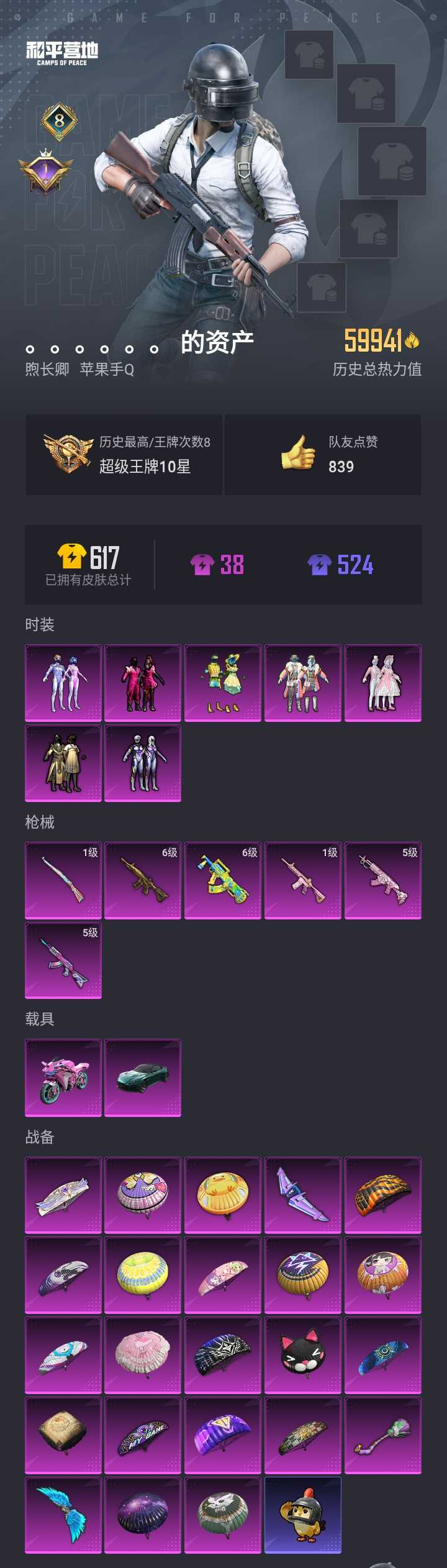 【和平精英】【lyhp18032】7粉装6特效呛2载具 梦幻火箭 香水柠檬 6级m4五爪金龙 m4心之恋语 5级akm炫紫旋律 5级m762甜蜜誓约 6级狗杂香水柠檬 阿斯顿.马丁 7粉装,6特效呛,2载具,历史最高段位:超级王牌10星 王牌印记8次 热力值:59941,134套装,160呛械,205装备,89战备;套装:套装-梦幻火箭,套装-金风玉露,套装-甜蜜誓约,套装-天启纪元,套装-幻彩马卡龙,套装-香水柠檬,套装-蝶舞蔷薇,套装-猎鹰,套装-青年教官,套装-黄色运动,套装-白色伏地魔,套装-登山爱好者,套装-冰川格斗者,套装-竞技名士,套装-黄色名流,套装-棕色飞行服,套装-游猎者,套装-长空猛禽,套装-竞技勇士朋克,套装-黎明保卫者,套装-蓝色守护者,套装-旭日情侣,套装-冷焰舞者,套装-特战装甲,套装-战地菁英,套装-贵族骑装,套装-街舞之王,套装-街舞达人,套装-青春校园,套装-黄色格斗者,套装-灰色格斗者,套装-甜蜜告白,套装-战地名士,套装-冰冻风暴,套装-海滨突袭者,套装-酷萌兔限定,套装-千禧之恋,套装-魅力单车,套装-坚韧舞者,套装-竞技达人朋克,套装-夜莺强袭者,套装-金羽特工,套装-都市魅力,套装-潮流炫酷,套装-沙漠兵团,套装-丛林猎人,套装-ss2特训,套装-雪山精英,套装-传奇侦探,套装-金耀舞者,套装-蓝调潮人,套装-机械哨兵,套装-装甲骑士,套装-缤纷果语,套装-冰川特警,套装-元素星魂,套装-ss4特训,套装-粉红小猪,套装-破蛋小黄鸡,套装-疯狂小兔子,套装-舞夜骑士,套装-深蓝冒险家,套装-迷域探索者,套装-机械征服者,套装-ss5特训,套装-北国孤狼,套装-ss6特训,套装-拳皇97草薙京,套装-炽焰拳师,套装-格斗专家,套装-星光纪元,套装-奇迹天团,套装-威严将相,套装-暗夜武装,套装-ss7特训,套装-黑色刀锋,套装-核芯基因,套装-精神漫游,套装-云丝凤蟒,套装-银河圣歌,套装-闪耀星光,套装-霓虹街区,套装-暗夜契约,套装-纯白誓言,套装-五号元素,套装-清香五月粽,套装-软嫩糖心蛋,套装-ss10特训,套装-ss8特训,套装-众神之王,套装-智慧之神,套装-软萌银虎,套装-萌黄之夏,套装-pel摇滚竞梦者,套装-深海来使,套装-夏日音浪,套装-ss9特训,套装-神秘舞者,套装-抹茶蜜豆,套装-安第斯皇冠,套装-牛气满满,套装-ss11特训,套装-原初圣火,套装-逆风勇士,套装-ss12特训,套装-牛气冲天,套装-闪金天王,套装-镭射皇者,套装-银白舞王,套装-治愈之星,套装-科技之星,套装-飞行日记,套装-ss13特训,套装-冰爽海盐,套装-浪漫樱花,套装-ss14特训,套装-ss17特训,套装-福星高照,套装-ss19特训,套装-ss20特训,套装-ss21特训,套装-ss22特训,套装-绯格组合,套装-ss23特训,套装-ss25特训,套装-香桃花海,套装-龙的传人,套装-ss26特训,套装-恋语绒绒,套装-ss29特训,角色-糖霜甜心,套装-ss31特训,套装-ss33特训,套装-ss32特训;呛皮:g36c-金风玉露,g36c-暗夜玫瑰,g36c-乌木金纹,6级m416-五爪金龙,1级m416-心之恋语,m416-夜灯,m416-蓝色火焰,m416-魔法学院,m416-潮汐统领,m416-乌木金纹,5级akm-炫紫旋律,akm-灼热熔岩,akm-生命誓言,akm-奇异狩猎者,akm-星之信仰,akm-霓虹街区,akm-夜灯,akm-彩虹符号,akm-龙的传人,akm-乌木金纹,scar-l-生命誓言,scar-l-黄金龙骨,scar-l-甜蜜誓约,scar-l-炫彩节奏,scar-l-玉兔迎春,scar-l-乌木金纹,5级m762-甜蜜誓约,m762-快乐主宰,m762-拳皇97,m762-牛气冲天,m762-镭射皇者,m762-彩虹符号,m762-天降萌叽,m762-乌木金纹,m16a4-生命誓言,m16a4-红色方程式,m16a4-快乐主宰,m16a4-九霄,m16a4-龙虾霸霸,ac-val-乌木金纹,ac-val-天降萌叽,6级groza-香水柠檬,groza-黑色刀锋,groza-治愈之星,groza-乌木金纹,q-原初圣火,q-彩虹符号,q-乌木金纹,aug-魔法学院,aug-pec最牛战神,aug-怪笑疯兔,aug-乌木金纹,mk47-乌木金纹,1级kar98k-巳巳如意,kar98k-红色方程式,kar98k-华贵君王,kar98k-梦幻火箭,kar98k-勇闯险境,kar98k-彩虹符号,kar98k-洛神天依,kar98k-蓝莓炮弹,kar98k-顶峰精英,kar98k-乌木金纹,win94-机械英豪,m24-奇异狩猎者,m24-众神之王,m24-治愈之星,m24-香水柠檬,m24-乌木金纹,awm-乌木金纹,莫辛纳甘-乌木金纹,m200-乌木金纹,amr-乌木金纹,mini14-生命誓言,mini14-金鼠迎春,mini14-梦幻火箭,mini14-原初圣火,mini14-炫彩节奏,mini14-阿狸红,mini14-涂山之恋,mini14-香桃花海,mini14-乌木金纹,vss-华贵君王,vss-黑色刀锋,vss-镭射皇者,vss-香桃花海,vss-乌木金纹,mk14-治愈之星,mk14-乌木金纹,slr-众神之王,slr-沙漠守护者,sks-勇闯险境,sks-乌木金纹,mk20-h-乌木金纹,uzi-生命誓言,uzi-影袭,uzi-古堡领主,uzi-魔法学院,uzi-金风玉露,uzi-众神之王,uzi-逆行者qq,uzi-炫彩节奏,mp5k-甜蜜誓约,mp5k-众神之王,mp5k-乌木金纹,野牛-机械英豪,野牛-乌木金纹,p90-乌木金纹,ump45-生命誓言,ump45-快乐主宰,ump45-乌木金纹,汤姆逊-奇异狩猎者,汤姆逊-勇闯险境,汤姆逊-天降萌叽,汤姆逊-乌木金纹,vect-黑色刀锋,vect-彩虹符号,vect-治愈之星,vect-香水柠檬,vect-乌木金纹,s12k-华贵君王,s12k-机械英豪,s12k-香水柠檬,s12k-玩趣呆呆,s12k-乌木金纹,s1897-天启纪元,s1897-勇闯险境,s1897-神秘黑猫,s1897-镭射皇者,s1897-炫彩节奏,spas-12-乌木金纹,s686-红色方程式,s686-魔法学院,s686-橘柚倾心,s686-乌木金纹,dp-28-原初圣火,dp-28-乌木金纹,mg3-幻世战舞者,mg3-乌木金纹,m249-拳皇97,m249-镭射皇者,m249-彩虹符号,m249-乌木金纹,p18c-龙虾霸霸,p18c-原初圣火,p92-拳皇97,平底锅-拳皇97,平底锅-黑色刀锋,平底锅-勇闯险境,平底锅-缤纷糖果,平底锅-众神之王,平底锅-炫紫旋律,平底锅-机械英豪,平底锅-原初圣火,平底锅-镭射皇者,平底锅-飞行日记,平底锅-治愈之星,撬