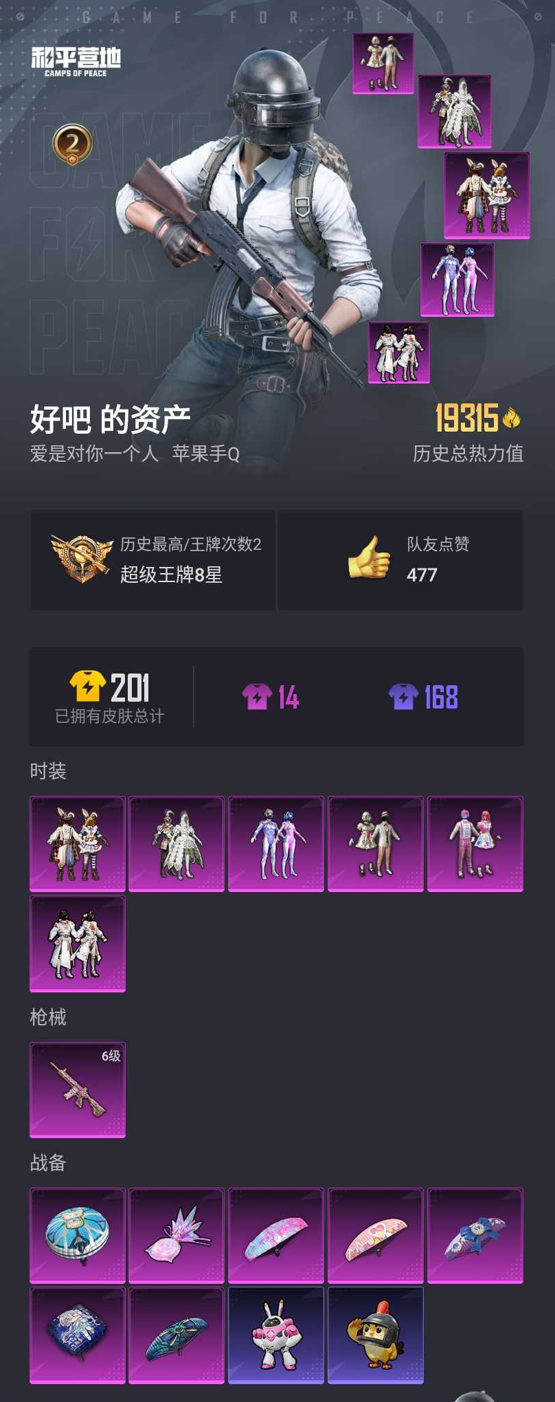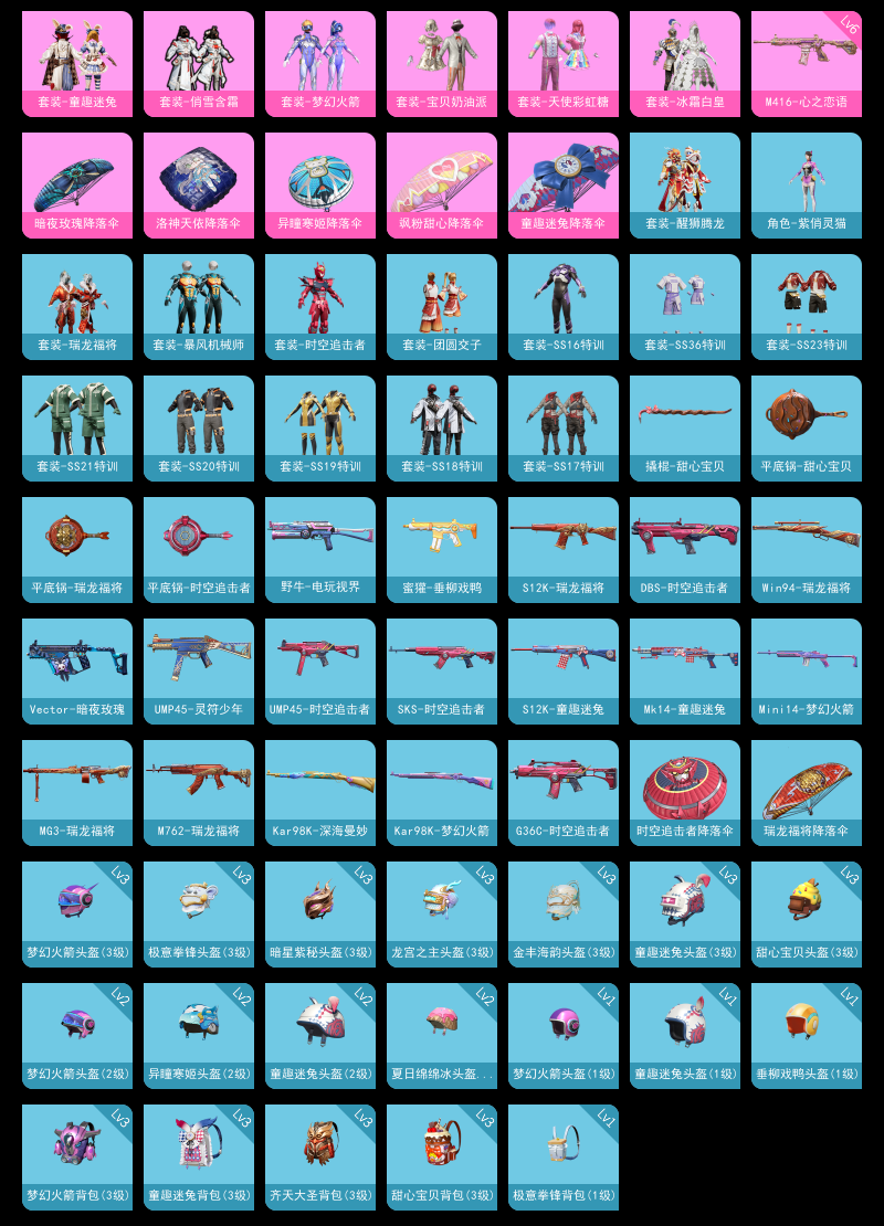【和平精英】【lyhp18023】6粉装1特效呛 梦幻火箭 童趣迷兔 6级m4心之恋语 6粉装,1特效呛,0载具,历史最高段位:超级王牌8星 王牌印记2次 热力值:19455,40套装,50呛械,70装备,30战备;套装:套装-宝贝奶油派,套装-天使彩虹糖,套装-梦幻火箭,套装-冰霜白皇,套装-童趣迷兔,套装-俏雪含霜,套装-黄色运动,套装-竞技名士,套装-长空猛禽,套装-冷焰舞者,套装-甜蜜告白,套装-滨海假日,套装-怒火燎原,套装-魅力单车,套装-热血青春,套装-幻世战舞者,套装-甜蜜熊情侣,套装-战术大师,套装-牛气冲天,套装-ss18特训,套装-ss16特训,套装-暴风机械师,套装-时空追击者,套装-ss17特训,套装-醒狮腾龙,套装-瑞龙福将,套装-团圆交子,套装-福星高照,套装-虎虎生威吉莉,套装-ss19特训,套装-ss20特训,套装-ss21特训,套装-玉兔迎春,套装-绯格组合,套装-ss23特训,套装-涂山之恋,套装-街头风暴,角色-紫俏灵猫,套装-炫彩糖果,套装-ss36特训;呛皮:aug-冰晶雪宝,ac-val-乌木金纹,akm-虎虎生威,akm-龙的传人,g36c-时空追击者,g36c-乌木金纹,蜜獾-垂柳戏鸭,mk47-乌木金纹,6级m416-心之恋语,m416-糯团青竹,scar-l-红色方程式,scar-l-玉兔迎春,m762-瑞龙福将,m762-天降萌叽,kar98k-梦幻火箭,kar98k-深海曼妙,kar98k-乌木金纹,win94-瑞龙福将,win94-乌木金纹,m24-乌木金纹,莫辛纳甘-乌木金纹,sks-夜灯,sks-时空追击者,mk14-童趣迷兔,mk14-乌木金纹,mini14-梦幻火箭,mk12-乌木金纹,vect-生命誓言,vect-暗夜玫瑰,uzi-炫彩节奏,uzi-炫彩糖果,p90-乌木金纹,野牛-电玩视界,野牛-乌木金纹,ump45-生命誓言,ump45-时空追击者,ump45-灵符少年,mp5k-乌木金纹,汤姆逊-天降萌叽,s1897-炫彩节奏,s12k-童趣迷兔,s12k-瑞龙福将,dbs-时空追击者,mg3-瑞龙福将,mg3-幻世战舞者,撬棍-甜心宝贝,平底锅-甜心宝贝,平底锅-时空追击者,平底锅-瑞龙福将,铝热弹-炫彩糖果;降落伞:炫彩糖果飞行器,登顶巅峰飞行器; 详情看图