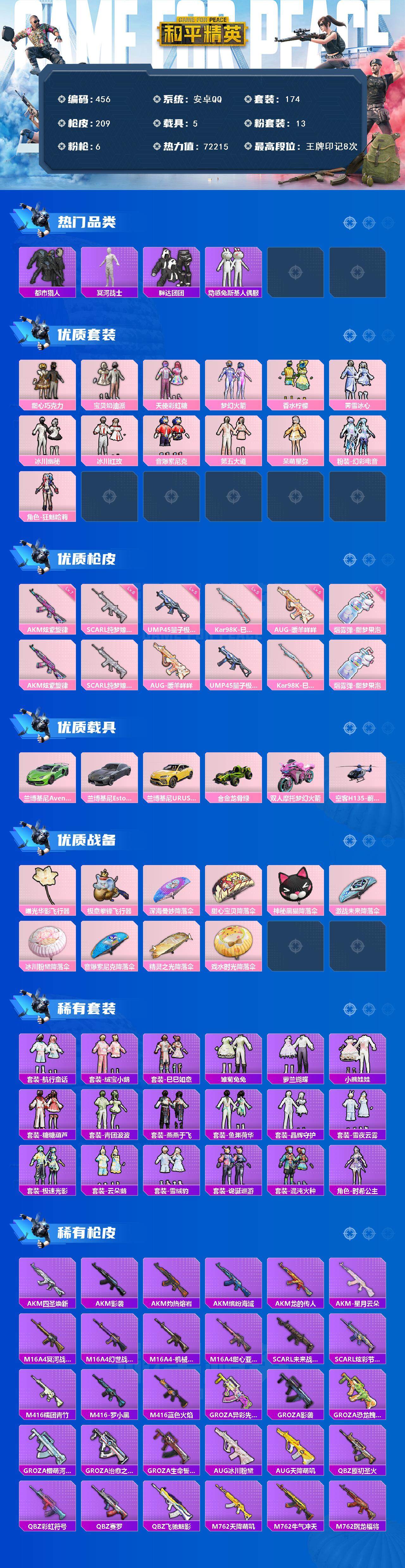 2312206手q-13粉装-6特效呛-5载具-3粉色飞行器-72215热力值-8王牌印记-174套装-209呛皮【满天赋】 【热门品类】:粉装-梦幻火箭,粉装-音爆索尼克,套装-浪漫天命,套装-都市猎人,套装-冥河战士,套装-深海小丑鱼,套装-胖达团团,套装-动感兔斯基人偶服,套装-龟仙人,套装-暗影哥特 【粉色套装】:粉装-甜心巧克力,粉装-宝贝奶油派,粉装-天使彩虹糖,粉装-梦幻火