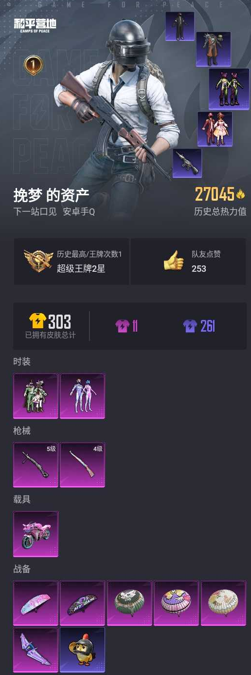 【和平精英】【lyhp18138】2粉2特效呛1载 梦幻火箭 火箭摩托 m4仓鼠灰灰 2粉装,2特效呛,1载具,历史最高段位:超级王牌2星 王牌印记1次 热力值:27046,77套装,70呛械,100装备,38战备;套装:套装-梦幻火箭,套装-精灵迷巫,套装-特训学院,套装-黄色运动,套装-蓝色运动,套装-黑色伏地魔,套装-骑行爱好者,套装-湖蓝色名流,套装-黄色名流,套装-猛禽,套装-竞技勇士朋克,套装-蓝色守护者,套装-灰色守护者,套装-冷焰舞者,套装-灼焰舞者,套装-特战装甲,套装-特殊使命,套装-青春校园,套装-灰色格斗者,套装-春日漫步,套装-潮流先锋,套装-龙腾端午,套装-燃烧卡路里,套装-完美偶像,套装-街头潮人,套装-蓝彩潮人,套装-魅力单车,套装-绮丽涂鸦,套装-耀眼新星,套装-竞技达人朋克,套装-朋克治安官,套装-野性战心,套装-野性战魂,套装-破晓战魂,套装-风行保卫者,套装-丛林猎人,套装-雪山精英,套装-传奇侦探,套装-半糖蓝莓,套装-机械哨兵,套装-甜蜜熊情侣,套装-疯狂小兔子,套装-迷域探索者,套装-圣诞大吉,套装-金鼠迎春,套装-北国孤狼,套装-ss6特训,套装-拳皇97草薙京,套装-炽焰拳师,套装-格斗专家,套装-星光纪元,套装-奇迹天团,套装-蔷薇魔法师,套装-云纹魔法士,套装-淡雅花蕊,套装-玲珑飞花,套装-暗夜武装,套装-ss7特训,套装-核芯基因,套装-精神漫游,套装-ss8特训,套装-牛气满满,套装-白糯汤圆,套装-娴静芝兰,套装-战术大师,套装-耀粉歌者,套装-ss14特训,套装-云魄琉璃,套装-旋风灵鼠,套装-ss31特训,套装-鱼渊荷华,套装-燕燕于飞,套装-ss33特训,套装-ss32特训,套装-顶瓜瓜,套装-ss34特训,套装-ss35特训;呛皮:groza-生命誓言,groza-春暖花开,groza-暗夜武装,groza-黑色刀锋,groza-马卡龙,groza-乌木金纹,m762-拳皇97,aug-魔法学院,aug-异域银装,aug-乌木金纹,akm-春暖花开,akm-乌木金纹,m416-魔法学院,m416-仓鼠灰灰,m416-乌木金纹,famas-乌木金纹,m16a4-魔法学院,scar-l-红色方程式,scar-l-炫彩节奏,win94-乌木金纹,4级kar98k-巳巳如意,kar98k-梦幻火箭,awm-乌木金纹,m200-乌木金纹,vss-黑色刀锋,mk14-薄荷星砂,sks-勇闯险境,sks-炫彩节奏,sks-乌木金纹,slr-四圣焕新,mini14-春暖花开,mini14-梦幻火箭,m417-玩趣呆呆,m417-幻影飞狐,vect-黑色刀锋,vect-彩虹符号,vect-燕燕于飞,vect-乌木金纹,uzi-魔法学院,uzi-炫彩糖果,野牛-燕燕于飞,ump45-春暖花开,ump45-天启纪元,汤姆逊-勇闯险境,汤姆逊-乌木金纹,aks-74u-鸡智如我,aks-74u-乌木金纹,s12k-乌木金纹,s686-红色方程式,s686-魔法学院,spas-12-燕燕于飞,s1897-春暖花开,s1897-勇闯险境,5级dp-28-豹影疾电,m249-拳皇97,m249-乌木金纹,mg3-幻世战舞者,pkm-啾咪啾咪,p92-拳皇97,蝎式手呛-燕燕于飞,r45-幻彩电音,平底锅-五爪金龙,平底锅-拳皇97,平底锅-黑色刀锋,平底锅-勇闯险境,撬棍-传奇侦探,大砍刀-黑金刀,铝热弹-炫彩糖果,十子怒-燕燕于飞,十子怒-异域银装;载具:双人摩托-梦幻火箭;降落伞:梦幻火箭飞行器,紫色滑翔尾迹; 详情看图