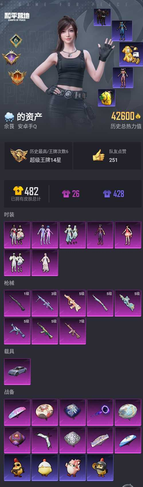 【和平精英】【lyhp18125】地铁满天赋 7粉8特效呛1载 觉醒螳螂 梦幻火箭 派对舞王 多呛型 满级m4心语 仰望轿车 7粉装,8特效呛,1载具,历史最高段位:超级王牌14星 王牌印记6次 热力值:42600,85套装,130呛械,171装备,78战备;套装:套装-梦幻火箭,套装-寒光使者,角色-歌者泠鸢,角色-烟云彩露,角色-初号机 觉醒ver.,套装-金丰海韵,套装-星穹咏叹调,套装-竞技名士,套装-雨林探路者,套装-冷焰舞者,套装-冰冻风暴,套装-千禧之恋,套装-派对舞王,套装-暗影哥特,套装-青涩时光,套装-缤纷果语,套装-龙魂突击队,套装-疯狂小兔子,套装-霓虹街区,套装-激萌罗小黑,套装-潮萌小黄鸭,套装-战术大师,套装-耀粉歌者,套装-曼妙人鱼,套装-热情海星,套装-纯真浪花,套装-天籁歌者,套装-吉莉礼服,套装-福星高照,套装-甜星爱神,套装-绯格组合,套装-华灯初上,套装-龟仙人,套装-ss25特训,套装-金戈铁马,套装-惊鸿侠骨,套装-锦衣飞扬,套装-诗意画廊,套装-香桃花海,套装-龙的传人,套装-冰河战士,套装-ss26特训,套装-空岛之星,套装-无暇誓言,套装-焰鹰斗篷,套装-幻羽潜行,套装-ss27特训,套装-老实芭蕉,套装-ss28特训,玩偶服-卖崽青蛙,角色-银尘,角色-8号机,角色-mark.06,套装-海盐绵绵冰,套装-蝶变,套装-湖畔霞光,套装-粉日山川,套装-雾都回忆,套装-小熊娃娃,套装-ss29特训,套装-雏菊兔兔,角色-狂花道·雅典娜,套装-萝兰蝴蝶,套装-异域银装,套装-星途旅人,角色-许七安,角色-俏兔智灵,套装-ss30特训,套装-青团波波,套装-糖糖葫芦,套装-纯白跃动,套装-ss31特训,套装-鱼渊荷华,套装-燕燕于飞,套装-紫幽梦,套装-粉恋花,套装-ss33特训,套装-巳巳如意,套装-ss32特训,套装-蓝冰羽,套装-顶瓜瓜,套装-大橘大利,套装-星渊小夜曲,套装-ss34特训,套装-ss35特训;呛皮:mk47-洛神天依,5级akm-绿萝繁花,akm-龙的传人,akm-霓彩节奏,5级aug-暖羊咩咩,aug-甜蜜菠萝,aug-耀粉歌者,aug-异域银装,scar-l-炫彩节奏,scar-l-玉兔迎春,scar-l-星途旅人,scar-l-海盐豹豹,蜜獾-天降萌叽,蜜獾-精灵梦叶罗丽,蜜獾-糖糖葫芦,蜜獾-乌木金纹,m16a4-莲影清波,m16a4-冰河战士,groza-绯红回忆,groza-海盐豹豹,m762-雏菊兔兔,ac-val-宇宙意志,q-洛神天依,q-纯真浪花,7级m416-心之恋语,famas-乌木金纹,m200-惊鸿侠骨,m200-宇宙意志,m200-乌木金纹,amr-乌木金纹,5级kar98k-巳巳如意,kar98k-梦幻火箭,kar98k-彩虹符号,kar98k-洛神天依,kar98k-顶峰精英,win94-乌木金纹,m24-拂晓神骑,awm-焰鹰斗篷,awm-纯真浪花,vss-香桃花海,mini14-梦幻火箭,mini14-香桃花海,mini14-雏菊兔兔,slr-金丰海韵,mk20-h-星途旅人,mk20-h-糖糖葫芦,mk20-h-乌木金纹,mk14-冰河战士,mk14-紫幽梦,m417-惊鸿侠骨,5级ump45-量子极限,ump45-海盐豹豹,ump45-糖糖葫芦,汤姆逊-天降萌叽,汤姆逊-纯真浪花,汤姆逊-智耀战神,vect-彩虹符号,vect-焰鹰斗篷,vect-燕燕于飞,mp5k-怪笑疯兔,mp5k-乌木金纹,5级p90-金丰海韵,p90-倾城蜜语,p90-玩趣呆呆,p90-乌木金纹,野牛-雏菊兔兔,野牛-燕燕于飞,uzi-天降萌叽,uzi-冰河战士,uzi-啾咪啾咪,uzi-炫彩糖果,aks-74u-乌木金纹,dbs-歌者泠鸢,dbs-彩虹符号,dbs-焰鹰斗篷,dbs-幻彩电音,dbs-月影灵韵,dbs-乌木金纹,s1897-炫彩节奏,s1897-紫幽梦,s1897-糯团青竹,spas-12-燕燕于飞,spas-12-乌木金纹,s12k-玩趣呆呆,s686-生命誓言,s686-彩虹符号,s686-白勺歌姬,aa12-g-纯真浪花,1级dp-28-豹影疾电,dp-28-彩虹符号,dp-28-焰鹰斗篷,m249-彩虹符号,m249-糯团青竹,m249-莲影清波,m249-金丰海韵,pkm-紫幽梦,mg3-惊鸿侠骨,mg3-霓彩脉冲,3级mg-36-幻彩电音,p18c-糖糖葫芦,r1895-雏菊兔兔,蝎式手呛-金丰海韵,蝎式手呛-燕燕于飞,tmp-9-江南烟雨,tmp-9-霓彩节奏,p92-紫幽梦,r45-幻彩电音,短管霰弹-宇宙意志,短管霰弹-竹节火铳,信号呛-异瞳寒姬,平底锅-惊鸿侠骨,平底锅-空岛之星,平底锅-焰鹰斗篷,平底锅-纯真浪花,平底锅-雏菊兔兔,平底锅-糖糖葫芦,平底锅-紫幽梦,平底锅-属我最6,撬棍-齐天大圣,撬棍-冷漠罗丽,突击盾牌-初号机 觉醒ver.,破片手留单-呆爆全场,破片手留单-星途旅人,破片手留单-海盐豹豹,盐雾蛋-鸢尾晶梦,盐雾蛋-冰氧夏日,十子怒-燕燕于飞,十子怒-异域银装,燃烧瓶-甜梦桃焰,爆炸猎弓-惊鸿侠骨;载具:仰望u7阿盖尔紫;降落伞:天之羽翼飞行器,深渊漩涡飞行器,空岛之星尾迹,异域银装飞行器,顶峰精英尾迹; 详情看图