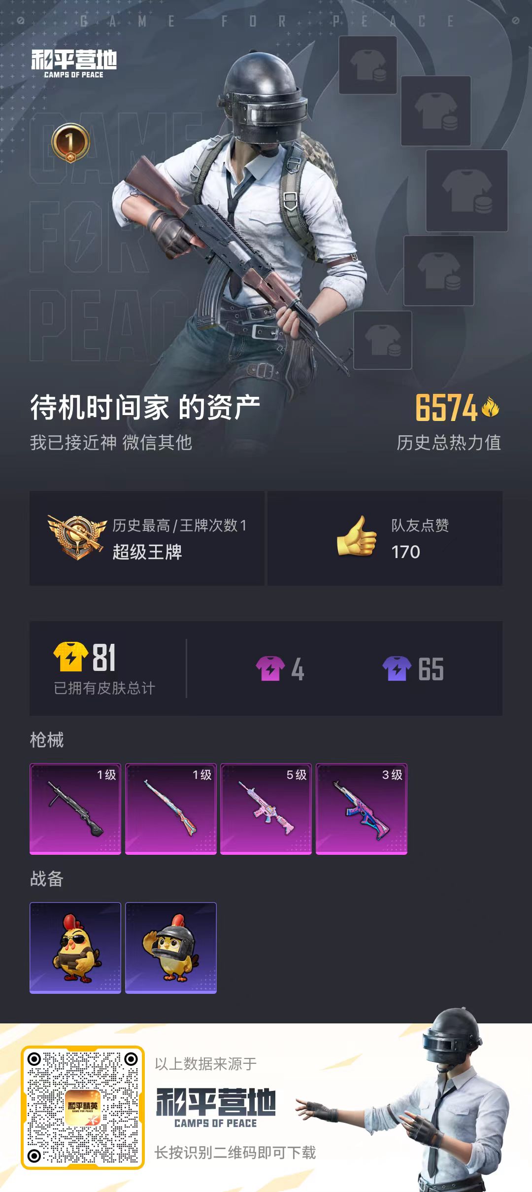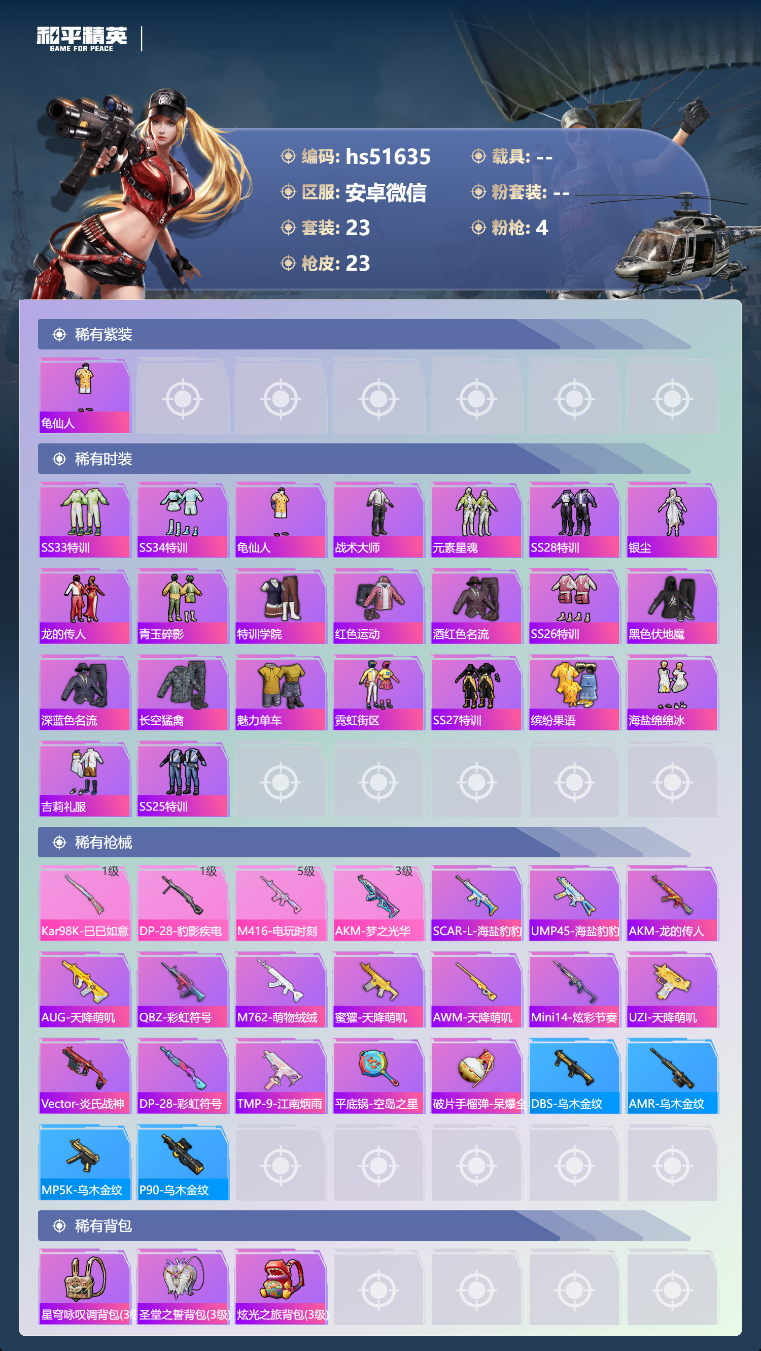 2282643安卓微信-1王牌印记-4特效呛-6574热力值-23套装-23呛皮 【4特效呛】m416-电玩时刻/5级dp-28-豹影疾电/1级akm-梦之光华/3级kar98k-巳巳如意/1级 【1稀有紫装】龟仙人 【23稀有时装】ss33特训ss34特训龟仙人战术大师元素星魂ss28特训银尘龙的传人青玉碎影特训学院红色运动酒红色名流ss26特训黑色伏地