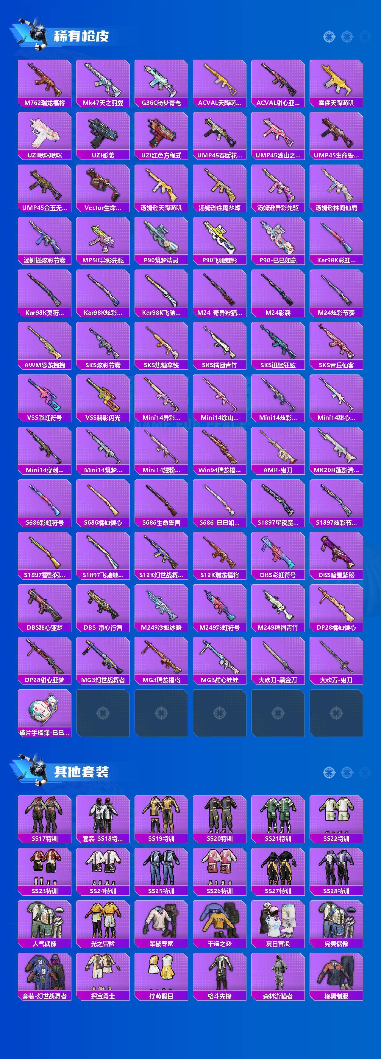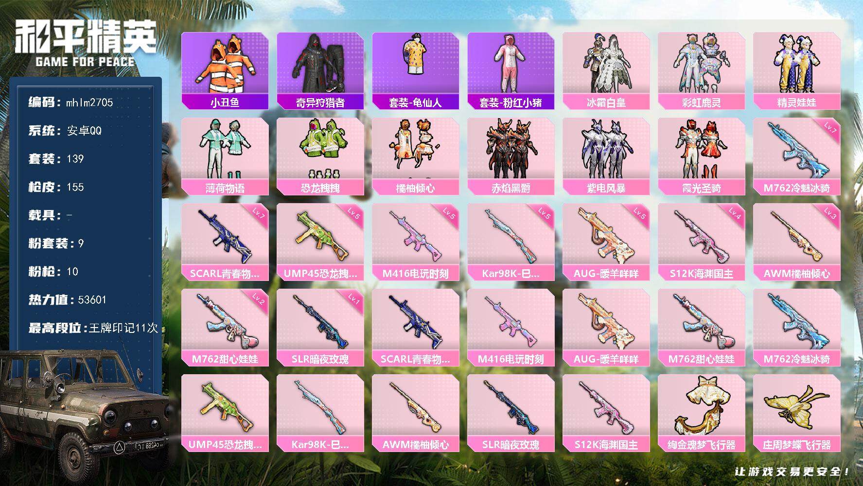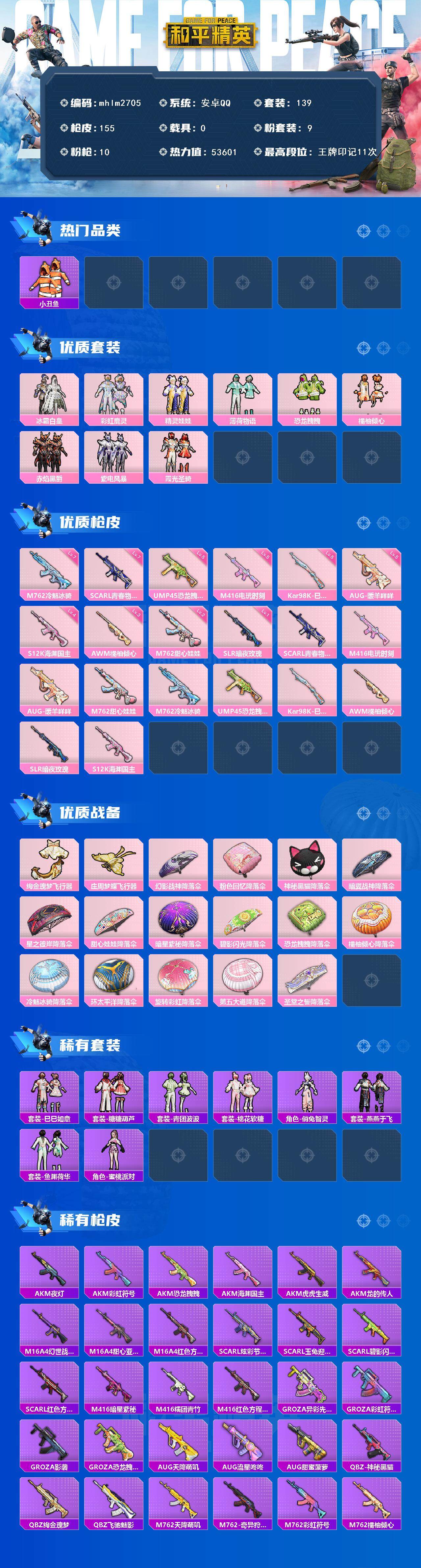 [14722069]【mhlm2705】安卓 手q-9粉装-10特效呛-0载具-2粉色飞行器-53601热力值-11王牌印记-139套装-155呛皮 【热门品类】:套装-小丑鱼,套装-奇异狩猎者,套装-龟仙人,套装-粉红小猪 【粉色套装】:粉装-冰霜白皇,粉装-彩虹鹿灵,粉装-精灵娃娃,粉装-薄荷物语,粉装-恐龙拽拽,粉装-橘柚倾心,粉装-赤焰黑爵,粉装-紫电风暴,粉装-霞光圣骑 【粉色呛皮等级】:scar-l-青春物语七级,m416-电玩时刻五级,aug-暖羊咩咩五级,m762-甜心娃娃二级,m762-冷魅冰骑七级,ump45-恐龙拽拽五级,kar98k-巳巳如意五级,awm-橘柚倾心三级,slr-暗夜玫瑰一级,s12k-海渊国主四级 【粉色呛皮】:scar-l-青春物语,m416-电玩时刻,aug-暖羊咩咩,m762-甜心娃娃,m762-冷魅冰骑,ump45-恐龙拽拽,kar98k-巳巳如意,awm-橘柚倾心,slr-暗夜玫瑰,s12k-海渊国主 【粉色飞行器】:绚金瑰梦飞行器,庄周梦蝶飞行器 【粉色降落伞】:幻影战神降落伞,粉色回忆降落伞,神秘黑猫降落伞,暗翼战神降落伞,星之彼岸降落伞,甜心娃娃降落伞,暗星紫秘降落伞,碧影闪光降落伞,恐龙拽拽降落伞,橘柚倾心降落伞,冷魅冰骑降落伞,环太平洋降落伞,旋转彩虹降落伞,第五大道降落伞,圣堂之誓降落伞 【稀有套装】:套装-龟仙人,套装-巳巳如意,套装-糖糖葫芦,套装-青团波波,套装-棉花软糖,角色-俏兔智灵,套装-燕燕于飞,套装-鱼渊荷华,角色-蜜桃派对 【稀有呛皮】:akm-夜灯,akm-彩虹符号,akm-恐龙拽拽,akm-海渊国主,akm-虎虎生威,akm-龙的传人,m16a4-幻世战舞者,m16a4-甜心亚梦,m16a4-红色方程式,scar-l-炫彩节奏,scar-l-玉兔迎春,scar-l-碧影闪光,scar-l-红色方程式,m416-暗星紫秘,m416-糯团青竹,m416-红色方程式,groza-异彩先驱,groza-彩虹符号,groza-影袭,groza-恐龙拽拽,aug-天降萌叽,aug-流星咚咚,aug-甜蜜菠萝,q-神秘黑猫,q-绚金瑰梦,q-飞驰魅影,m762-天降萌叽,m762-奇异狩猎者,m762-彩虹符号,m762-橘柚倾心,m762-瑞龙福将,mk47-天
