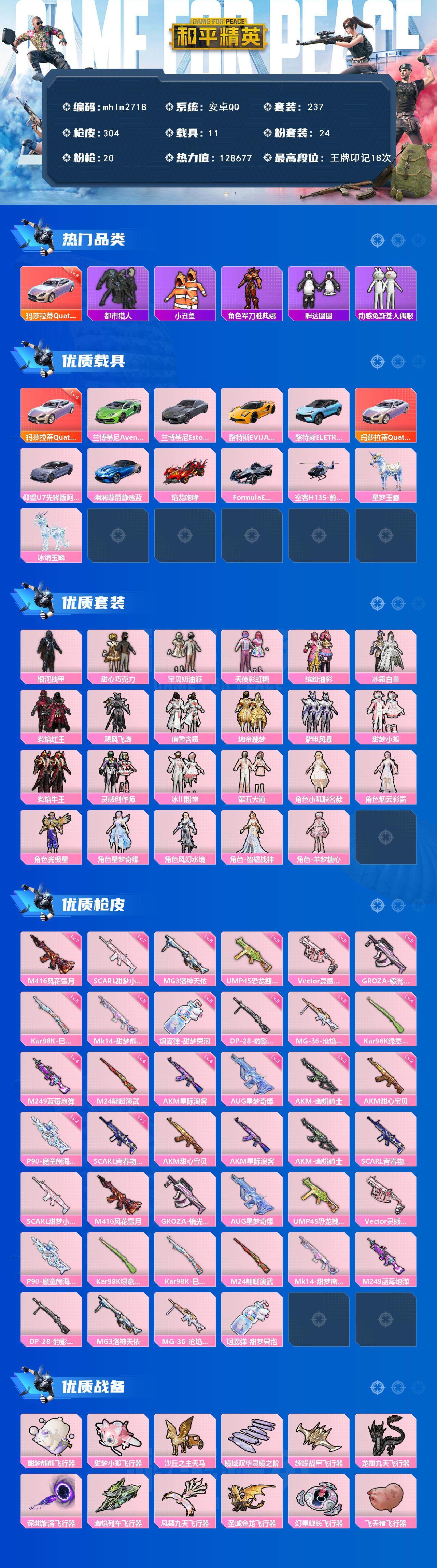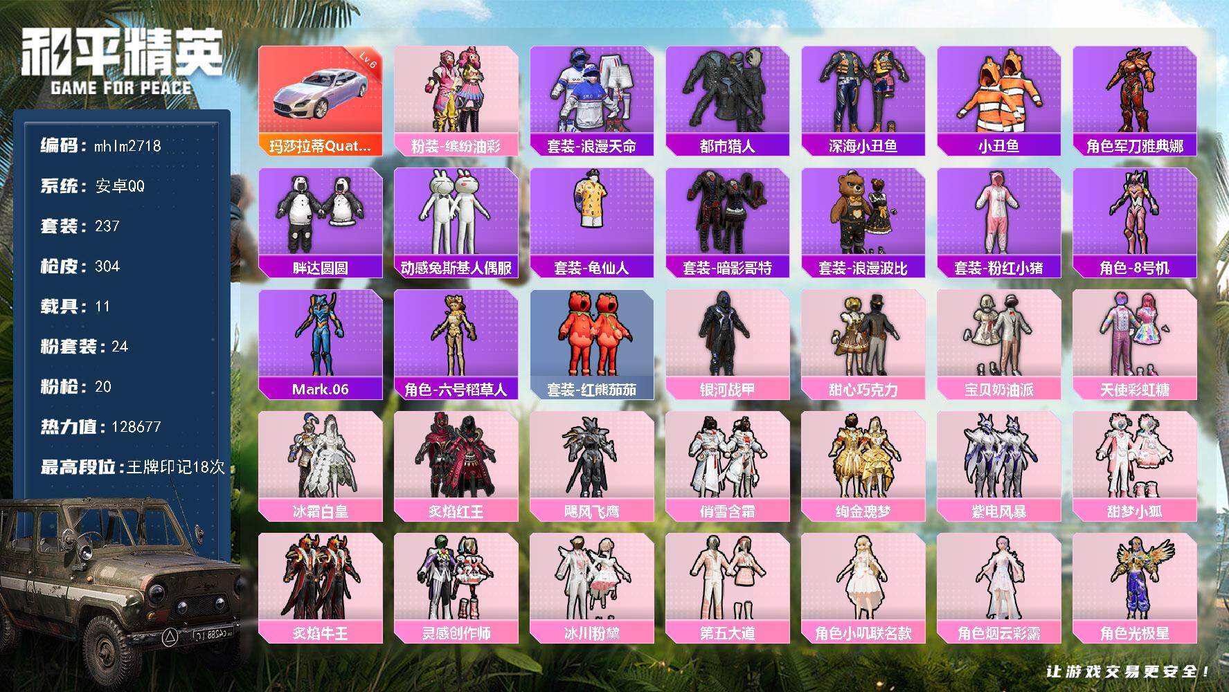 [14722237]【mhlm2718】安卓 手q-24粉装-20特效呛-11载具-14粉色飞行器-128677热力值-18王牌印记-237套装-304呛皮 【红色载具】:玛莎拉蒂quattropte(幻星粉)六级 【热门品类】:粉装-缤纷油彩,套装-浪漫天命,套装-都市猎人,套装-深海小丑鱼,套装-小丑鱼,角色-军刀雅典娜,套装-胖达圆圆,套装-动感兔斯基人偶服,套装-龟仙人,套装-暗影哥特,套装-浪漫波比,套装-粉红小猪,角色-8号机,角色-mark.06,角色-六号稻草人,套装-红熊茄茄 【粉色套装】:粉装-银河战甲,粉装-甜心巧克力,粉装-宝贝奶油派,粉装-天使彩虹糖,粉装-缤纷油彩,粉装-冰霜白皇,粉装-炙焰红王,粉装-飓风飞鹰,粉装-俏雪含霜,粉装-绚金瑰梦,粉装-紫电风暴,粉装-甜梦小狐,粉装-炙焰牛王,粉装-灵感创作师,粉装-冰川粉黛,粉装-第五大道,角色-小叽联名款,角色-烟云彩露,角色-光极星,角色-星梦奇缘,角色-风幻水境,角色-智耀战神,角色-羊梦糖心 【粉色呛皮等级】:akm-甜心宝贝二级,akm-星际浪客四级,akm-幽焰骑士三级,scar-l-青春物语一级,scar-l-甜梦小狐七级,m416-风花雪月七级,groza-镜光银凌五级,aug-星梦奇缘三级,ump45-恐龙拽拽五级,vect-灵感创作师五级,p90-魔童闹海 敖丙二级,kar98k-绿意幻情四级,kar98k-巳巳如意五级,m24-翩跹演武四级,mk14-甜梦熊击五级,m249-蓝莓炮弹四级,dp-28-豹影疾电五级,mg3-洛神天依六级,mg-36-沧焰双生五级,盐雾蛋-甜梦果泡五级 【粉色载具】:兰博基尼aventad svj(翡翠绿),兰博基尼estoque(银翼灰),路特斯evija(星际黄),路特斯eletre(冰川蓝),玛莎拉蒂quattropte(幻星粉),仰望u7(阿盖尔紫),幽澜尊爵(静谧蓝),焰龙咆哮,fmula e gen2(幽光蓝),空客h135-蔚蓝之翼,星梦玉骢,冰绡玉鳞 【粉色呛皮】:akm-甜心宝贝,akm-星际浪客,akm-幽焰骑士,scar-l-青春物语,scar-l-甜梦小狐,m416-风花雪月,groza-镜光银凌,aug-星梦奇缘,ump45-恐