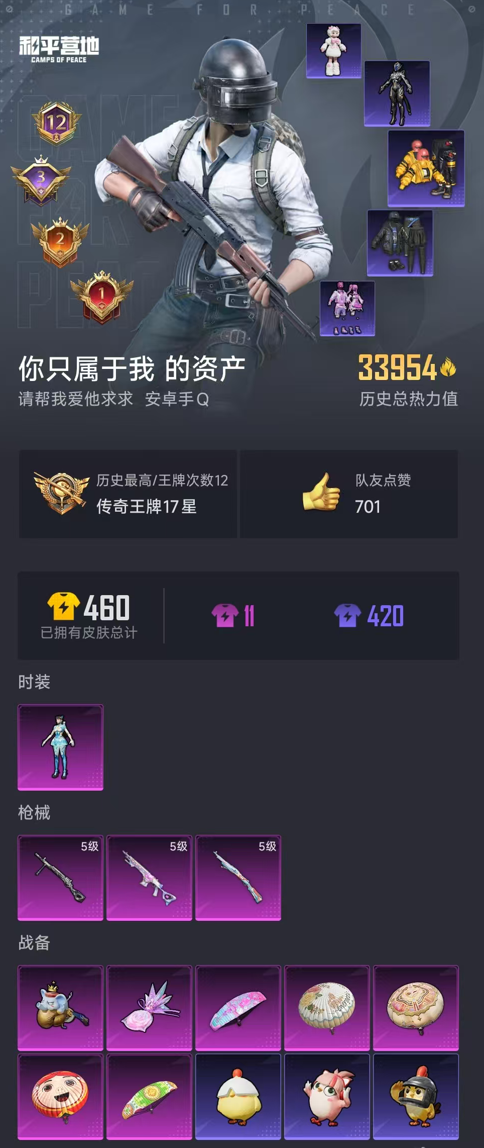 【和平精英】【lyhp18198】2传奇1绝世印记1粉装3特效呛 金曜舞者 无面战甲 满级妹控可打地铁 1粉装,3特效呛,0载具,历史最高段位:传奇王牌17星 王牌印记12次 热力值:33954,108套装,120呛械,134装备,84战备;套装:角色-异瞳寒姬,套装-特训学院,套装-猎鹰,套装-青年教官,套装-橘黑制服,套装-红色运动,套装-黄色运动,套装-蓝色运动,套装-黄色伏地魔,套装-白色伏地魔,套装-黑色伏地魔,套装-骑行爱好者,套装-竞技名士,套装-深蓝色名流,套装-酒红色名流,套装-湖蓝色名流,套装-黄色名流,套装-猛禽,套装-长空猛禽,套装-海岛探路者,套装-旭日情侣,套装-冷焰舞者,套装-灼焰舞者,套装-浪漫假日,套装-战地督导,套装-甜蜜告白,套装-春日漫步,套装-燃烧卡路里,套装-暗黑骑手,套装-完美偶像,套装-人气偶像,套装-幻影武者,套装-街头潮人,套装-暗金炫舞,套装-蓝彩潮人,套装-魅力单车,套装-绮丽涂鸦,套装-竞技达人朋克,套装-破晓战魂,套装-都市魅力,套装-幻世战舞者,套装-金耀舞者,套装-青涩时光,套装-缤纷果语,套装-龙魂突击队,套装-元素星魂,套装-极速红龙,套装-破蛋小黄鸡,套装-霓虹街区,套装-白熊同盟,套装-夏日音浪,套装-牛气满满,套装-战术大师,套装-ss18特训,套装-耀粉歌者,套装-飞行日记,套装-天籁歌者,套装-吉莉礼服,套装-ss19特训,套装-飞驰魅影,套装-音速流光,套装-炫蓝之夏,套装-ss20特训,套装-ss21特训,套装-玉兔迎春,套装-ss22特训,套装-光之冒险,套装-ss23特训,套装-王牌教练,套装-柠萌假日,套装-青玉碎影,套装-龟仙人,套装-ss25特训,套装-香桃花海,套装-龙的传人,套装-冰河战士,套装-ss26特训,套装-快闪甜心,套装-春光漫游,套装-漫游都市,套装-空岛之星,套装-ss27特训,套装-恋语绒绒,套装-老实芭蕉,套装-ss28特训,套装-街头风暴,套装-海盐绵绵冰,套装-粉日山川,角色-无面战甲,套装-异域银装,套装-星途旅人,套装-ss30特训,套装-ss31特训,套装-智谋强哥,套装-ss33特训,套装-巳巳如意,套装-ss32特训,套装-顶瓜瓜,套装-大橘大利,套装-炫彩糖果,套装-星影赞美诗,玩偶服-美羊羊,套装-元气之梦,套装-ss34特训,套装-游乐,套装-薄荷星砂,套装-ss35特训,套装-萌鸡速递;呛皮:aug-耀粉歌者,aug-天降萌叽,aug-异域银装,aug-冰晶雪宝,aug-紫晶流影,akm-破晓战魂,akm-霓虹街区,akm-涂鸦街区,akm-龙的传人,akm-霓彩脉冲,m416-蓝色火焰,m416-红色方程式,m416-绿洲时空,scar-l-红色方程式,scar-l-夜灯,scar-l-炫彩节奏,scar-l-玉兔迎春,scar-l-星途旅人,scar-l-海盐豹豹,m762-彩虹符号,m762-天降萌叽,famas-霓彩脉冲,famas-乌木金纹,蜜獾-天降萌叽,蜜獾-鸡智如我,蜜獾-乌木金纹,groza-无面战甲,mk47-乌木金纹,ac-val-快闪甜心,q-彩虹符号,q-飞驰魅影,m16a4-蓝色火焰,m16a4-红色方程式,m16a4-冰河战士,5级kar98k-巳巳如意,kar98k-红色方程式,kar98k-彩虹符号,kar98k-炫彩节奏,kar98k-飞驰魅影,kar98k-顶峰精英,win94-乌木金纹,amr-鸡智如我,amr-乌木金纹,awm-恐龙拽拽,awm-天降萌叽,m24-乌木金纹,m200-乌木金纹,mini14-耀粉歌者,mini14-香桃花海,mini14-鸡智如我,mk20-h-快闪甜心,mk20-h-星途旅人,mk20-h-狂鲨锋刃,mk20-h-乌木金纹,vss-香桃花海,5级mk14-甜梦熊击,mk14-乌木金纹,mk14-冰河战士,mk14-薄荷星砂,mk14-紫晶流影,slr-霓彩脉冲,m417-玩趣呆呆,p90-飞驰魅影,p90-快闪甜心,p90-玩趣呆呆,p90-巳巳如意,p90-乌木金纹,vect-生命誓言,野牛-乌木金纹,aks-74u-鸡智如我,aks-74u-乌木金纹,汤姆逊-耀粉歌者,汤姆逊-炫彩节奏,汤姆逊-天降萌叽,uzi-红色方程式,uzi-天降萌叽,uzi-冰河战士,uzi-啾咪啾咪,uzi-炫彩糖果,ump45-夜灯,ump45-蓝色火焰,ump45-春暖花开,ump45-海盐豹豹,ump45-绿洲时空,mp5k-乌木金纹,s12k-破晓战魂,s12k-夜灯,s12k-玩趣呆呆,s12k-霓彩脉冲,s1897-炫彩节奏,s1897-飞驰魅影,s1897-精灵梦叶罗丽,s686-红色方程式,s686-彩虹符号,s686-巳巳如意,dbs-乌木金纹,spas-12-乌木金纹,m249-破晓战魂,m249-彩虹符号,m249-糯团青竹,m249-无面战甲,5级dp-28-豹影疾电,pkm-啾咪啾咪,mg3-乌木金纹,r45-幻彩电音,沙墨之鹦-旋转彩虹,沙墨之鹦-快闪甜心,电击呛-喜羊羊与灰太狼,p1911-无面战甲,平底锅-飞驰魅影,平底锅-快闪甜心,平底锅-属我最6,破片手留单-呆爆全场,破片手留单-星途旅人,破片手留单-拽到爆炸,破片手留单-巳巳如意,盐雾蛋-冰氧夏日,十子怒-异瞳寒姬,十子怒-异域银装,铝热弹-炫彩糖果;降落伞:炫彩糖果飞行器,极意拳锋飞行器,空岛之星尾迹,冰柠泡泡飞行器,异域银装飞行器,顶峰精英尾迹,鸡智如我飞行器; 详情看图