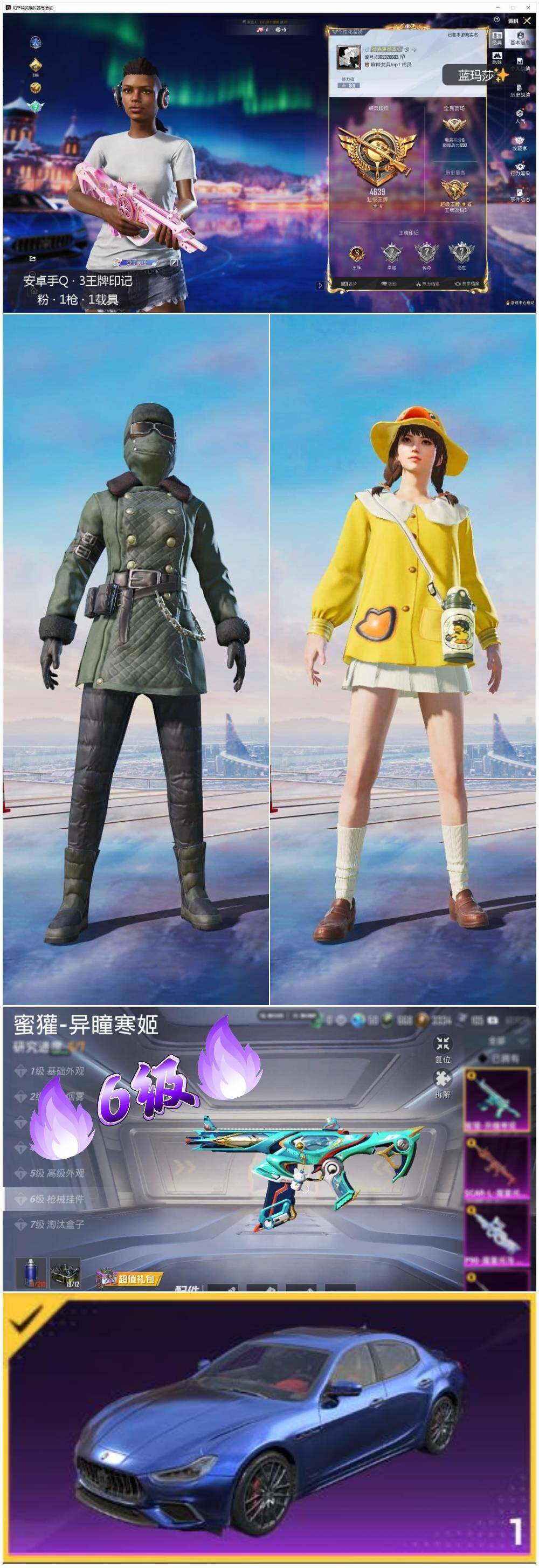 可二次【店主推荐捡漏号!可直接换绑】 安卓 手q-1特效呛-1载具-2粉色飞行器-2.4w热力值-3王牌印记-55套装-79呛皮【热门品类】:套装-潮萌小黄鸭【粉色呛皮等级】:蜜獾-异瞳寒姬六级【粉色载具】:玛莎拉蒂ghibli(蓝)【粉色飞行器】:春暖花开飞行器