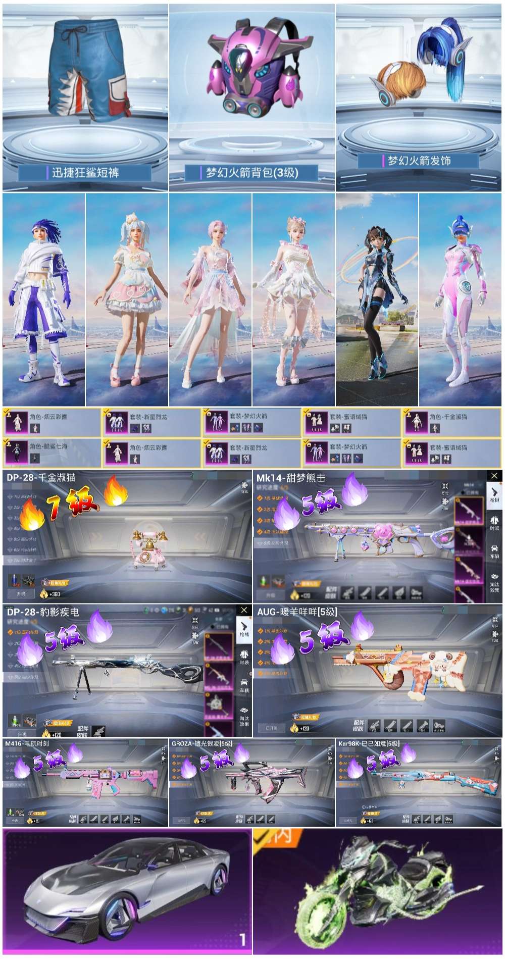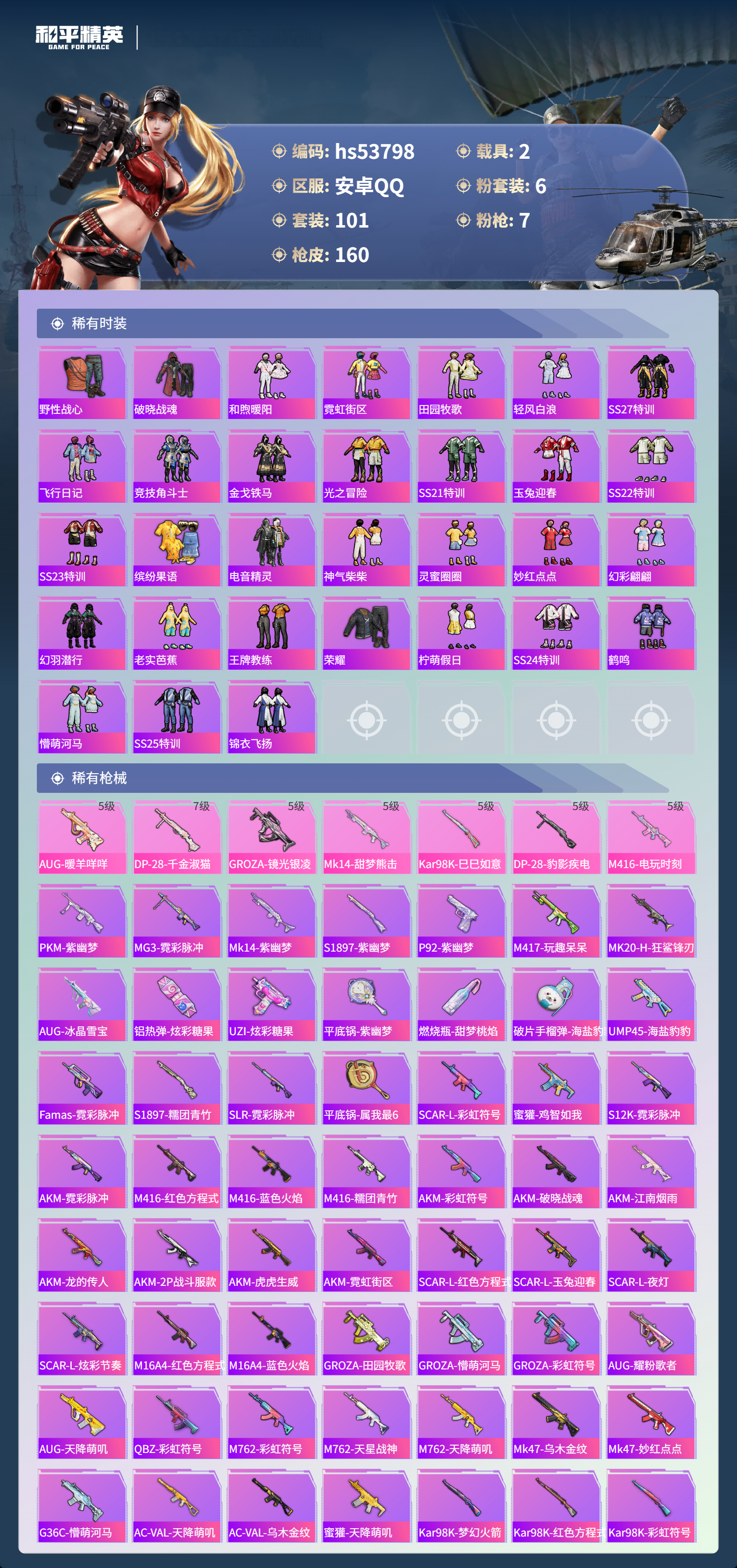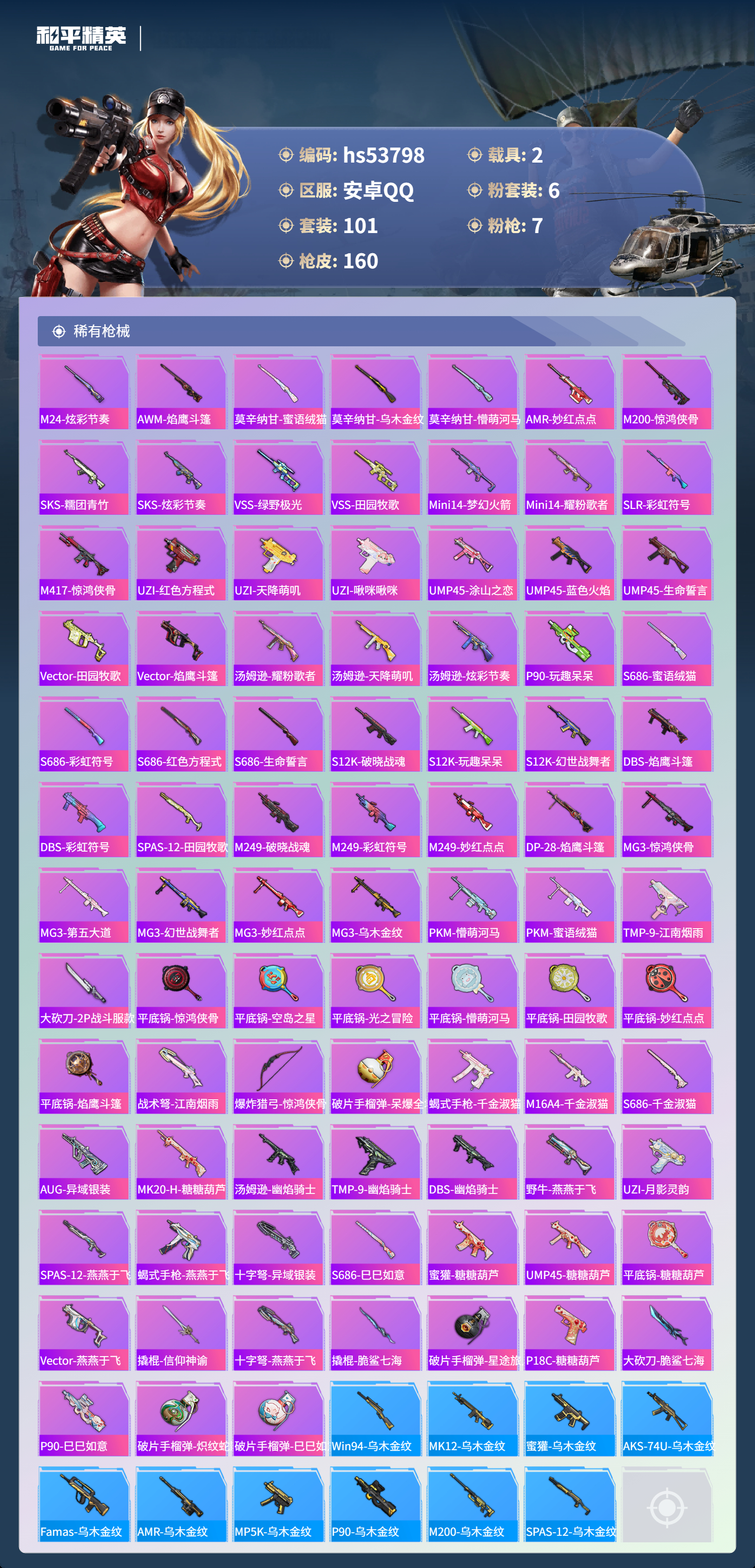 hs53798 安卓手q-11王牌印记-6粉装-7特效呛-2载具-49130热力值-101套装-160呛皮-1卓越印记【6粉装】套装-梦幻火箭角色-千金淑猫角色-脆鲨七海套装-新星烈龙角色-烟云彩露套装-蜜语绒猫【7特效呛】aug-暖羊咩咩/5级dp-28-千金淑猫/7级m416-电玩时刻/5级kar98k-巳巳如意/5级mk14-甜梦熊击/5级dp-28-豹影疾电/5级
