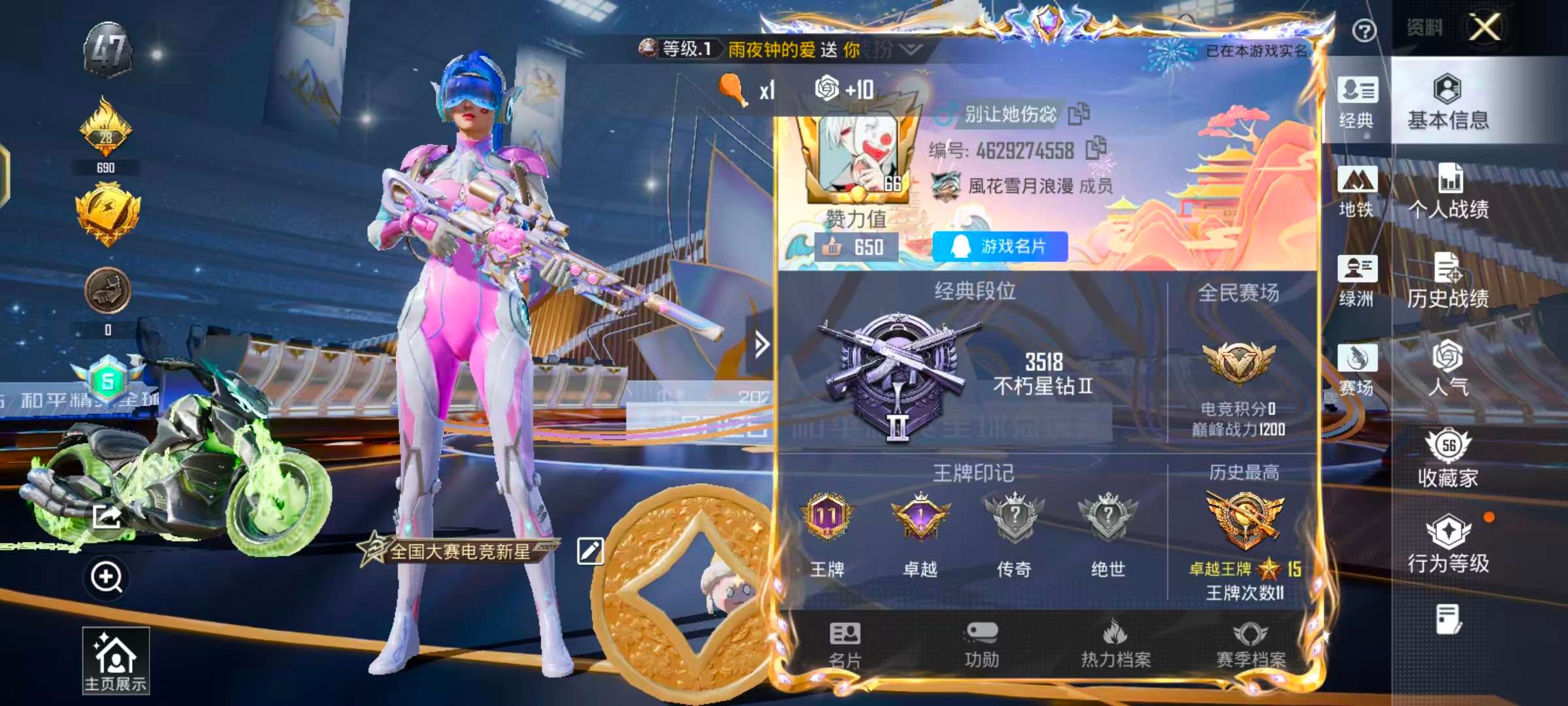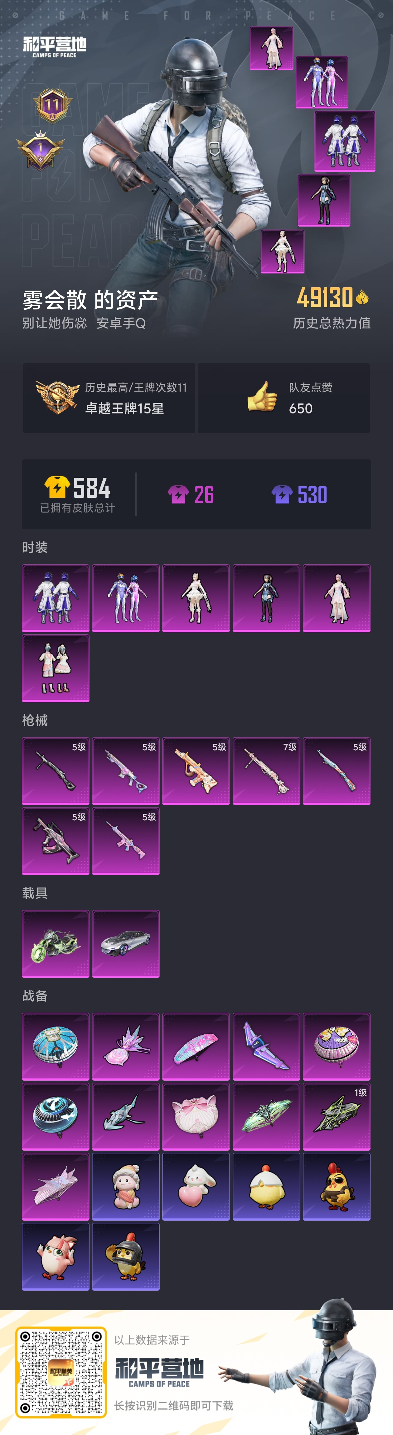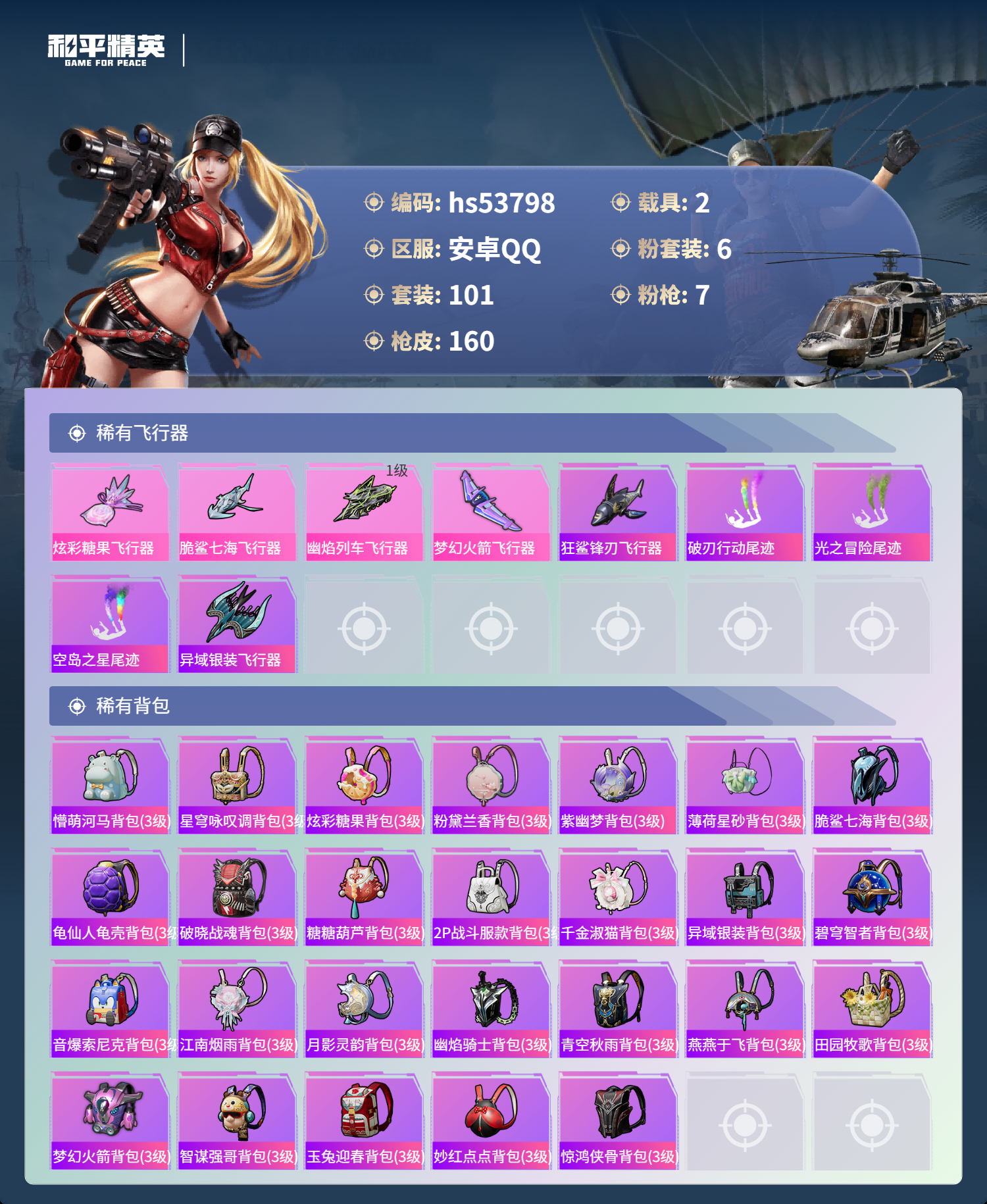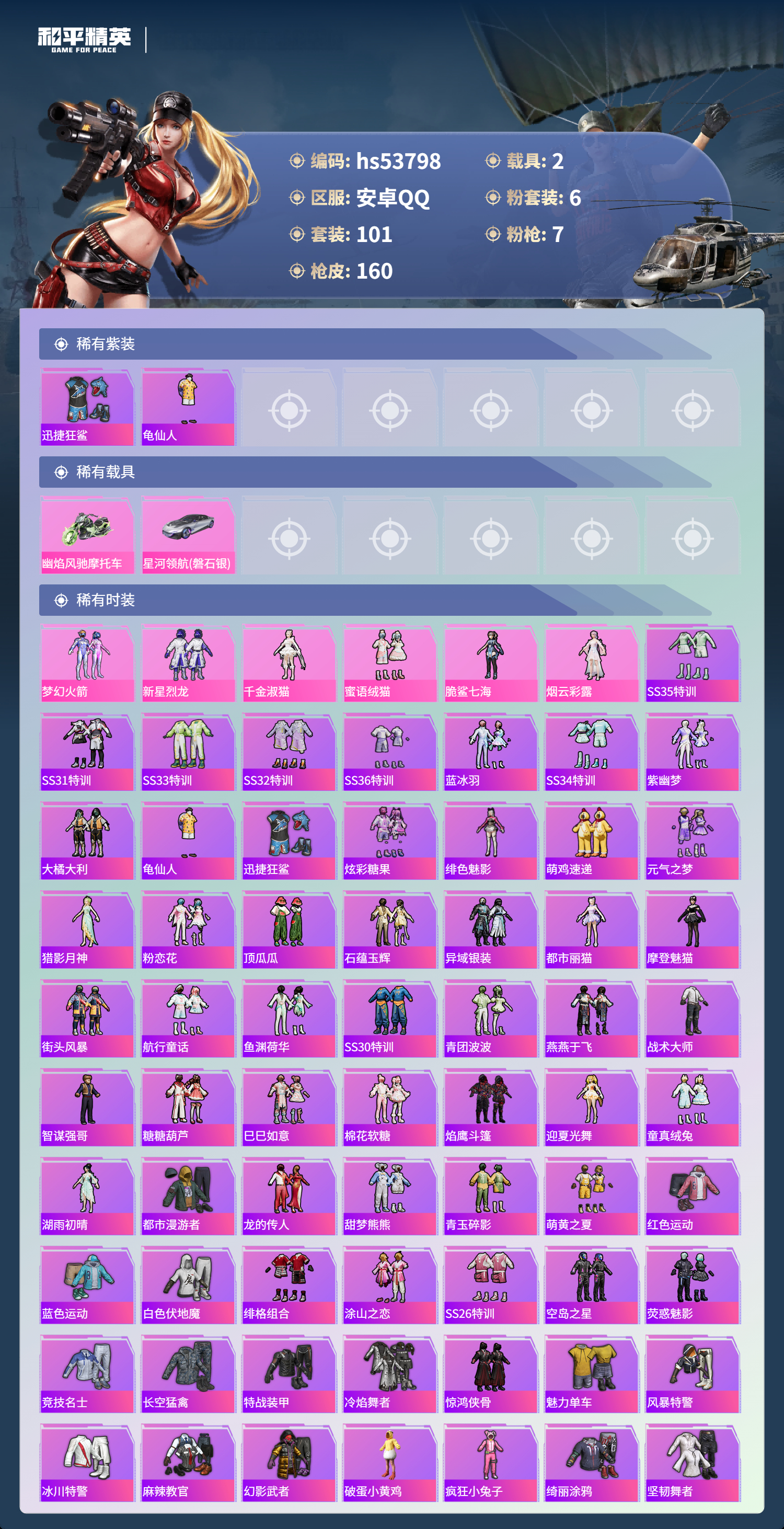 hs53798 安卓手q-11王牌印记-6粉装-7特效呛-2载具-49130热力值-101套装-160呛皮-1卓越印记【6粉装】套装-梦幻火箭角色-千金淑猫角色-脆鲨七海套装-新星烈龙角色-烟云彩露套装-蜜语绒猫【7特效呛】aug-暖羊咩咩/5级dp-28-千金淑猫/7级m416-电玩时刻/5级kar98k-巳巳如意/5级mk14-甜梦熊击/5级dp-28-豹影疾电/5级