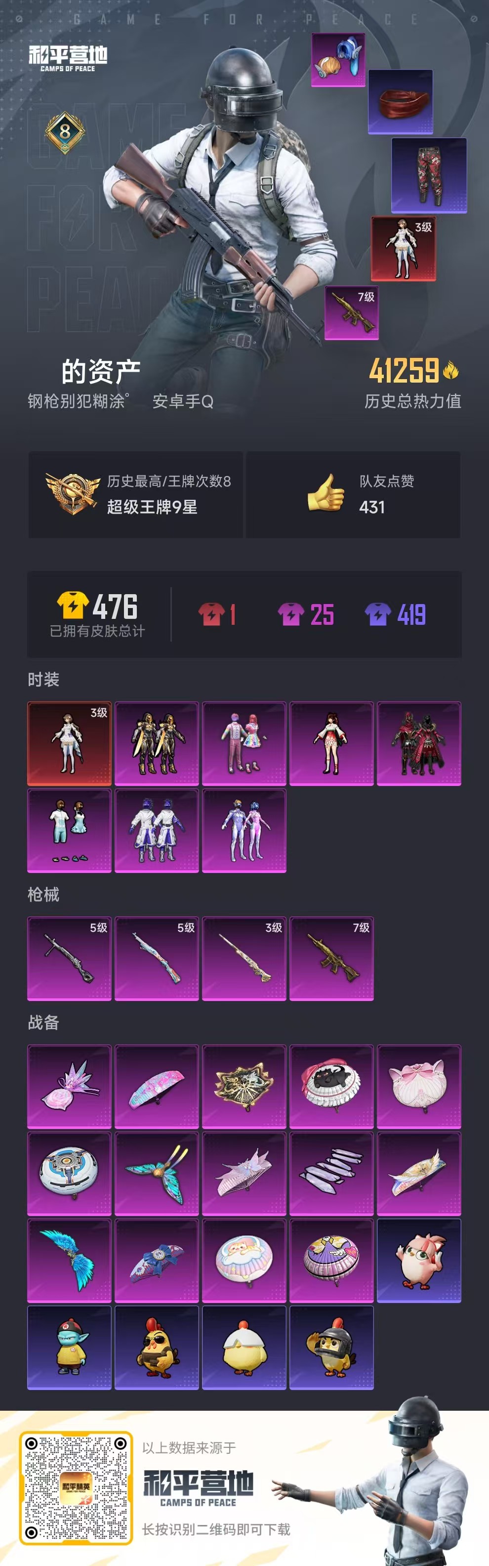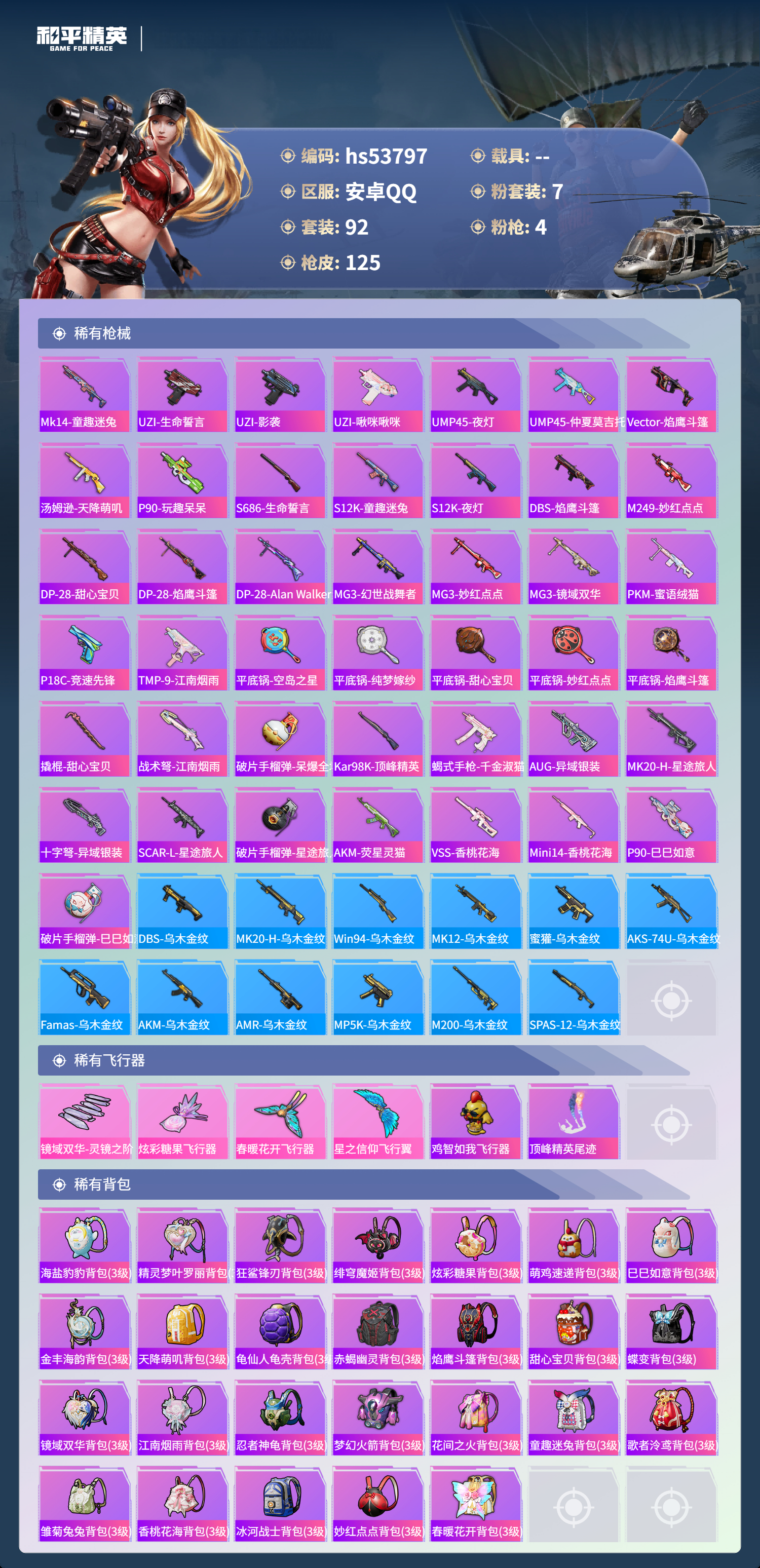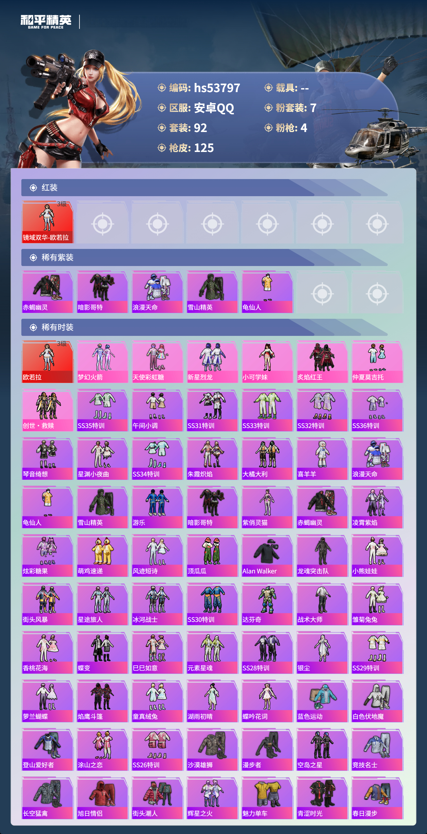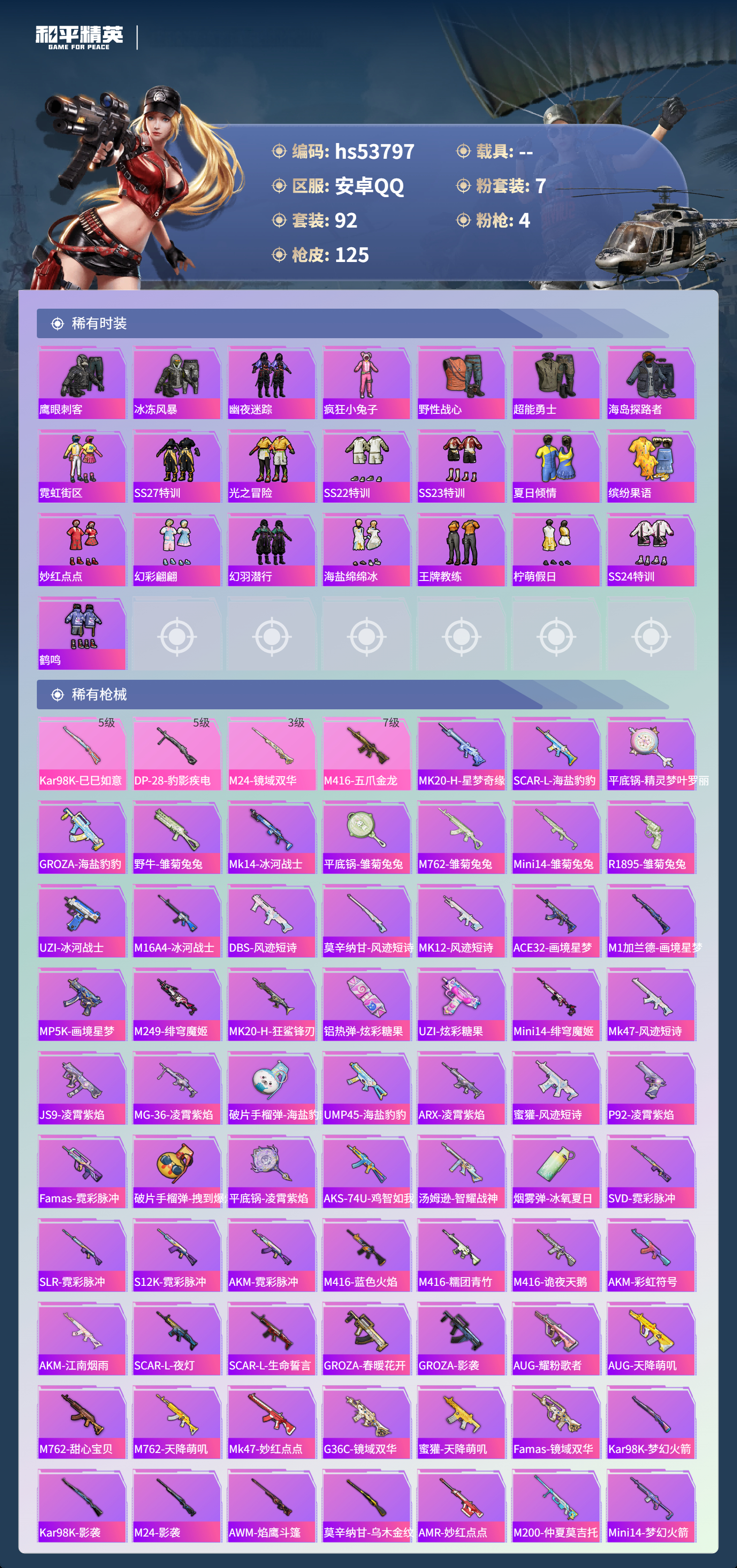 hs53797 安卓手q-8王牌印记-1红装-7粉装-4特效呛-41259热力值-92套装-125呛皮【1红装】镜域双华-欧若拉/3级【7粉装】套装-梦幻火箭套装-仲夏莫吉托角色-小可学妹套装-炙焰红王套装-创世·救赎套装-新星烈龙套装-天使彩虹糖【4特效呛】m24-镜域双华/3级kar98k-巳巳如意/5级m416-五爪金龙/7级dp-28-豹影疾电/5级【5稀有紫装】