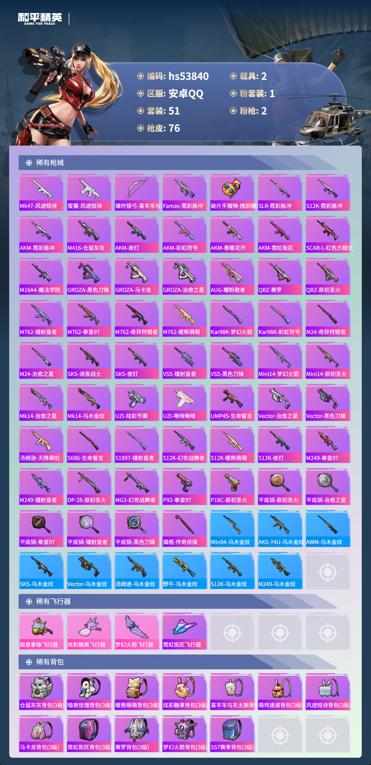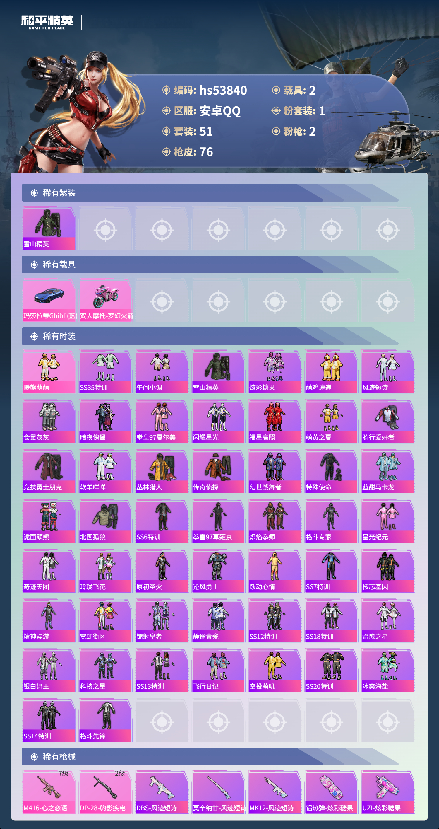 hs53840 安卓手q-2王牌印记-1粉装-2特效呛-2载具-25935热力值-51套装-76呛皮【1粉装】套装-暖熊萌萌【2特效呛】dp-28-豹影疾电/2级m416-心之恋语/7级【1稀有紫装】雪山精英【2稀有载具】玛莎拉蒂ghibli蓝双人摩托-梦幻火箭【51稀有时装】ss35特训午间小调雪山精英炫彩糖果萌鸡速递风迹短诗暖熊萌萌仓鼠灰灰暗夜傀儡拳皇97夏