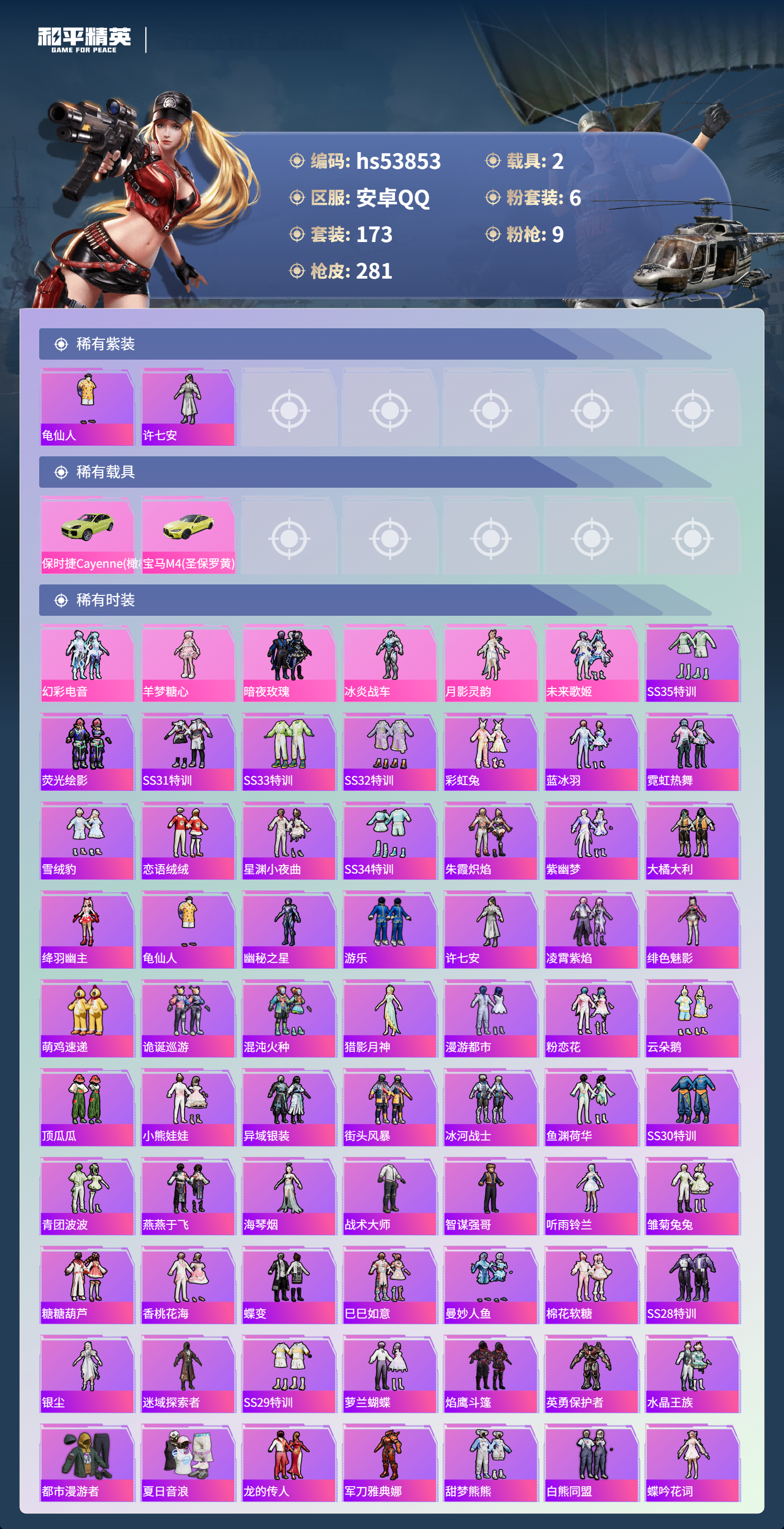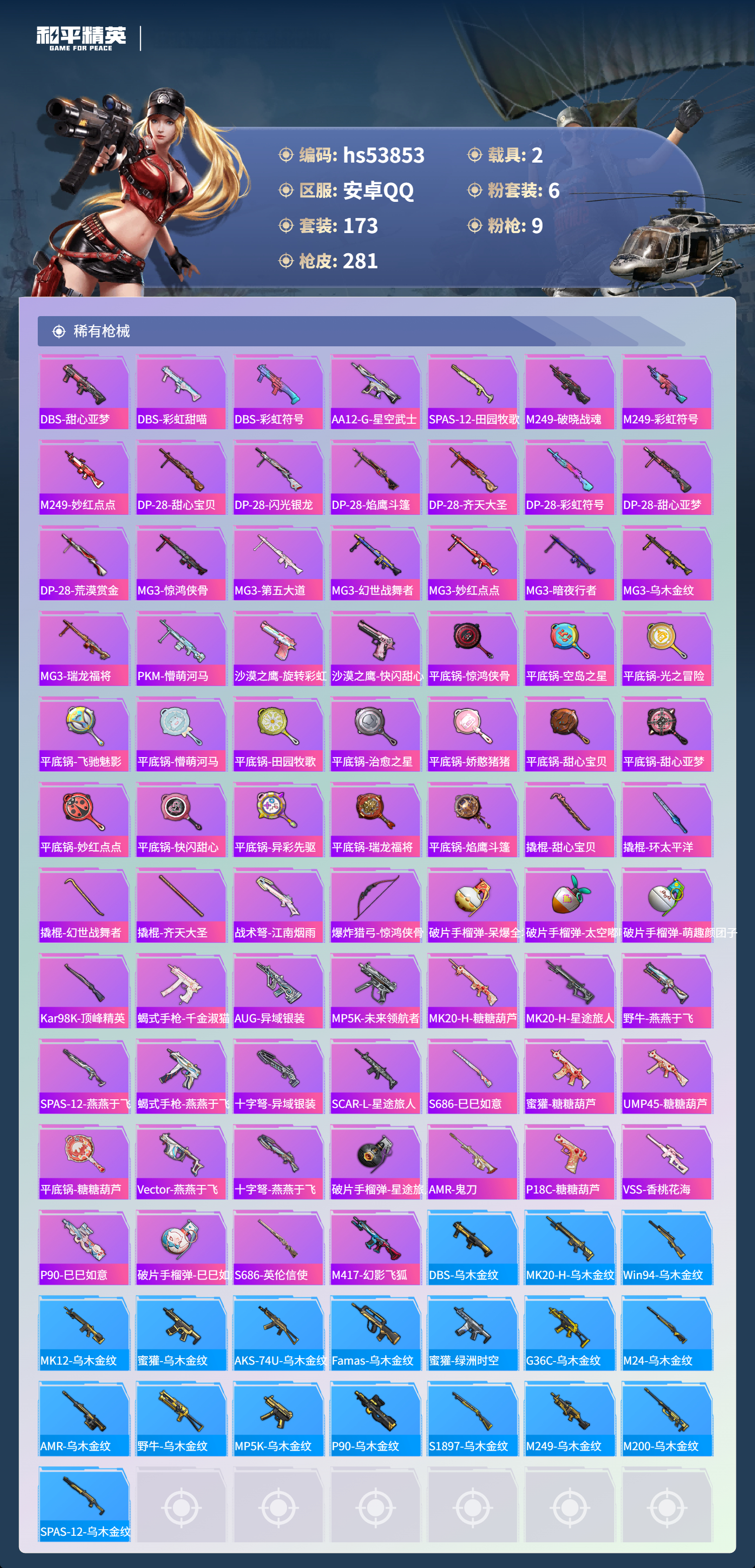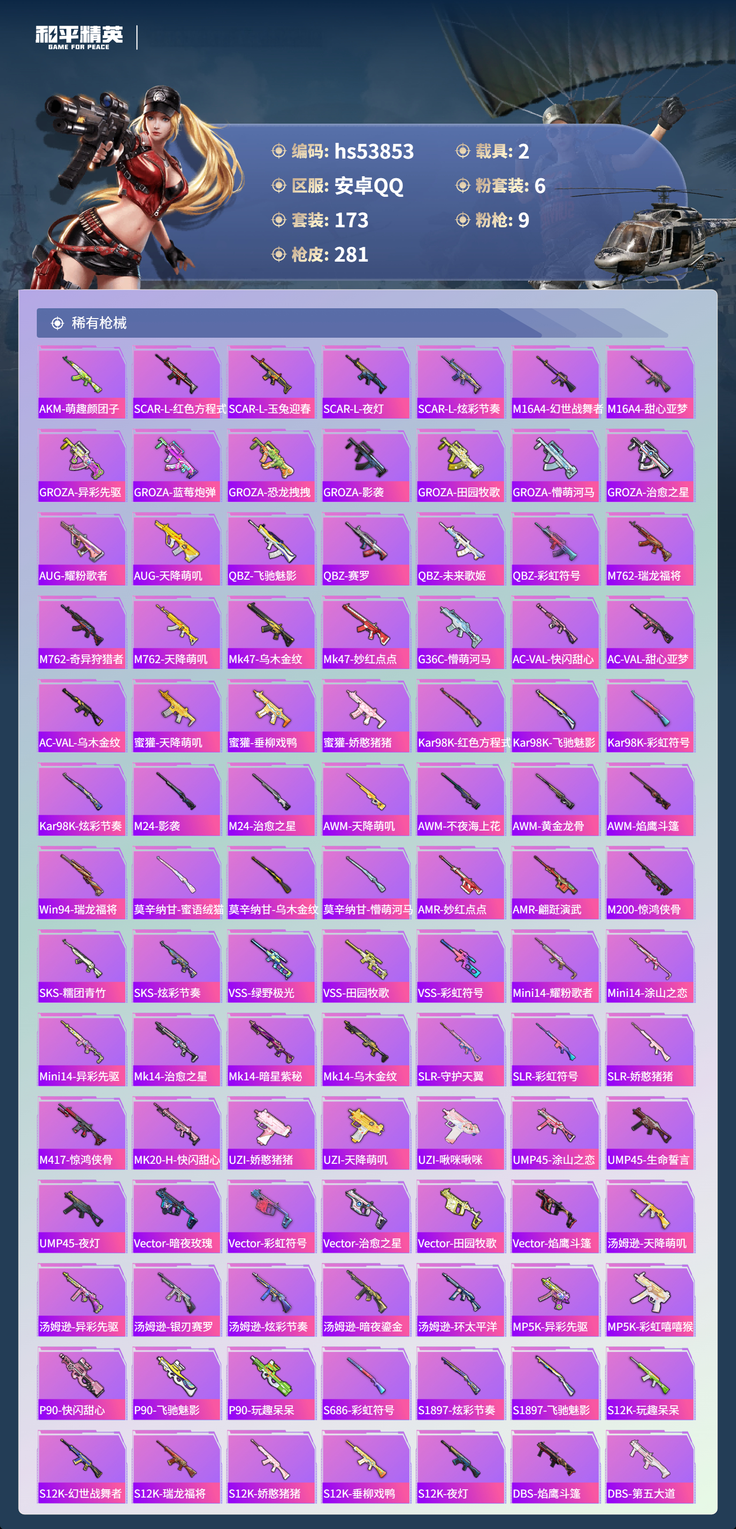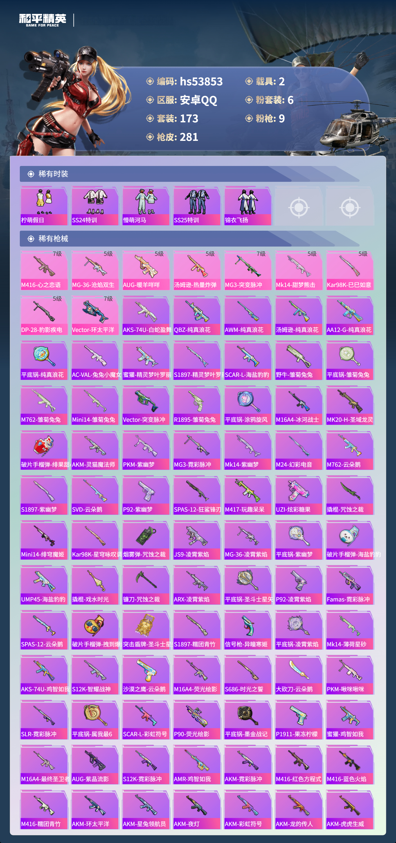 hs53853 安卓手q-7王牌印记-6粉装-9特效呛-2载具-86431热力值-173套装-281呛皮-1卓越印记【6粉装】角色-羊梦糖心套装-幻彩电音套装-暗夜玫瑰角色-月影灵韵套装-未来歌姬角色-冰炎战车【9特效呛】vect-环太平洋/7级汤姆逊-热量炸弹/5级dp-28-豹影疾电/5级kar98k-巳巳如意/5级mg3-突变脉冲/7级m416-心之恋语/7级m